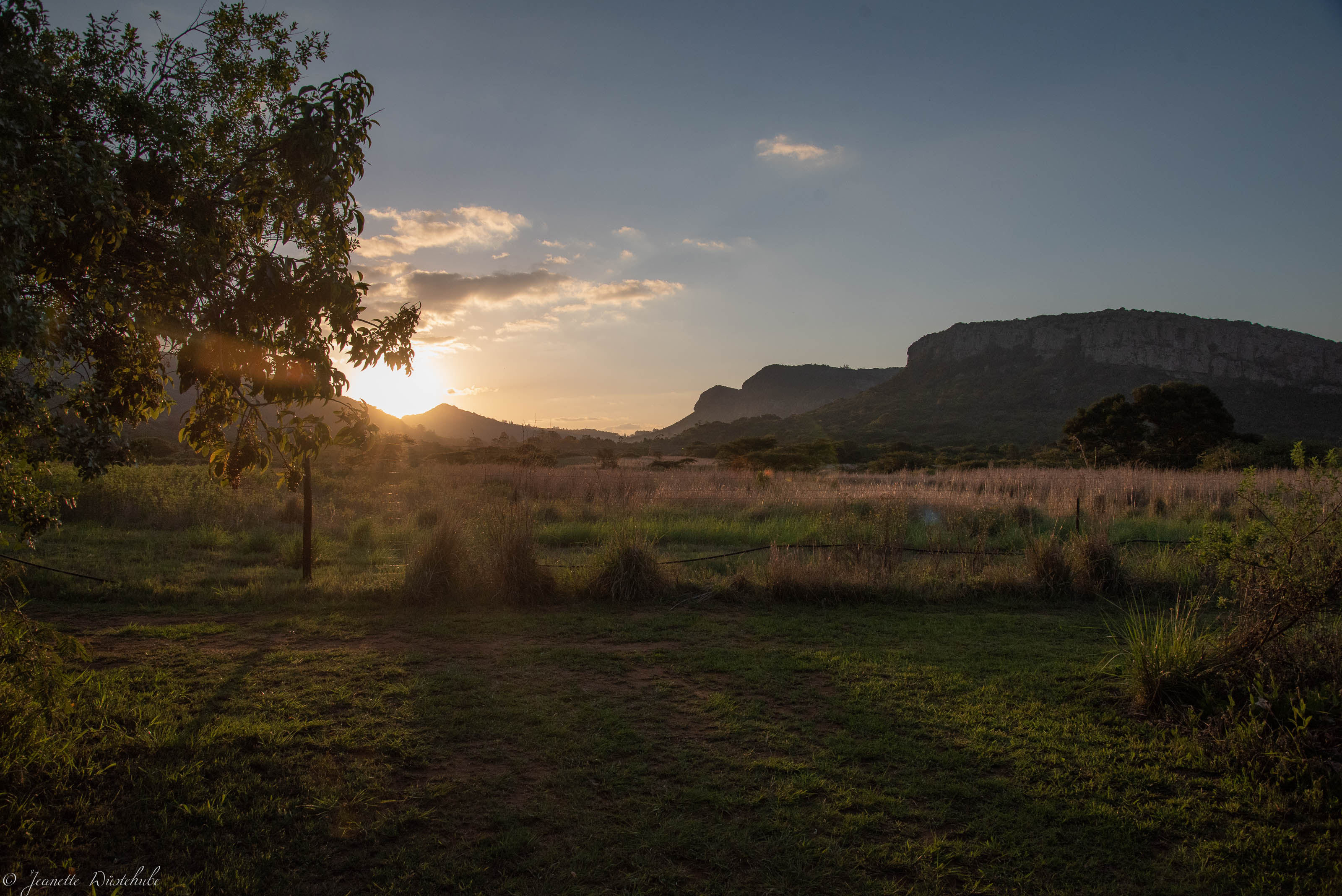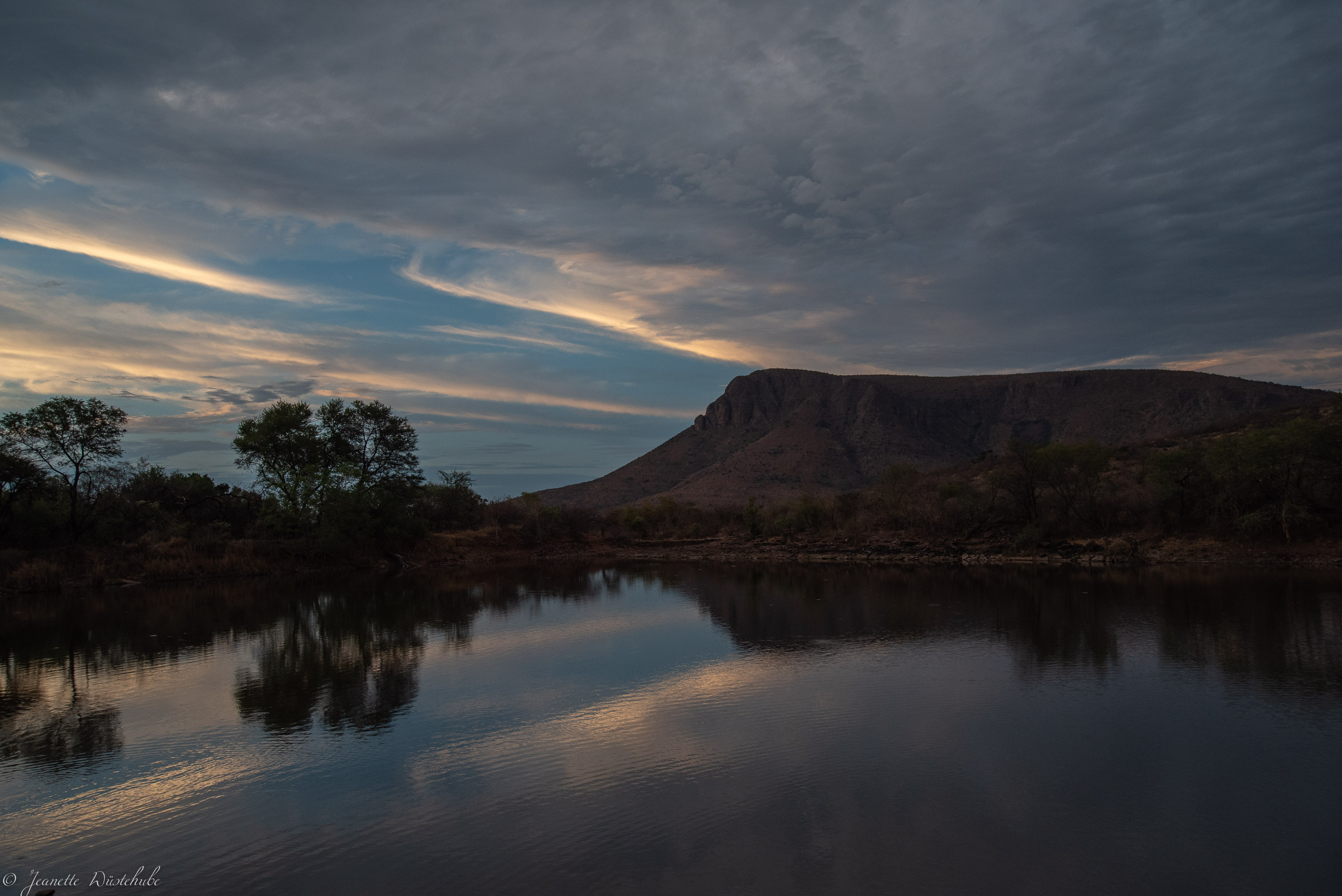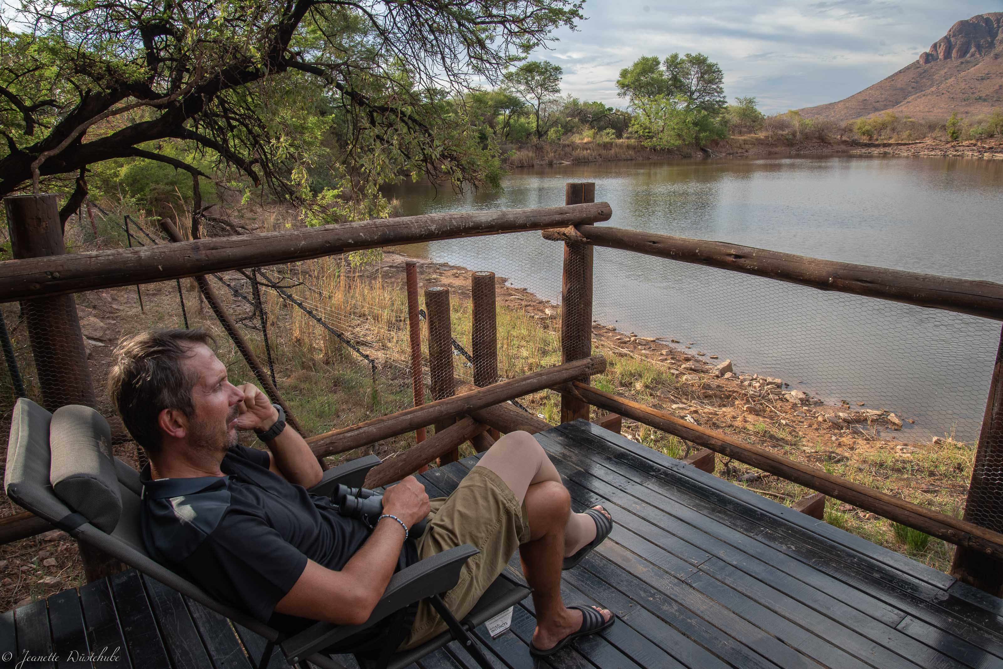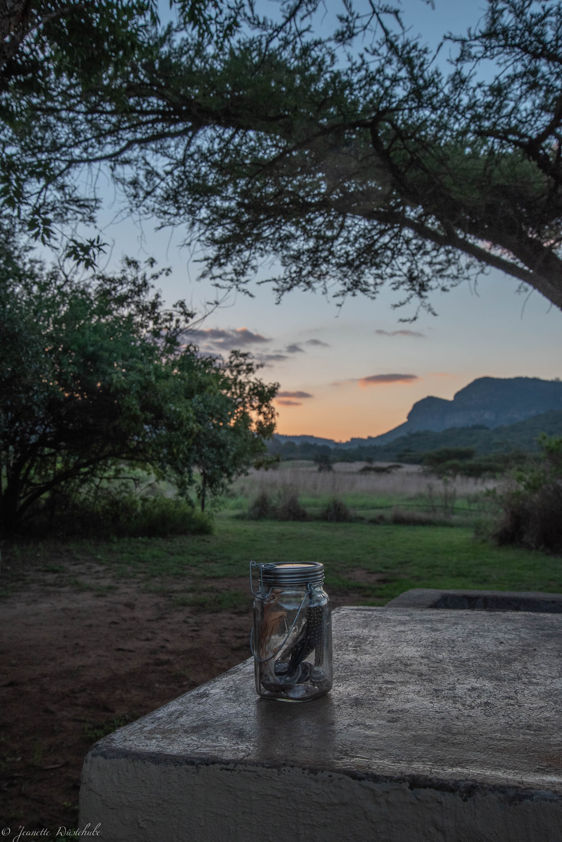 Gestern sind wir im Zvakanaka Camp angekommen, das etwas nördlich von Louis Trichard in Limpopo liegt und an diesem Platz könnten wir es noch eine ganze Weile aushalten. Aber der Reihe nach. Unser dreitägiger Besuch im Marakele Nationalpark und die Entscheidung für die drei Tage ein festes Zelt zu buchen, stellte sich als goldrichtig heraus. Wenn es hier regnet, dann richtig und das tat es während unseres Aufenthaltes mehrmals täglich. Teilweise hagelte es auch. In der letzten Nacht hatten wir dann auch noch einen ziemlichen Sturm. Wären wir da mit unserem Mobile Home Umbani auf dem Campingplatz gewesen, hätten wir keinen Schutz gehabt und dann wäre es sowohl draußen als auch im Zelt sehr ungemütlich und nass geworden. Das Tlopi Tented Camp liegt an einem kleinen Stausee. Es gibt etwa 10 feste Zelte. Jedes verfügt über ein Zelt mit zwei Einzelbetten, Dusche und WC und ein extra Häuschen mit Küchenzeile. Auf der kleinen zum See ausgerichteten Terrasse standen zwei Stühle und ein Grill. Man hatte Blick auf die umliegenden Berge. Wirklich sehr schön. Über dem Zelt war noch eine wasserdichte Plane gespannt, so dass es, selbst als es wie aus Eimern schüttete, nicht hereinregnete. Und auf den Betten lagen wir wie auf Wolken, auch wenn diese sicher nicht die besten Matratzen hatten, aber sowohl Toms als auch mein Rücken liebten diese Betten. Im See gab es riesige Welse, die immer wieder aus dem Wasser sprangen, wahrscheinlich um sich Mücken von der Wasseroberfläche zu holen. Einmal schwamm auch ein Waran zu uns ans Ufer und ab uns zu trank und graste ein Buschböckchen vor unserem Zelt. Wenn es nach den heftigen Gewitterschauern nachts aufklarte, hatte man vom Bett aus Blick auf den unglaublich schönen Sternenhimmel.