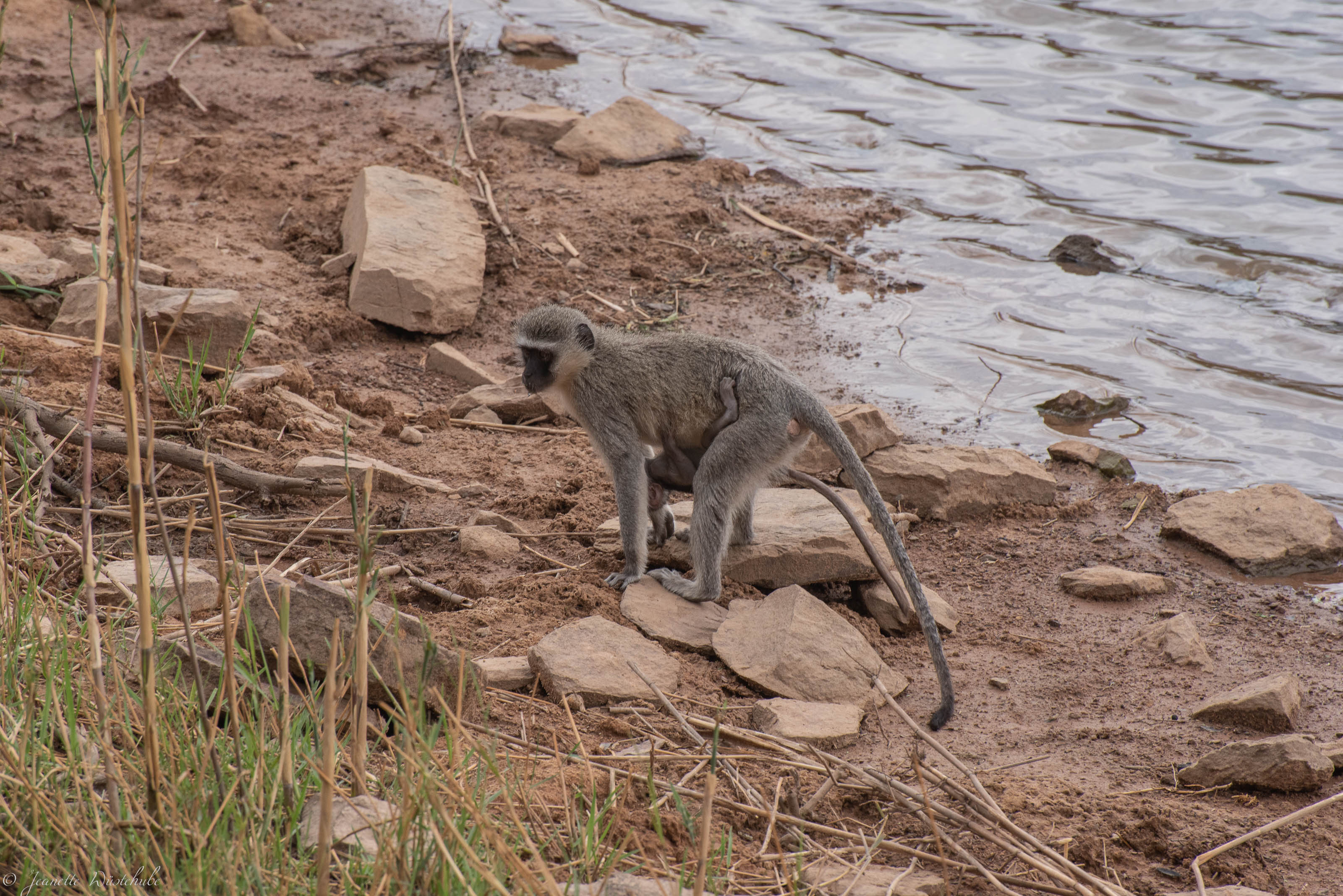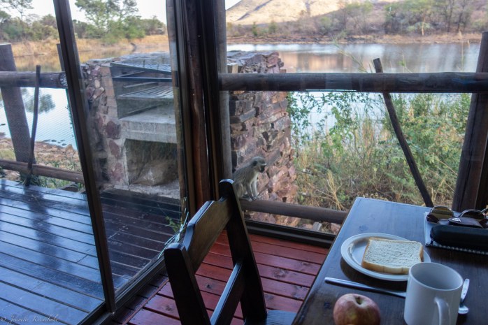 Man hatte uns an der Rezeption vor den Affen gewarnt und uns geraten, die Küchentür immer abzuschließen, weil die Vervet Monkeys wohl gelernt hatten die Schiebetür zu öffnen. Ein Mal war Tom kurz aus der Küche rausgegangen und hatte die Tür offen gelassen. Ich stand an der Spüle. Keine zwei Sekunden später hörte ich etwas und da war ein Affe schon in der Küche. Allerdings stand bei uns nichts Brauchbares herum und ich konnte ihn vertreiben. Bei den Mädels aus dem benachbarten Zelt hatten die Affen mehr Glück und erbeuteten eine Packung Tuc-Kekse. Tom beobachtete wie der erfolgreiche Primat die Kekse futterte während ein anderes Tier über ihm die Hand nach unten streckte und vergeblich versuchte auch an einen Cracker zu kommen. Muss sehr lustig ausgesehen haben 🙂 Einmal lagen wir im Zelt und lasen, da sahen wir plötzlich einen Affen, wie er die Hände und Gesicht an die moskitonetzbehangenen Fenster drückte und neugierig zu uns hineinstierte. Wie ein kleines Kind… sehr goldig.