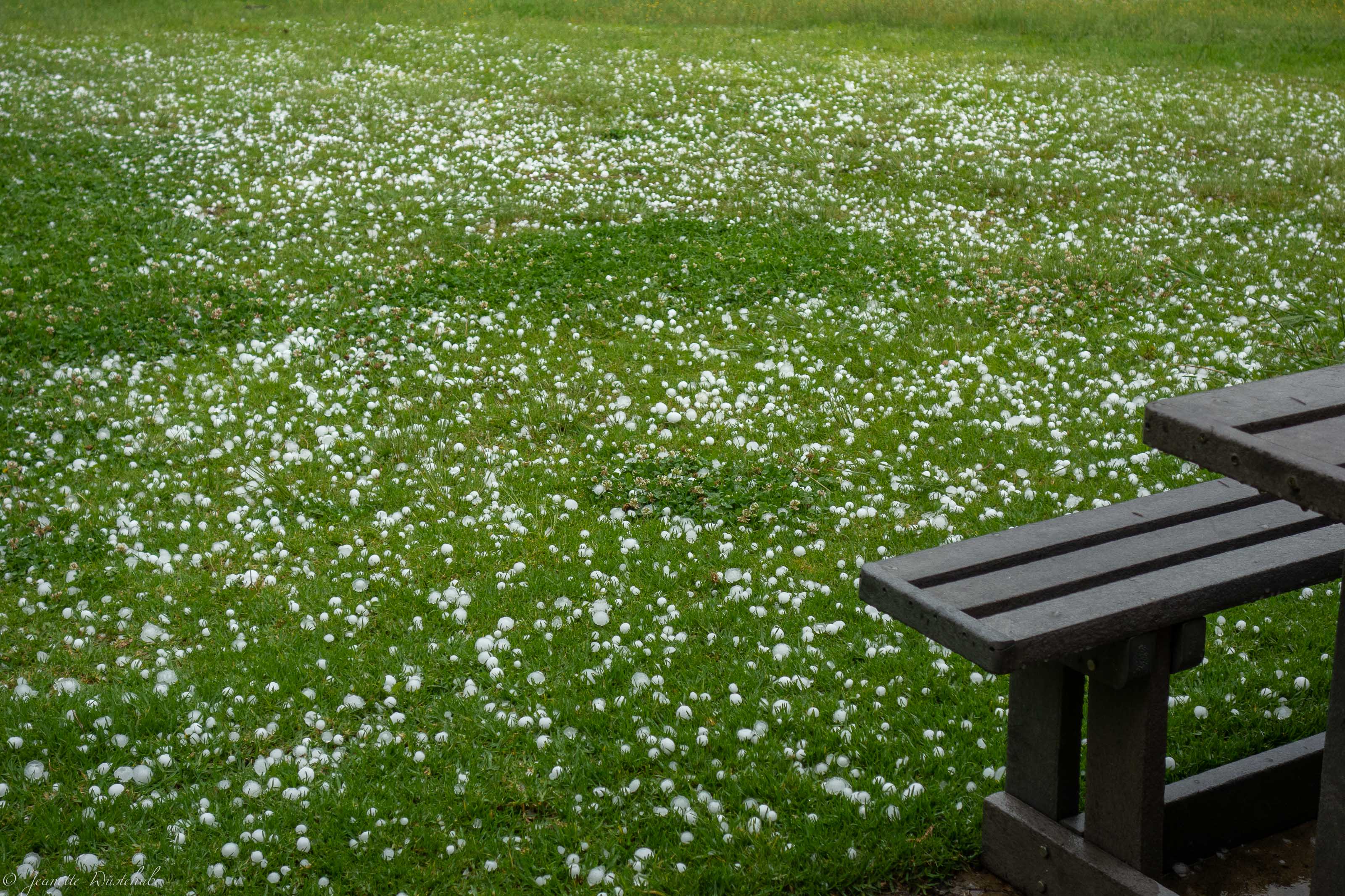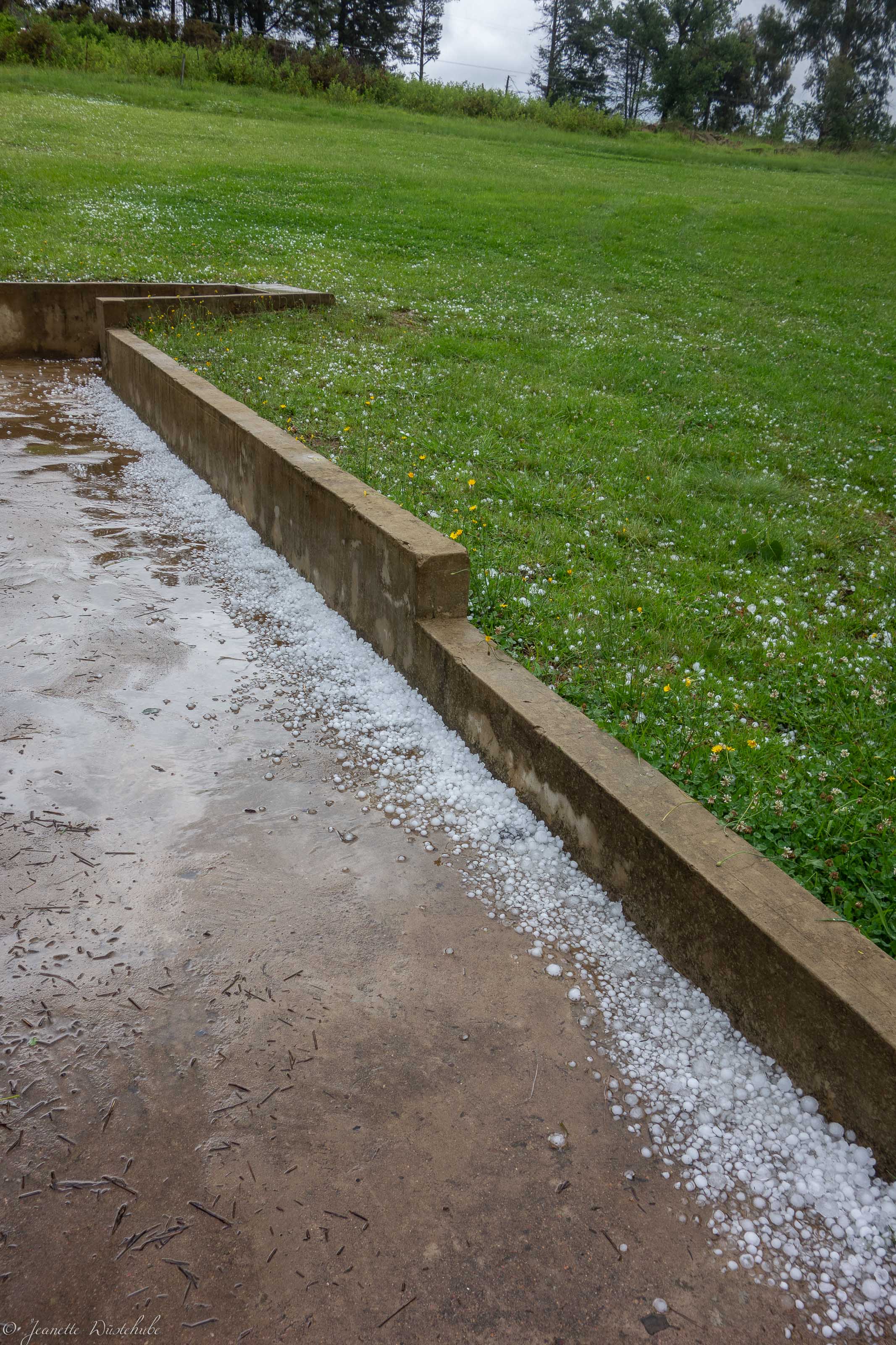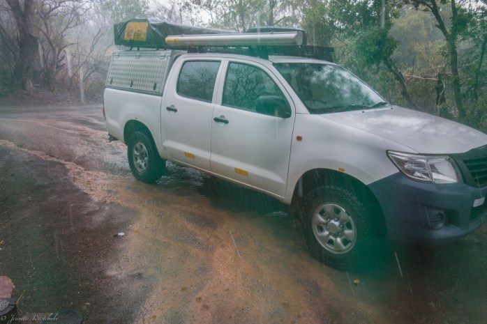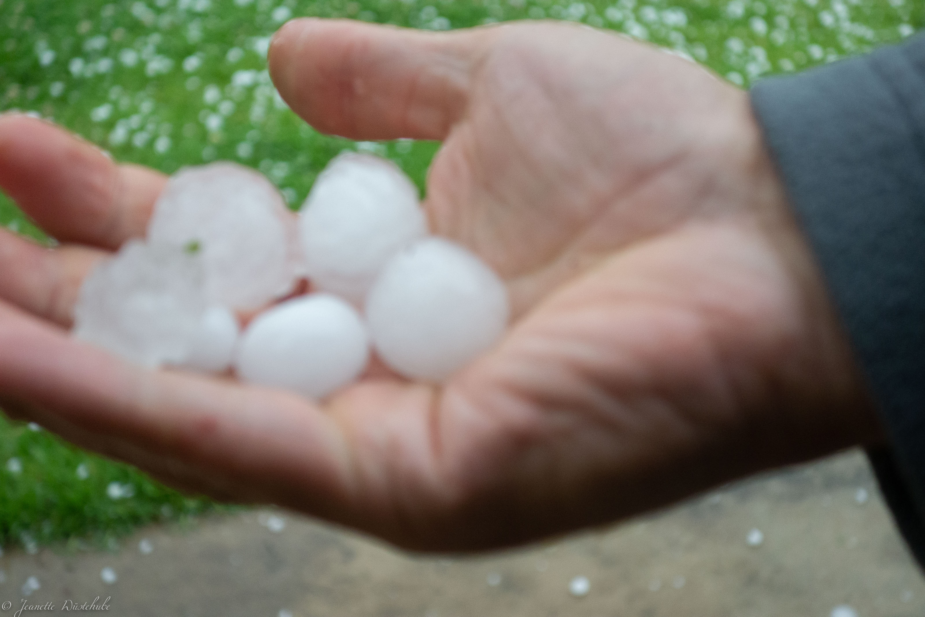 Es hatte plötzlich und heftig angefangen zu regnen. Wir beobachteten das Spektakel von der Tür aus. Plötzlich ging der Regen in Hagel über und taubeneigroße Hagelkörner kamen vom Himmel und zwar in riesigen Mengen. Wir waren so überrascht, dass wir zu langsam reagierten. Unser Auto stand fast ungeschützt neben dem Haus und es knallte furchtbar laut, wenn der Hagel auf der Motorhaube aufschlug. So etwas hatten wir beide noch nie gesehen. Der Hagel schlug im See nebenan ein und die Wiese war übersät mit Hagelkörnern. Irgendwann rannte Tom los. Er wollte Umbani bei den überdachten Parkplätzen an der Rezeption unterstellen. Ein Hagelei traf ihn am Kopf und das muss höllisch weh getan haben. Für Umbani war es zu spät. Er hatte zahllose Einschläge auf Motorhaube und ein paar auch am Dach, dort wo Dachzelt oder Gepäckträger es nicht bedeckten. Ein Hagelkorn hatte auch die Scheibe beschädigt und ein langer Riss war zu sehen. So eine Sch…. Eine Woche vor der Rückgabe hätte das nicht noch sein müssen… Nach einer gefühlten Ewigkeit ließ der Hagel endlich nach. Wir begutachteten die Schäden und schauten in unserem Vertrag nach, ob Hagelschäden mitversichert sind. Für Reifen und die Scheibe müssen wir selbst zahlen, für alle anderen Schäden wird maximal die Selbstbeteiligung fällig. Das hätte jetzt zwar nicht sein müssen, aber es ist eben nur Blechschaden. Nicht auszudenken, wenn wir bei dem Wetter noch unterwegs gewesen wären. Dann hätten wir und Jamber die Hagelkörner abbekommen und das wäre viel schlimmer gewesen.