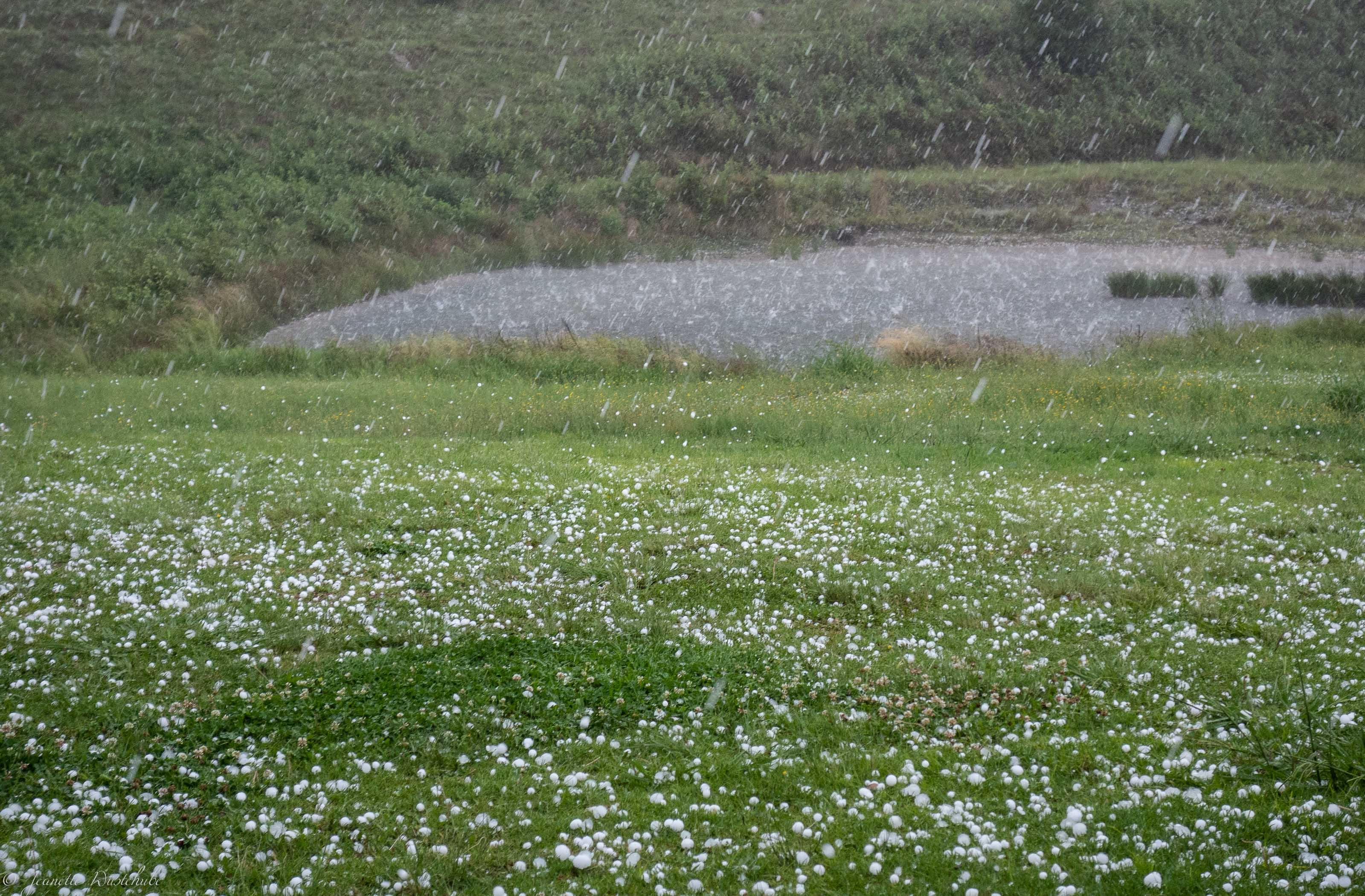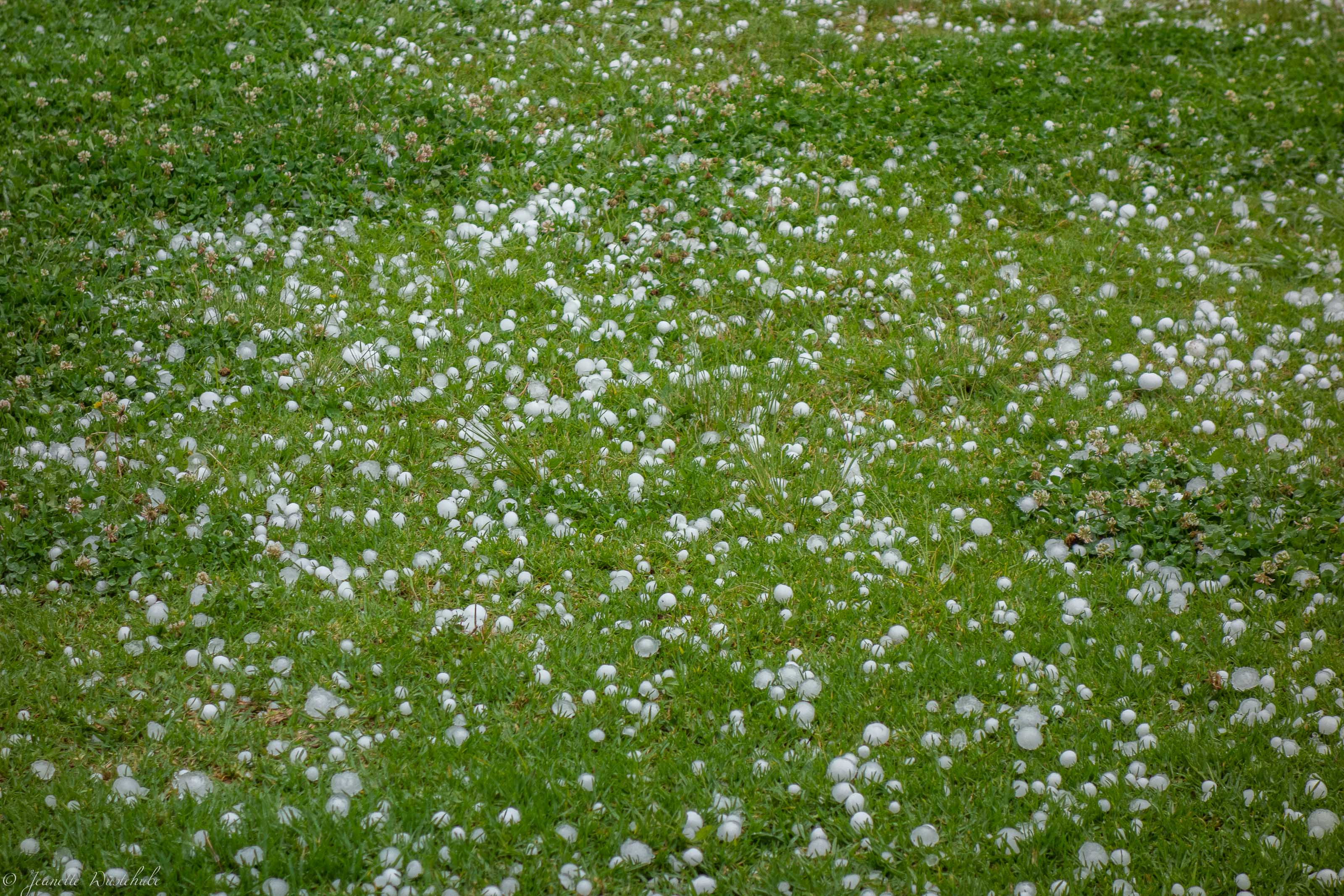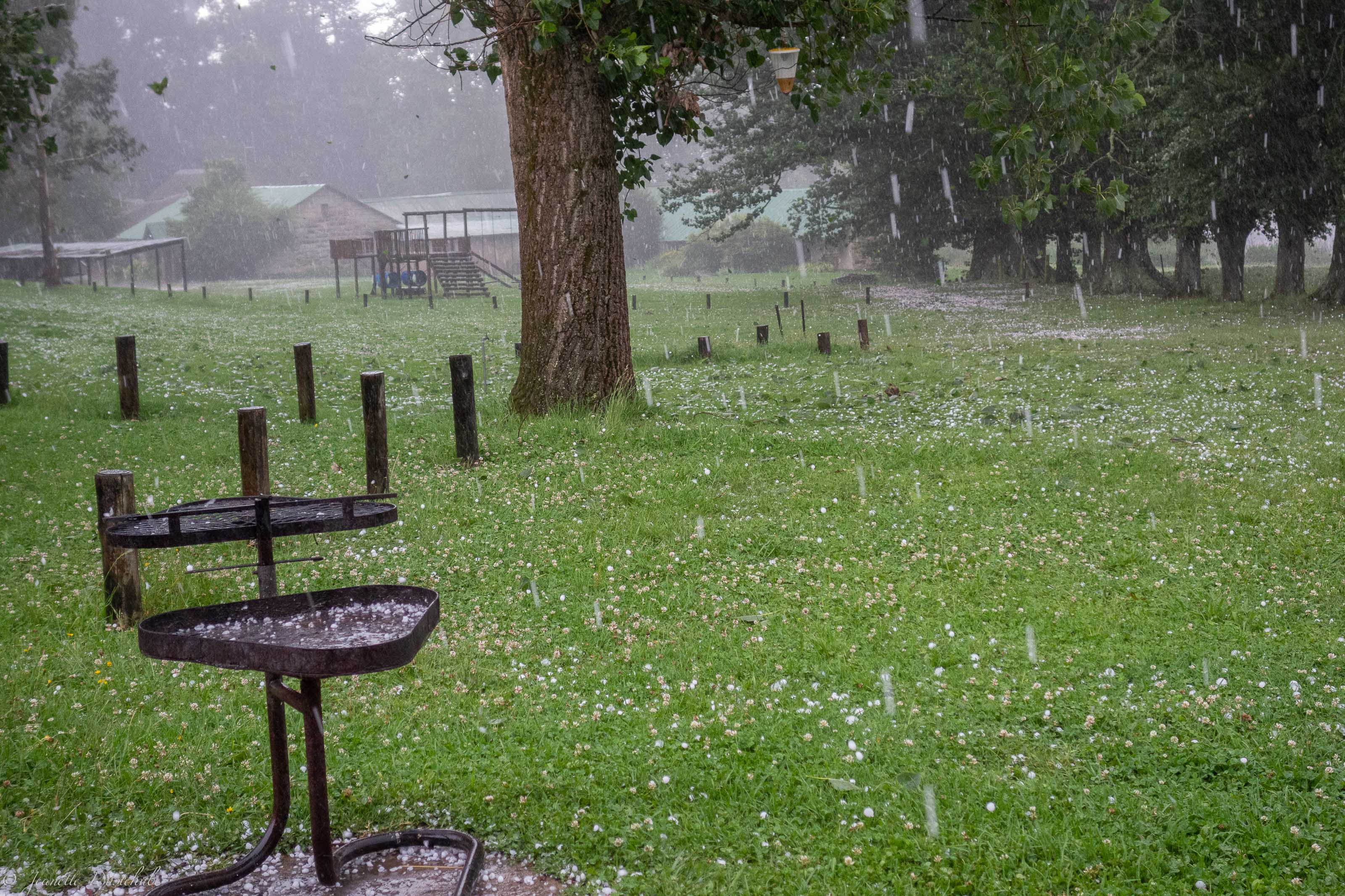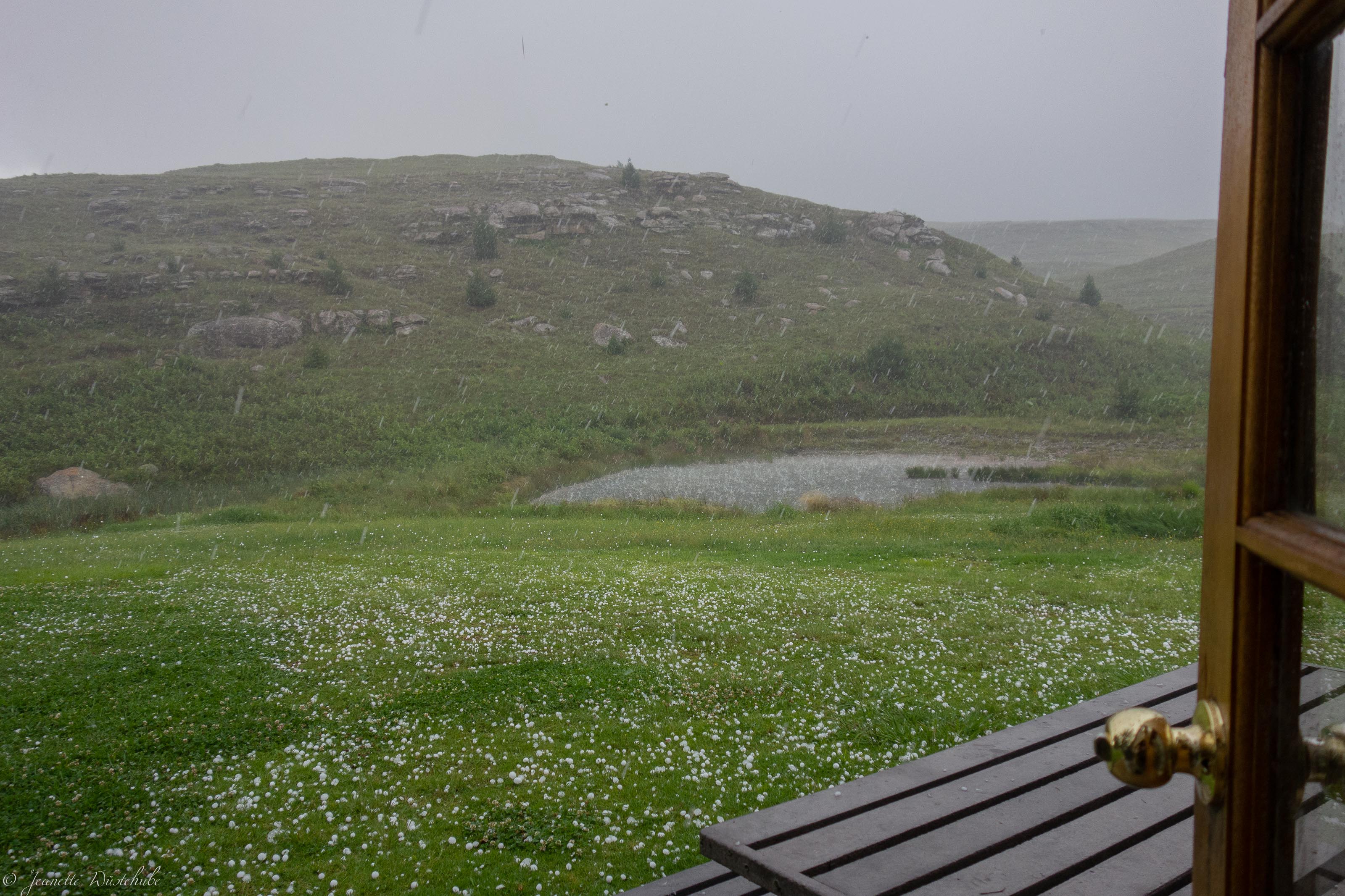 Es hatte plötzlich und heftig angefangen zu regnen. Wir beobachteten das Spektakel von der Tür aus. Plötzlich ging der Regen in Hagel über und taubeneigroße Hagelkörner kamen vom Himmel und zwar in riesigen Mengen. Wir waren so überrascht, dass wir zu langsam reagierten. Unser Auto stand fast ungeschützt neben dem Haus und es knallte furchtbar laut, wenn der Hagel auf der Motorhaube aufschlug. So etwas hatten wir beide noch nie gesehen. Der Hagel schlug im See nebenan ein und die Wiese war übersät mit Hagelkörnern. Irgendwann rannte Tom los. Er wollte Umbani bei den überdachten Parkplätzen an der Rezeption unterstellen. Ein Hagelei traf ihn am Kopf und das muss höllisch weh getan haben. Für Umbani war es zu spät. Er hatte zahllose Einschläge auf Motorhaube und ein paar auch am Dach, dort wo Dachzelt oder Gepäckträger es nicht bedeckten. Ein Hagelkorn hatte auch die Scheibe beschädigt und ein langer Riss war zu sehen. So eine Sch…. Eine Woche vor der Rückgabe hätte das nicht noch sein müssen… Nach einer gefühlten Ewigkeit ließ der Hagel endlich nach. Wir begutachteten die Schäden und schauten in unserem Vertrag nach, ob Hagelschäden mitversichert sind. Für Reifen und die Scheibe müssen wir selbst zahlen, für alle anderen Schäden wird maximal die Selbstbeteiligung fällig. Das hätte jetzt zwar nicht sein müssen, aber es ist eben nur Blechschaden. Nicht auszudenken, wenn wir bei dem Wetter noch unterwegs gewesen wären. Dann hätten wir und Jamber die Hagelkörner abbekommen und das wäre viel schlimmer gewesen.