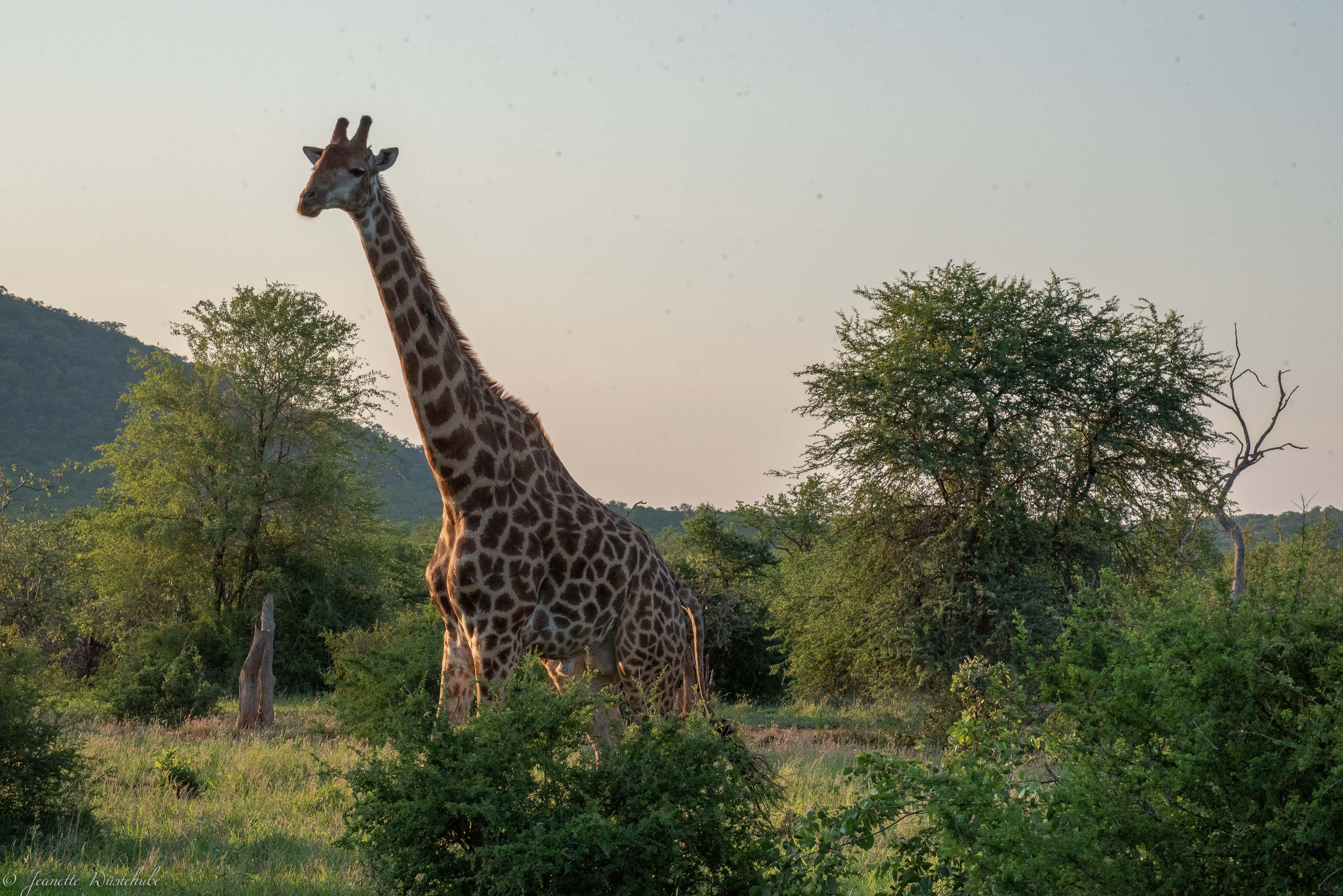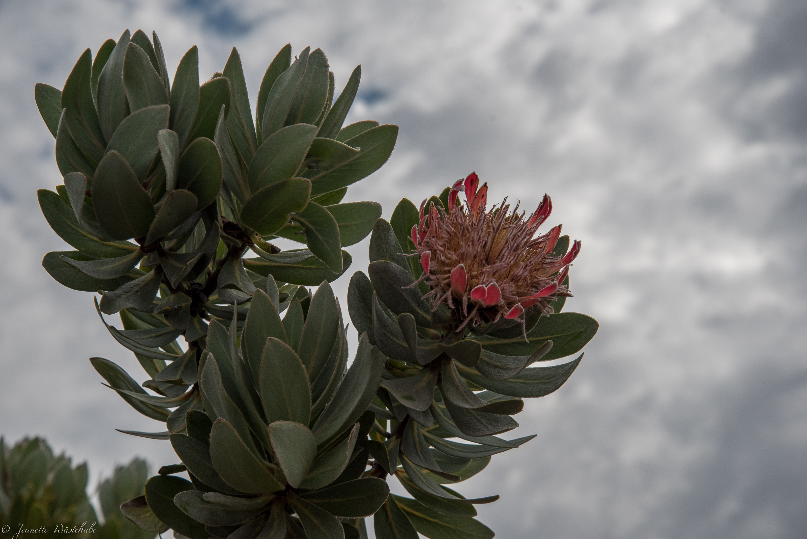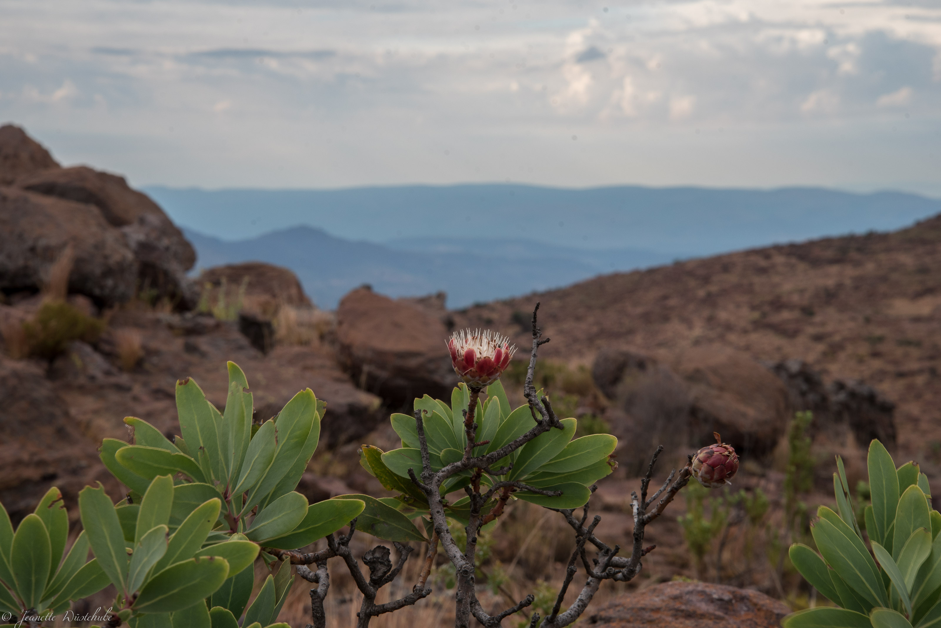 Im Nationalpark soll es Big 5 geben allerdings wohl in nicht allzu hoher Konzentration. Wir sahen bei den meisten Gamedrives Giraffen und diverse Antilopen. Das Gelände ist sehr bergig und es gibt einen Aussichtspunkt mit Blick in die umliegenden Berge, den wir am zweiten Morgen besuchten. Es soll von dort aus auch eine große Kolonie der gefährdeten Kapgeier zu sehen sein, die wir aber nicht entdecken konnten. Dafür blühten gerade einige Proteen, die wir sonst nur im Botanischen Garten in Kapstadt gesehen hatten. Durch den Regen war alles bereits grün.