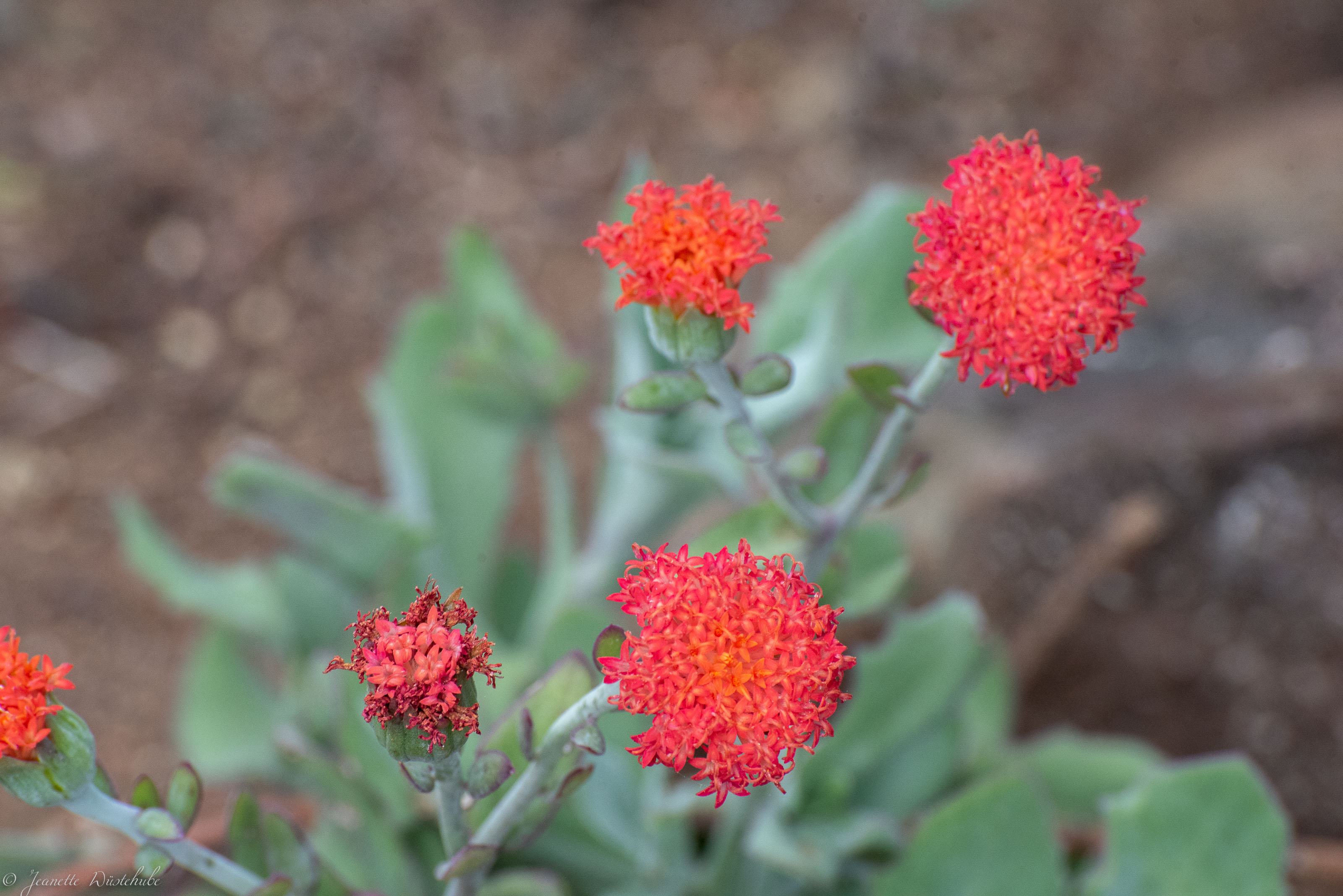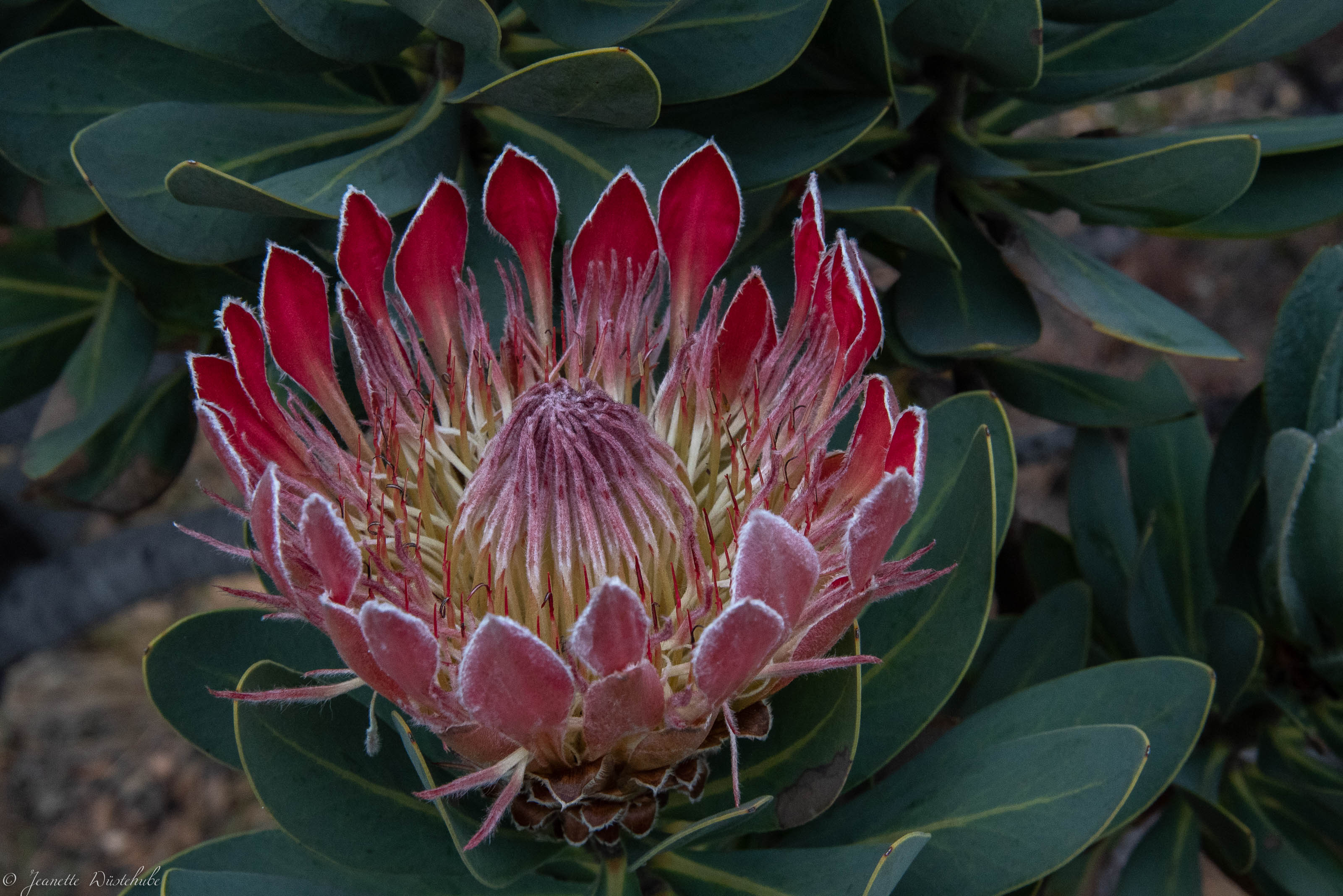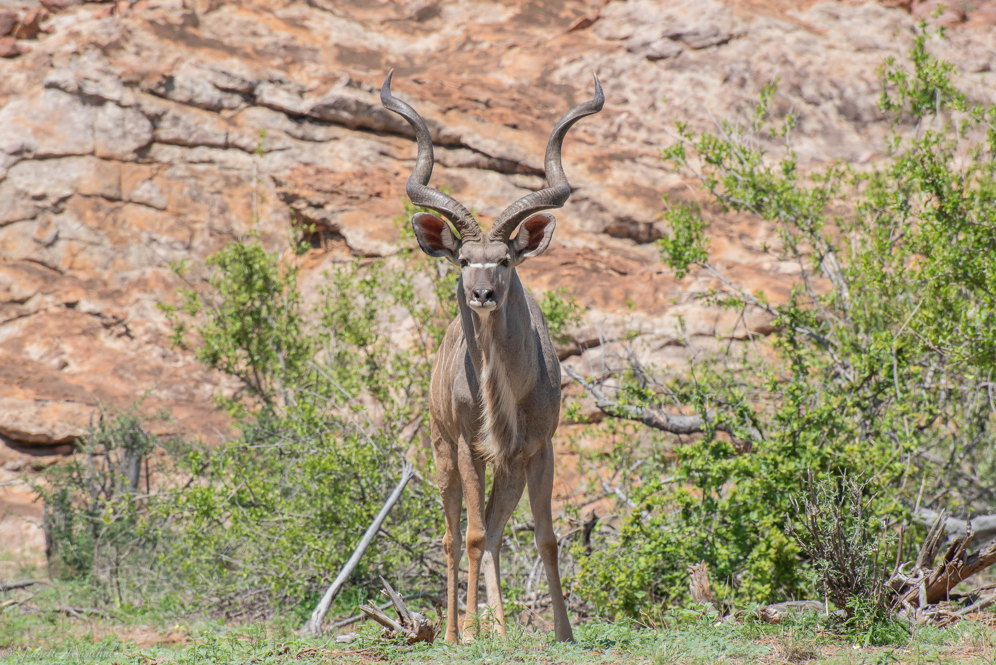 Im Nationalpark soll es Big 5 geben allerdings wohl in nicht allzu hoher Konzentration. Wir sahen bei den meisten Gamedrives Giraffen und diverse Antilopen. Das Gelände ist sehr bergig und es gibt einen Aussichtspunkt mit Blick in die umliegenden Berge, den wir am zweiten Morgen besuchten. Es soll von dort aus auch eine große Kolonie der gefährdeten Kapgeier zu sehen sein, die wir aber nicht entdecken konnten. Dafür blühten gerade einige Proteen, die wir sonst nur im Botanischen Garten in Kapstadt gesehen hatten. Durch den Regen war alles bereits grün.