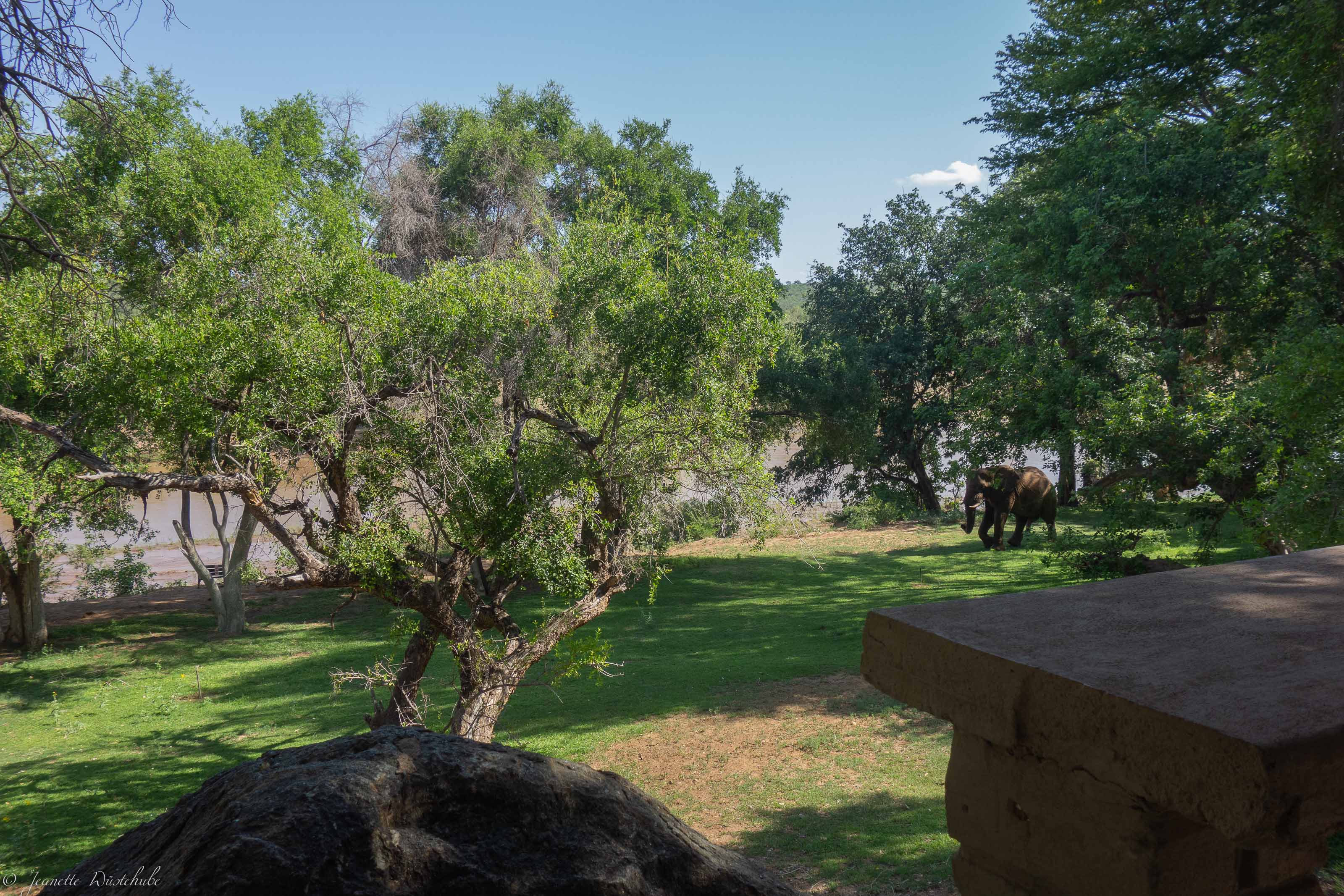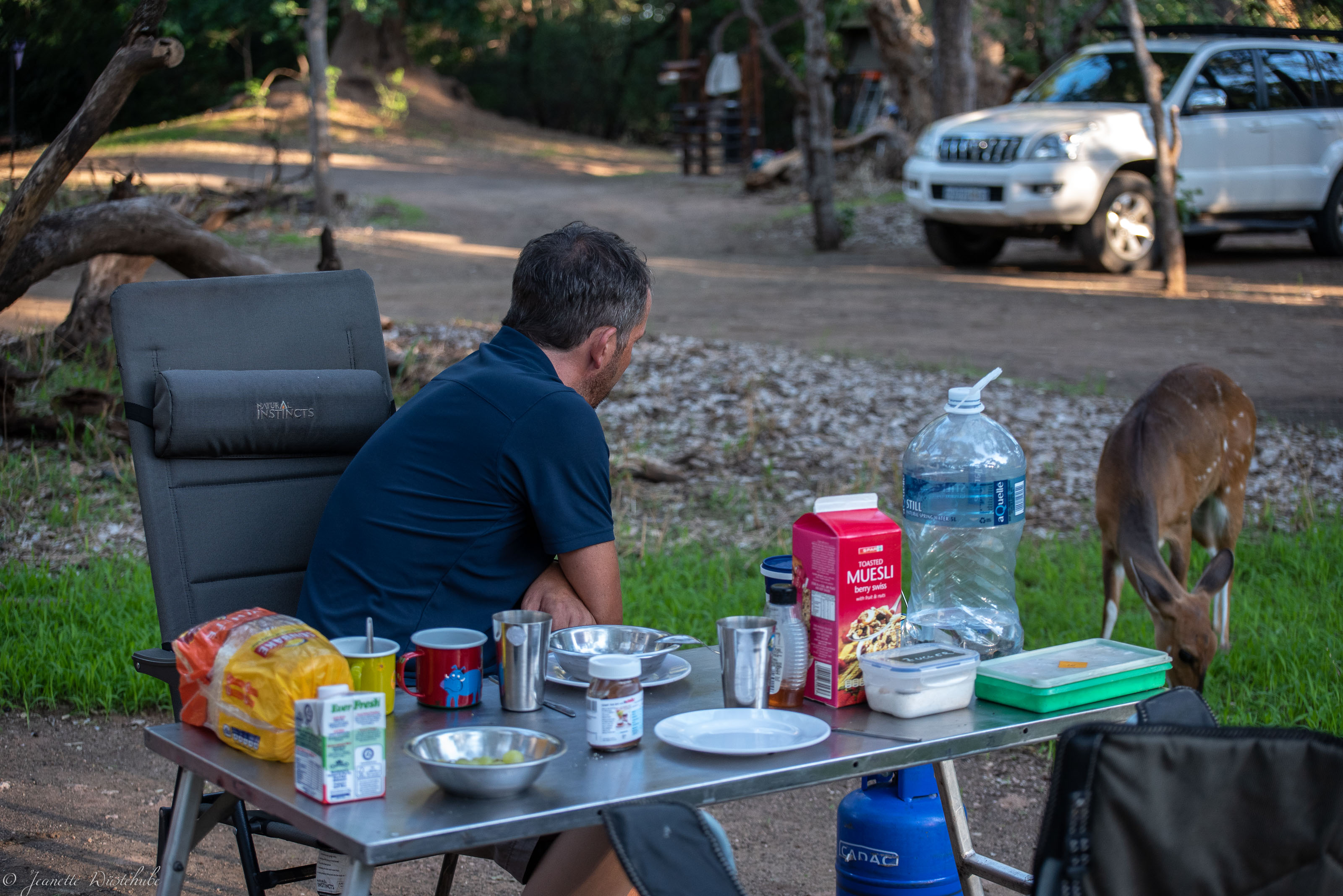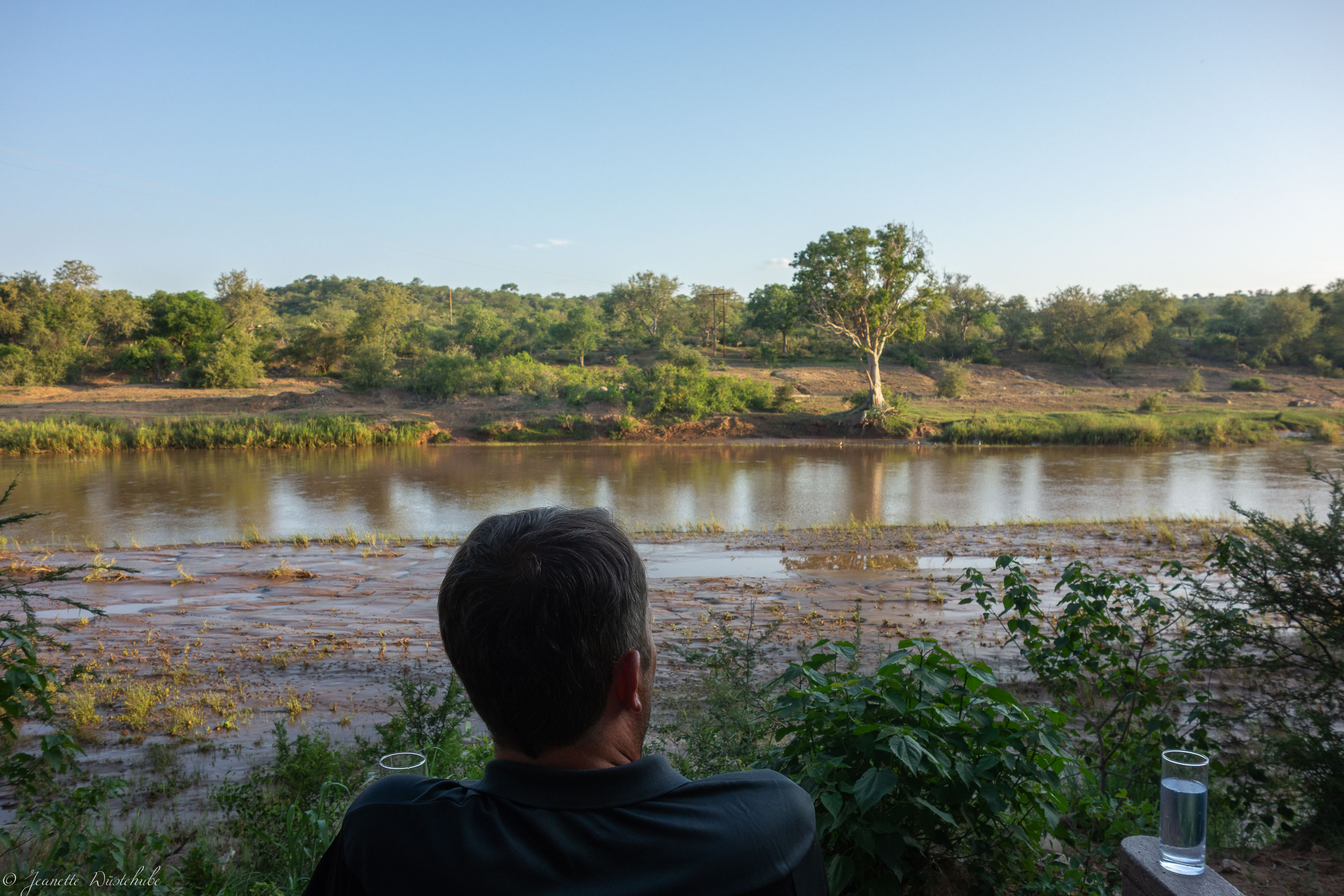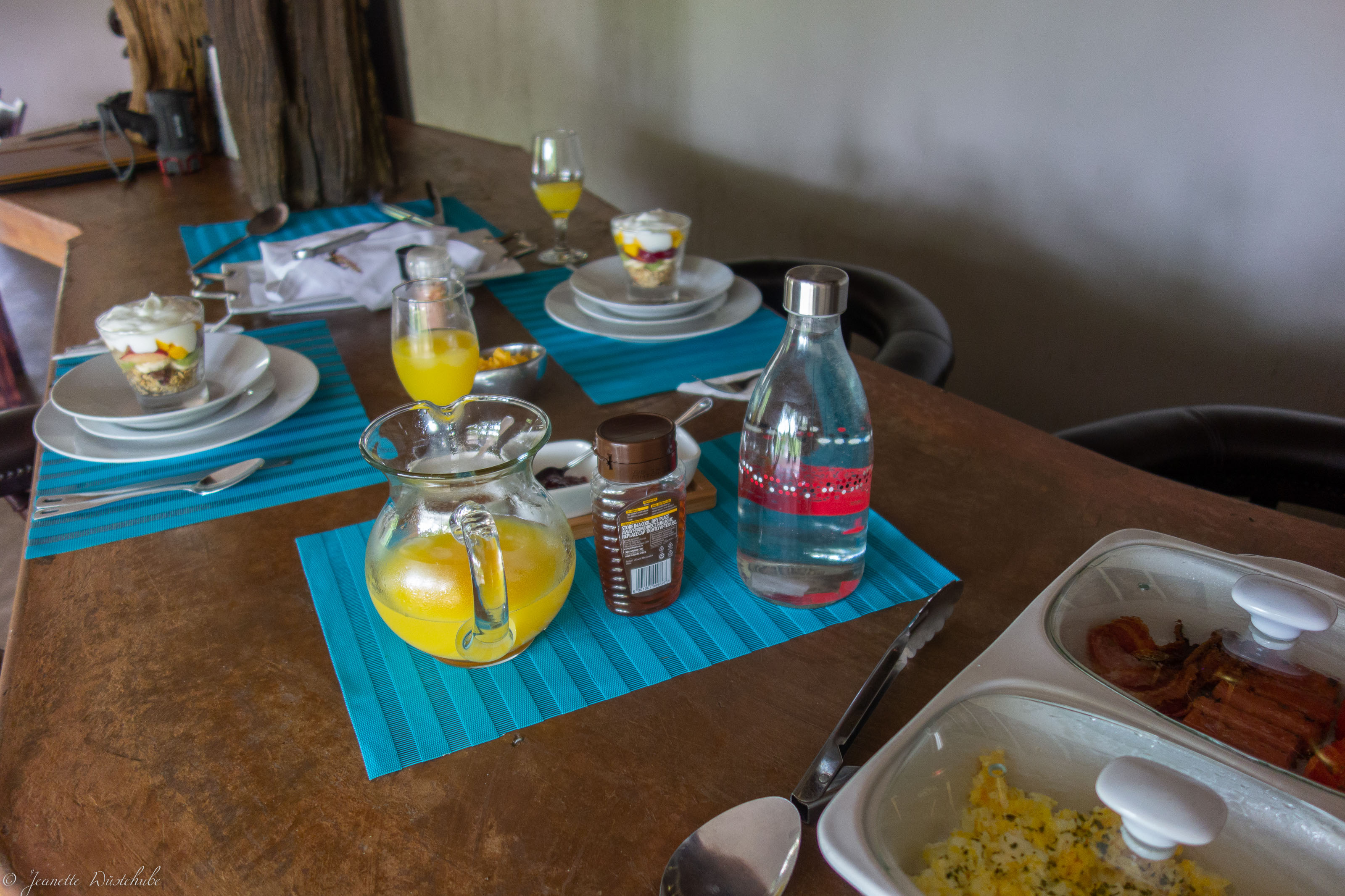 Wir genossen das Dessert auf der Terrasse und fielen früh ins Bett. Meine Backenschmerzen waren glücklicherweise etwas besser geworden, aber mir fehlte Schlaf. Das war unser Heilig Abend im Busch und wir sind ganz froh im nächsten Jahr wieder den normalen Weihnachtswahnsinn mitmachen zu können. So schön es hier ist, Weihnachten ohne Kälte, Geschenke und Weihnachtskarten, liebe Menschen und das ganze Drumherum ist einfach nix. Nachts muss es, laut meinem Mann, ziemlich geregnet haben. Ich habe davon nichts mitbekommen, nur dass es ein paar Mal sehr laut donnerte und man konnte es auch am Flusspegel erkennen, der am nächsten Morgen deutlich angestiegen war. Unser Frühstück wurde um 9 Uhr angerichtet und mir wurde vom Hauspersonal verboten die Gläser vom Vorabend zu spülen. Ronell deckte alles ein und war wenige Sekunden später wieder verschwunden. Das wäre auch mal was für zuhause. So eine gute Seele, die einem das Essen kocht und ein leckeres Frühstück richtet, ohne dass man Mise on place sein muss, der für einen spült und die Wäsche macht. Also noch ein Ziel für die Zeit nach unserer Auszeit 🙂