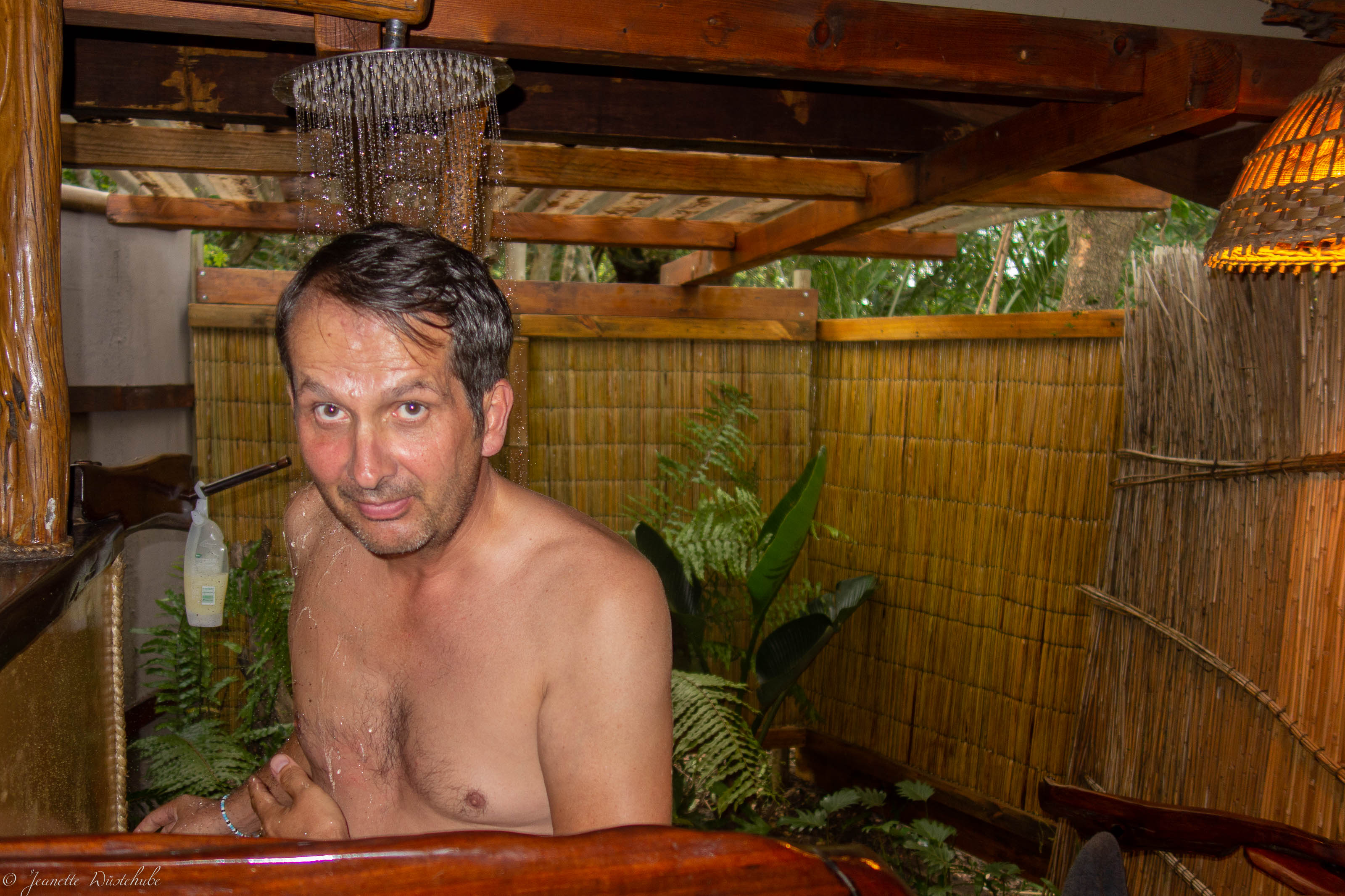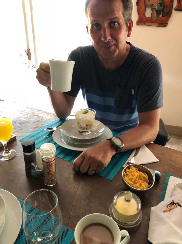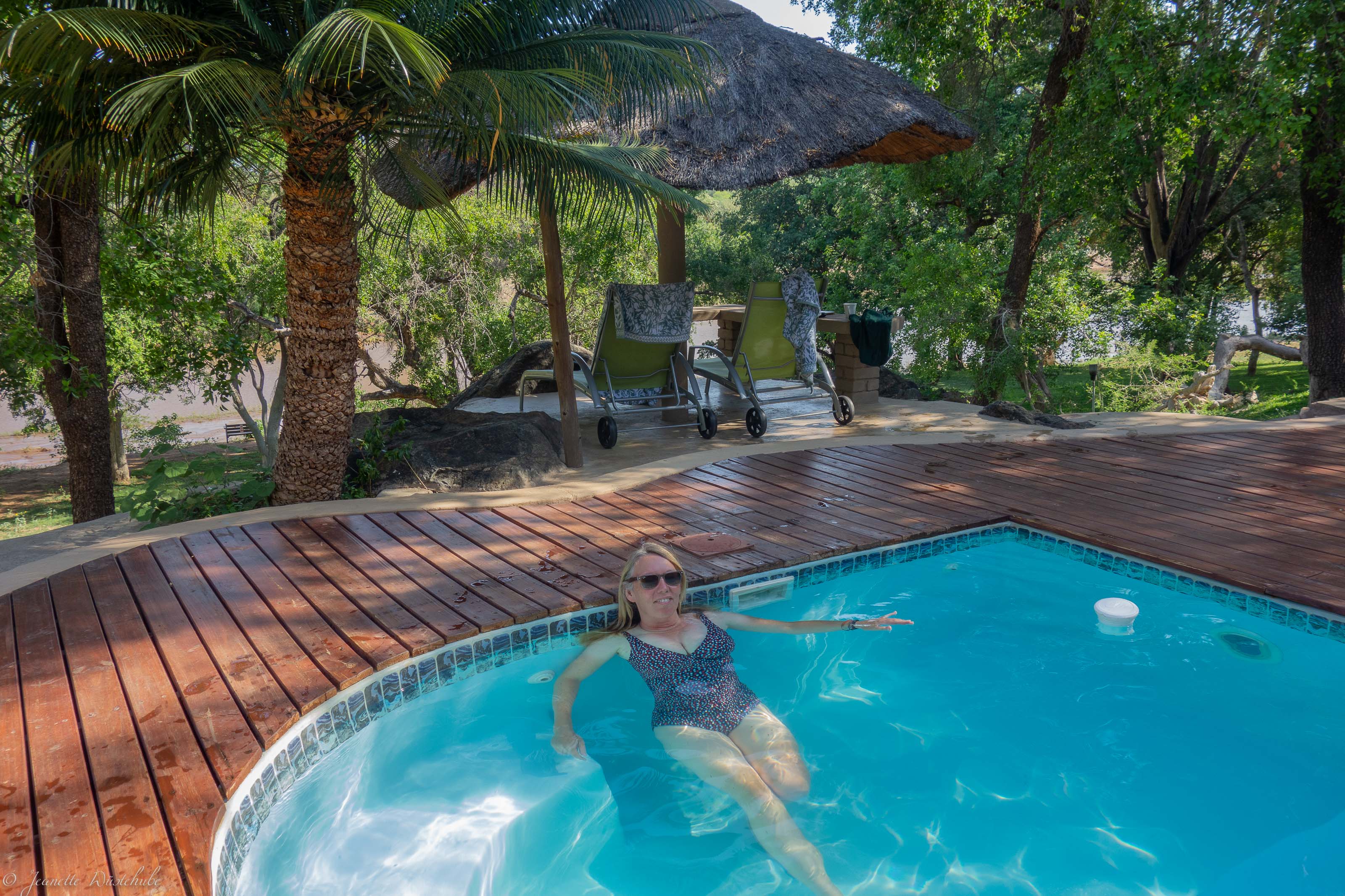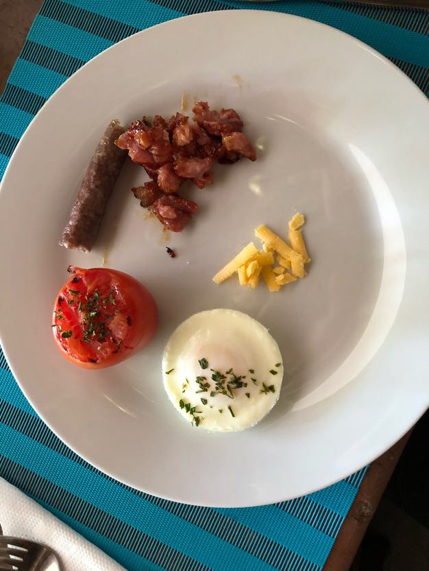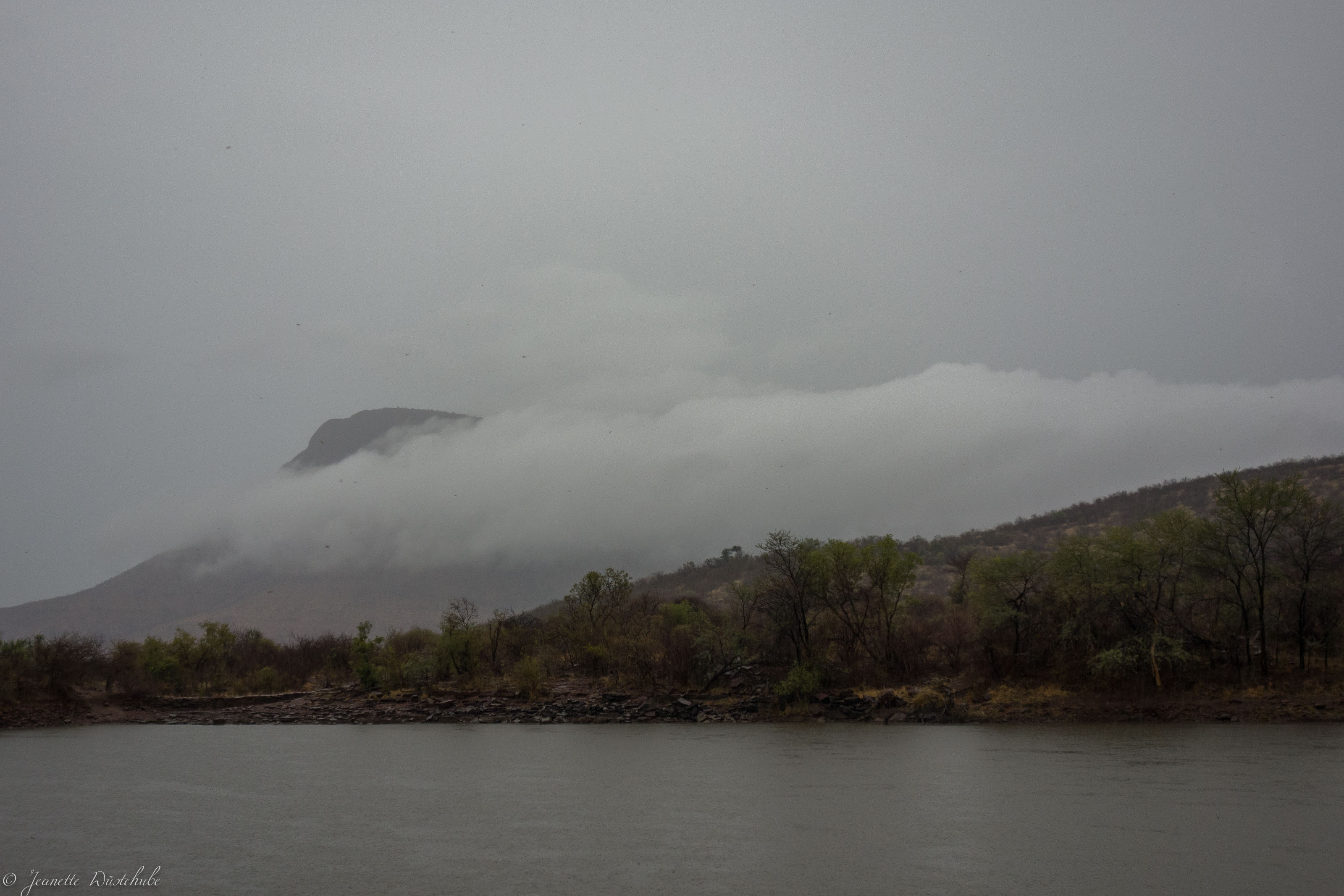 Wir genossen das Dessert auf der Terrasse und fielen früh ins Bett. Meine Backenschmerzen waren glücklicherweise etwas besser geworden, aber mir fehlte Schlaf. Das war unser Heilig Abend im Busch und wir sind ganz froh im nächsten Jahr wieder den normalen Weihnachtswahnsinn mitmachen zu können. So schön es hier ist, Weihnachten ohne Kälte, Geschenke und Weihnachtskarten, liebe Menschen und das ganze Drumherum ist einfach nix. Nachts muss es, laut meinem Mann, ziemlich geregnet haben. Ich habe davon nichts mitbekommen, nur dass es ein paar Mal sehr laut donnerte und man konnte es auch am Flusspegel erkennen, der am nächsten Morgen deutlich angestiegen war. Unser Frühstück wurde um 9 Uhr angerichtet und mir wurde vom Hauspersonal verboten die Gläser vom Vorabend zu spülen. Ronell deckte alles ein und war wenige Sekunden später wieder verschwunden. Das wäre auch mal was für zuhause. So eine gute Seele, die einem das Essen kocht und ein leckeres Frühstück richtet, ohne dass man Mise on place sein muss, der für einen spült und die Wäsche macht. Also noch ein Ziel für die Zeit nach unserer Auszeit 🙂