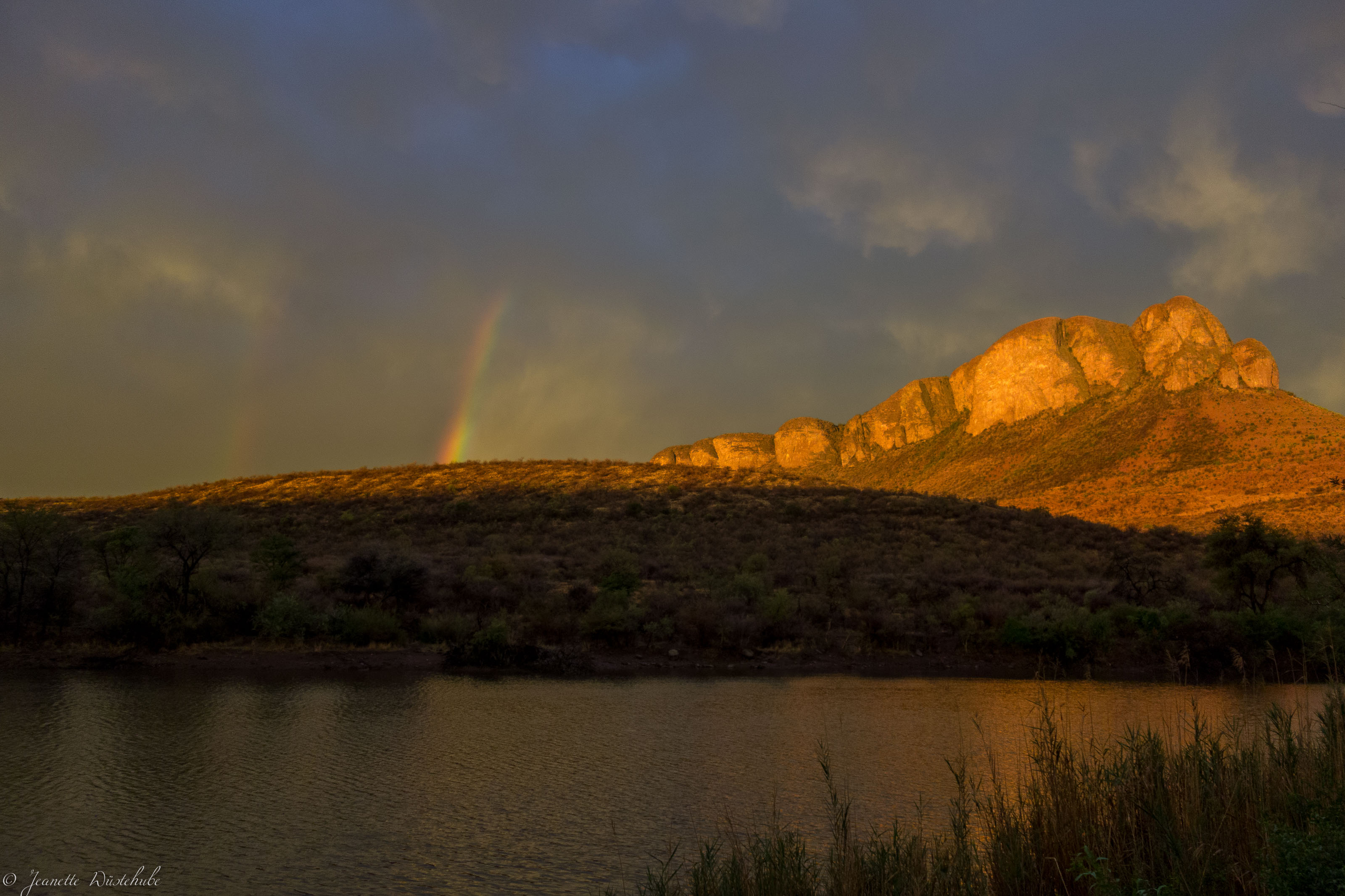 Erst als die Sonne unterging hörte es langsam zu regnen auf und die tiefstehende Sonne zauberte ein traumhaftes Licht auf die Berge auf der gegenüberliegenden Seite des Sees. Es leuchtete so stark, dass es in den Augen weh tat und dann kamen auch noch zwei Regenbögen… das war fast so kitschig wie in einem Gemälde von Caspar David Friedrich, aber eben auch unglaublich schön.