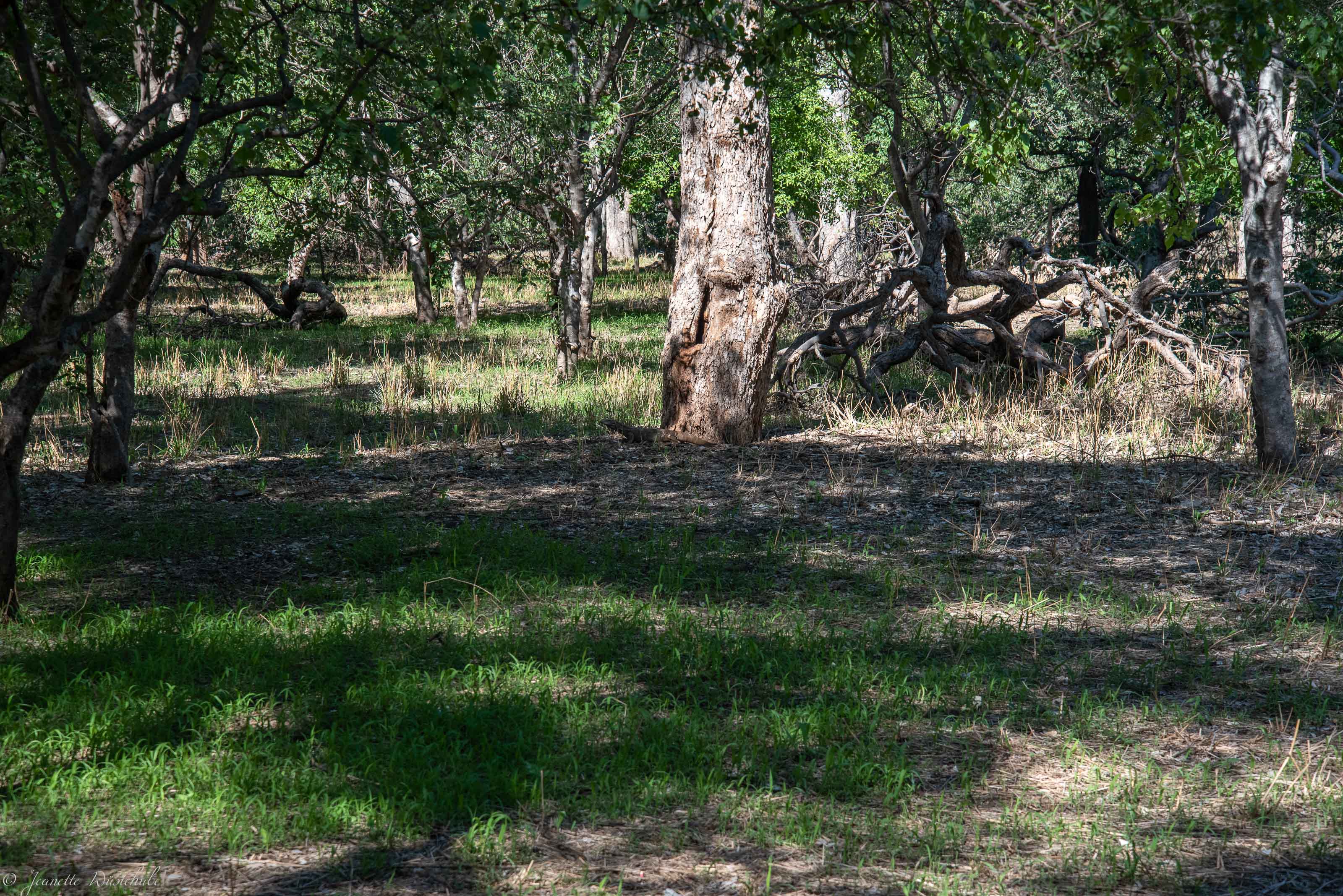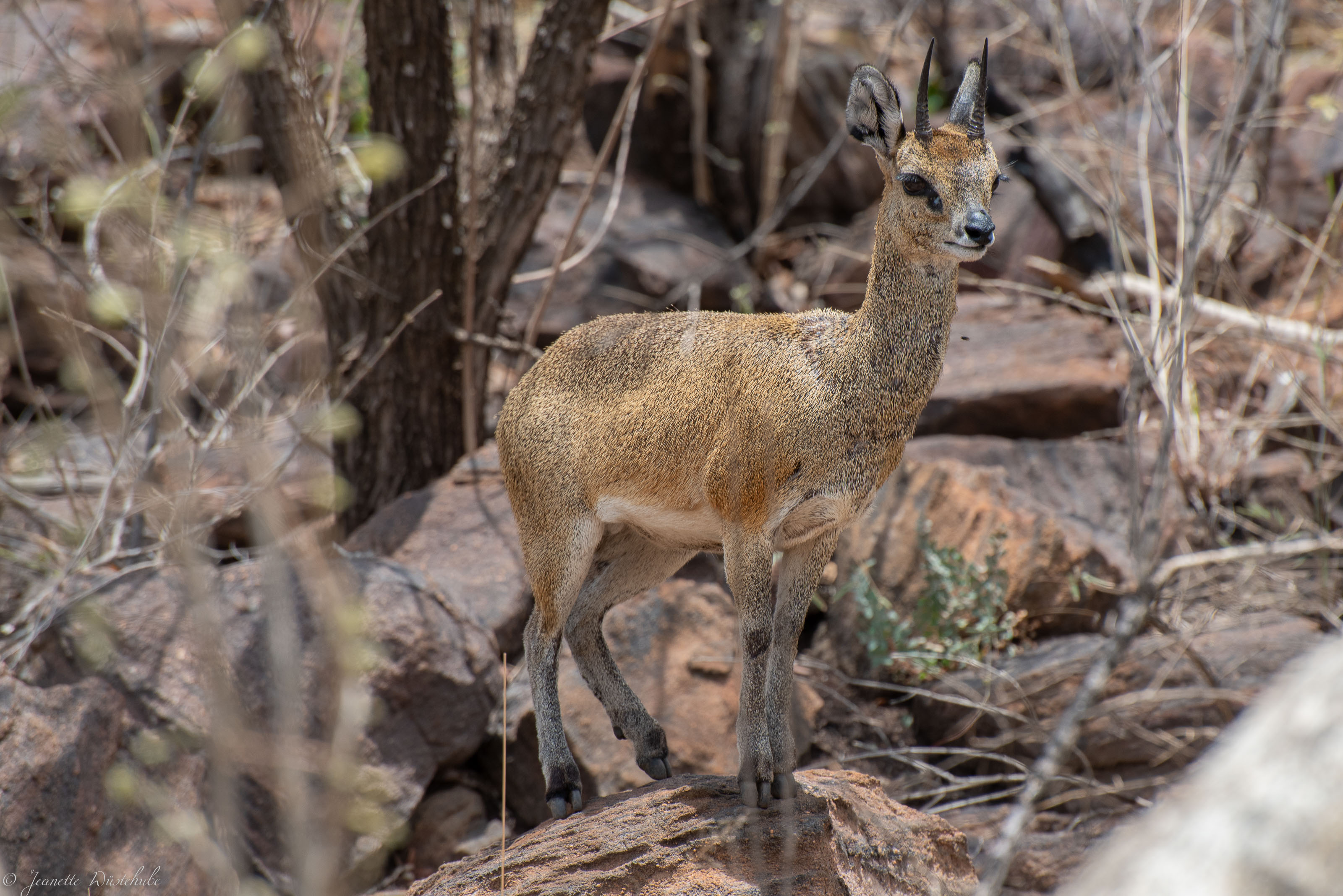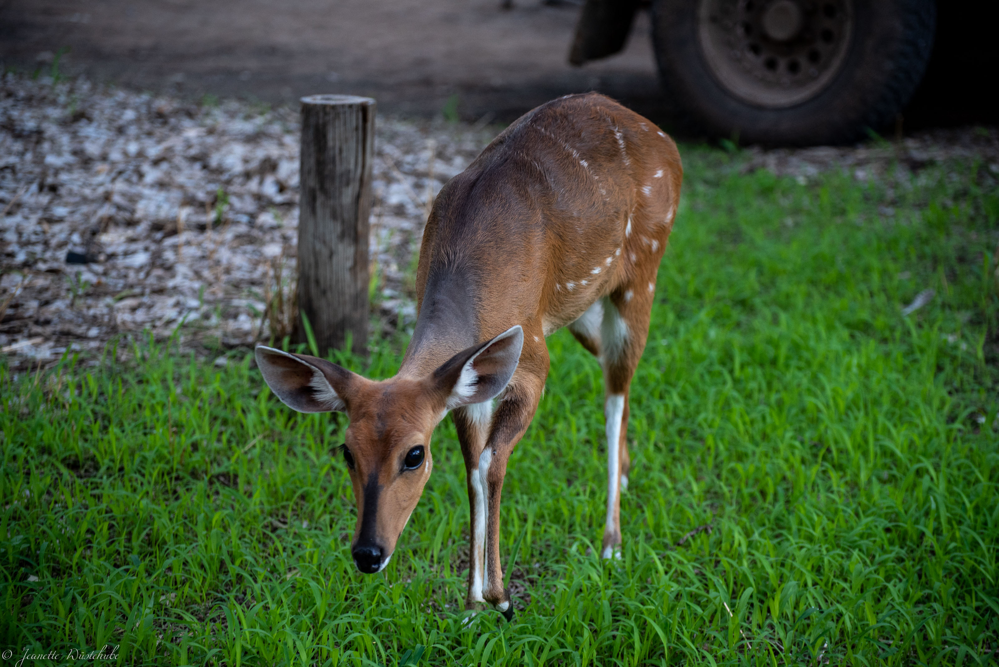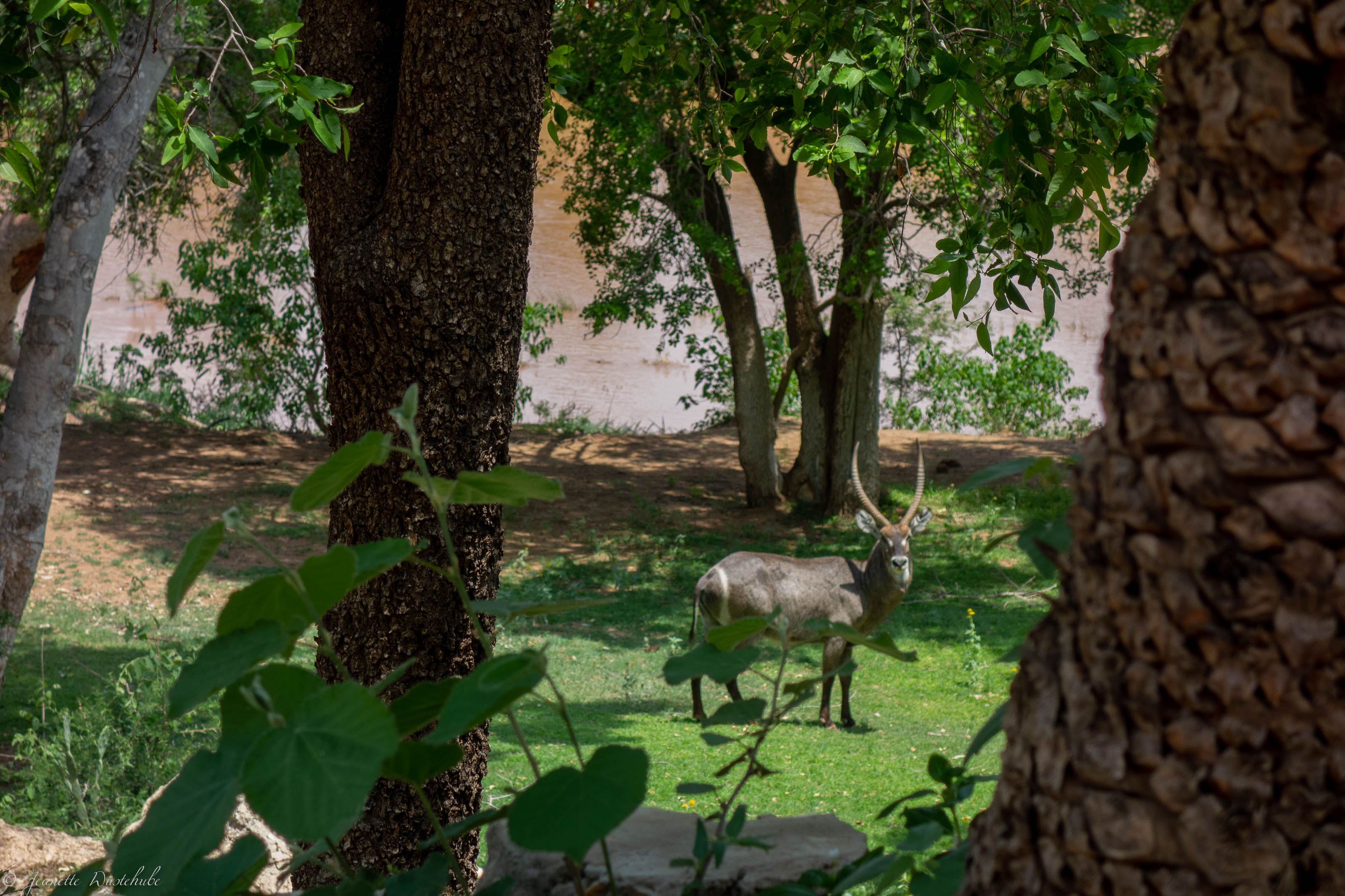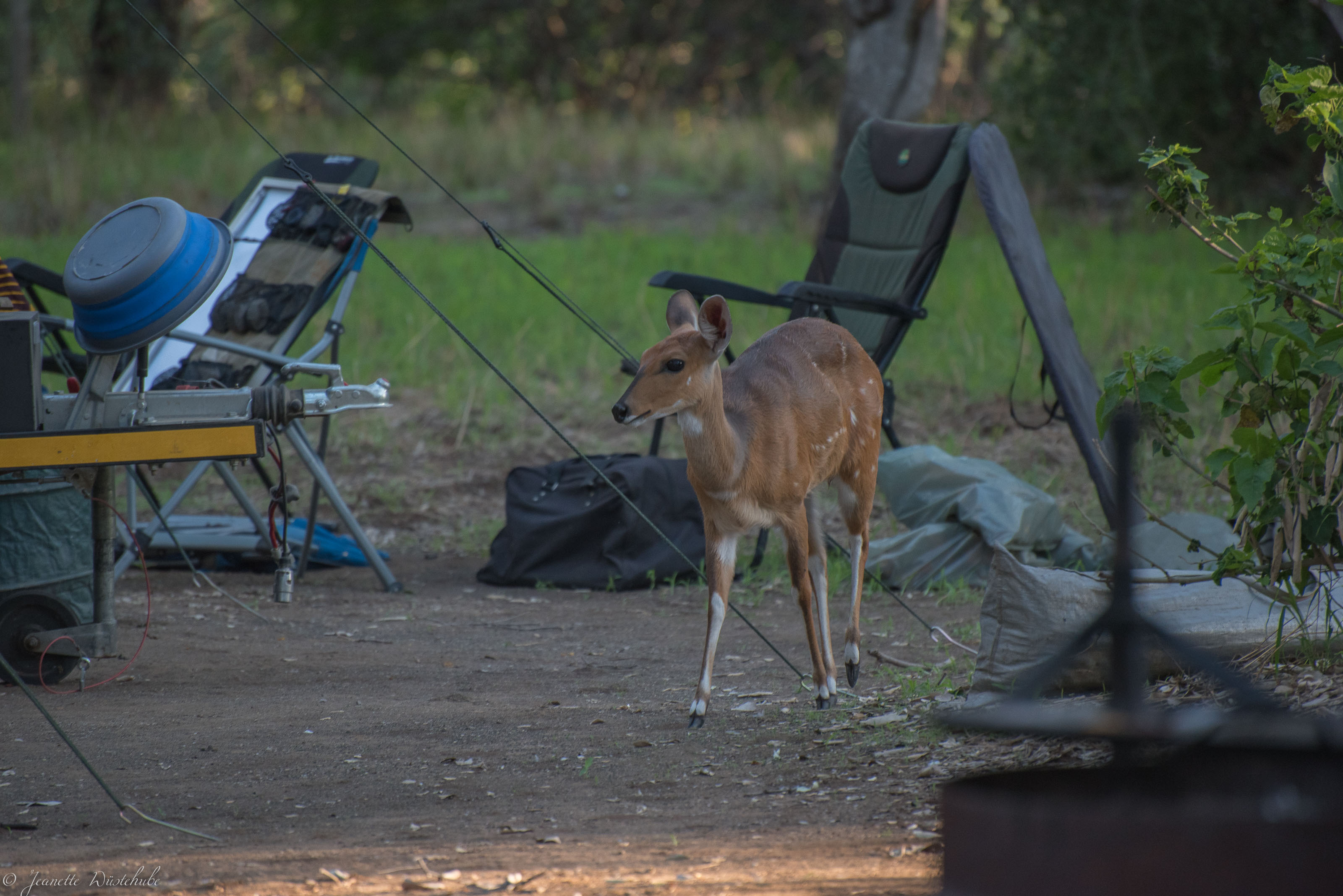 Anschließend fuhren wir die Straße Richtung Musina und über den Ort Alldays weiter zum Mapungubwe Nationalpark. Die Teerstraße war in einem extrem schlechten Zustand und es gab wieder einmal jede Menge tiefe Schlaglöcher. Der Park ist angeblich einer der schönsten, aber auch einer der (noch) unbekannteren in Südafrika. Er liegt im äußersten Norden von Limpopo und grenzt an Botswana und Simbabwe, die auf der anderen Flußssseite des Limpopo liegen. Mapungubwe ist nicht nur Nationalpark sondern wurde von der UNESCO auch als Weltkulturerbe eingestuft. Es gibt vier der großen Fünf (Büffel fehlen), einige schöne Camps und feste Unterkünfte, ein Museum, in dem man etwas über das Gebiet, seine geschichtliche Relevanz und die Ausgrabungen, die im Park stattgefunden haben, erfahren kann und in dem Ausgrabungsstücke ausgestellt sind. Mapungubwe ist in zwei Gebiete aufgeteilt und leider wusste ich bei der Buchung nicht, dass man erst zum Haupteingang fahren, dort einchecken und dann – wenn man eine Unterkunft im westlichen Teil gebucht hat – nicht durch den Park dorthin gelangen kann, sondern nochmal zurückfahren muss. Das bedeutete für uns 40 zusätzliche Kilometer und fast eine Stunde Umweg. Im Mapungugbwe liegen auch einige Citrus-Plantagen und kurz vor dem Eingang zum Park sahen wir –außerhalb der Parkgrenzen – Elefanten und Gnus. Dann änderte sich die Landschaft und wir fuhren eine Weile durch urwaldartig anmutendes Gebiet mit hohen, von Schlingpflanzen bewachsenen Bäumen und Palmen. Als wir am Matshou Campingplatz ankamen, waren nur noch drei Plätze frei und darum fiel die Wahl für einen Platz ausnahmsweise einmal leicht. Es war wieder sehr heiß geworden und wir hatten glücklicherweise durch die zahlreichen hohen Bäume ein bisschen Schatten. Etwa 20 Plätze lagen nah beieinander und waren im Kreis zu dem im Zentrum liegenden sehr kleinen Ablutionblock angeordnet. Ich ließ meinen Blick in die umliegenden Bäume schweifen und sah dabei einen Waran aus einem Loch in einem der Baumstämme krabbeln und schaute diesem eine Weile zu. Dann bekamen wir noch Besuch von einem Buschböckchen, das offenbar schon von Campern angefüttert worden war und überhaupt keine Scheu mehr hatte. Tom versuchte es mit Gras zu füttern, aber es war eher scharf auf unsere Kekse, die wir der hübschen Antilope natürlich nicht gaben. Sie kam trotzdem immer wieder vorbei.