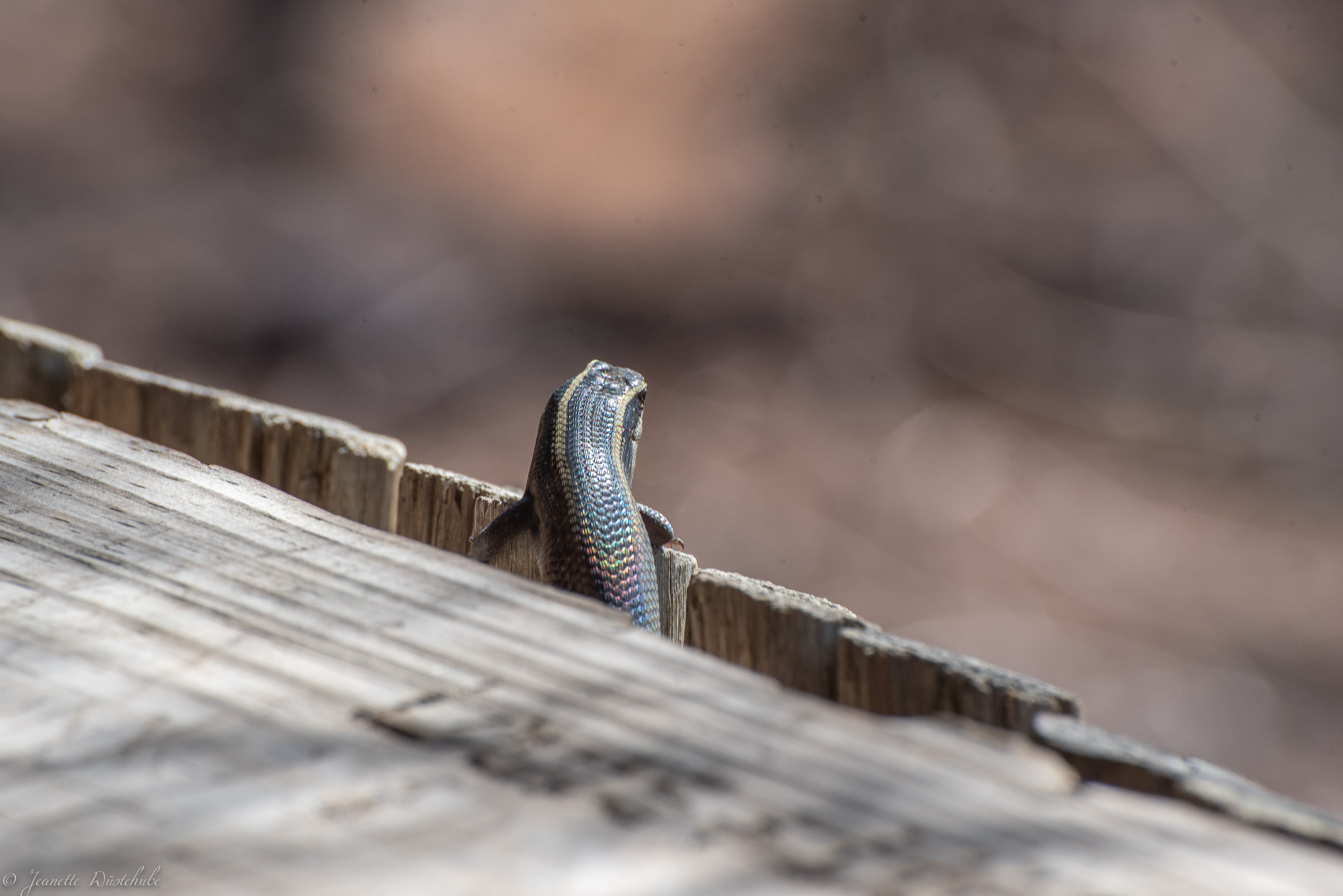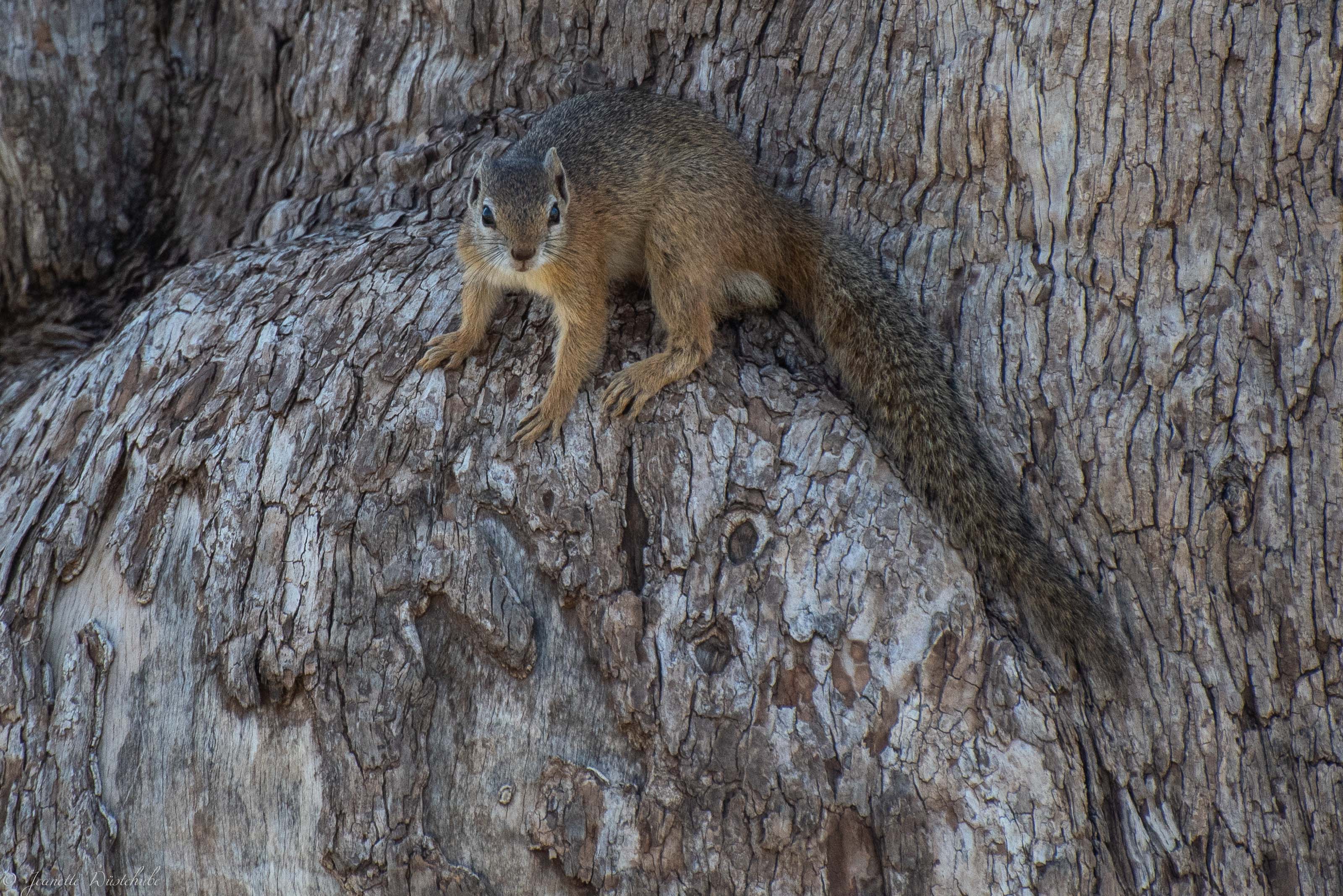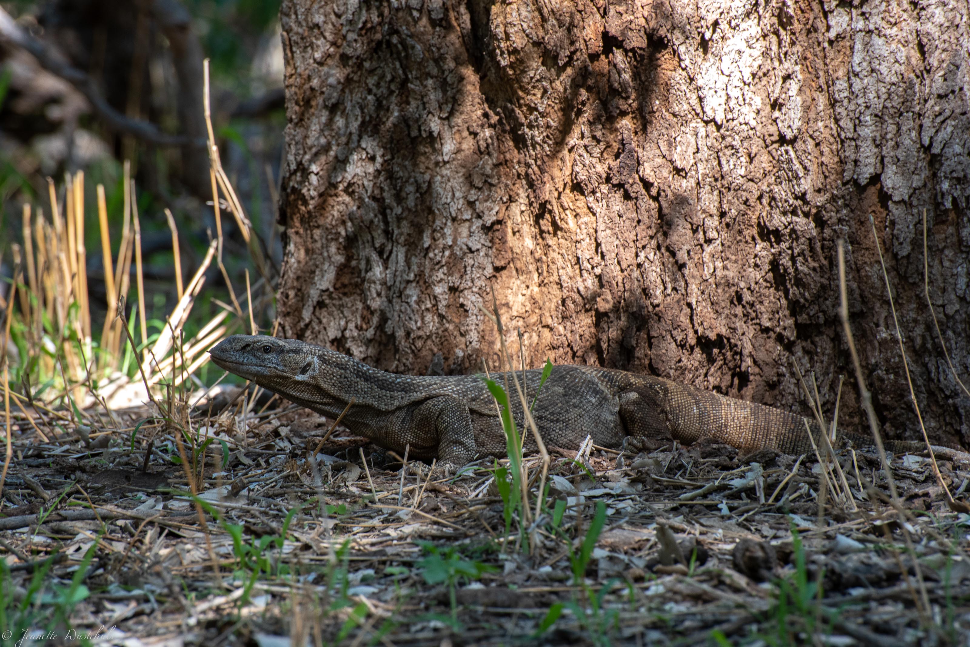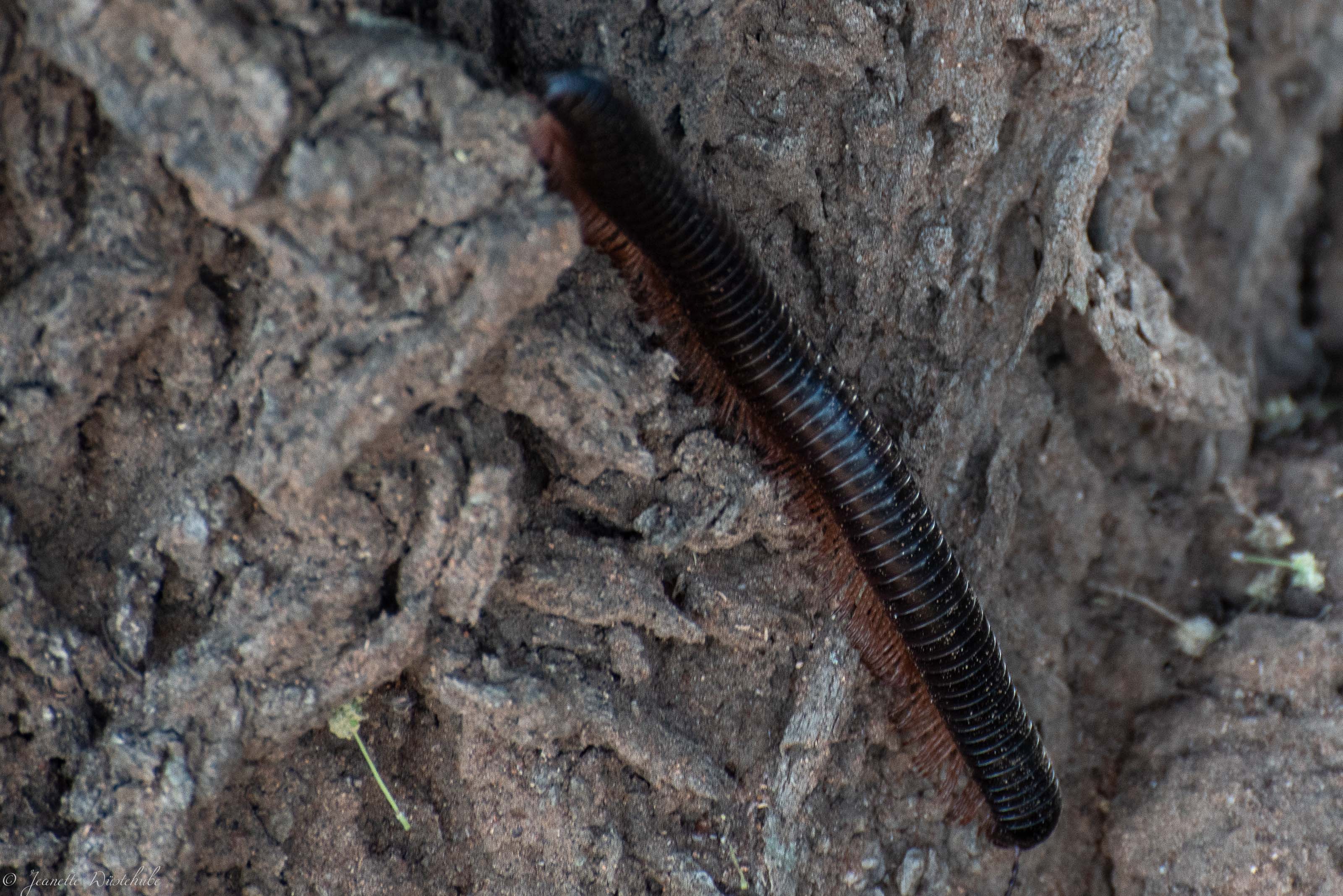 Die Rezeptionistin gab uns Platz Nr. 18. Auf dem Plan kam uns die Strecke dorthin etwas lang vor und wir fragten, ob wir denn von dort auch zur Rezeption und der Bar laufen könnten. Ja, das wäre möglich. Man solle nur aufpassen wegen der wilden Tiere. Ok. Wir fuhren also zu unserem Platz, und stellten fest, dass dieser ungefähr 5 km von der Rezeption entfernt lag. Mal eben auf ein Bier an die Bar laufen wäre ein wenig weit, aber laufen hätte man natürlich prinzipiell schon können. Vielleicht hätten wir die Frage anders formulieren müssen 🙂 Wir fuhren die Strecke noch zwei Mal hin und her, weil man uns eigentlich einen Platz am Pool zugesagt hatte, wir dorthin aber auch schon über 1,5 Kilometer hätten laufen müssen und dann nochmal, weil der alternative Platz auch nicht wesentlich näher zum Pool lag und es dort dann auch noch keinen Schatten dafür aber viele Nachbarn gab. So hatten wir wenigstens einen Platz für uns mit Schatten. Also blieben wir schließlich bei Nummer 18. Es war unerträglich heiß an dem Tag, da wir aber durch die viele Hin- und Herfahrerei schon einiges an Zeit verplempert hatten, kamen der Abend und damit die etwas kühleren Temperaturen relativ schnell. Wir kochten und ich suchte mit dem Blaulicht das noch immer verschollene Chamäleon. Diesmal fand ich einen recht großen Skorpion, der sich zwischen Baum und Rinde versteckte.