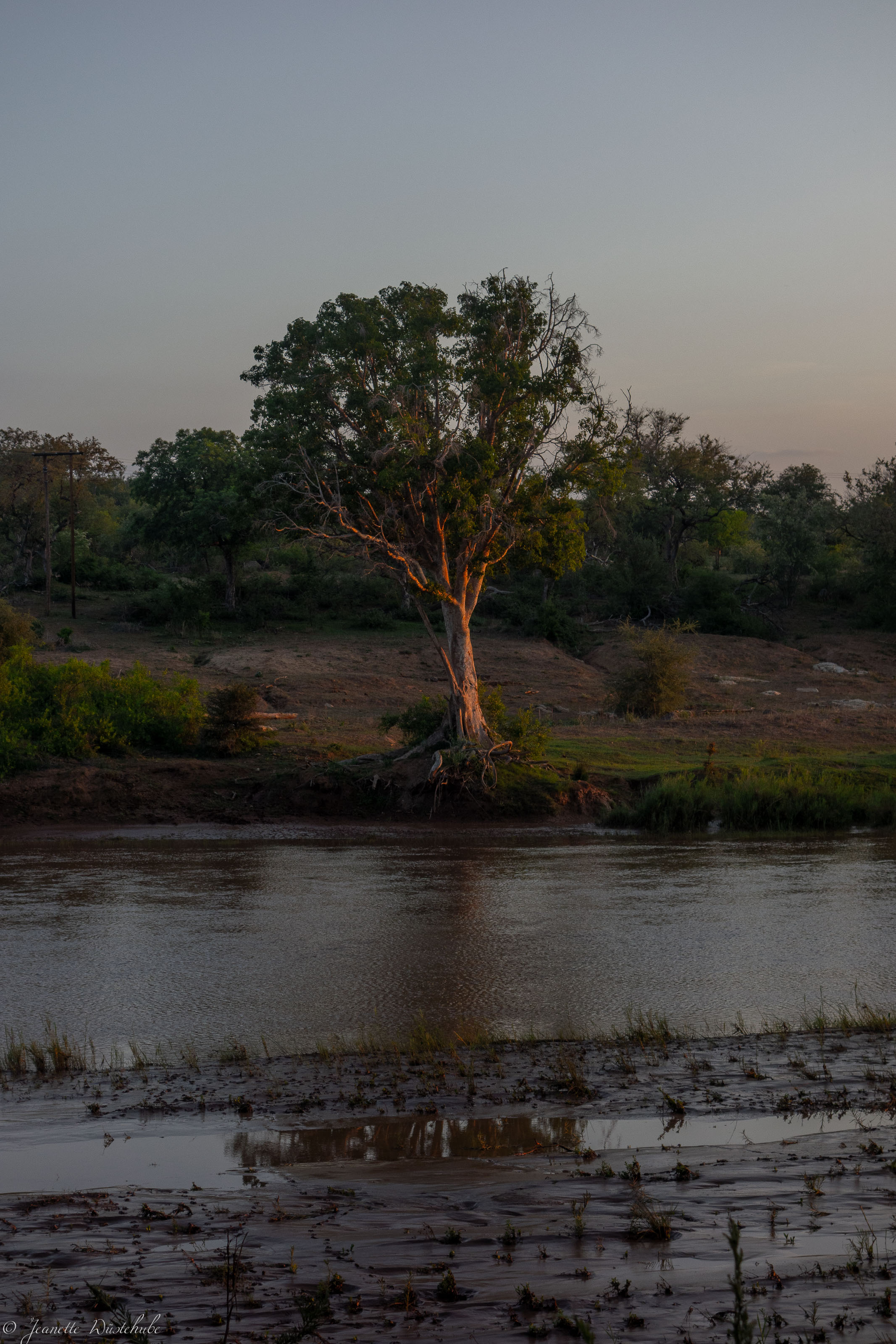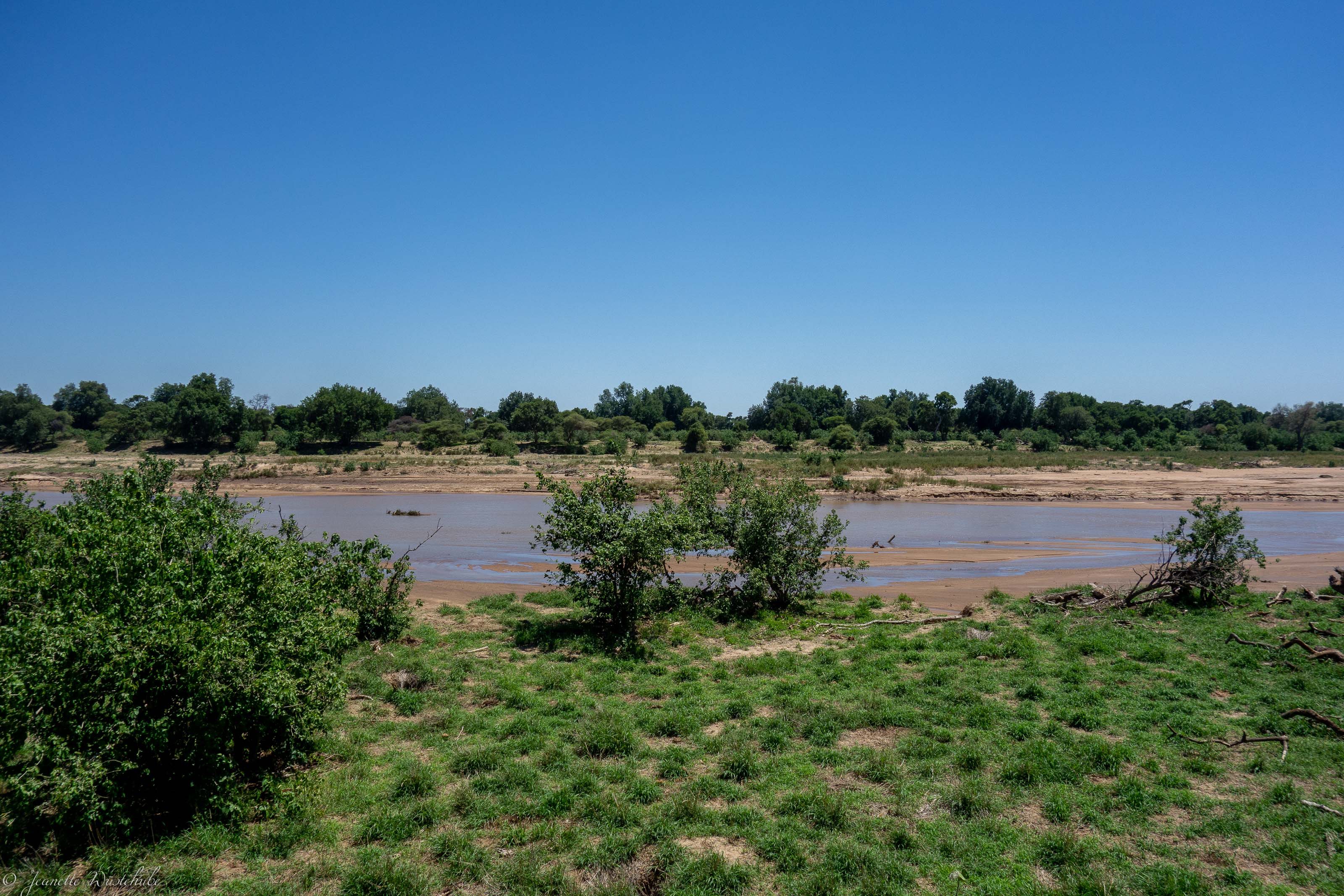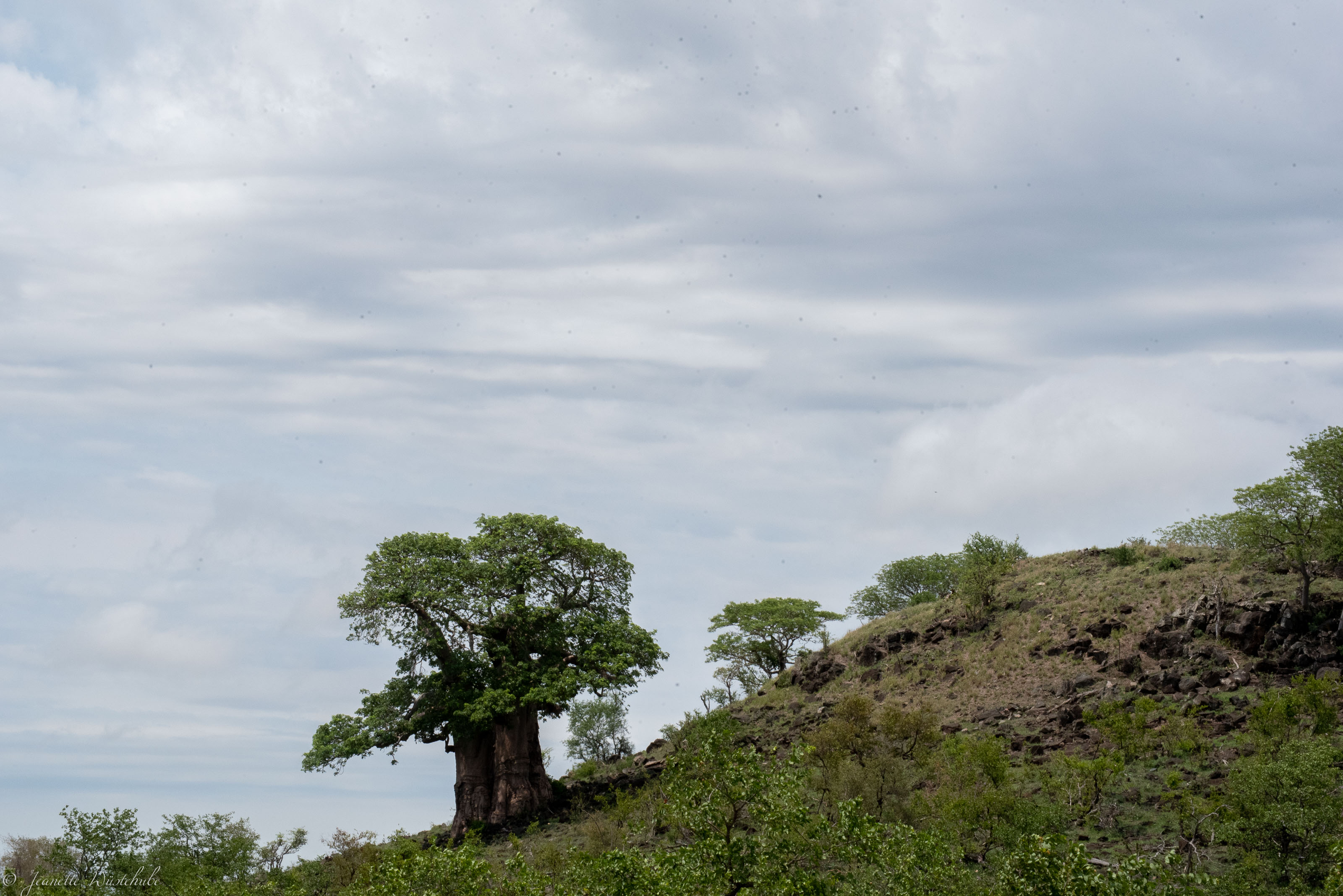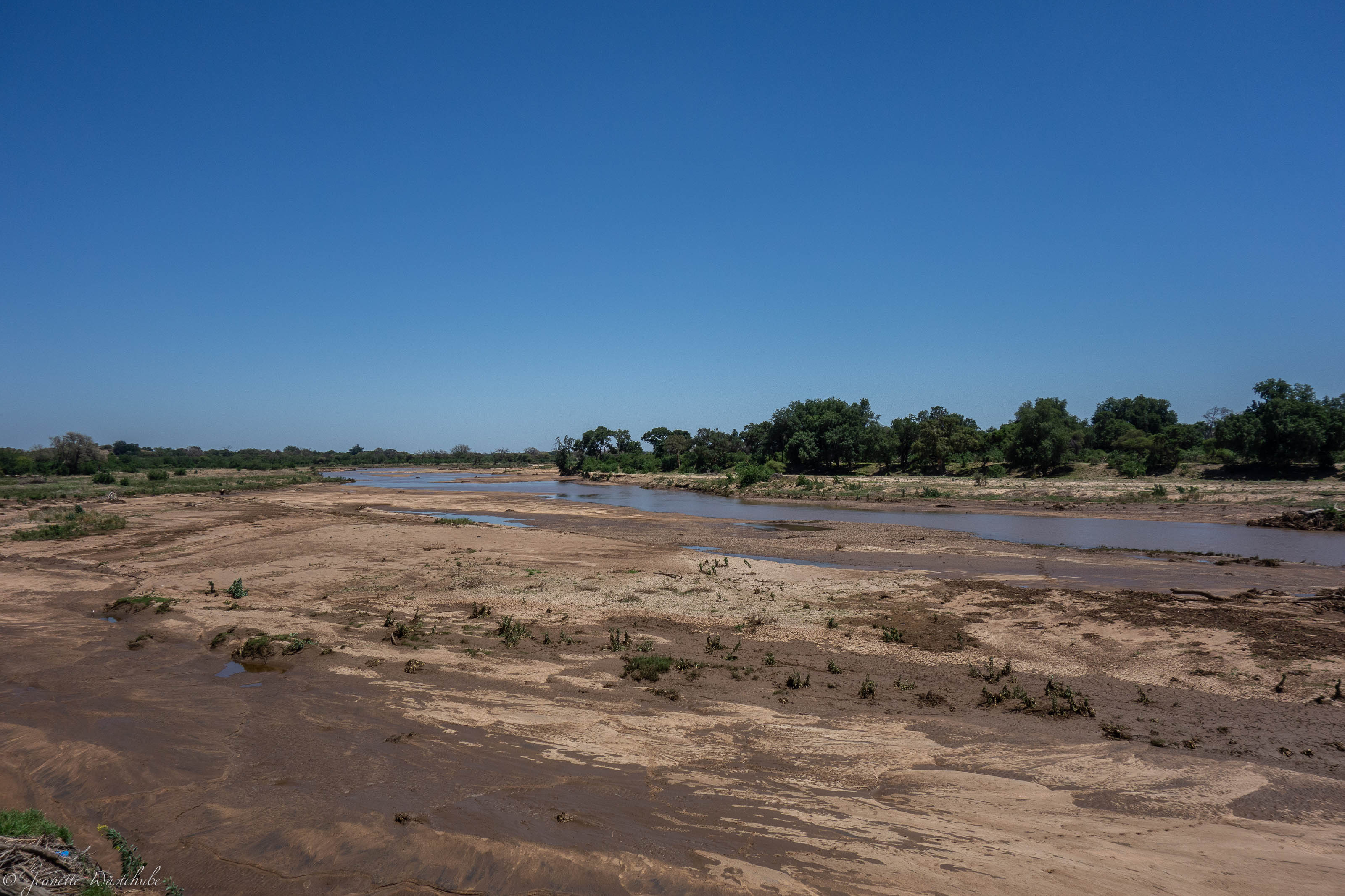 Wir fuhren weiter Richtung Süden und waren überrascht, dass uns doch nicht so viele Autos und Menschen begegneten wie befürchtet. Teilweise sah man selbst auf der Hauptstraße für längere Zeit kein anderes Auto. Nur an den Rastplätzen und in den großen Restcamps war viel los. Das Tamboti Tented Camp, wo wir unseren dritten Stopp hatten, liegt noch ein Stück weiter südlich kurz vor dem Orpen Gate und verfügt über 40 feste Zelte, die überwiegend entlang des Flusses aufgestellt sind. Der Fluss war trocken und wir hatten das vorletzte Häuschen mit eigener Küche, die wir aber nicht brauchten, weil wir bereits im Letaba Restcamp früh zu Mittag gegessen hatten. Hier sahen wir auch die einzigen anderen Deutschen während unseres Krüger-Besuchs, die sich lustigerweise Müsli mit Joghurt aber ohne Müsli bestellten und dazu Whiskey Cola 🙂