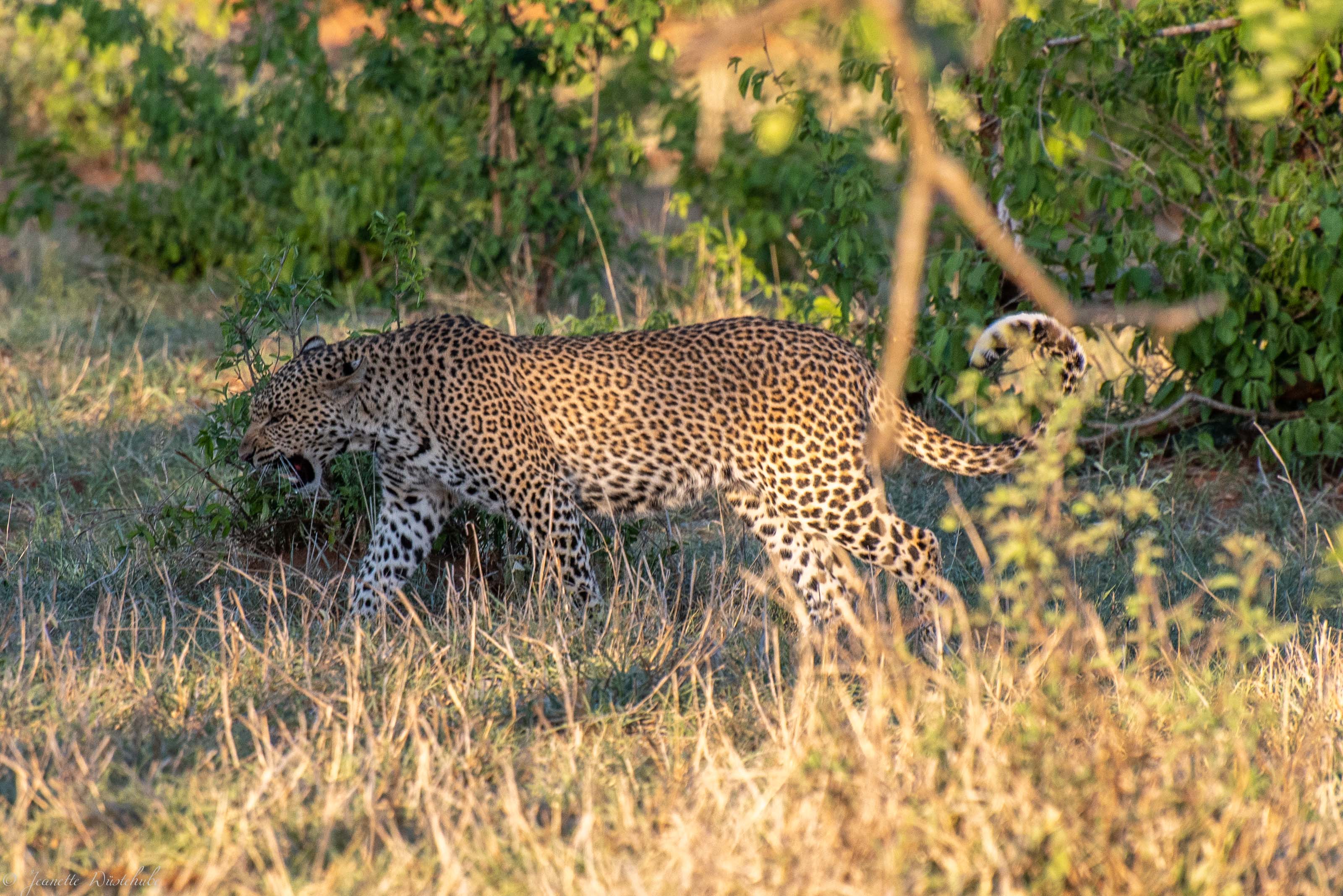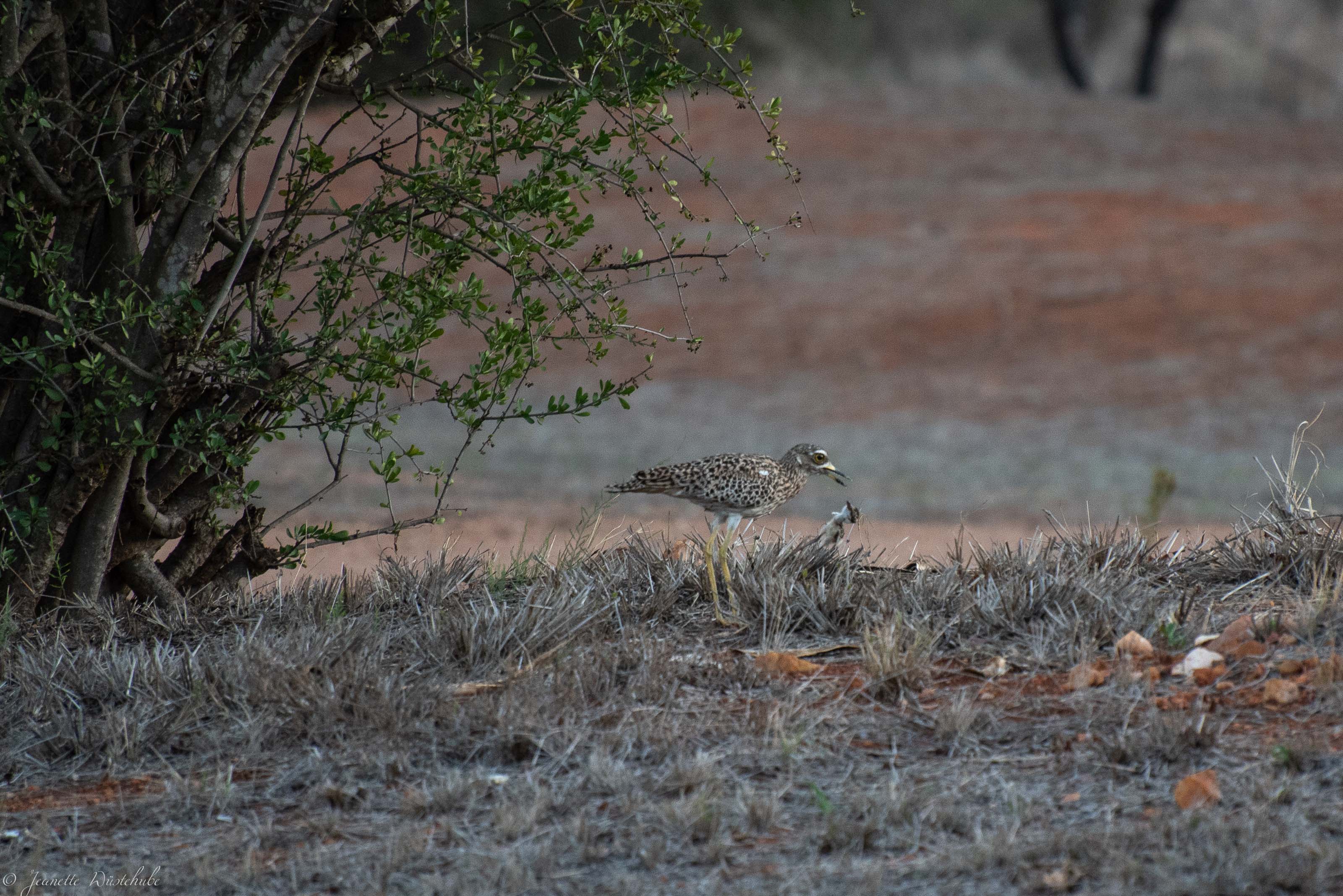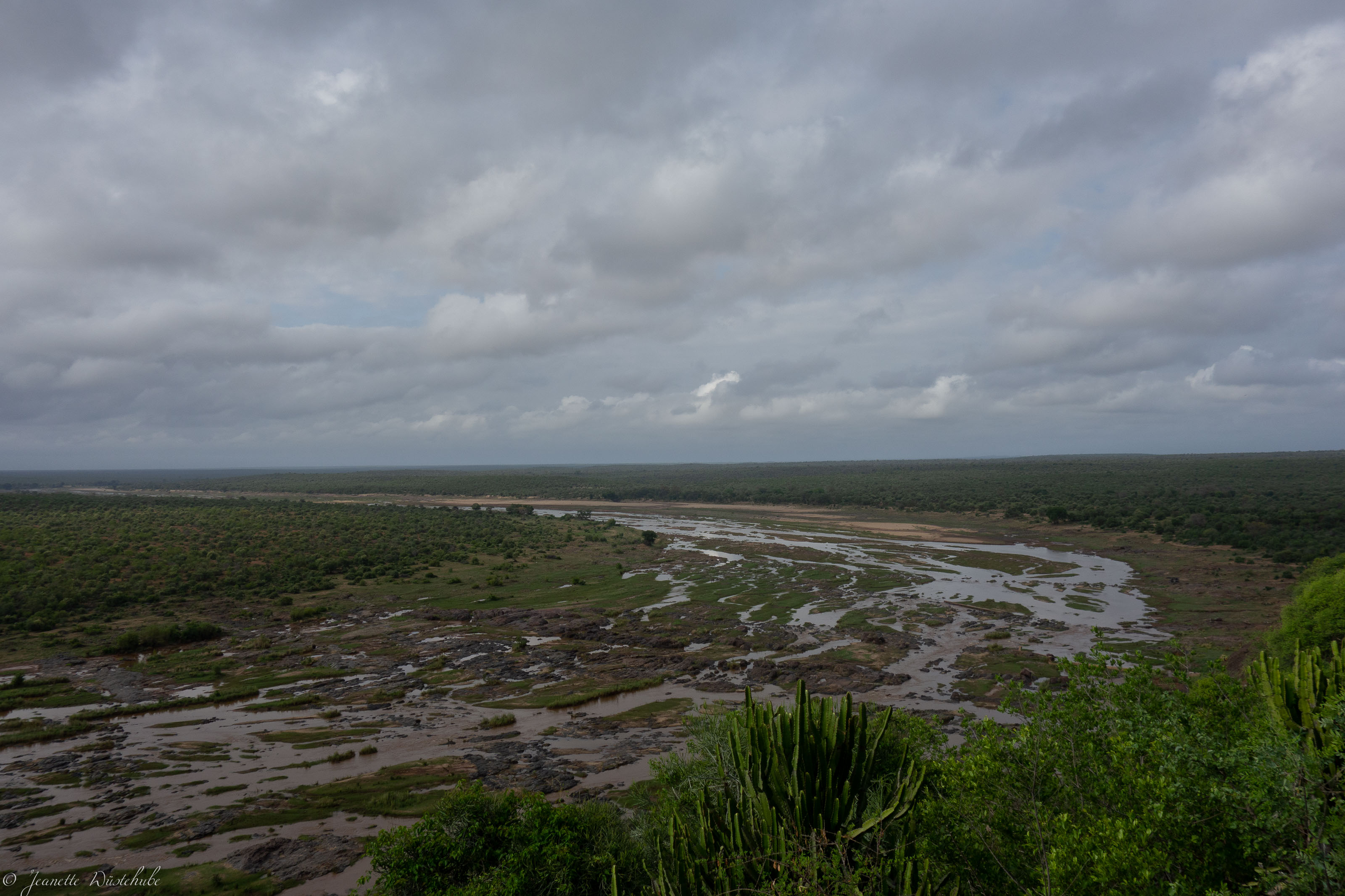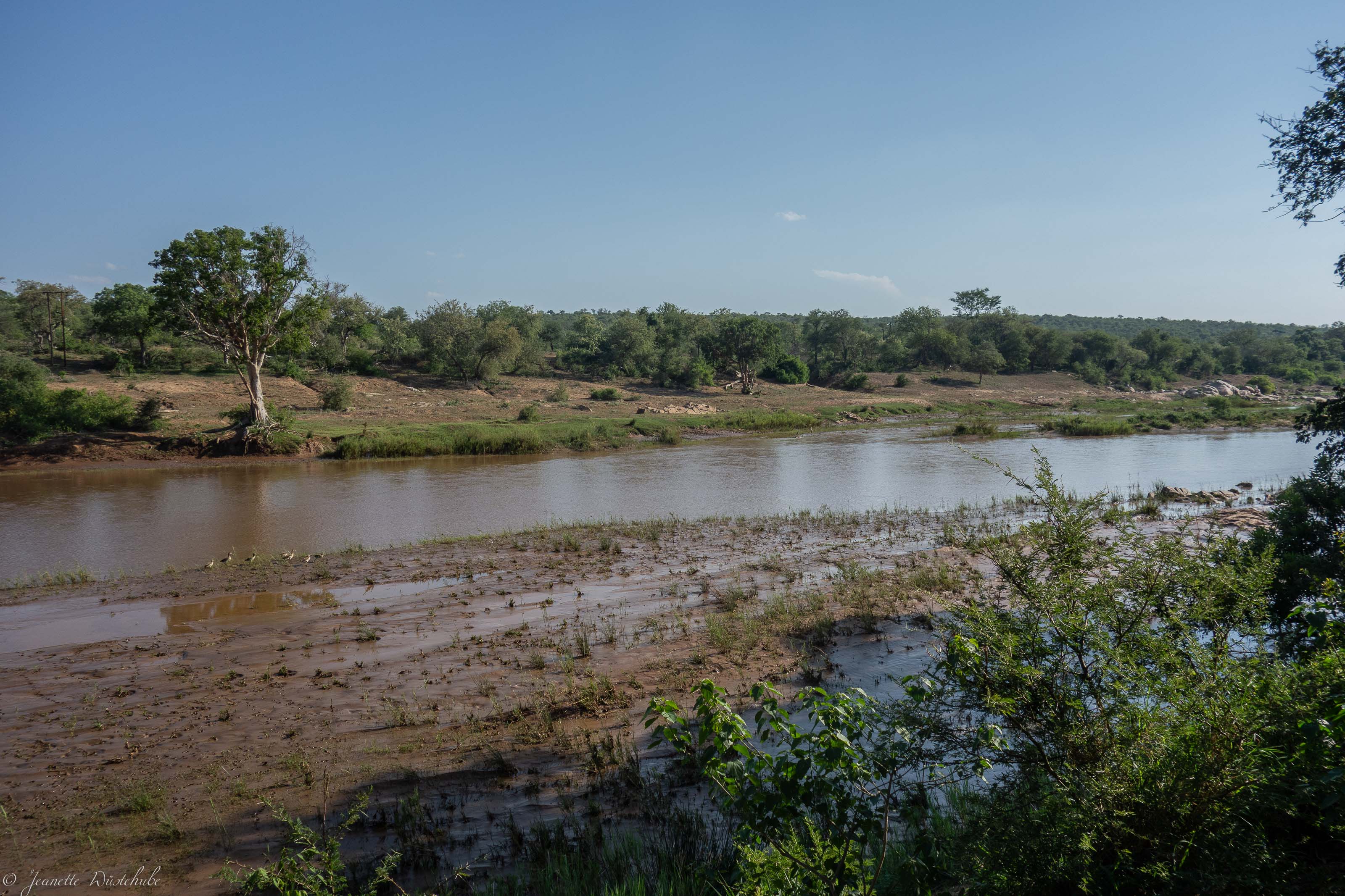 Wir fuhren weiter Richtung Süden und waren überrascht, dass uns doch nicht so viele Autos und Menschen begegneten wie befürchtet. Teilweise sah man selbst auf der Hauptstraße für längere Zeit kein anderes Auto. Nur an den Rastplätzen und in den großen Restcamps war viel los. Das Tamboti Tented Camp, wo wir unseren dritten Stopp hatten, liegt noch ein Stück weiter südlich kurz vor dem Orpen Gate und verfügt über 40 feste Zelte, die überwiegend entlang des Flusses aufgestellt sind. Der Fluss war trocken und wir hatten das vorletzte Häuschen mit eigener Küche, die wir aber nicht brauchten, weil wir bereits im Letaba Restcamp früh zu Mittag gegessen hatten. Hier sahen wir auch die einzigen anderen Deutschen während unseres Krüger-Besuchs, die sich lustigerweise Müsli mit Joghurt aber ohne Müsli bestellten und dazu Whiskey Cola 🙂