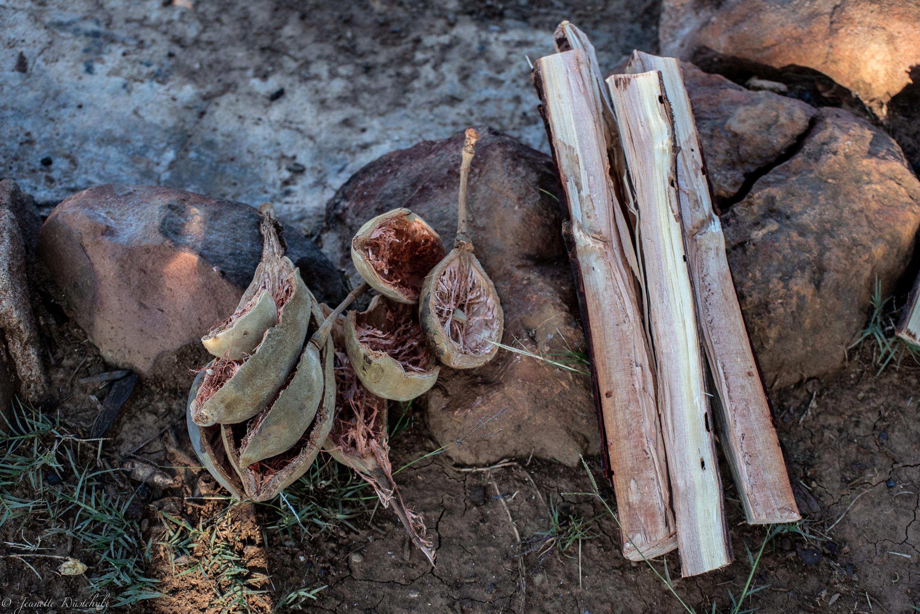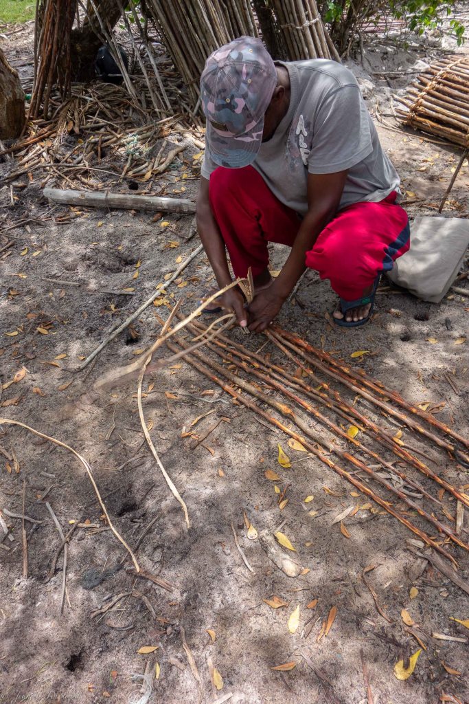 Er zeigte uns noch seine Werkstatt, in der die Zäune für den Kraal erstellt wurden, indem Silver-Oak-Hölzer mit Streifen von Blättern der unechten Bananenpalme zusammengeflochten werden. Es gibt keine Nägel oder andere Hilfsmittel. Alles wird von Hand und nur mit Naturmaterialien gebaut.