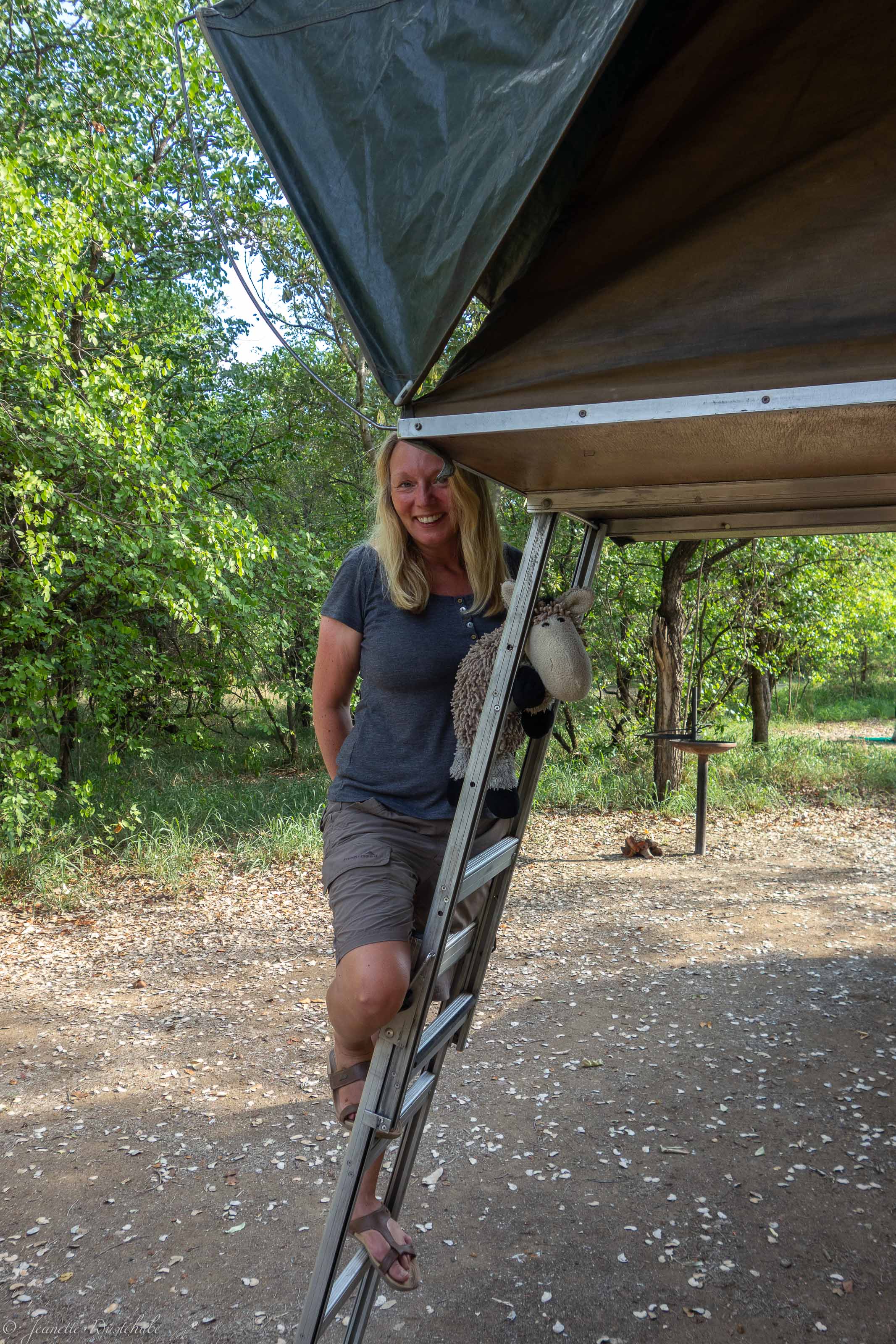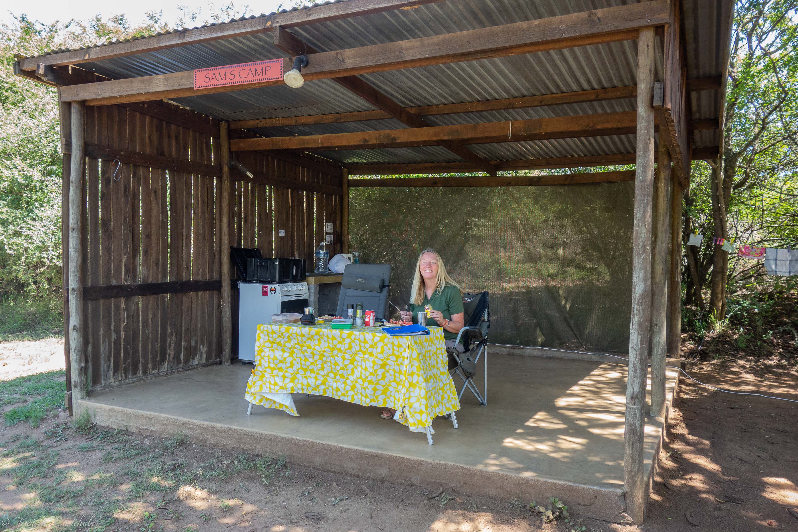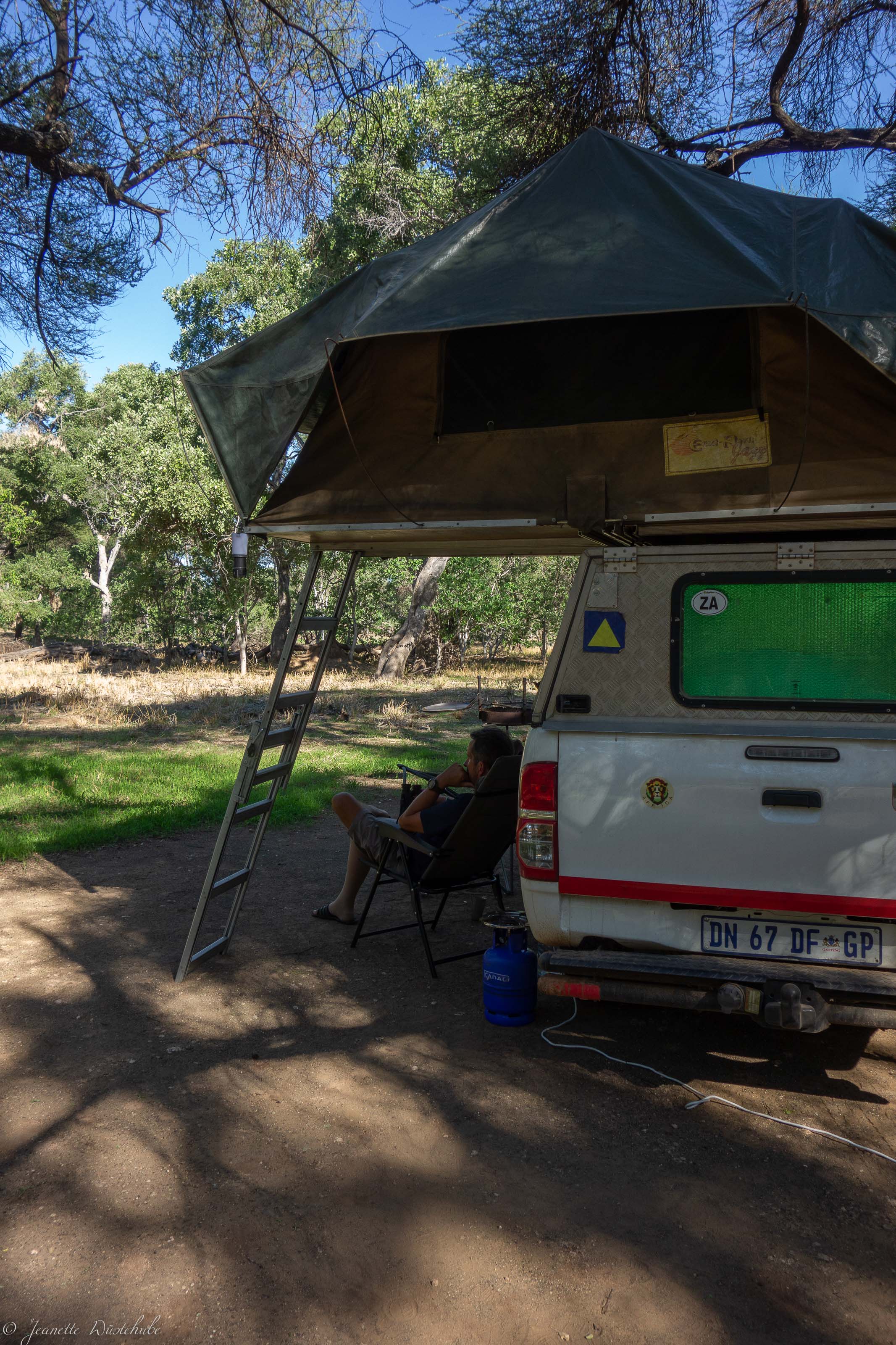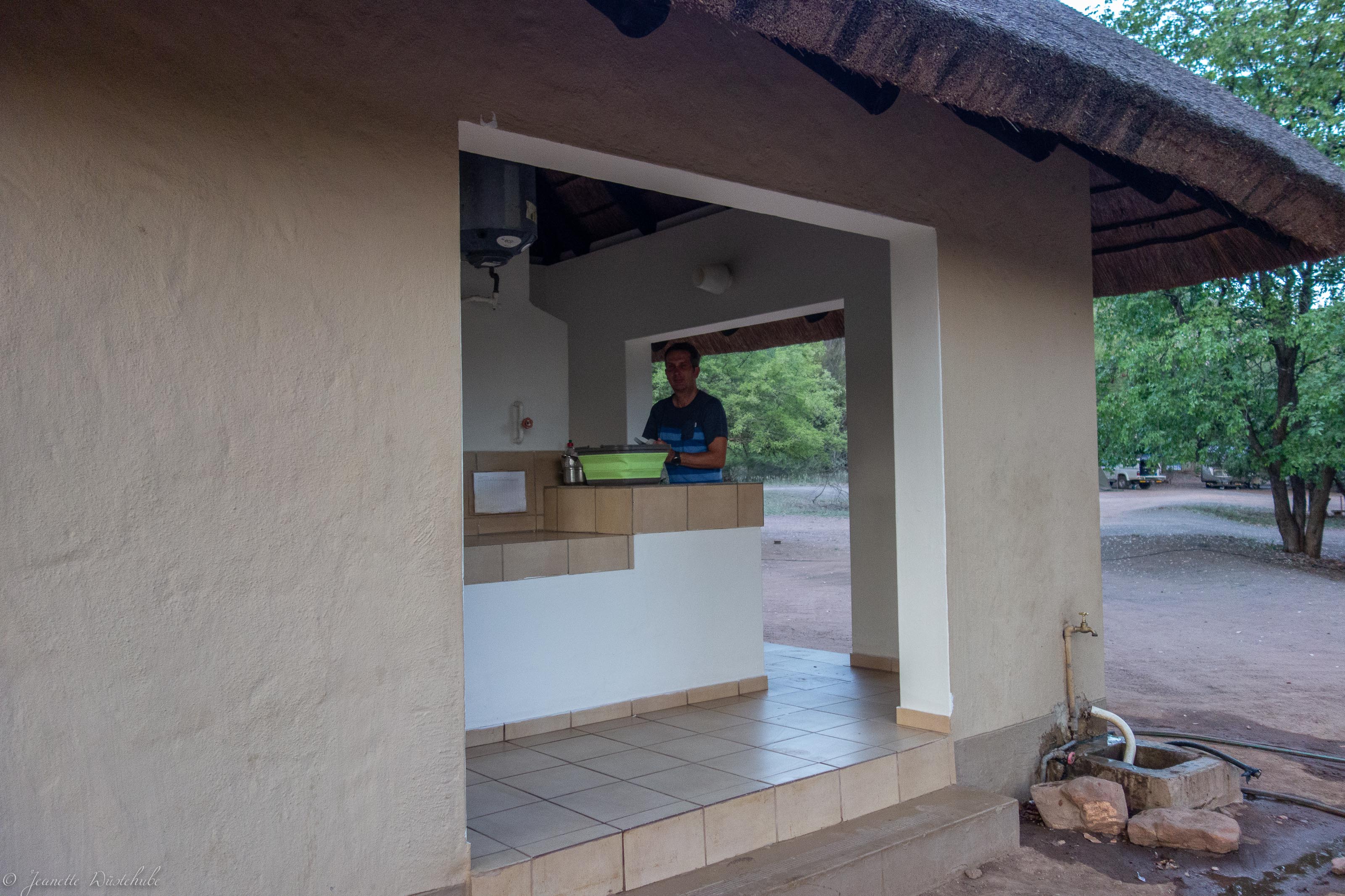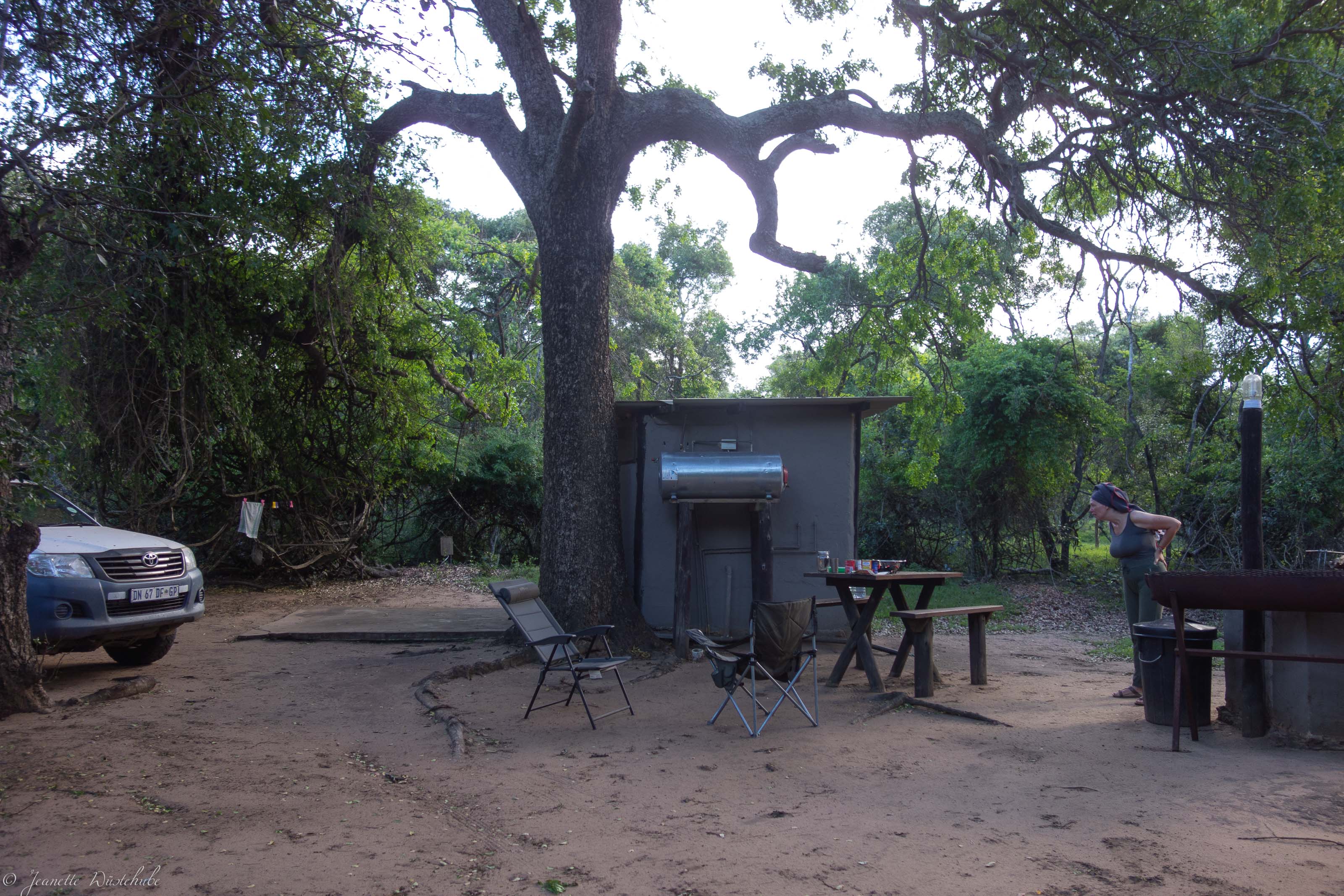 Mit der Frau, der der nächste Campingplatz gehörte, hatte ich bei der Buchung einen netten Austausch per Mail und bei der Zvakanaka Campsite sieht man, dass es auch ganz anders geht. Gail hatte mir, als ich wegen einer Übernachtung angefragt hatte, geschrieben, dass sie einen Platz anbieten könne, aber sie mir ans Herz legen wolle, vielleicht doch zwei Nächte zu bleiben, weil alle ihre Gäste danach immer sagten, sie hätten lieber mindestens zwei Nächte buchen sollen. Also änderten wir den Plan und sagten die ursprünglich in der Boma in the Bush geplanten zwei Nächte ab, blieben dort nur eine (als hätten wir es geahnt :-)) und buchten zwei Nächte bei Gail, die noch schrieb, dass wir nichts zahlen müssten, wenn wir danach sagen würden, es sei die falsche Entscheidung gewesen. Wir bekamen eine ausführliche Anfahrtsbeschreibung mit dem Code für das Gate und durften uns einen Platz aussuchen. Die Plätze waren alle nach Personen benannt, die maßgeblich beim Bau geholfen hatten und wir wählten „Sam“. Es hat uns sofort super gefallen. Neben einem Grill gibt es eine Lagerfeuerstelle, einen überdachten Bereich mit Herd, Wasserkocher, Stromanschluss und Waschbecken. Umbani konnten wir unter einem Baum parken. Wir haben Blick auf die umliegenden Felsen. Neben dem wirklich für Camping-Ablutions hübschen Dusch- und Toilettenhäuschen steht sogar eine Waschmaschine mit Waschmittel und Wäschespinne, in der man für umgerechnet 1,10 Euro seine Kleidung waschen kann. Es ist alles mit viel Liebe zum Detail gebaut worden. Man vertraut darauf, dass sich die Gäste ehrlich verhalten. Das Geld für die Campsite, extra Feuerholz und ggf. die Nutzung der Waschmaschine kann man in bereitgestellte Kuverts legen, die man in den Safe bei den Ablutions steckt.