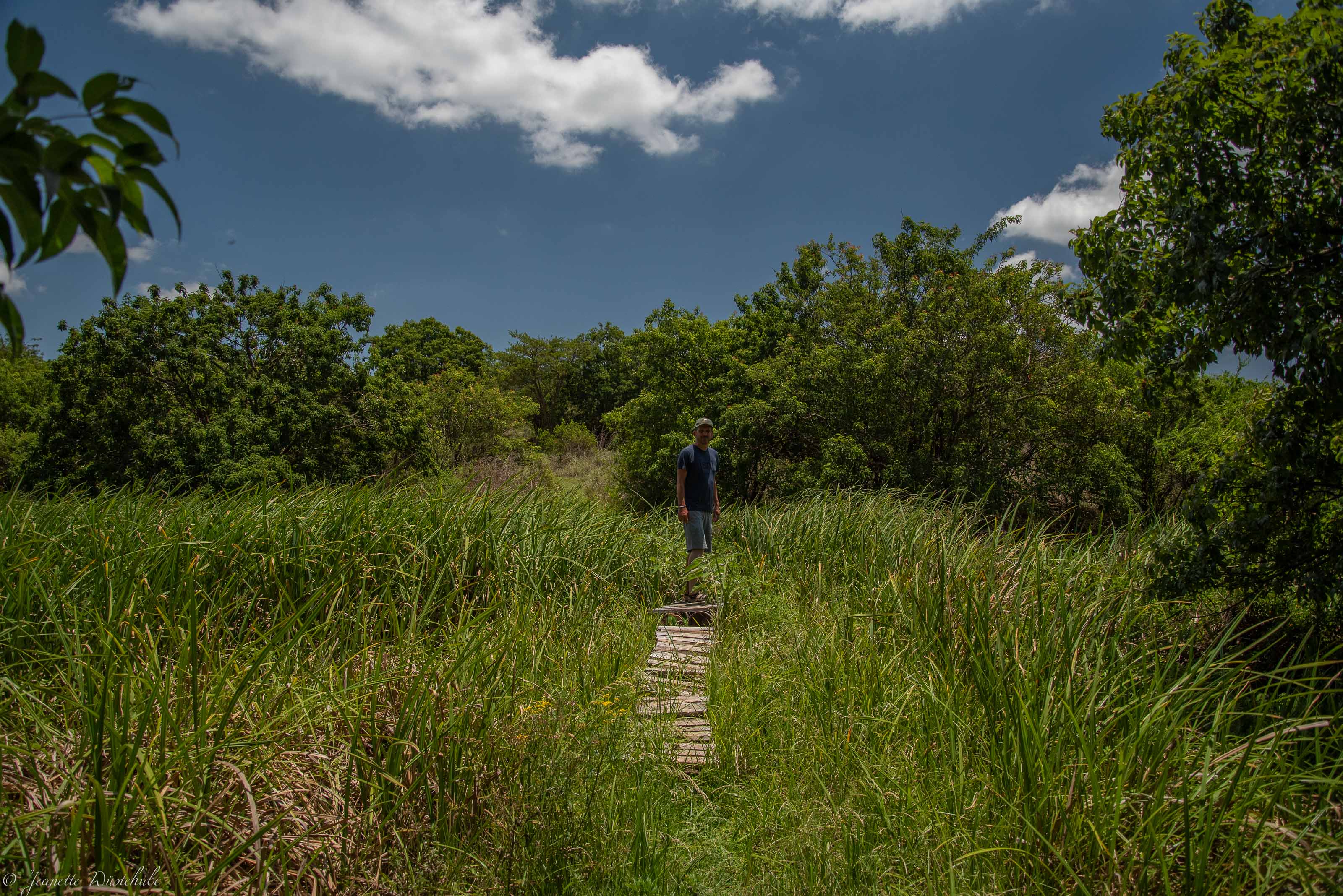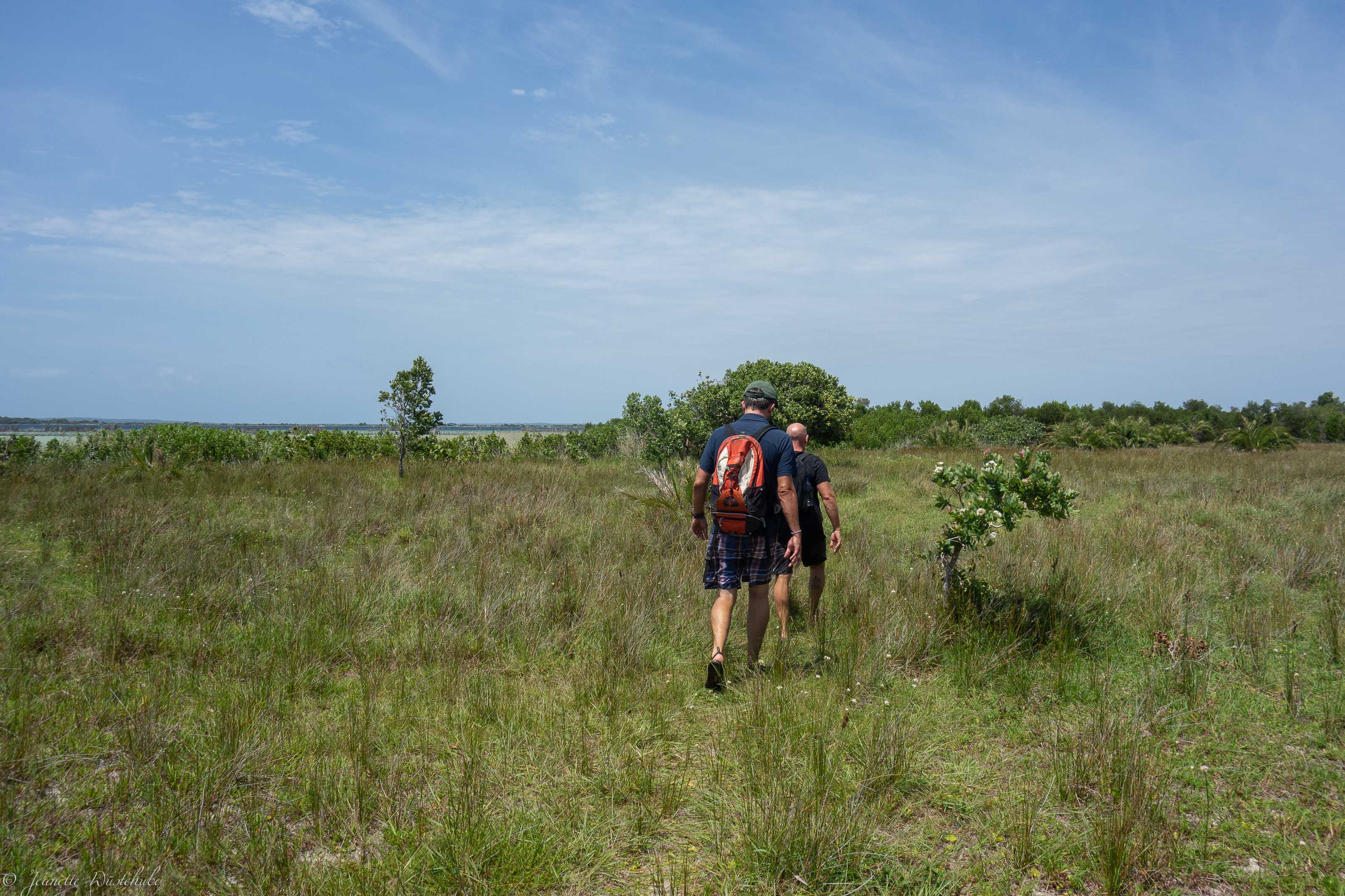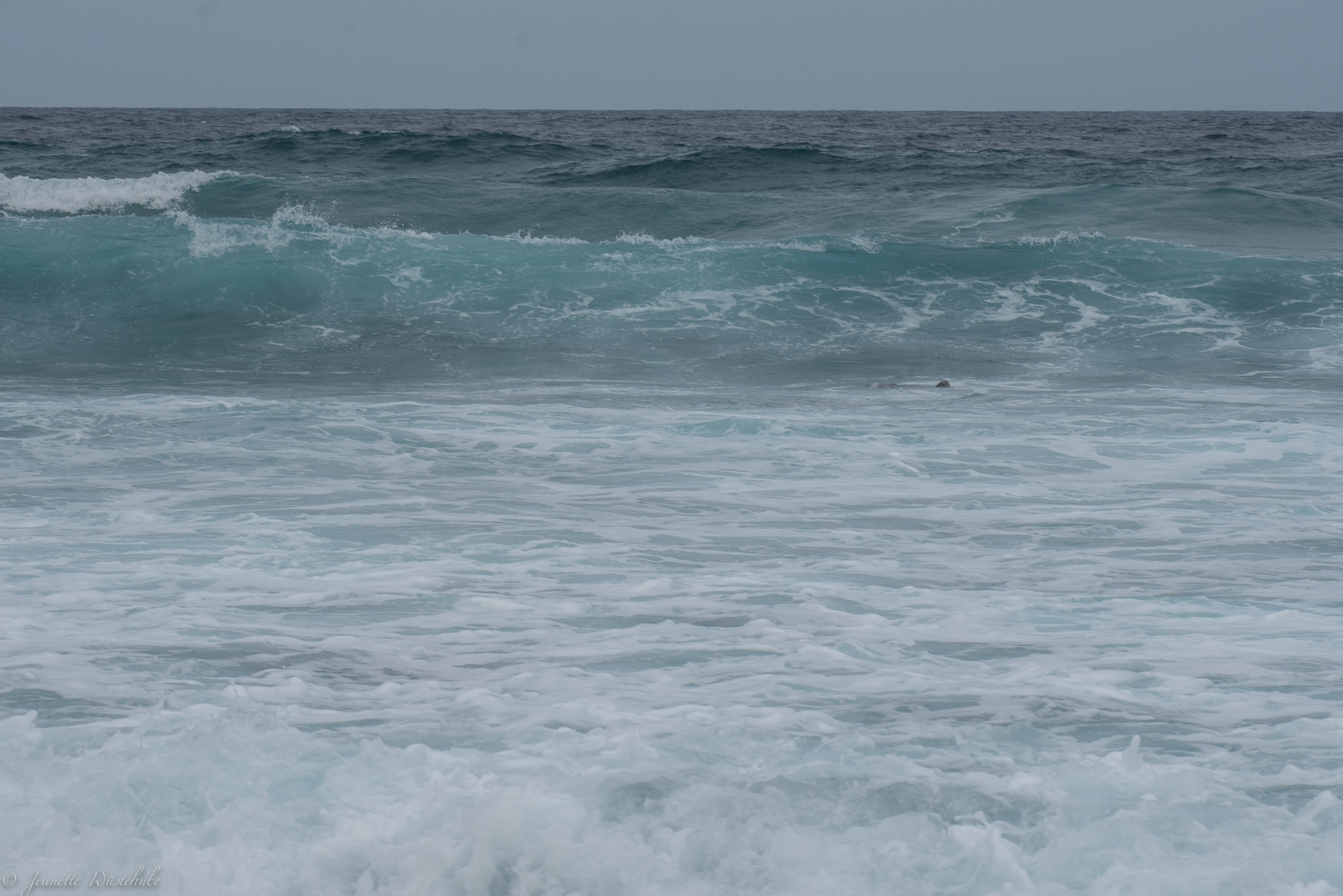 Die Strände sind geschützt und man darf nur mit Lizenz hier entlang laufen. Deshalb war hier auch niemand außer uns unterwegs. Ich sah aufs Meer und erblickte einen Schildkrötenkopf. Trevor meinte, es gäbe hier ein Riff, von dem die Tiere aßen. Leider konnten wir nicht rein und an dem Riff schnorcheln. Das Meer war sehr stürmisch und es gab wohl auch eine recht starke Strömung. Es tauchten noch weitere Köpfe auf und Trevor meinte, es handele sich entweder um Leatherbacks (Lederschildkröten) oder Loggerheads (unechte Karettschildkröten). Letztere können bis zu 1,20 m lang und 110 kg schwer werden. Die Lederschildkröten sind die größten Meeresschildkröten mit einer maximalen Körperlänge von 2,50 m und einem Gewicht von bis zu 700 (!) kg. Wahnsinn, dass diese schweren Tiere überhaupt am Strand entlangrobben können! Wir liefen weiter und hatten nicht mehr viel Hoffnung noch auf einer Meeresschildkröte zu begegnen. Schade… Dann sahen wir nochmal eine Schildkröte beim Schwimmen und Trevor und Jerry schwammen zu ihr, um sie aus der Nähe zu sehen. Direkt nach dem Strand lagen aber einige scharfe Steine im Wasser. Wir gingen alle auf ein Schwimmerchen ins Meer und mich wirbelte es ganz schön herum. Man musste sehr aufpassen, sich nicht an den Steinen zu verletzen.