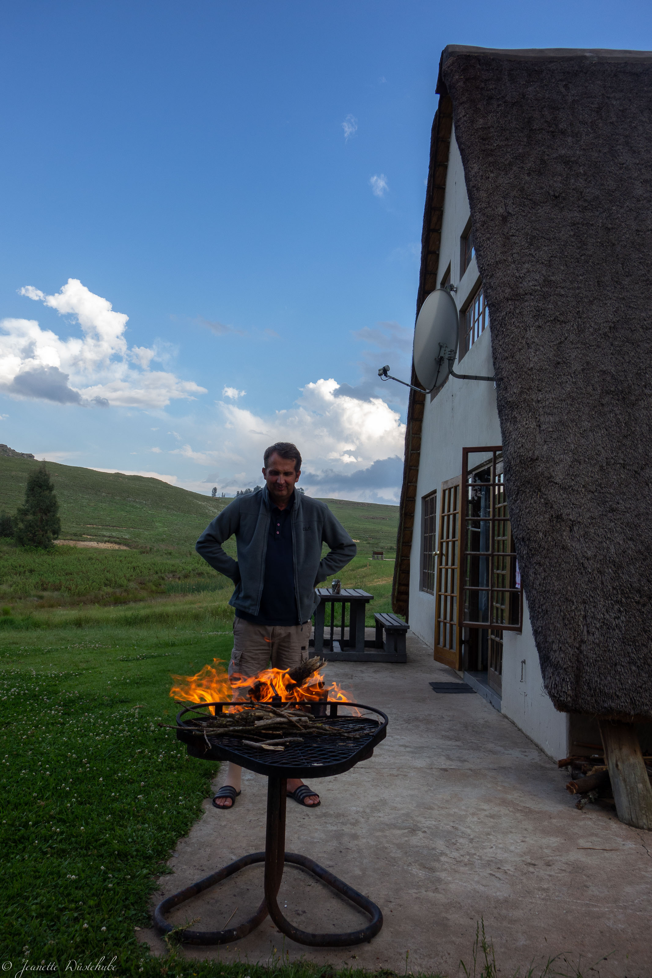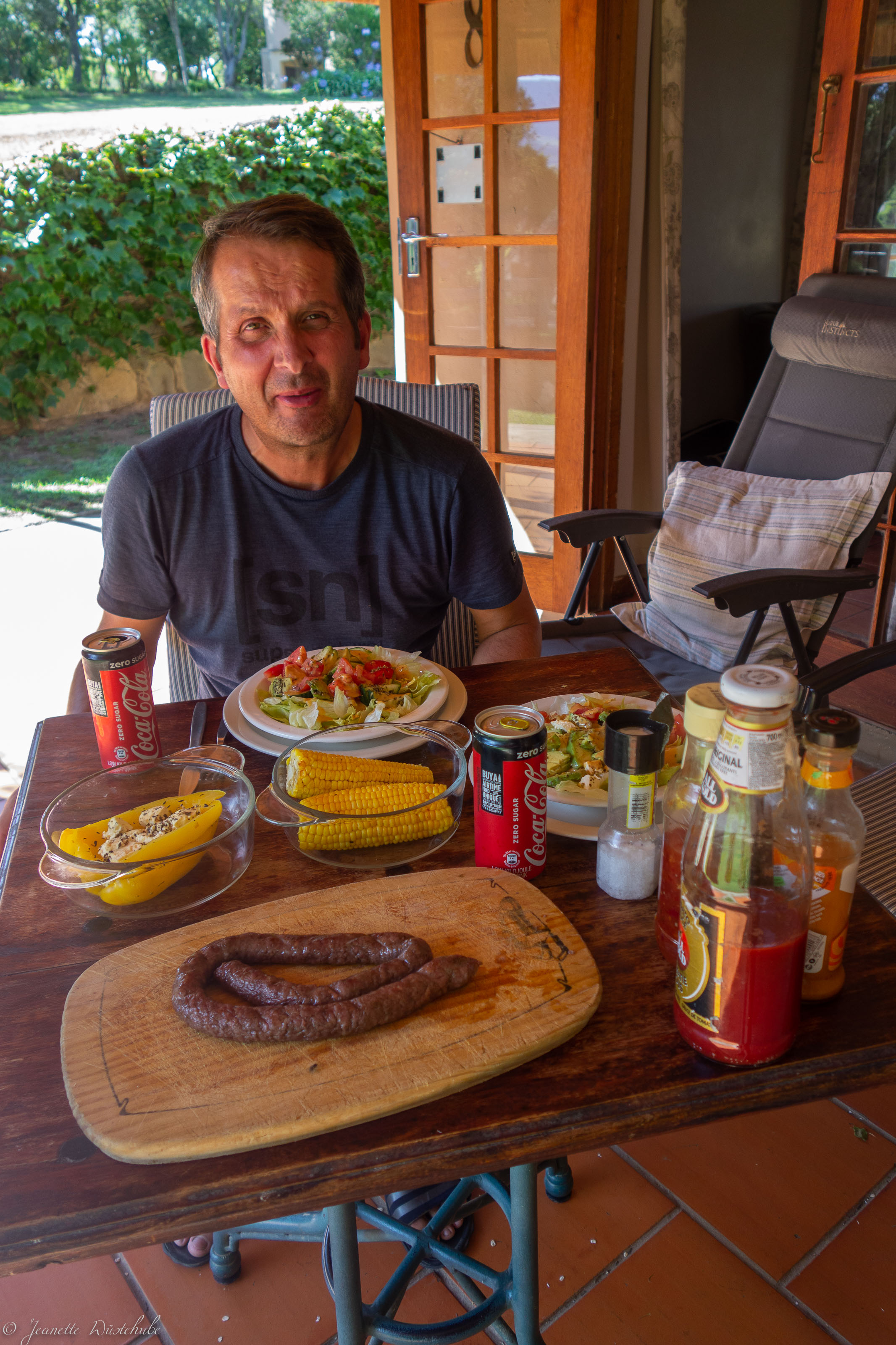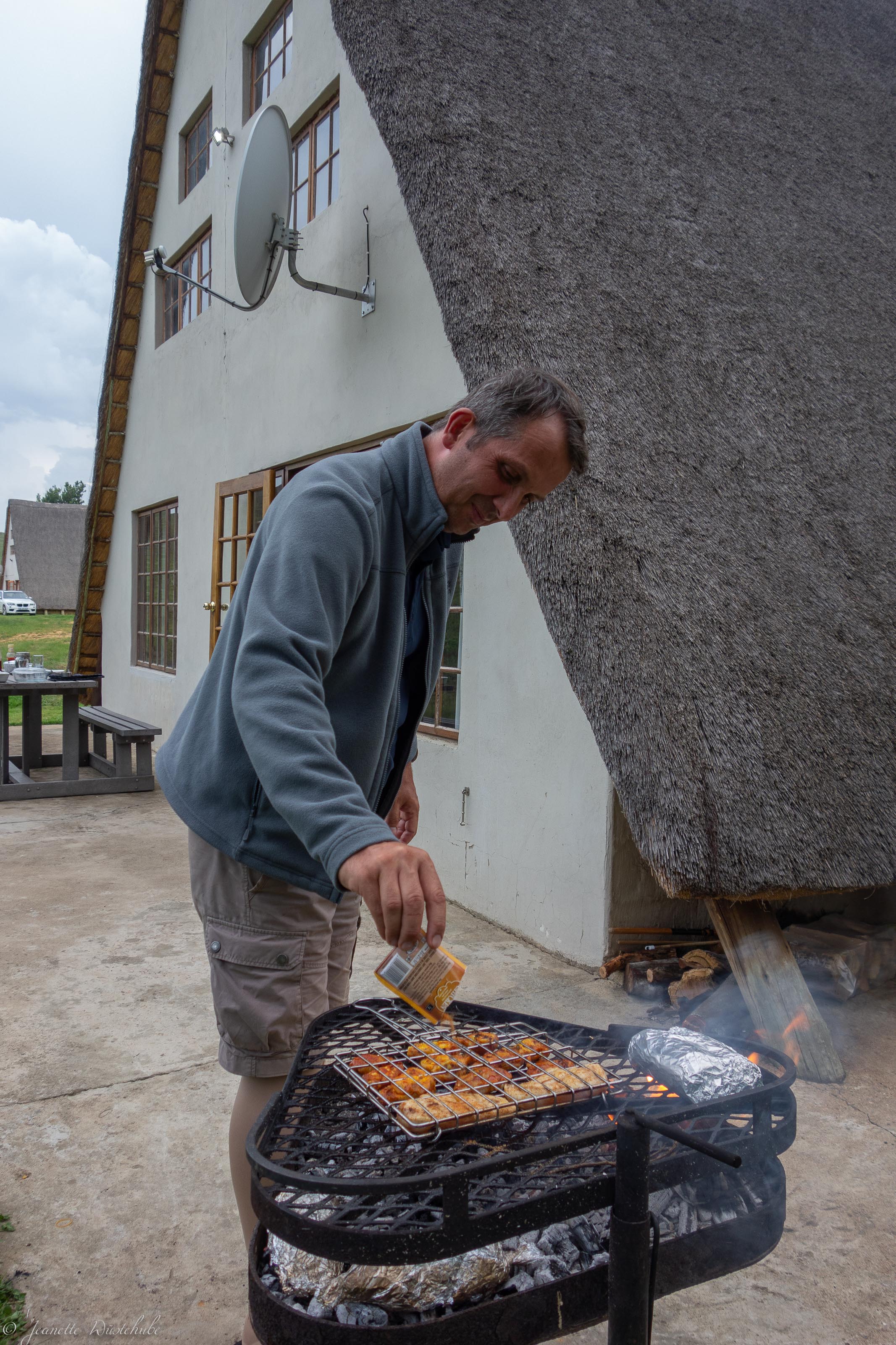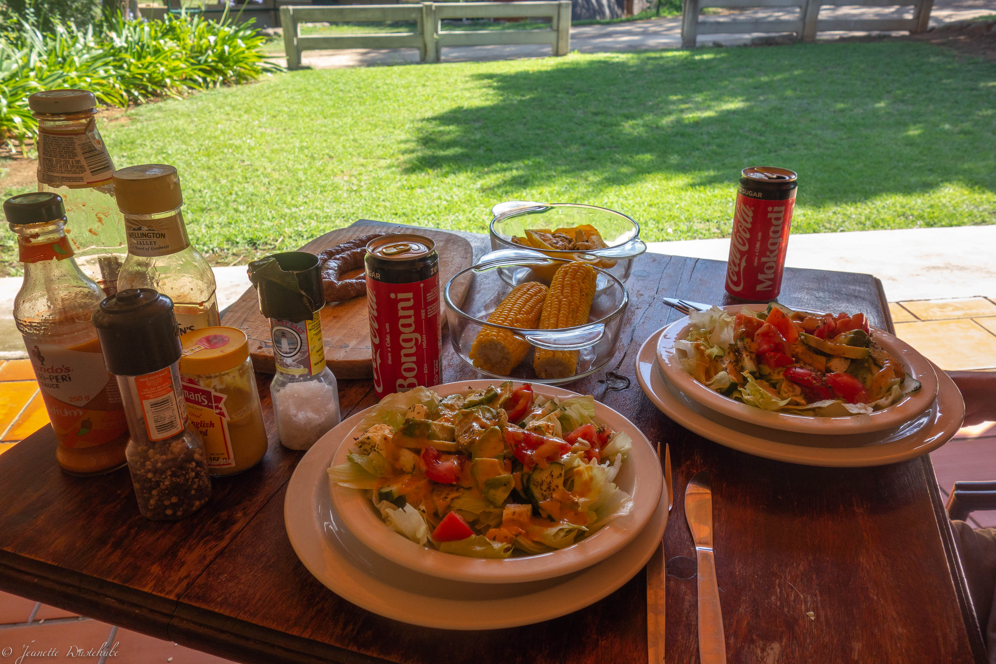 Auch am nächsten Tag ging es Tom nicht wirklich besser, trotz Salbe und Schmerztabletten. Er lief gebückt wie ein Opa. Auf einen letzten Wanderausflug in die Berge mussten wir also verzichten. Noch ein Grund wiederzukommen 🙂 Wir verbrachten einen ruhigen Tag im Ressort und machten ein letztes Braai mit Boerewors, Mais und Salat. Wenn wir heimkommen ist erst mal länger nicht an Grillen zu denken… wobei Wintergrillen auch nett sein kann, denke ich…