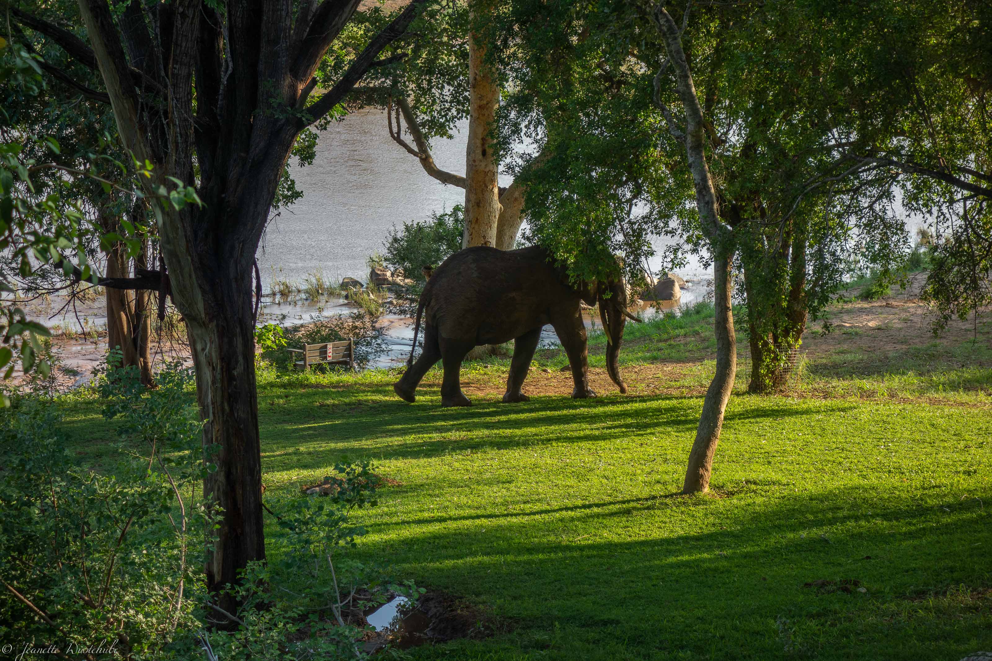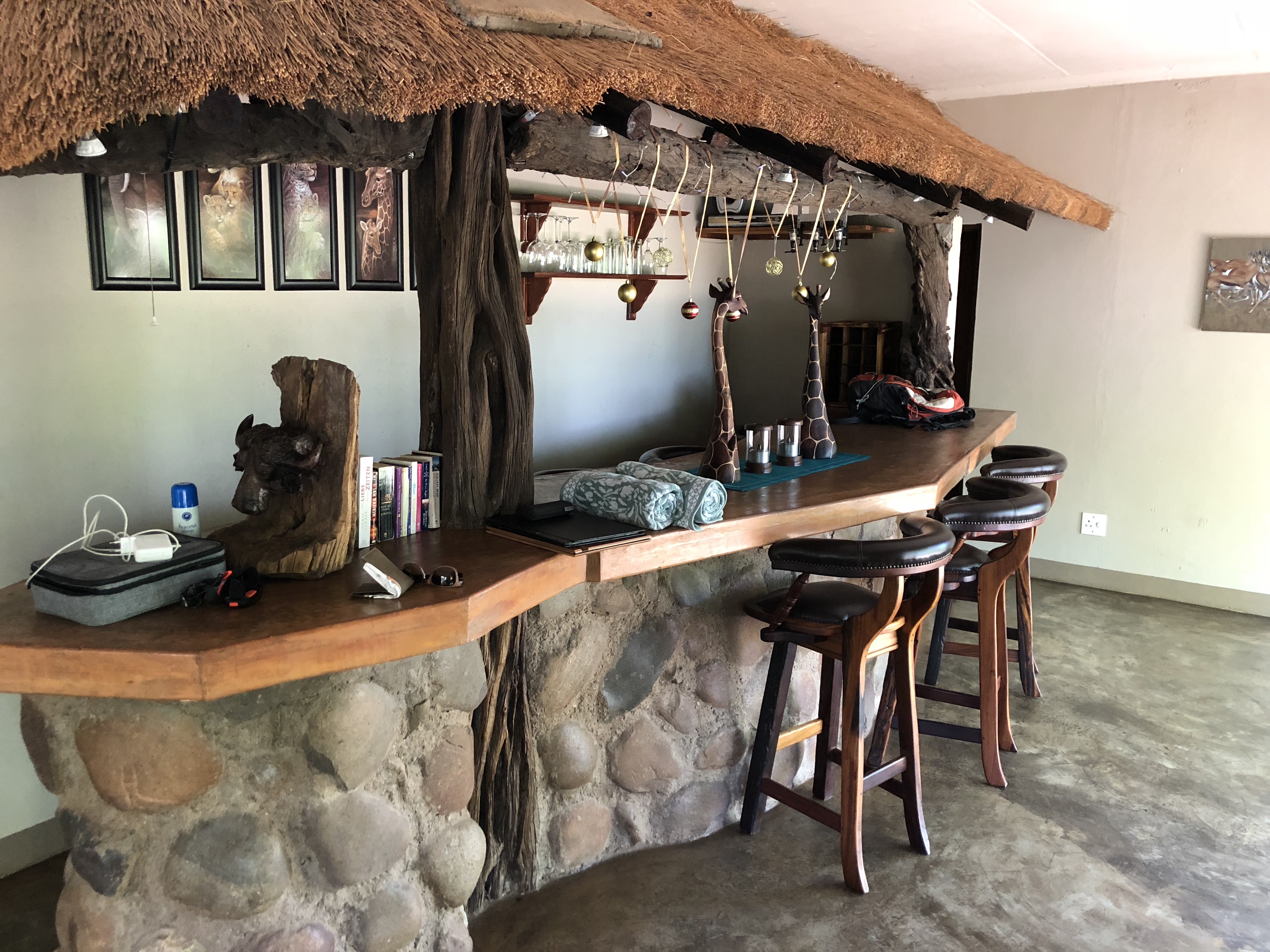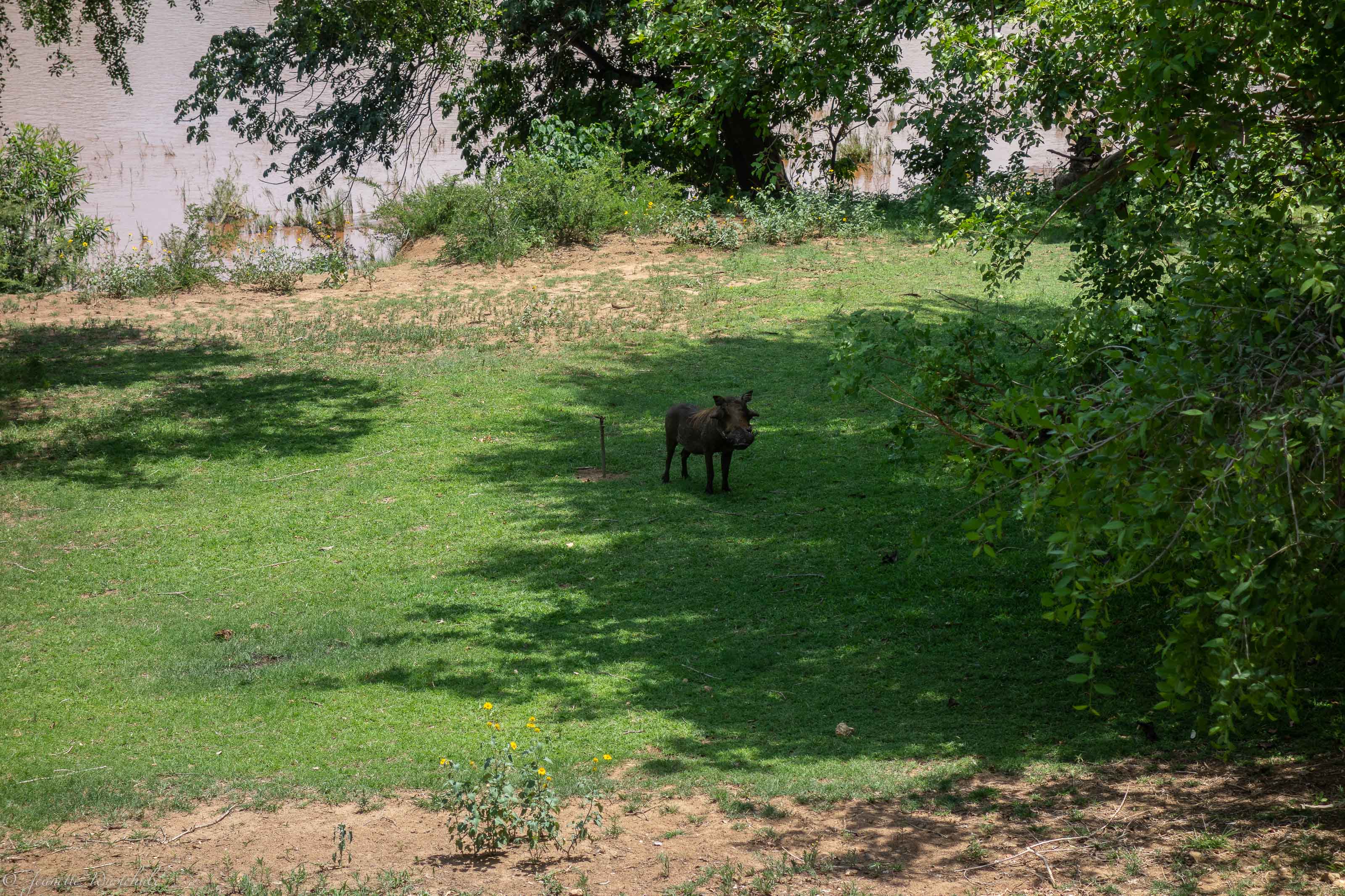 Das Häuschen liegt erhöht und wir blicken auf einen Fluss. Als wir ankamen, spielte eine Gruppe Affen auf der Wiese und eine Warzenschweinfamilie graste auf derselben. Die Eigentümerin, Ronell, zeigte uns das Häuschen mit einer eigenen Bar, die sogar diese Spender hat, in der man die Alkoholflaschen falsch herum hineinschrauben kann (wollte ich immer schon mal ausprobieren!), einen kleinen Pool und Liegen mit Blick auf den Fluss. Das Tollste ist aber, dass wir in der Unterkunft bekocht werden! Also man bringt uns das Essen ins Zimmer, so dass wir uns zum Frühstücken nicht mal umziehen müssen! Wir zogen ein und nahmen erst mal im Pool Platz. Ein Elefant kam vorbei, den Ronell aber vertreiben musste, als er anfing die Rasen-Sprinkler-Anlage zu zerstören. Er wollte erst nicht gehen, zog dann aber missmutig ab. Der Gärtner reparierte in zweistündiger Arbeit den Schaden. Später, als Ronell gerade nicht da war, kam der Elefant wieder. Schnurstraks lief er zum reparierten Sprinkler, zog das Metallteil, aus dem das Wasser kommt heraus, schwenkte es ein paar Mal mit seinem Rüssel und warf es in hohem Bogen ins Gras. Dann trollte er sich wieder. Es wirkte so, als wollte er nochmal zeigen, wie genervt er davon war, vertrieben worden zu sein und dass er sich das so nicht gefallen lassen wollte. So menschlich irgendwie…