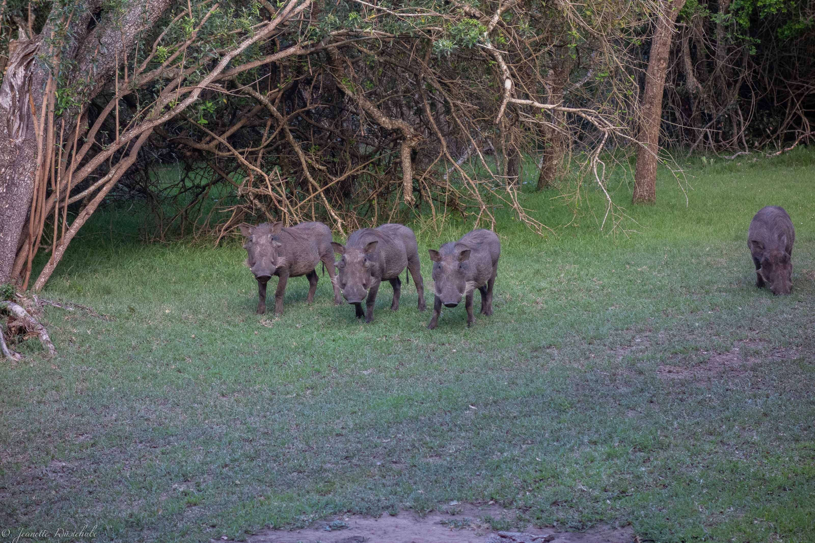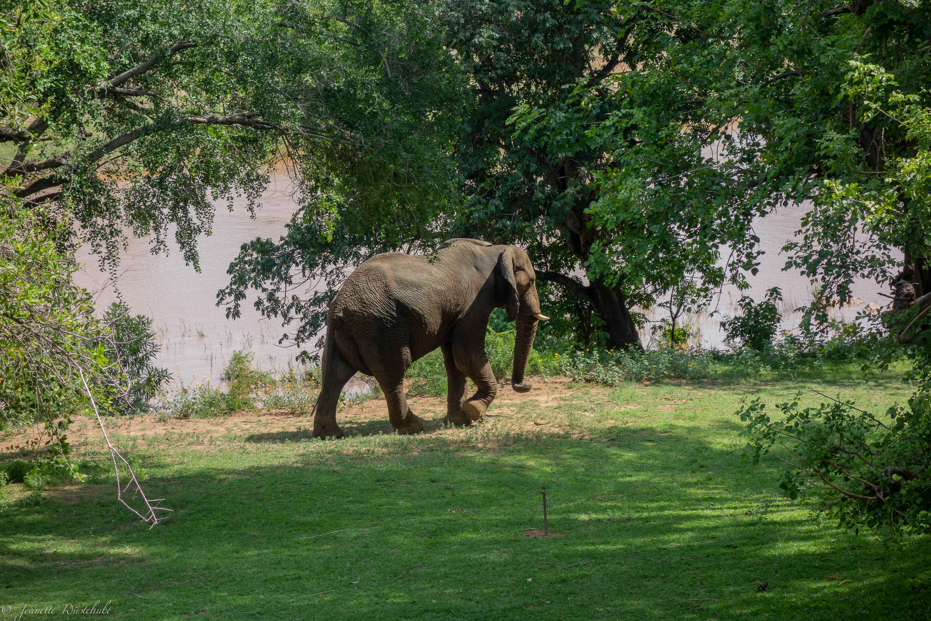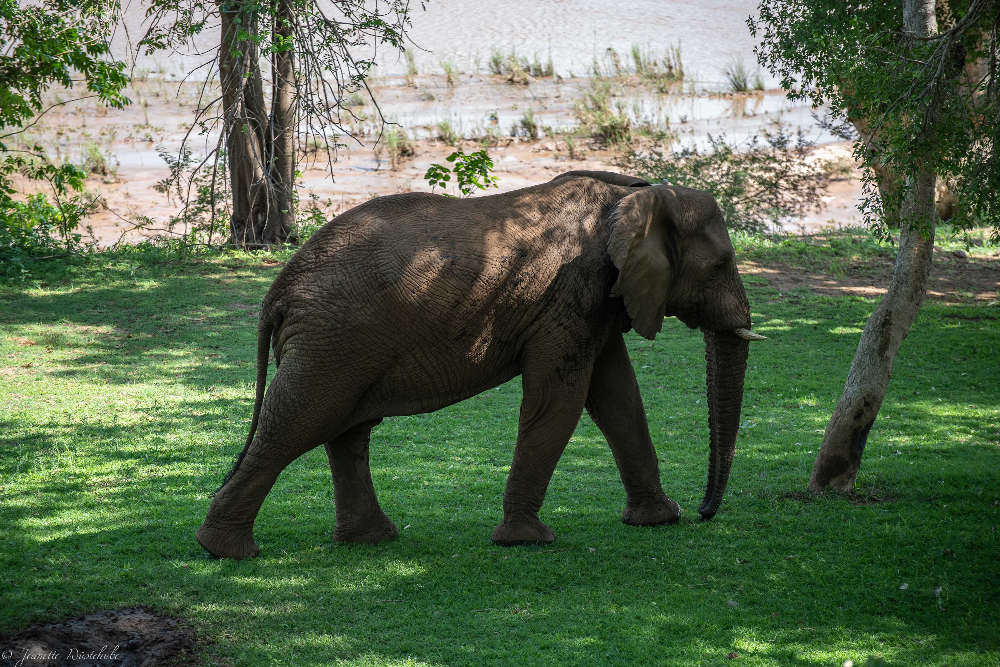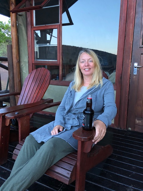 Das Häuschen liegt erhöht und wir blicken auf einen Fluss. Als wir ankamen, spielte eine Gruppe Affen auf der Wiese und eine Warzenschweinfamilie graste auf derselben. Die Eigentümerin, Ronell, zeigte uns das Häuschen mit einer eigenen Bar, die sogar diese Spender hat, in der man die Alkoholflaschen falsch herum hineinschrauben kann (wollte ich immer schon mal ausprobieren!), einen kleinen Pool und Liegen mit Blick auf den Fluss. Das Tollste ist aber, dass wir in der Unterkunft bekocht werden! Also man bringt uns das Essen ins Zimmer, so dass wir uns zum Frühstücken nicht mal umziehen müssen! Wir zogen ein und nahmen erst mal im Pool Platz. Ein Elefant kam vorbei, den Ronell aber vertreiben musste, als er anfing die Rasen-Sprinkler-Anlage zu zerstören. Er wollte erst nicht gehen, zog dann aber missmutig ab. Der Gärtner reparierte in zweistündiger Arbeit den Schaden. Später, als Ronell gerade nicht da war, kam der Elefant wieder. Schnurstraks lief er zum reparierten Sprinkler, zog das Metallteil, aus dem das Wasser kommt heraus, schwenkte es ein paar Mal mit seinem Rüssel und warf es in hohem Bogen ins Gras. Dann trollte er sich wieder. Es wirkte so, als wollte er nochmal zeigen, wie genervt er davon war, vertrieben worden zu sein und dass er sich das so nicht gefallen lassen wollte. So menschlich irgendwie…