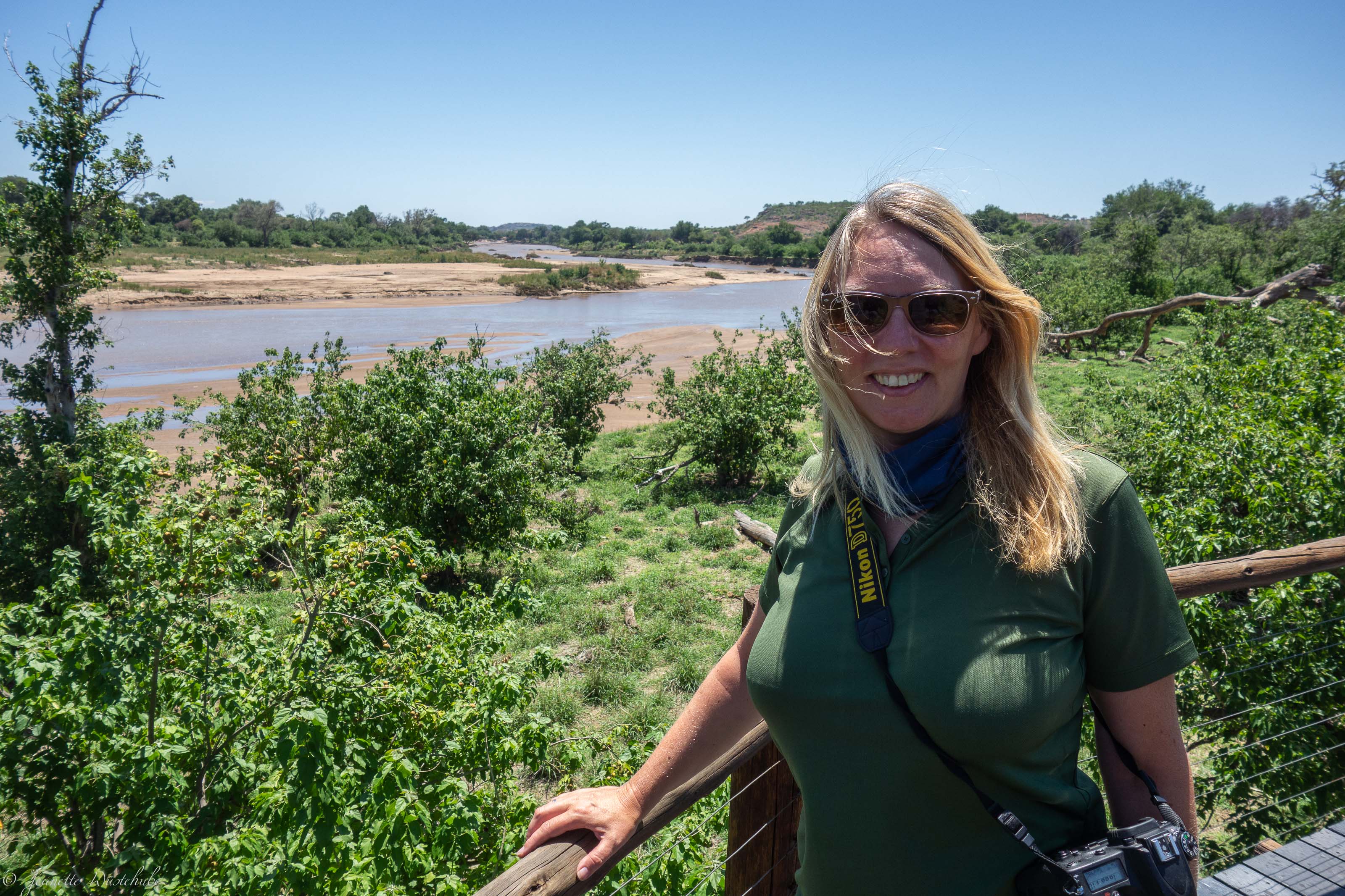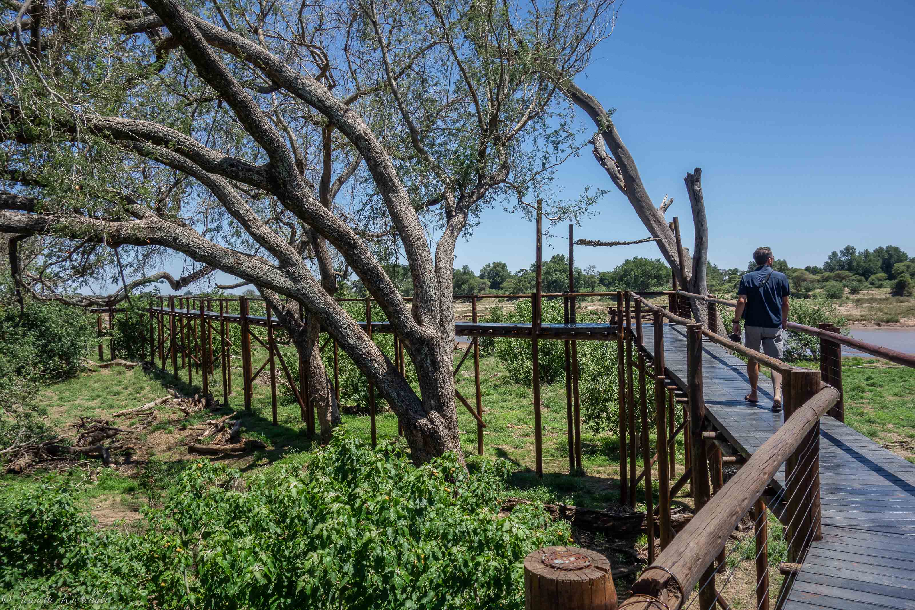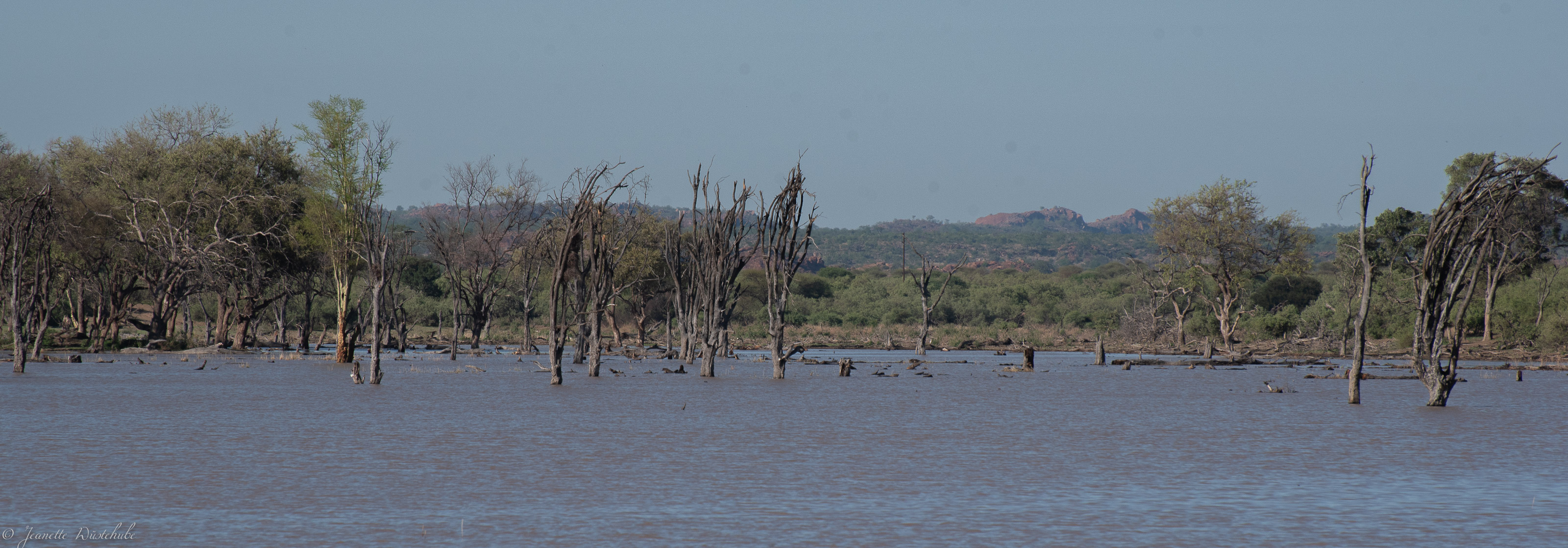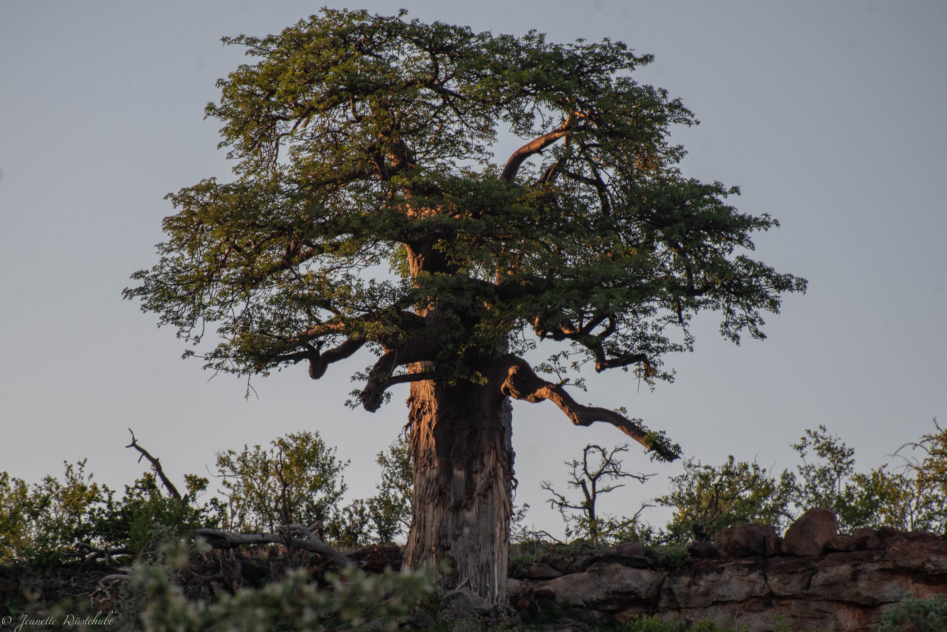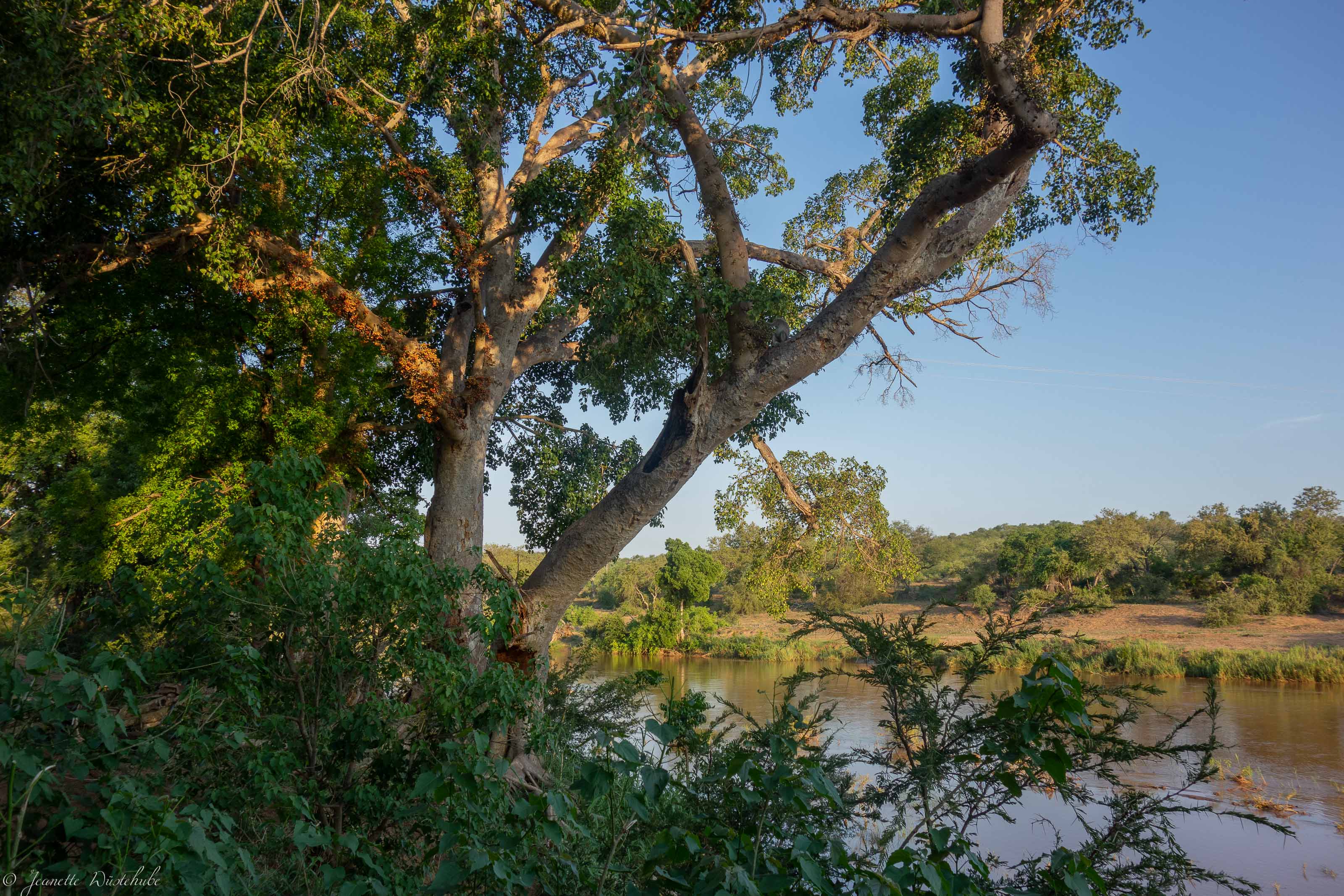 Die Nächte sind in der Regel ja schon kurz, weil viele Südafrikaner mit der Sonne aufstehen und man kurz nach Sonnenaufgang auch die Camps verlassen und auf Gamedrive gehen kann. Außerdem wird es, ist die Sonne erst mal da, schnell warm im Zelt und so steht man von alleine spätestens um 7 Uhr auf. In Mazhou war es erst ab 6 Uhr erlaubt loszufahren, Sonnenaufgang war etwa 30 Minuten früher. Unsere direkten Zelt-Nachbarn waren ruhige Frühaufsteher, wurden aber von einem anderen Camper bereits um 4:30 Uhr besucht, der diese ohne Rücksicht auf die übrigen Campinggäste, in voller Lautstärke vollquatschte. In so einem Zelt hat man ja leider keinen Schallschutz und entsprechend wird man dann schnell wach, wenn es neben einem laut ist. Außerdem hatte es auch in der Nacht leider nicht abgekühlt. Wir schliefen ohne Decken und waren schon beim Aufwachen nassgeschwitzt. Also konnten wir um 4:30 Uhr auch nicht mehr schlafen und standen zeitig auf. Nach und nach verließen die meisten anderen Gäste das Camp und erkundeten die Gegend. Wir schlossen uns nach dem Frühstück an. Zuerst fuhren wir zu einer an einer großen Wasserstelle gelegenen Hide, von der aus man gut Vögel und Krokodile beobachten konnte. Danach drehten wir eine Runde durch den westlichen Teil, auf der wir einige Elefanten sehen konnten. Einer rannte los, als er unser Auto kommen sah. Scheinbar sind hier die Tiere noch nicht so sehr an Autos gewöhnt wie in anderen Parks. Dann fuhren wir zurück zum Haupteingang um zu entdecken, was es im östlichen Teil zu sehen gab. Der Osten des Mapungubwe ist größer und bietet mehr Straßen für Erkundungsfahrten. Das Gebiet ist deutlich felsiger und hat einen ganz anderen Baumbestand. Man sieht viele der eindrucksvollen Baobabs, dazu gibt es Busch- und Grasland. Außerdem kann man an einigen Stellen aussteigen und ein bisschen laufen, was bei den vielen Autofahrten eine willkommene Abwechslung ist. Vom Baumwipfelpfad aus, der bis an den Limpopo und weiter an diesem entlang führt, hat man einen schönen Blick auf den Fluss und man kann sich auf den beschatteten Bänke ausruhen oder einen Sundowner zu sich nehmen.
