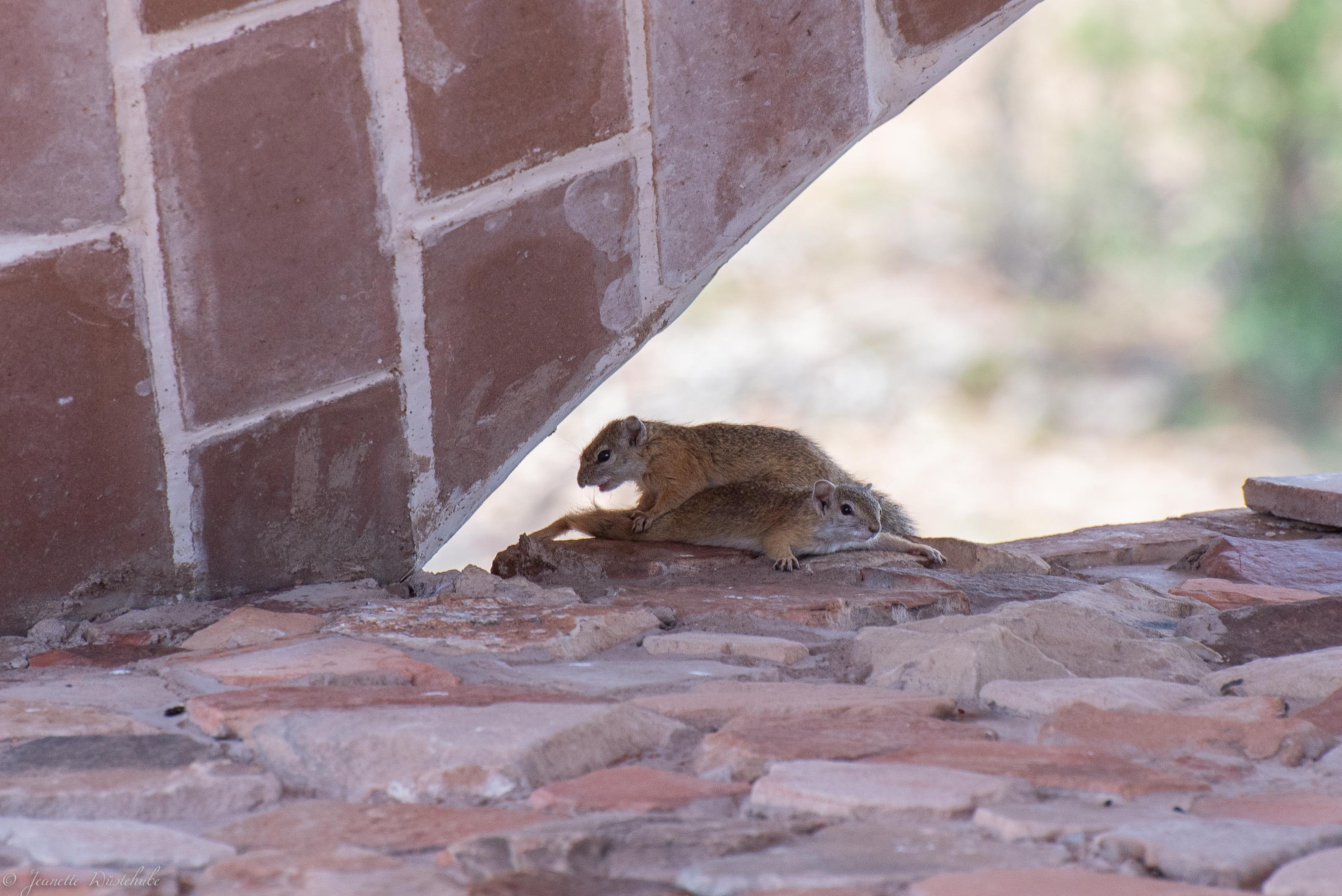 Nach einer weiteren Fahrt, die uns zum Staudamm führte, kamen wir beim Museum an, das nicht nur wegen seiner Ausstellung sondern auch aufgrund seiner Architektur sehr gelobt wurde. Wir sahen uns den kleinen Einführungsfilm und das Museum an, in dem Gefäße, Schmuckstücke und ein vergoldetes Nashorn ausgestellt sind. Der Film informierte über die jahrtausendealte Geschichte der Region und die verschiedenen Völker, die hier gesiedelt hatten. Danach machten wir uns auf den langen Rückweg zum Campingplatz. Dort angekommen hatte eine Gruppe Affen gerade die Schwachstelle an einem Campinganhänger entdeckt und war dabei den Platz zu verwüsten. Die Familie, die dort campte, hatte verschiedene Klappen am Anhänger offen stehen lassen und das war für die Tiere natürlich wie eine Party-Einladung. Tom versuchte mehrfach die Affen zu verscheuchen, aber sie kamen immer wieder. Sie fanden auch die Schwachstelle am Zelt… Weil die Familie den Strom durch den Zelteingang gelegt hatte, die man mit dem Reißverschluss zumachte, war dort, wo das Kabel austrat, ein kleiner Spalt, durch den ein kleiner Affenfinger gerade so passte und so konnten sie den Reißverschluss so weit öffnen, dass sie sich hindurch pressen konnten. Damit war der Weg zu den Essensvorräten frei und ein Affe nach dem anderen schlupfte hinein und räuberte, was ging. Wahrscheinlich muss ich nicht erwähnen, dass sie dabei alles mögliche umwarfen und das Zelt auch als Toilette benutzten… es sah aus wie auf einem Schlachtfeld. Aber jeder Versuch die Meerkatzen zu vertreiben scheiterte und irgendwann gab Tom sich dann geschlagen. Wir duschten, grillten und gingen, sobald es zwei Grad abgekühlt hatte, ins Bett in der Hoffnung etwas besser und länger schlafen zu können. Es war allerdings noch heißer als in der Nacht zuvor und uns lief der Schweiß in Strömen hinunter. Noch früher als in der letzten Nacht standen die ersten Camper auf und verließen deutlich vor Gateöffnung den Platz. Das ging, weil das Gate immer offen steht und es keinen Wächter gibt. Hundemüde und bereits um 7 Uhr von Schweiß durchnässt, packten wir unsere sieben Sachen, verpackten das Dachzelt, stiegen in Umbani und freuten uns über das klimatisierte Auto. Wieder hielten wir bei der Hide und drehten eine kleine Runde um dann wieder zum östlichen Parkteil zu fahren. Am Gate angekommen, von wo aus wir wieder Telefonempfang hatten, versuchten wir ein paar Mal meine Mutter zu erreichen, die an diesem 17.12. ihren 70. Geburtstag feierte. Es läutete, dann war Stille. Das ging ein paar Mal so, bis dann schließlich beim vierten Anruf abgehoben wurde und eine entrüstete Vroni (so der Name meiner Mutter): „Hören Sie auf mich zu belästigen oder ich rufe die Polize!“in den Hörer bläkte. Tom wollte noch sagen: „Ha ha. Deinen Humor hast Du ja auch mit 70 noch nicht verloren!“ Aber dazu kam es nicht, denn sie legte tatsächlich auf. Leicht irritiert schrieb Tom eine Whatsapp: „Wir sind es. Bitte nicht die Polizei rufen!“ und rief, nachdem sie es gelesen hatte nochmal an. Dann nahm sie unseren Anruf schließlich doch entgegen und wir durften gratulieren. Sehr lustig war das! :-)) Für die dritte Nacht hatten wir eine feste Unterkunft gebucht, die laut Reiseführer zu den schönsten der Sanparks Unterkünfte zählen sollte. Im Restaurant beim Museum, dass wir sehr empfehlen können, aßen wir zu Mittag und kauften Feuerholz für die nächsten Tage. Gegen halb 2 kamen wir in unserem Häuschen an und gingen erst mal zum Pool, der sehr hübsch in die Felsen integriert ist und von der aus man einen tollen Blick in die umliegende Steinlandschaft hat. Unseren Sundowner nahmen wir auf dem Baumwipfelpfad ein, der nicht so weit von unserer Unterkunft entfernt lag. Leider registrierten wir zu spät um nochmal zum Gate zu fahren, dass unsere Klimaanlage defekt war und das Häuschen heizte sich ebenso auf wie unser Zelt, so dass wir auch in der letzten Nacht in Mapungubwe nicht besonders gut schlafen konnten. Hoffentlich hat die Hitze bald ein Ende…