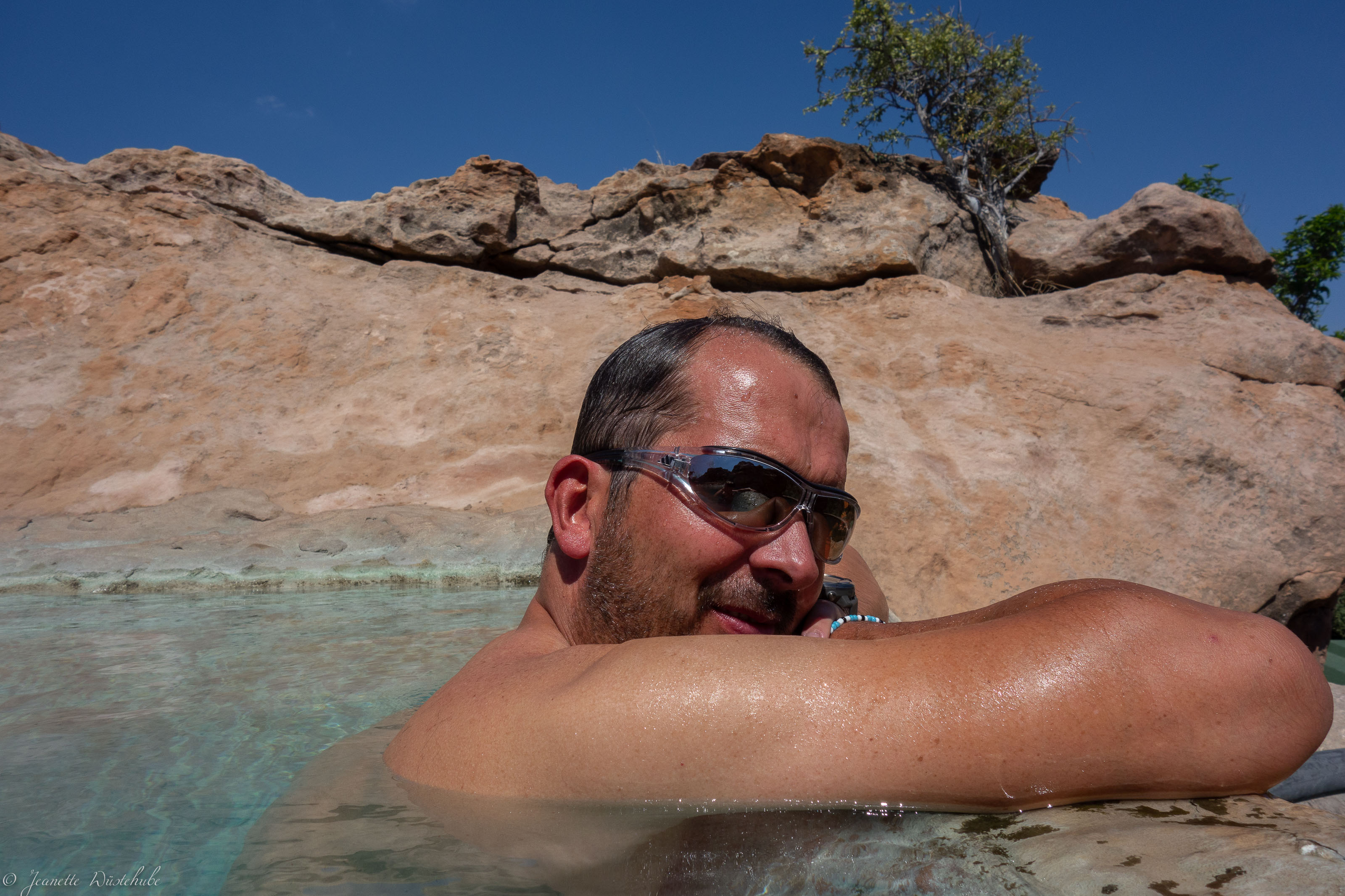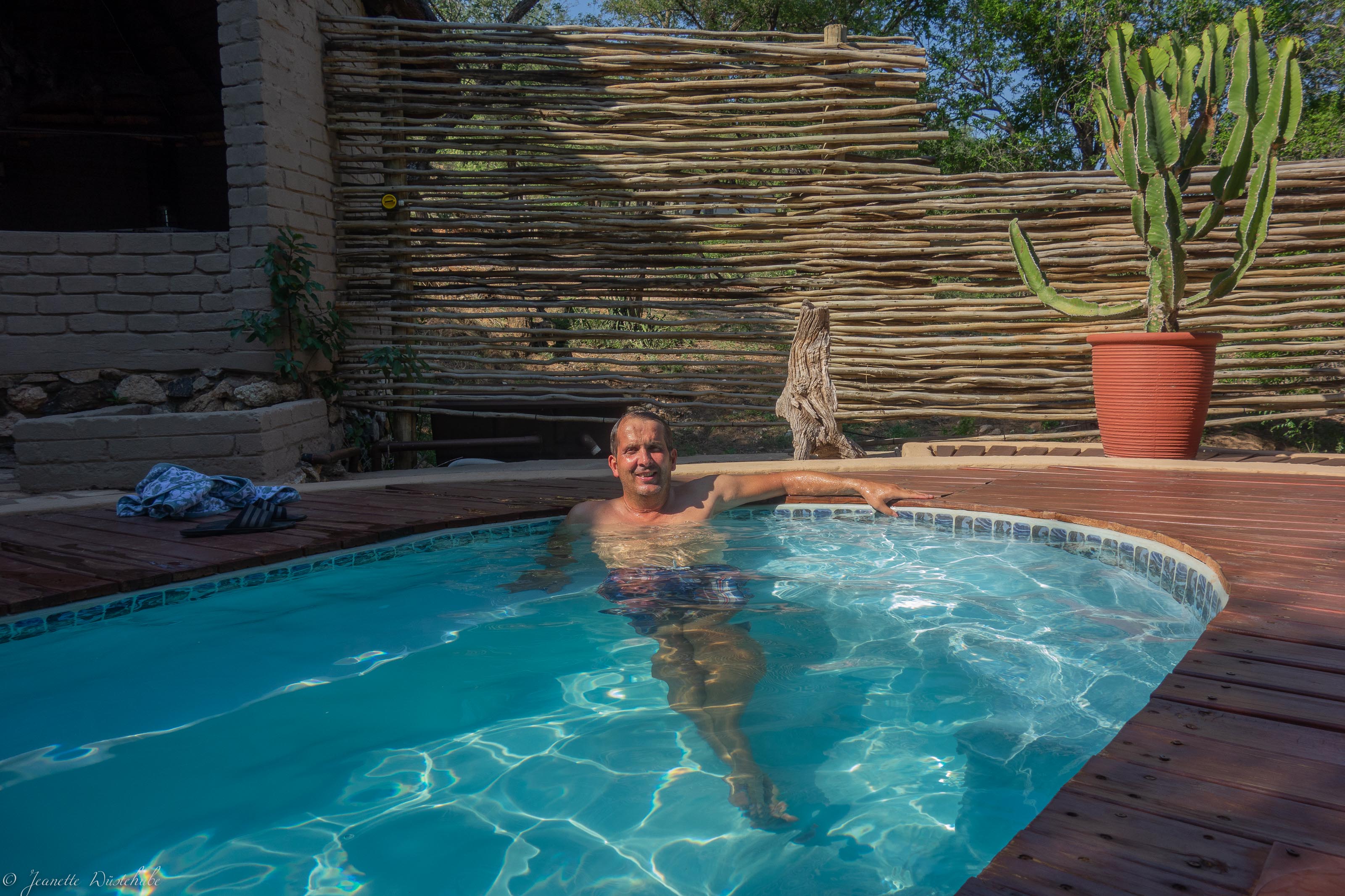 Im Anschluss reisten wir weiter nach Bela Bela. Der Ort, der übersetzt „Boiling, Boiling“, also „Kochend, kochend“heißt, hieß früher „Warmbad“und hat seinen Namen von den heißen Quellen, die es in der Umgebung gibt. Er liegt nicht weit vom Nationalpark entfernt und so kamen wir schon vormittags in unserem Guesthouse an. Das Zimmer war noch nicht fertig, aber wir konnten uns auf die Terrasse der Unterkunft setzen. Also machte Tom es sich auf einer Liege am Pool und ich es mir an einem der Tische bequem, um unser Online-Tagebuch zu aktualisieren. Zum Guesthouse gehörten auch zwei Esel, die in der Nähe des Pools grasten und Tom einen Besuch abstatteten.