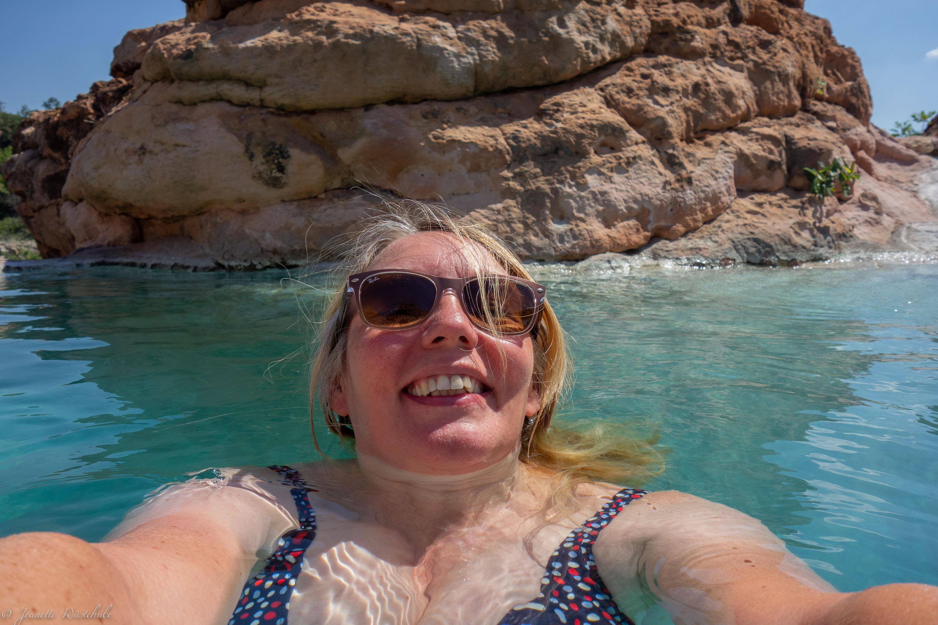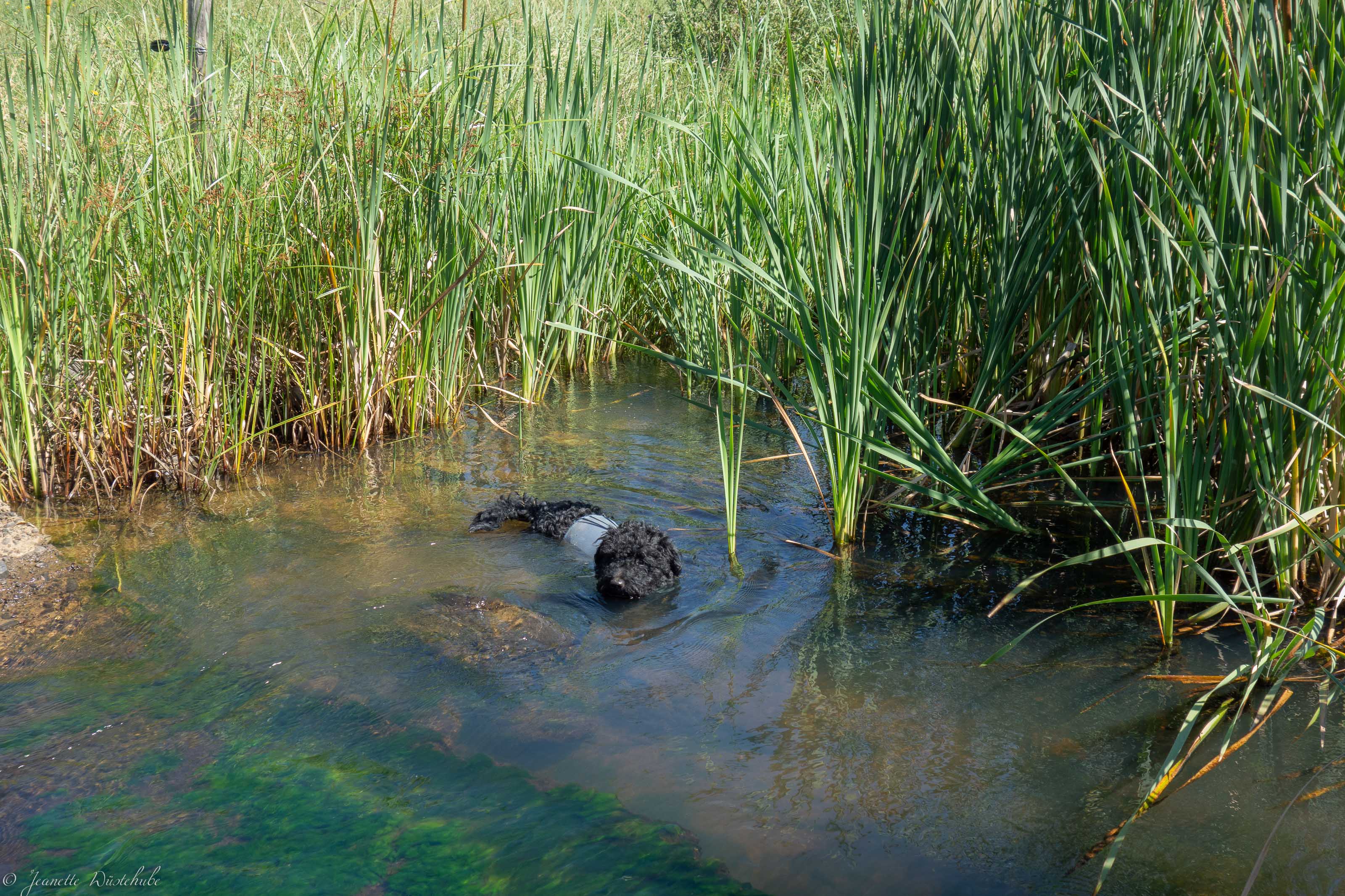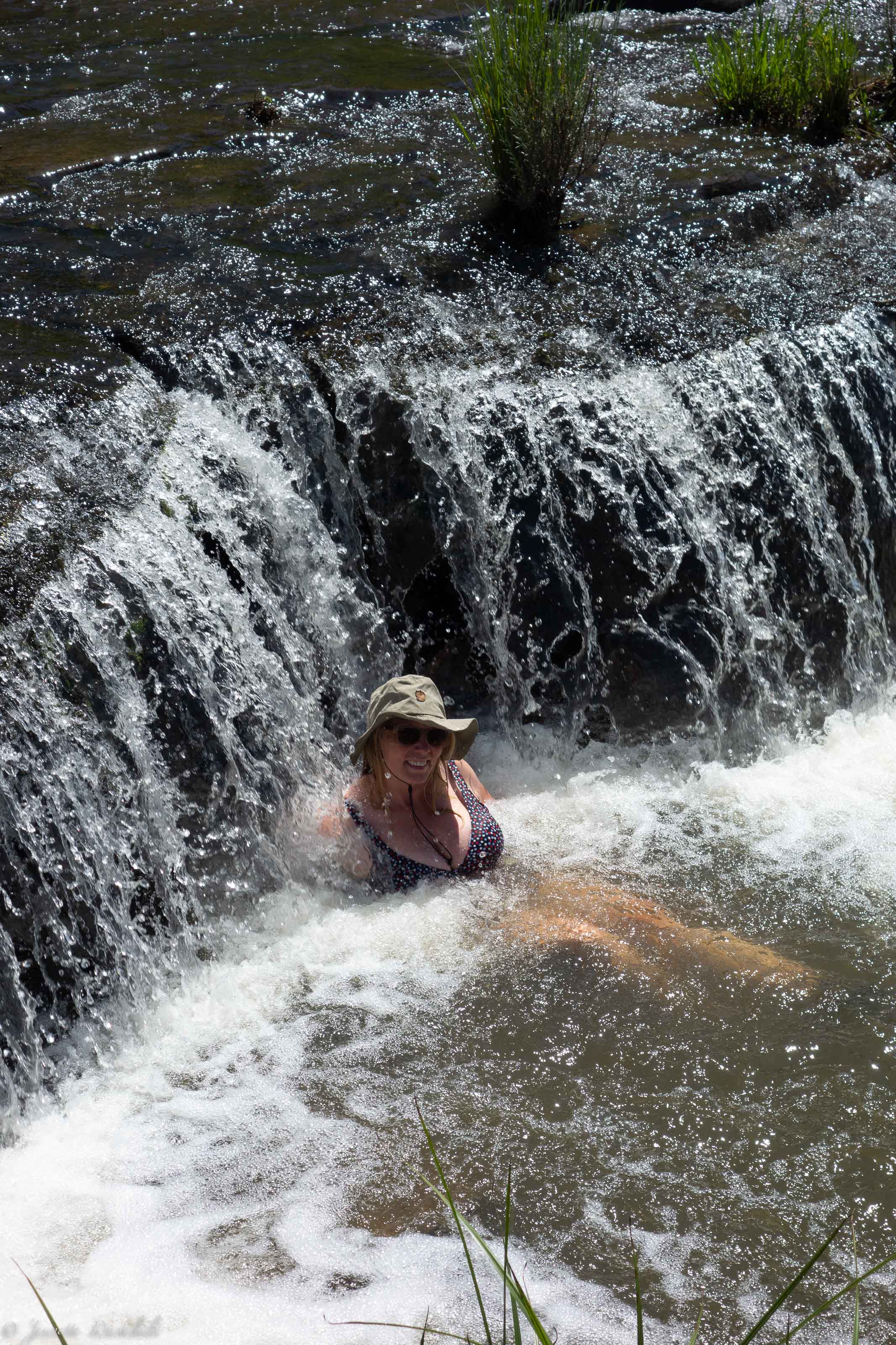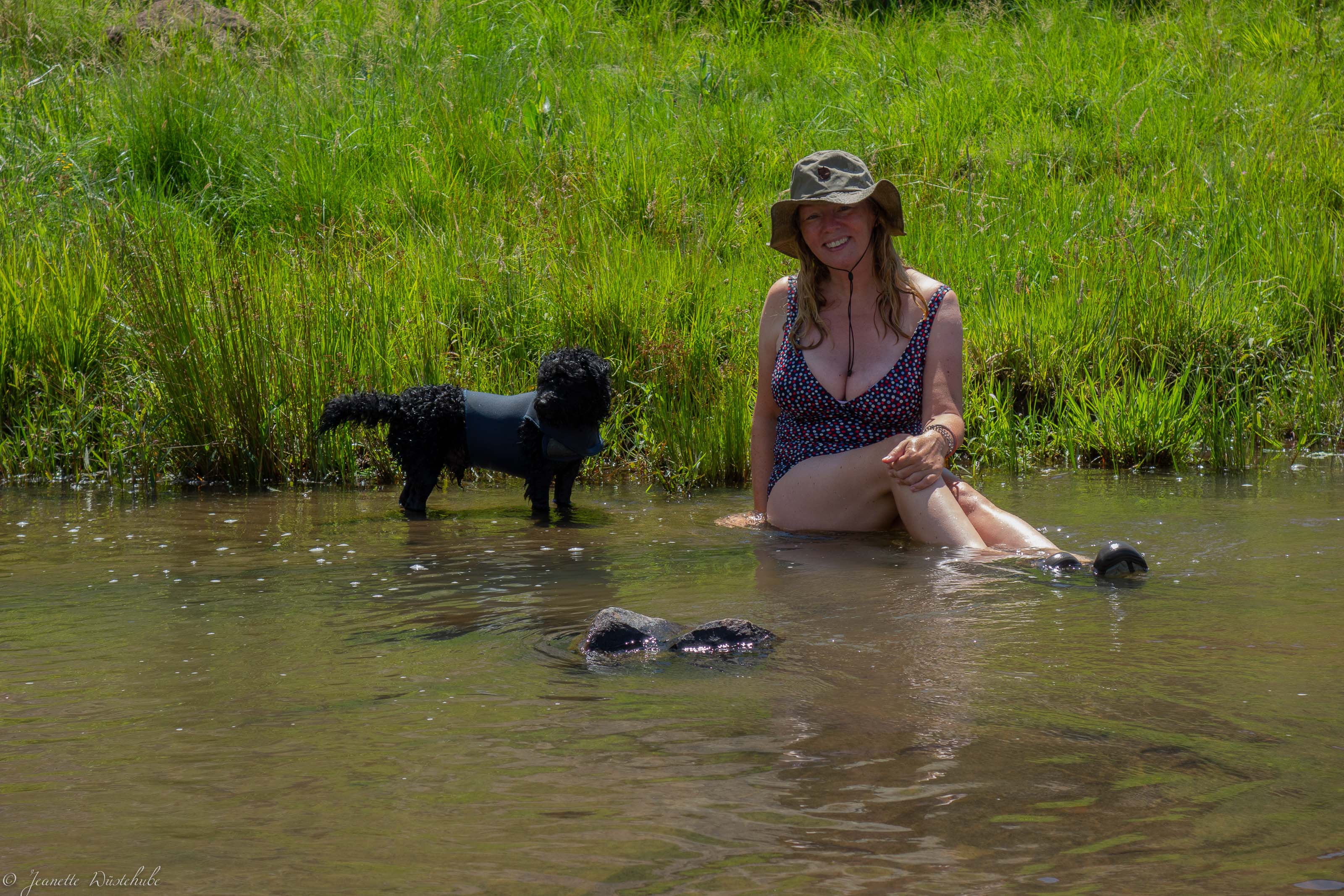 Wir blieben eine Weile im Pool und versuchten den Hund auch zu einem Schwimmerchen zu bringen, aber er war zufrieden oberhalb des Pools im wenig tiefen Fluss herumzutollen. Dann aßen wir unser mitgebrachtes Sandwich und als es sich gegen 10 Uhr mehr und mehr bewölkte, machten wir uns auf den Rückweg. Tom hatte der Frau vom Empfang besser zugehört als ich und sie hatte gesagt, wir sollten am Fluss entlang zurücklaufen.