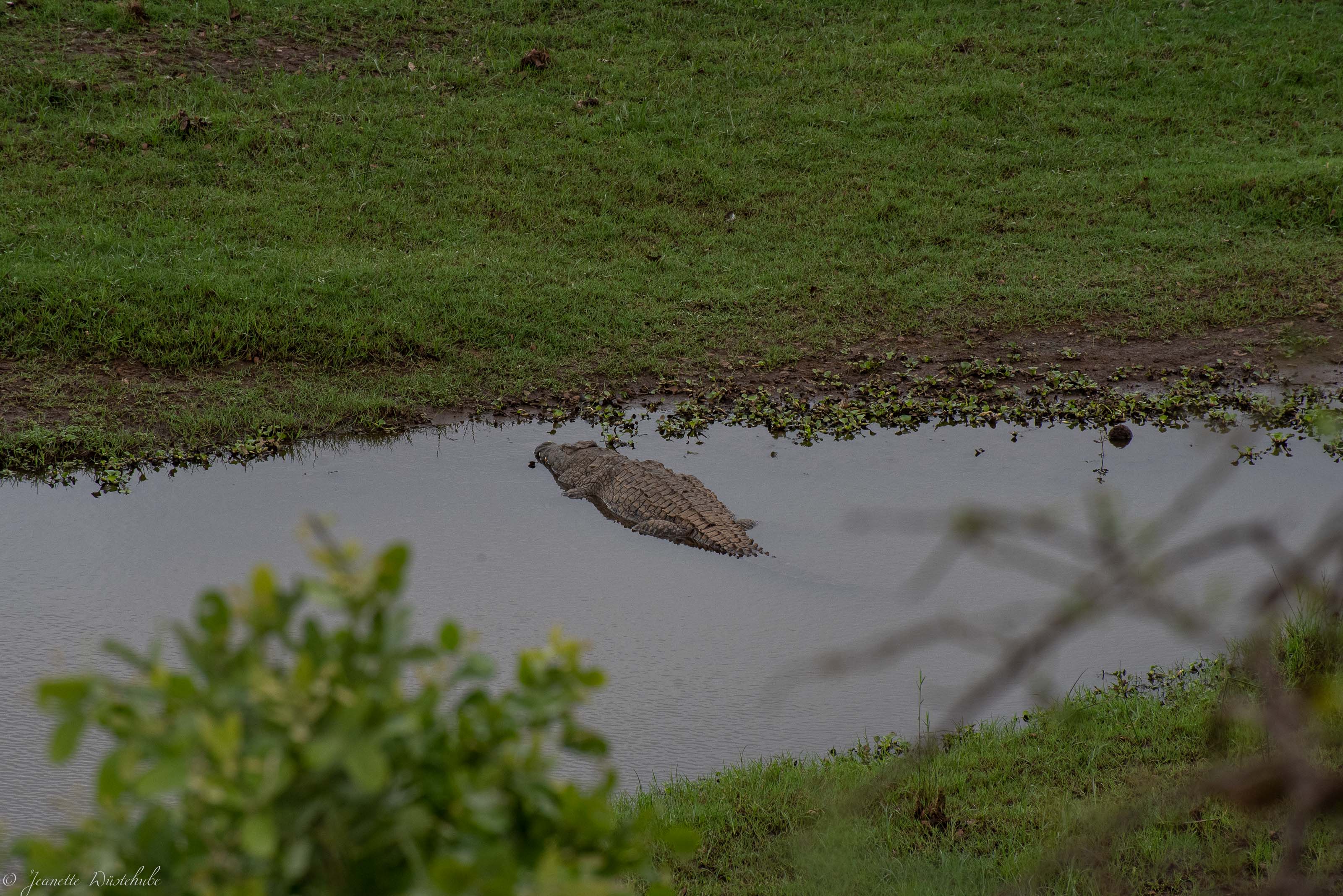 Auf dem Weg hatte ich Patrick gefragt, wie viele Geschwister er hätte. Er konnte es nicht genau beantworten. Sein Vater hatte vier Frauen und mit allen einige Kinder. Er selbst war noch recht jung, aber auch schon verheiratet und hatte eine Tochter, bei der er länger überlegen musste, wie alt sie war. Bei den Zulu haben viele Männer mehrere Ehefrauen, aber man kann auch nur eine haben. Patricks Vater hatte seine zweite Frau wohl geheiratet, weil die erste zu faul war. Wenn es das bei uns gäbe… 🙂 Er zeigte uns das Ameisennest der Weberameisen, die aus Blättern in den Bäumen ihr Nest bauen. Sie sind sehr aggressiv und die Bisse sollen ziemlich schmerzhaft sein. Mittlerweile wird diese Ameisenart auch in Südamerika als natürliches Pestizid eingesetzt, weil sie in ihrer Nähe keine anderen Insekten duldet. Vielleicht wäre das auch eine Idee für unsere Bauern? Patrick erklärte uns, dass immer, wenn er oder seine Brüder oder Schwestern etwas ausgefressen hatten, es aber nicht zugeben wollten, die Eltern sie zu so einem Nest brachten und die Ameisen herunterholten oder zumindest damit drohten. Das half 🙂 Wir kauften Raymonds Tochter noch einige hübsche, selbstgeflochtene Untersetzer ab. Für die Familie stellen die Flechtarbeiten der 15-Jährigen ein kleines Zubrot dar und sie sind wirklich schön. Dann ging es zu Fuß einen anderen Weg zurück Richtung See, bis wir an einer Stelle ankamen, an der man mit Ponton übersetzen musste. Eine junge Frau stand mit einem Mann, einigen Tüten und zwei Kästen Bier auf der anderen Seite und hievte alleine alles auf das Floß. Der Mann packte nicht mit an. Er war wohl der Fahrer, der sie mit dem Auto bis zum Wasser gebracht hatte. Dann zog sie sich und das Floß per Seil auf die andere Seite. Hier hilft man(n) offenbar nicht beim Entladen oder Tragen. Patrick stand direkt daneben als die junge Frau gelandet war und die schweren Sachen alleine vom Floß trug. Eine andere Frau wartete auf unserer Uferseite. Sie war wohl gekommen, um die Einkäufe gemeinsam mit dem Mädchen nach Hause zu tragen. Für mich wirkte es, als hätten die Frauen kein leichtes Leben in dieser Kultur. Zurück in der Lodge musste erst mal ein kaltes Bier her und wir unterhielten uns an der Bar noch ein bisschen mit Bill. Das viele Laufen in der Hitze war ganz schön anstrengend gewesen und wir waren recht fertig. Nach einer heißen Dusche ging es dann aber wieder und wir warteten bei einem Gin Tonic am Lagerfeuer auf das Abendessen. Kenneth, Schwiegersohn von Bill und Pam, war da, um in der Lodge zu helfen und auch mit ihm konnte man sich gut unterhalten. Er war eigentlich Schotte und lebte mit seiner Frau in der Nähe von Durban. Wir erfuhren, dass sich am Morgen eine Black Mamba in der Nähe des Teichs aufgehalten hatte, um Frösche zu fangen. Rob meinte, dass diese Schlangenart dann aggressiv ist, wenn man ihren Weg kreuzt, also sie dahin will, wo man steht. Er erzählte, dass er vor Jahren einen Freund aufgrund eines Schlangenbisses verloren hatte. Jedenfalls war mit der Information über die Schlange der Plan die Außenbadewanne vielleicht doch mal zu nutzen, für mich endgültig gestorben. Die Wanne war von Dschungelpflanzen umgeben, in denen sich allerlei Tiere herrlich verstecken konnten. Wir hatten bereits ein längliches Kriechtier aus der Badewanne gerettet, das nicht mehr herausklettern konnte und einen Mini-Frosch hatte ich auch schon dort rumhüpfen sehen. Ein entspanntes Bad wäre das für mich wohl nicht geworden 🙂