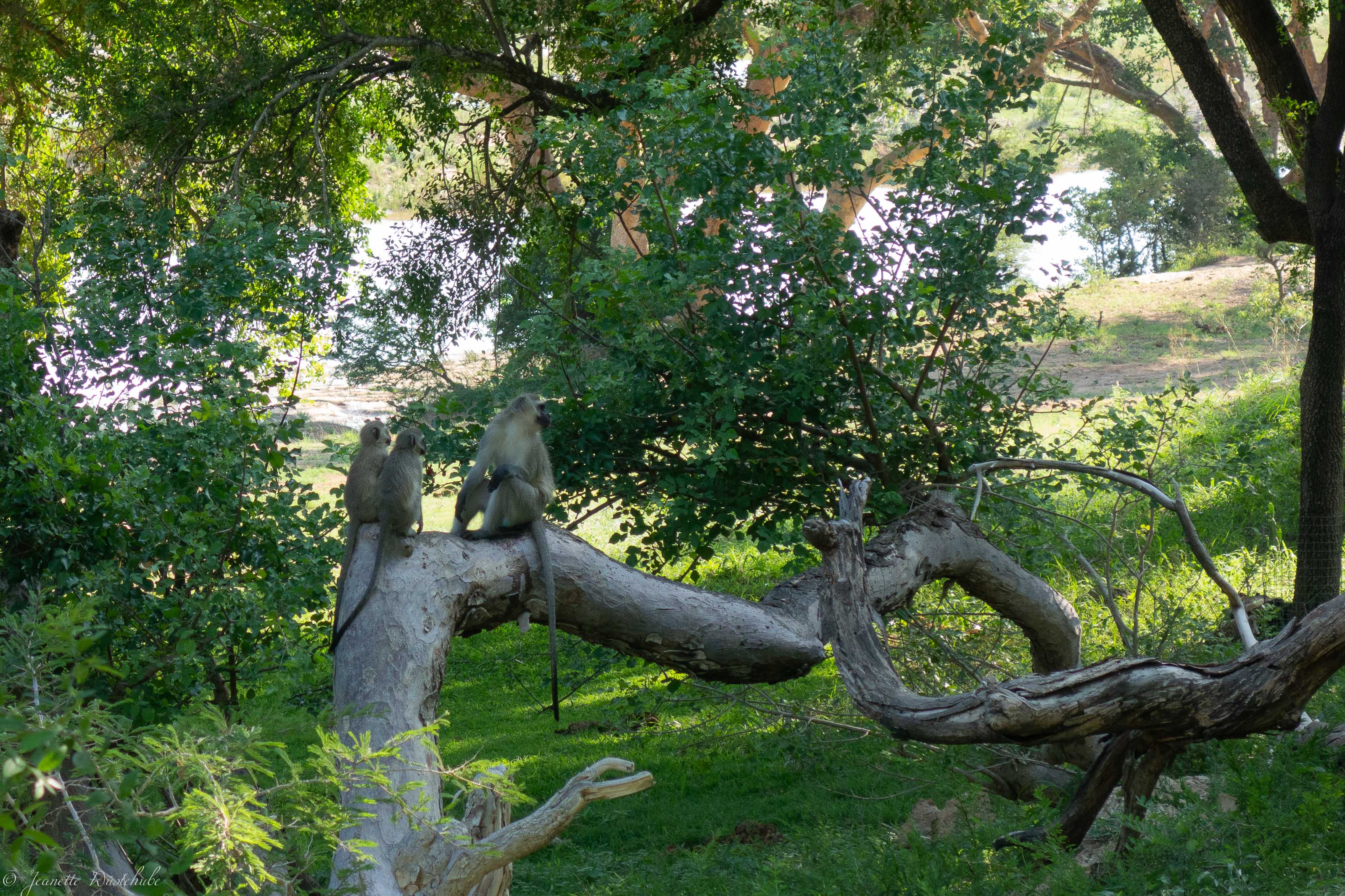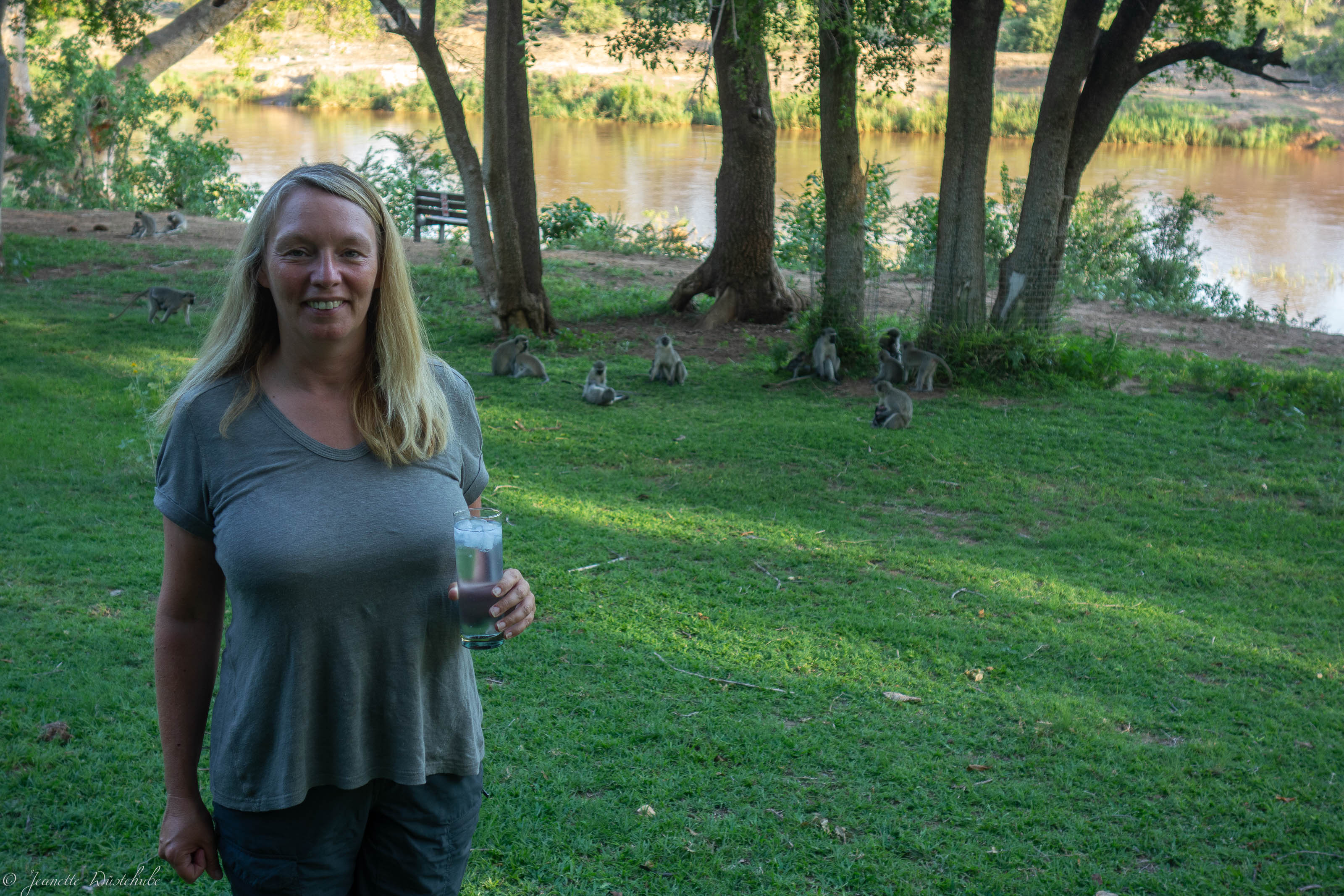 Den Affen zuzuschauen war besser als Fernsehen. Sie spielten miteinander, versteckten sich, hingen an den herabhängenden Ästen, lausten sich, klauten sich gegenseitig den Nachwuchs, tollten über die Wiese. Es sah aus wie ein Affen-Kindergarten. Erst als ein fremder Affe kam, den sie offenbar vertreiben wollten, kam der Trupp zusammen und quietschte, schrie und brüllte in einer „Affen-Lautstärke“bis der Fremde schließlich abhaute. Das Abendessen wurde pünktlich um 20 Uhr serviert, nachdem wir auf einer Bank am Fluss unseren Sundowner zu uns genommen hatten :-).