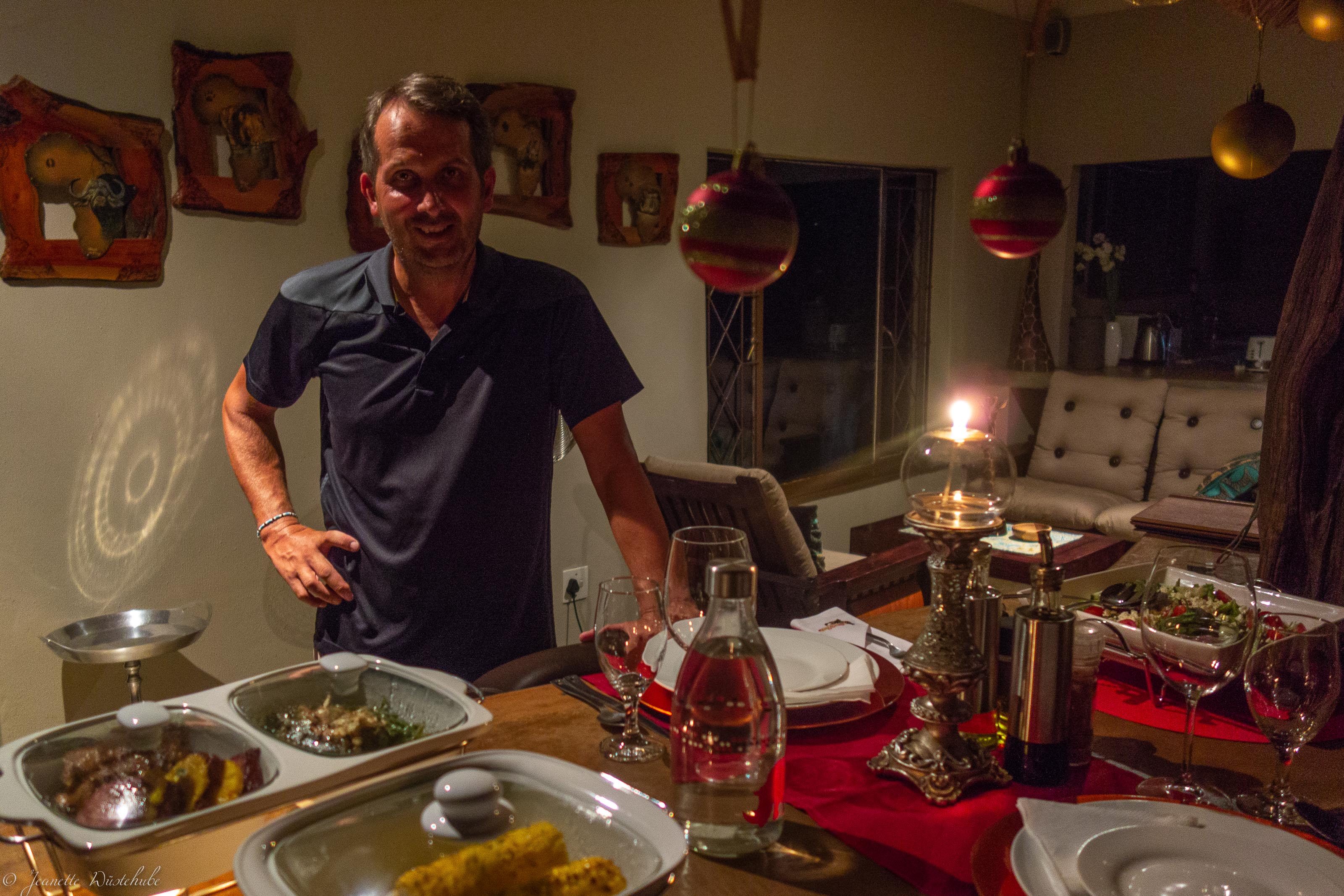 Was für uns der erste Weihnachtsfeiertag ist, ist bei den Südafrikanern Weihnachten. Entsprechend hatte uns Ronell schon gesagt, dass ihr Mann an diesem Tag keine Ausfahrten im Reservat unternehmen würde. Da wir aber ja vorher schon eine Woche im Krüger NP unterwegs waren, war das für uns kein Problem und sogar eher angenehm, einfach ausruhen zu können. Es war toll mit dem Frühstück! Mit Warmhaltebehältern, in denen sich Ei und Bacon und Tomaten befanden, frischem Obst mit Joghurt, Croissant und Marmelade… nur den Kaffee mussten wir selbst kochen. Tom verbrachte danach den halben Tag auf der Liege am Pool, während ich von hier nach da wechselte und versuchte aufzuschreiben, was wir alles erlebt hatten. Heute war der Elefant wieder da und ging brav Wasser am Fluss trinken, ließ also die Sprinkler in Ruhe. Er hielt sich eine ganze Weile hier auf, fraß und stellte sich in den Schatten der Bäume. Wir warteten auf das Weihnachtsessen, zu dem uns auch noch eine Flasche Sekt vom Weingut der Four Cousins serviert wurde. Sowohl das Essen als auch der Sekt waren lecker! Das Leben kann so schön sein 🙂