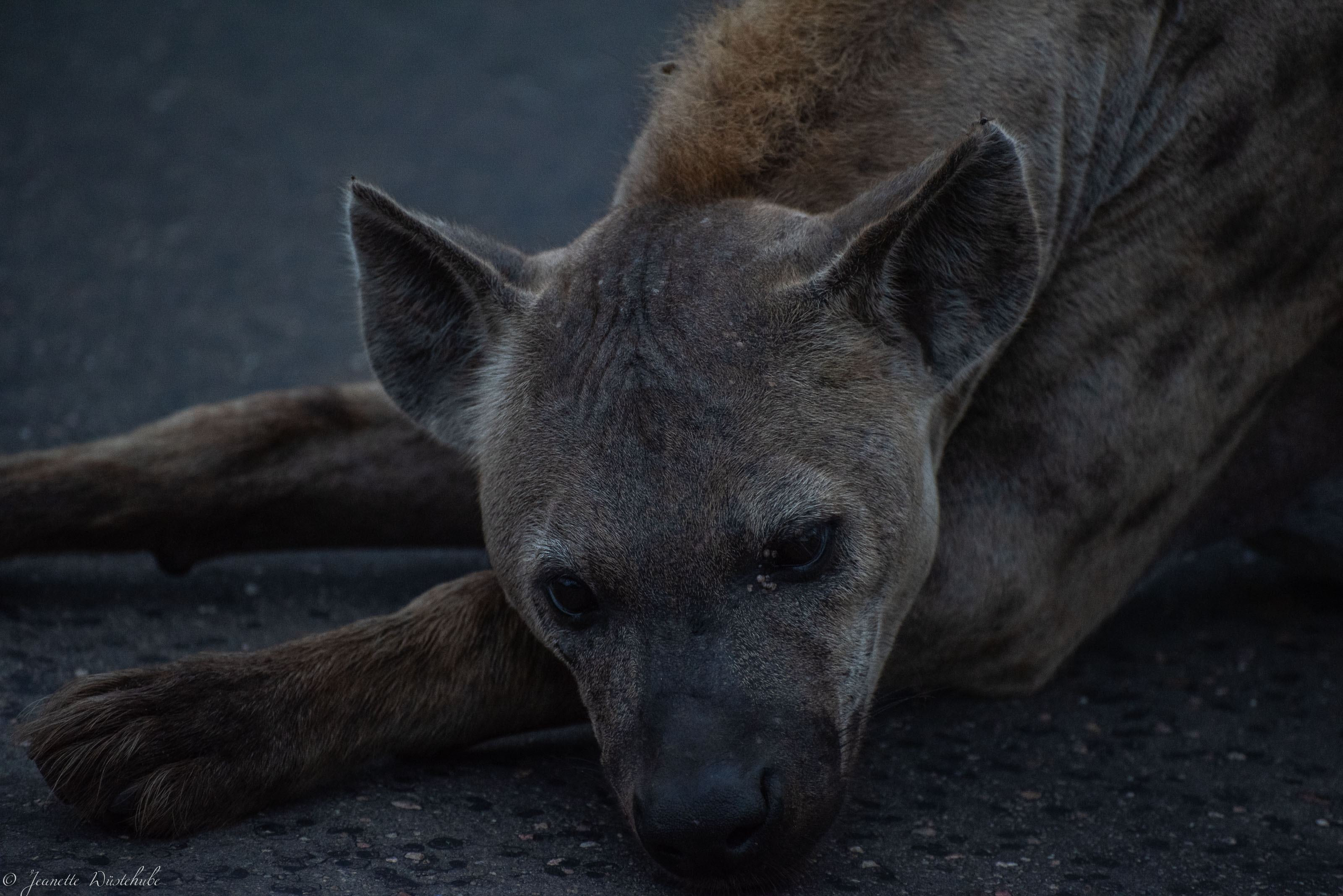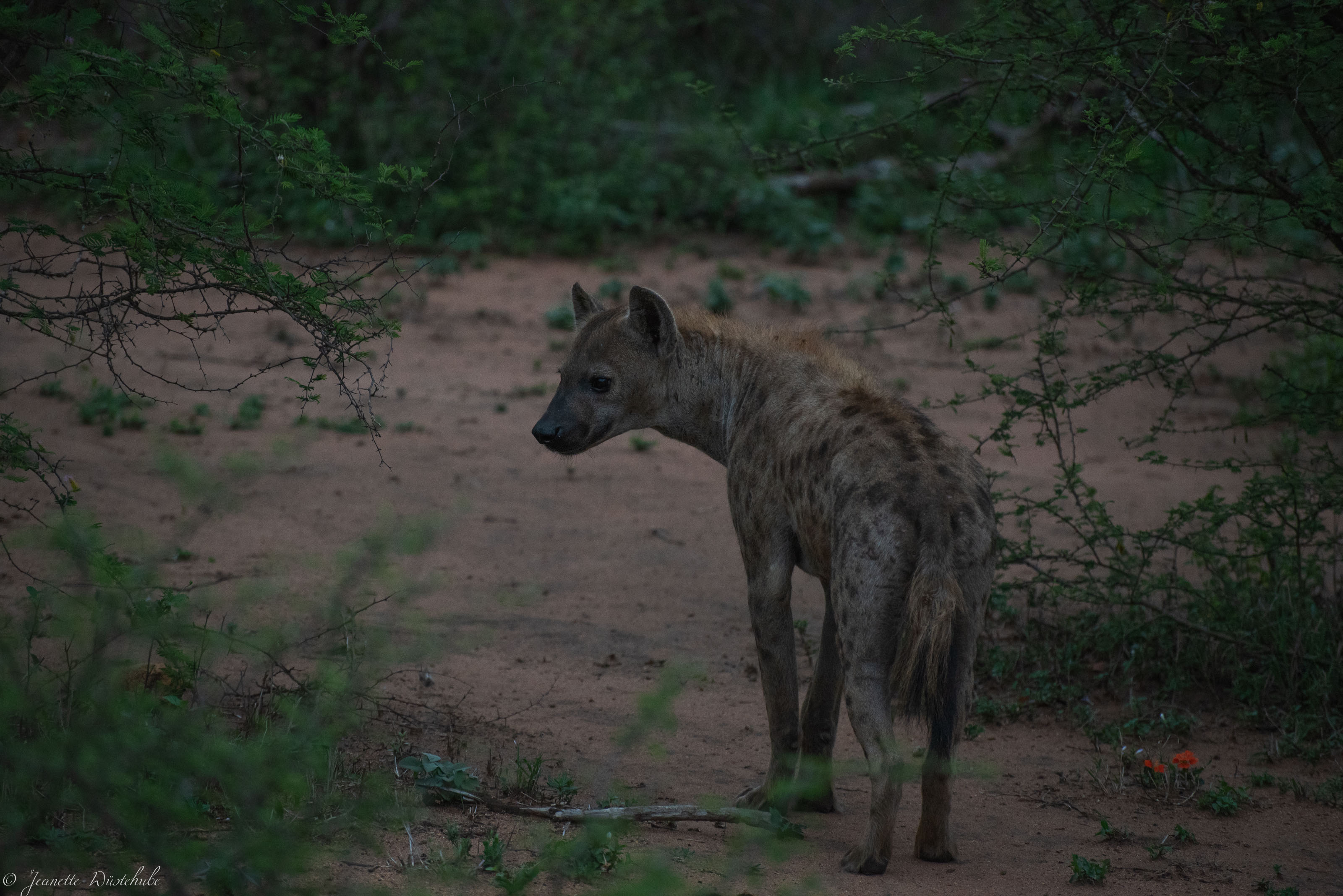 Im Zimmer gab es einen Deckenventilator, den wir beim Mittagsschläfchen laufen ließen, der aber bei der drückenden Hitze nicht viel ausrichten konnte. Ich hatte schon nachts und den ganzen Tag über stärkere Schmerzen im Kiefer-/Mundraum gehabt und versuchte etwas Schlaf nachzuholen. Irgendwie lässt sich die Schmerzquelle nicht richtig lokalisieren. Es könnte ein Zahn sein, könnte vom Kiefer kommen oder auch von der Halswirbelsäule. Jedenfalls ist es sehr unangenehm und ich hoffe weiter sehr, nicht hier zum Zahnarzt zu müssen. Der Zaun um das Tamboti Tented Camp führte am Nachbarhäuschen vorbei. Unser Nachbar suchte am Abend mit seiner Spotter-Lampe die Bäume am Zaun ab, während wir wieder mit unserer Blaulicht-Leuchte auf Chamäleon-Suche waren. Kurz vor dem Zaun meinte Tom plötzlich, dass da ein Tier wäre und tatsächlich huschte direkt vor dem Zaun eine Hyäne vorbei. Sie wurde offenbar vom Essen angelockt, welches gerade auf dem Nachbar-Grill zubereitet wurde und kam ganz nahe an den Zaun. Wir standen ihr in 3 Meter Entfernung gegenüber und da wirkt so eine Hyäne auf einmal viel größer als wenn man sie nur vom Auto aus betrachtet. Ein richtiger Brocken war das, größer als ein Schäferhund und vor allem mit viel kräftigeren Vorderläufen.