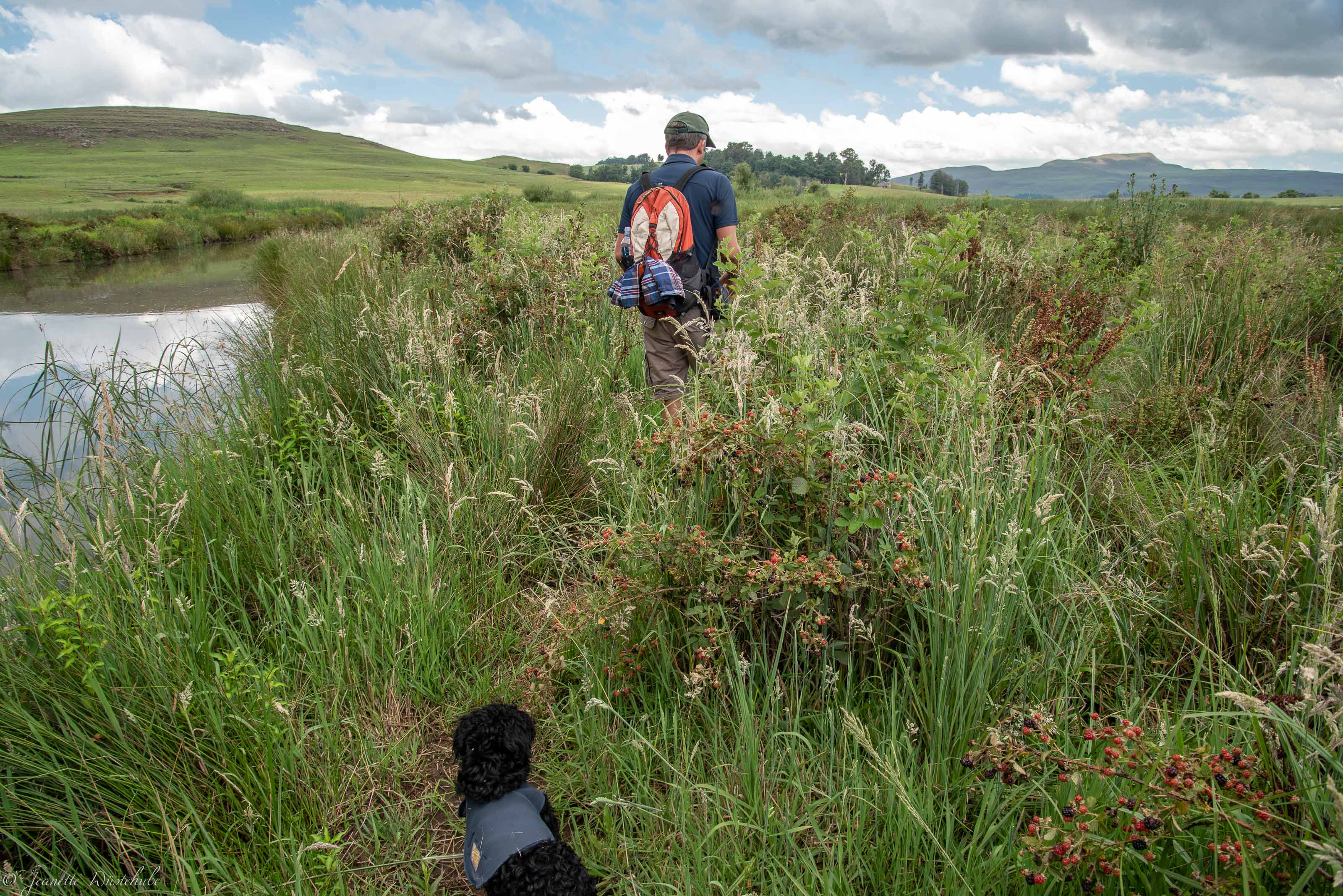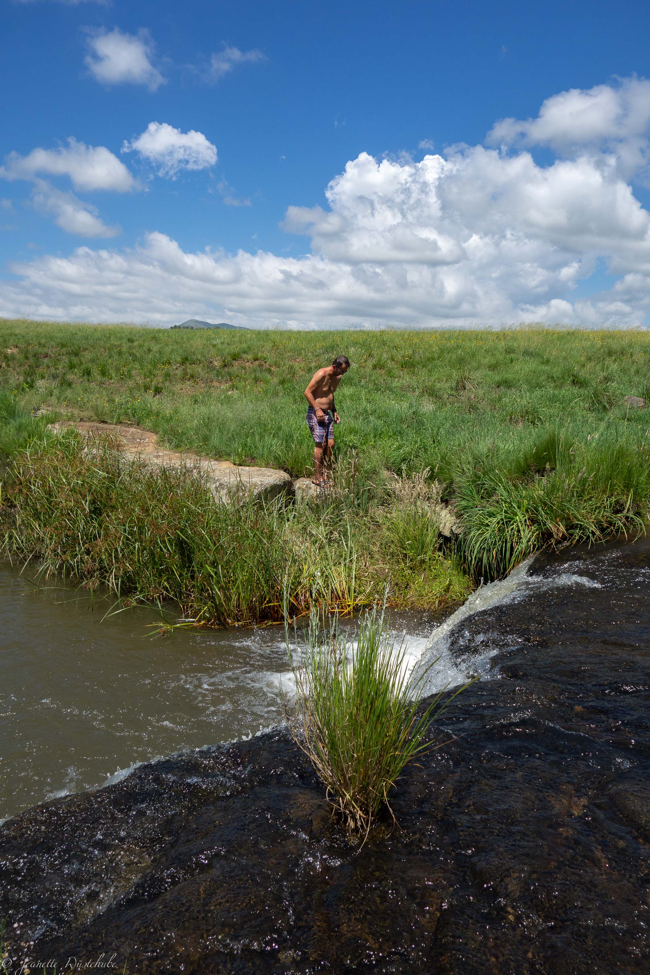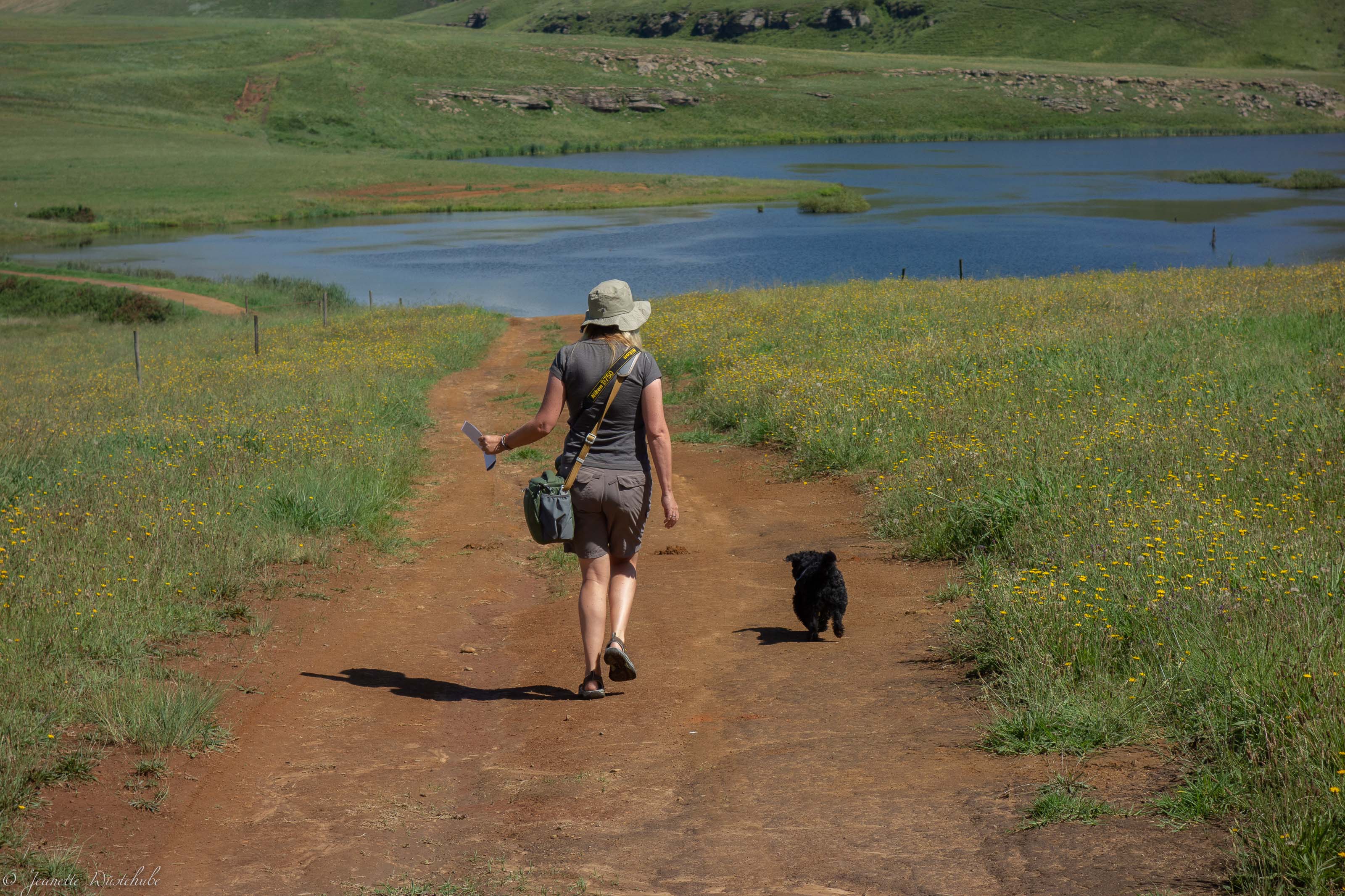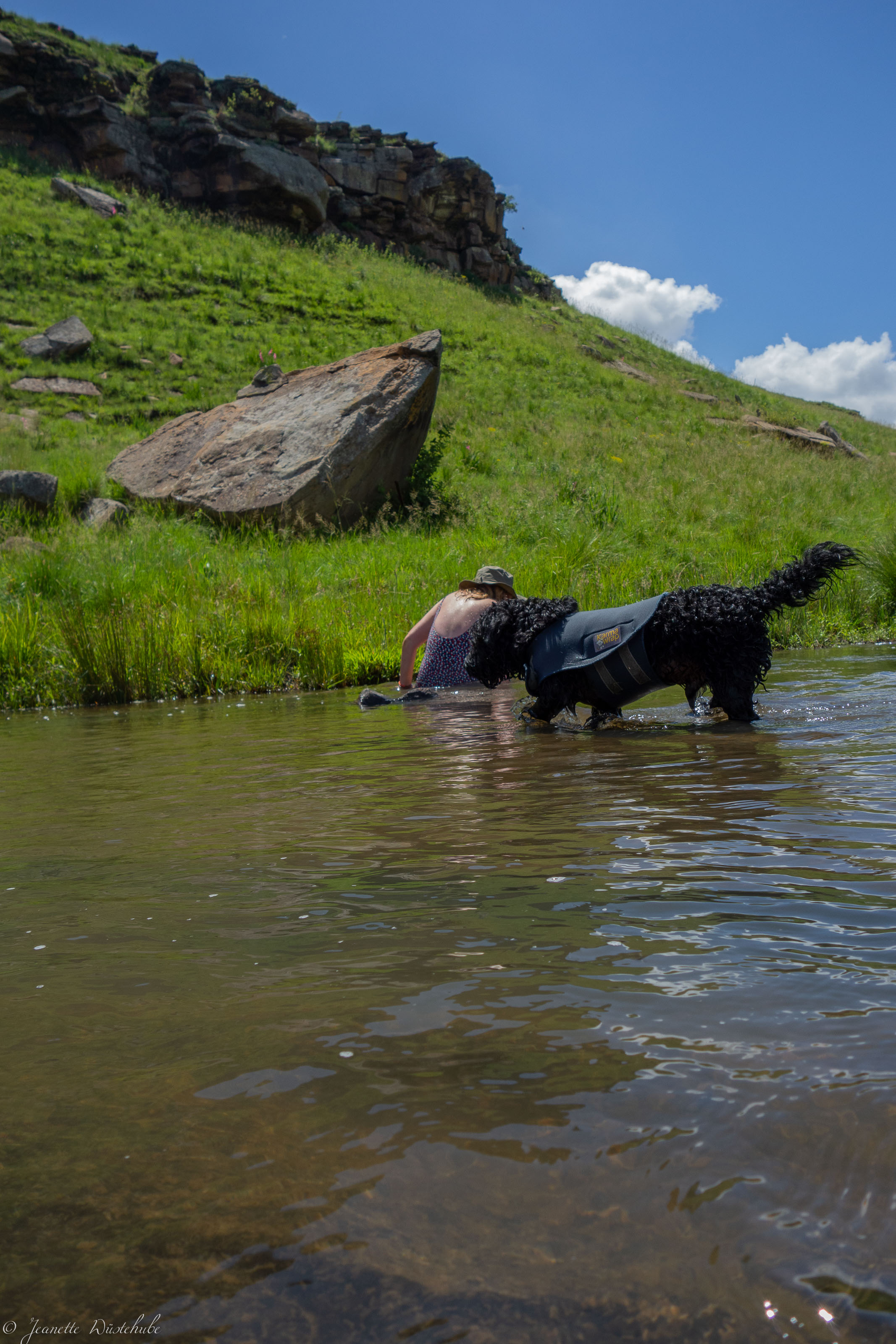 Ich dachte eigentlich, er würde vielleicht ein paar Meter mitkommen und dann umkehren, aber er machte keine Anstalten zurückzulaufen. Ich war nicht undankbar, dass er vorauslief und so mögliche Schlangen aufschrecken konnte. Der Weg war einfach zu laufen und nach etwa 2 Kilometern wies ein Schild uns den Weg zum Rock Pool. Wir sahen jede Menge Witwenvögel und anderes Gefieder. Dann ging es auf einem mit Gras bewachsenen Feldweg noch knapp 1,5 Kilometer weiter. Je näher wir dem immer besser zu hörenden rauschenden Wasser kamen, desto schneller wurde der Hund. Außer uns war kein Mensch zu sehen. Es war herrlich. Der natürliche Pool, der sich im langsam fließenden Fluss gebildet hatte, hatte genau die richtige Temperatur, um sich abzukühlen. Und wir hatten ihn komplett für uns! Wahnsinn!