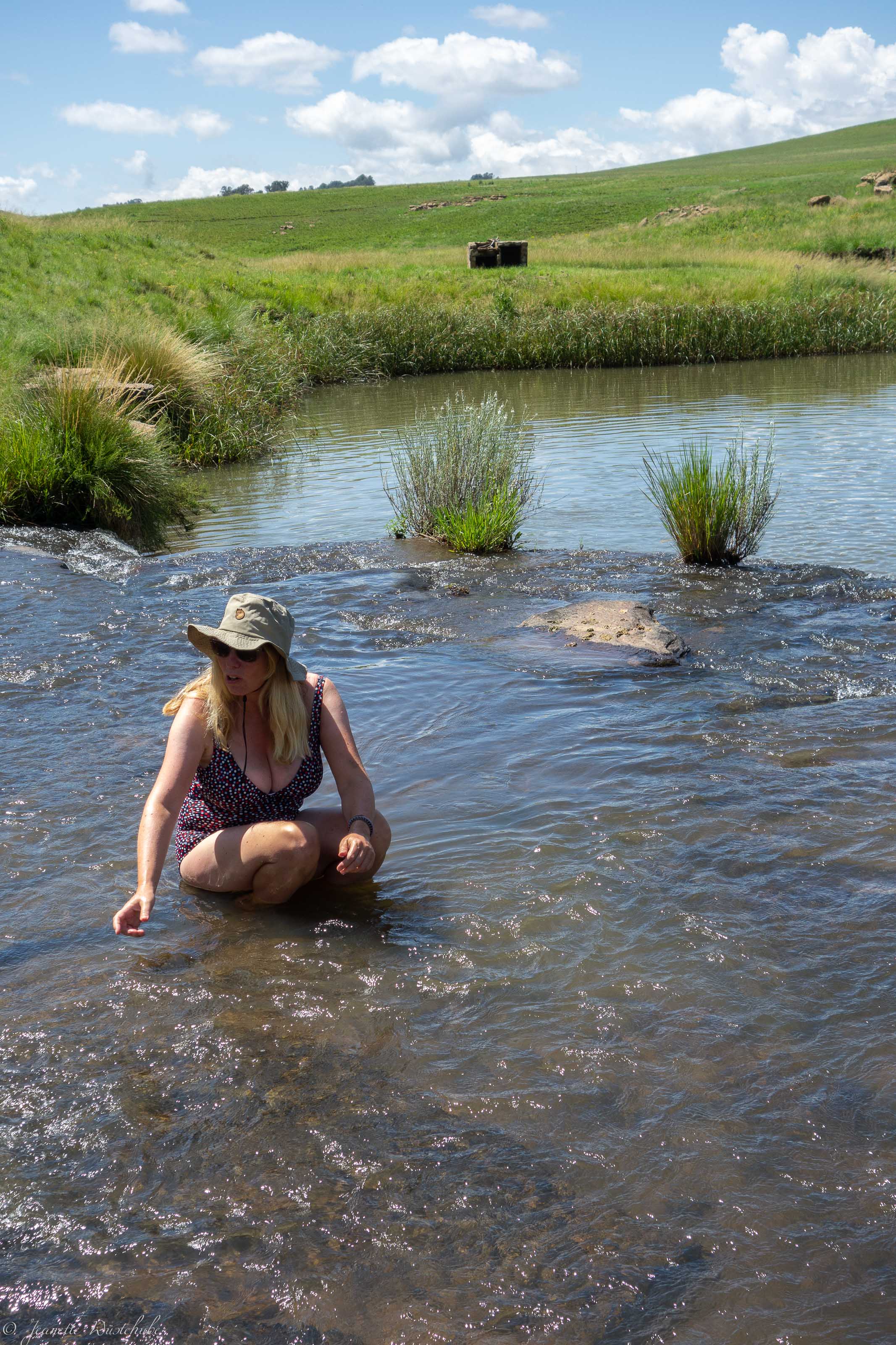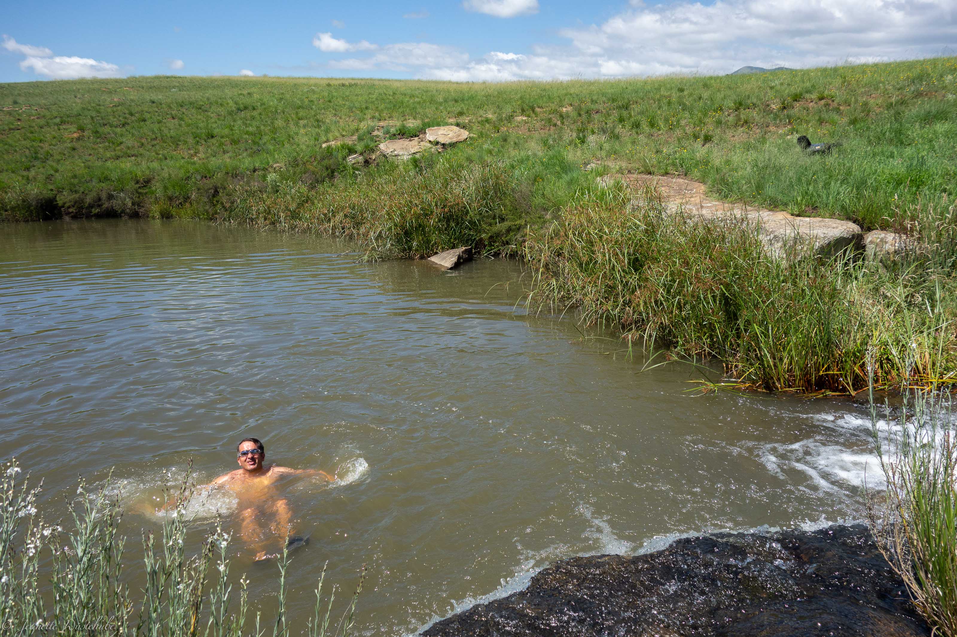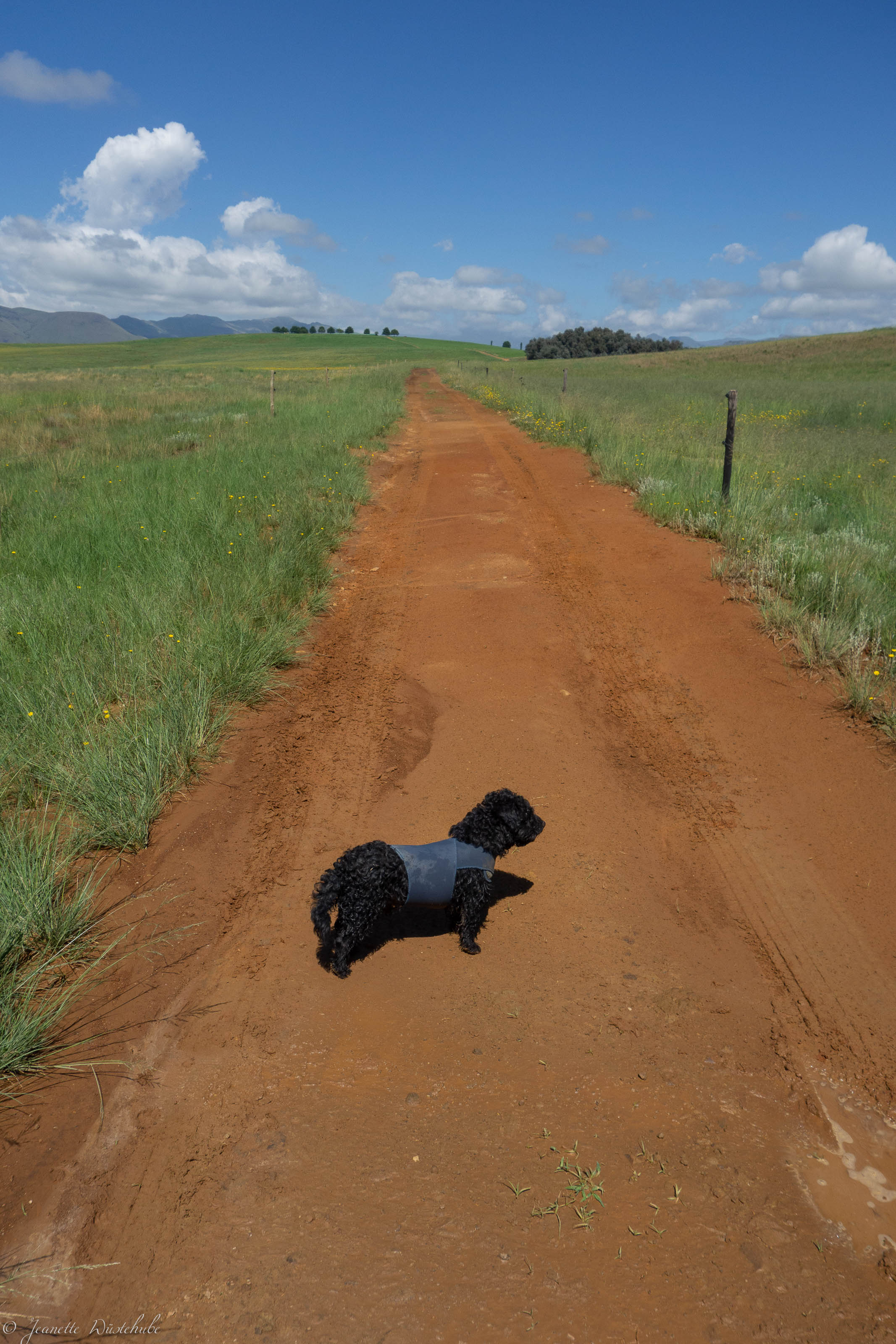 Ich dachte eigentlich, er würde vielleicht ein paar Meter mitkommen und dann umkehren, aber er machte keine Anstalten zurückzulaufen. Ich war nicht undankbar, dass er vorauslief und so mögliche Schlangen aufschrecken konnte. Der Weg war einfach zu laufen und nach etwa 2 Kilometern wies ein Schild uns den Weg zum Rock Pool. Wir sahen jede Menge Witwenvögel und anderes Gefieder. Dann ging es auf einem mit Gras bewachsenen Feldweg noch knapp 1,5 Kilometer weiter. Je näher wir dem immer besser zu hörenden rauschenden Wasser kamen, desto schneller wurde der Hund. Außer uns war kein Mensch zu sehen. Es war herrlich. Der natürliche Pool, der sich im langsam fließenden Fluss gebildet hatte, hatte genau die richtige Temperatur, um sich abzukühlen. Und wir hatten ihn komplett für uns! Wahnsinn!
