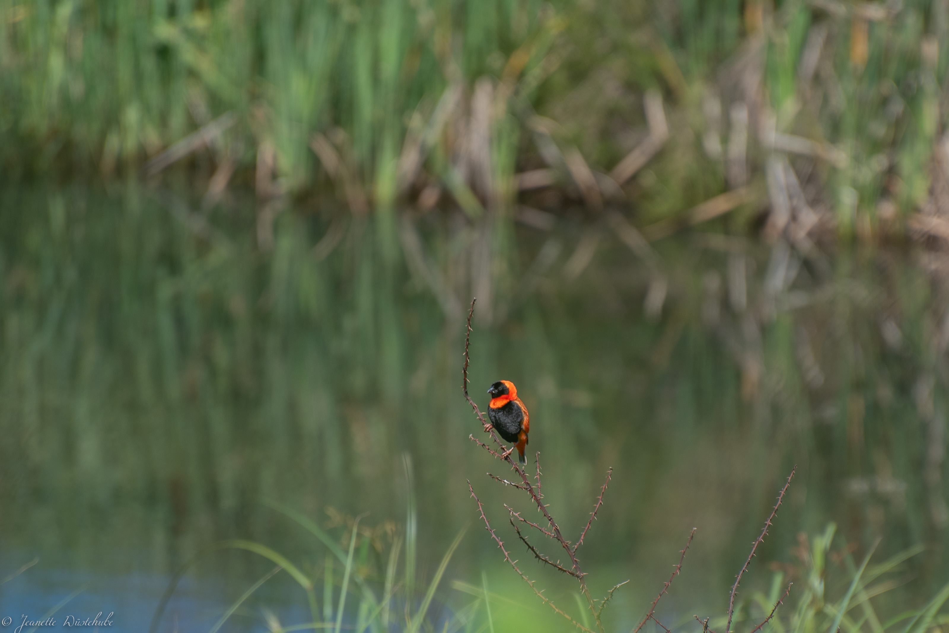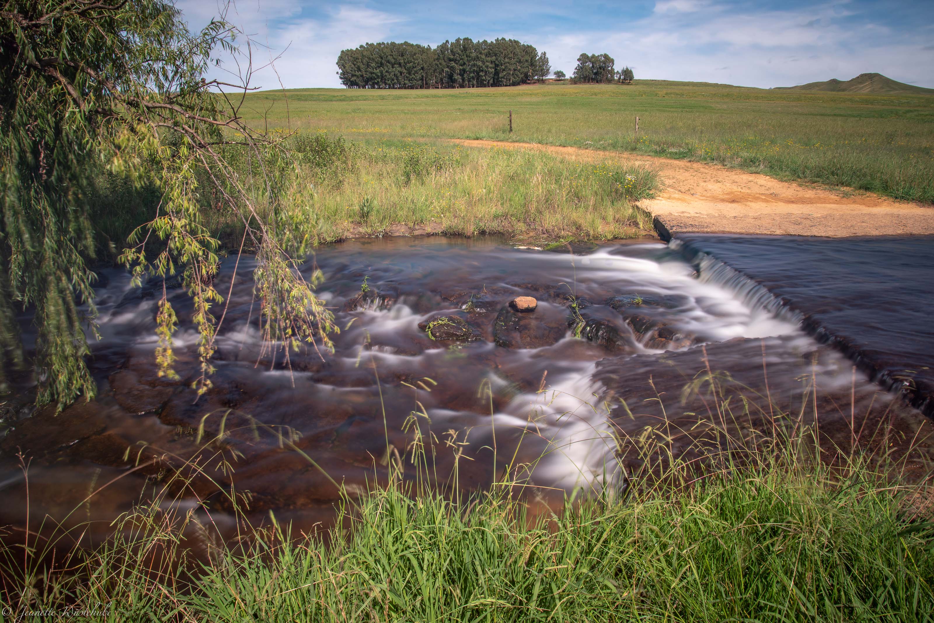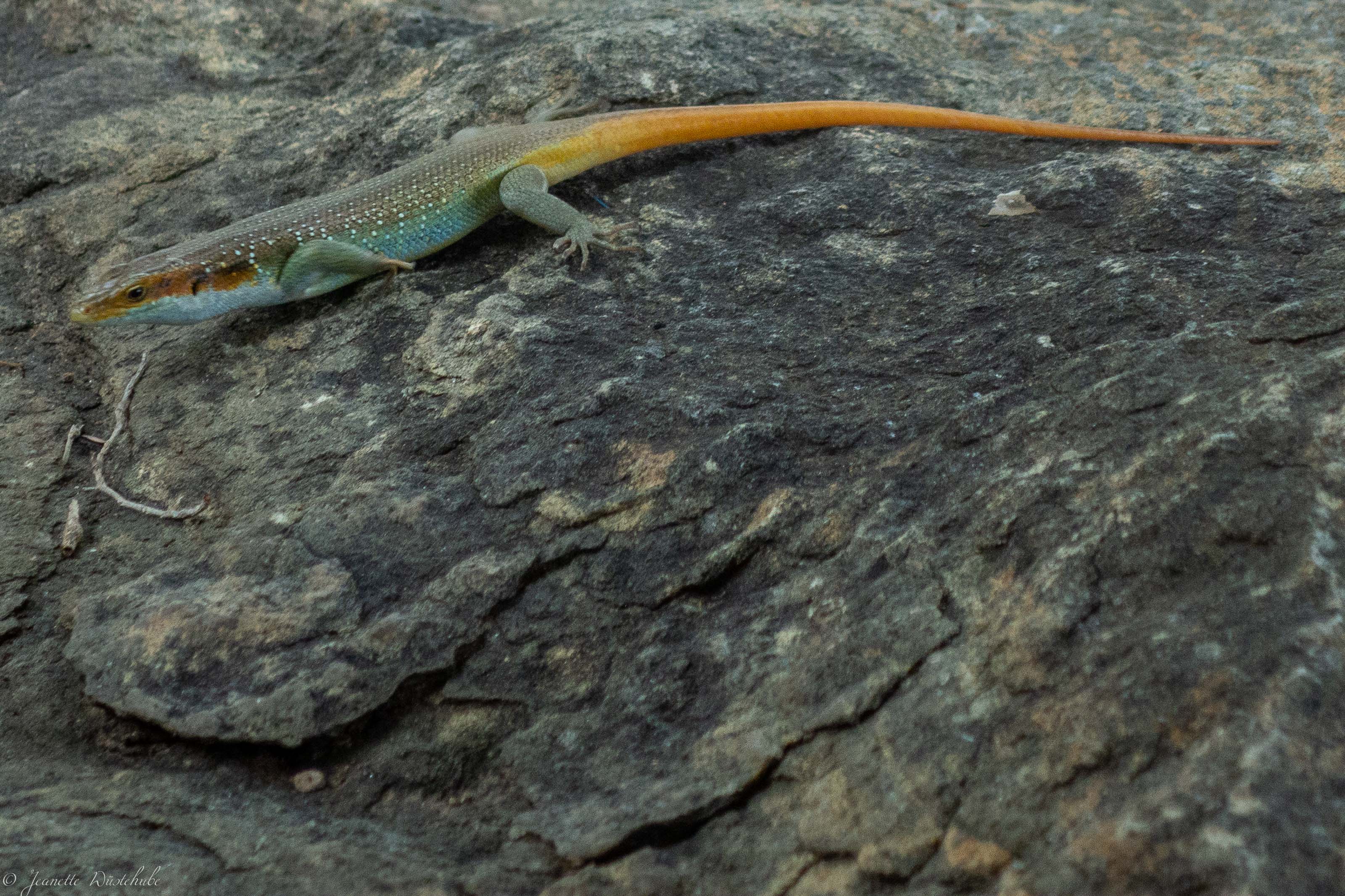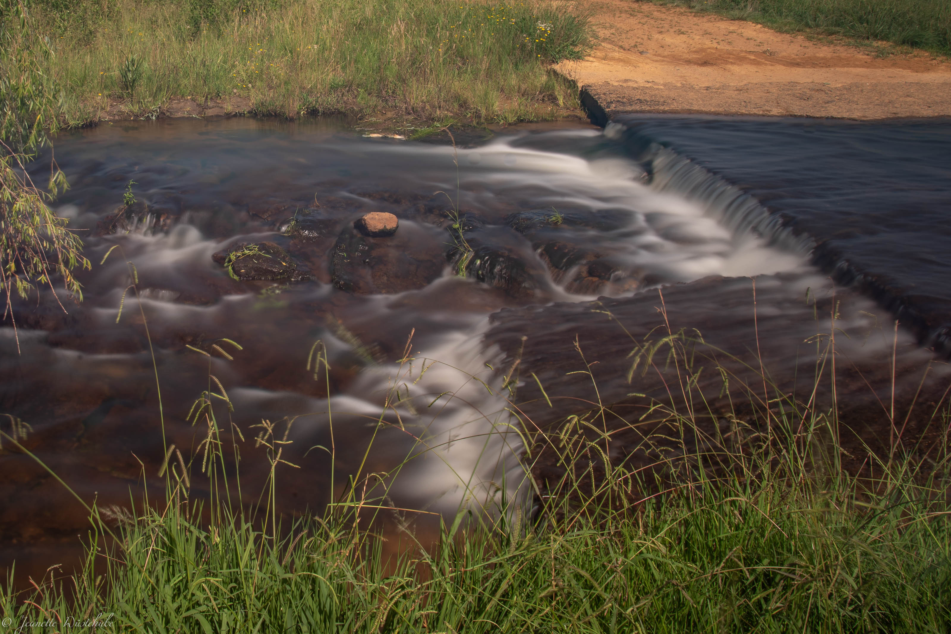 Ich dachte eigentlich, er würde vielleicht ein paar Meter mitkommen und dann umkehren, aber er machte keine Anstalten zurückzulaufen. Ich war nicht undankbar, dass er vorauslief und so mögliche Schlangen aufschrecken konnte. Der Weg war einfach zu laufen und nach etwa 2 Kilometern wies ein Schild uns den Weg zum Rock Pool. Wir sahen jede Menge Witwenvögel und anderes Gefieder. Dann ging es auf einem mit Gras bewachsenen Feldweg noch knapp 1,5 Kilometer weiter. Je näher wir dem immer besser zu hörenden rauschenden Wasser kamen, desto schneller wurde der Hund. Außer uns war kein Mensch zu sehen. Es war herrlich. Der natürliche Pool, der sich im langsam fließenden Fluss gebildet hatte, hatte genau die richtige Temperatur, um sich abzukühlen. Und wir hatten ihn komplett für uns! Wahnsinn!