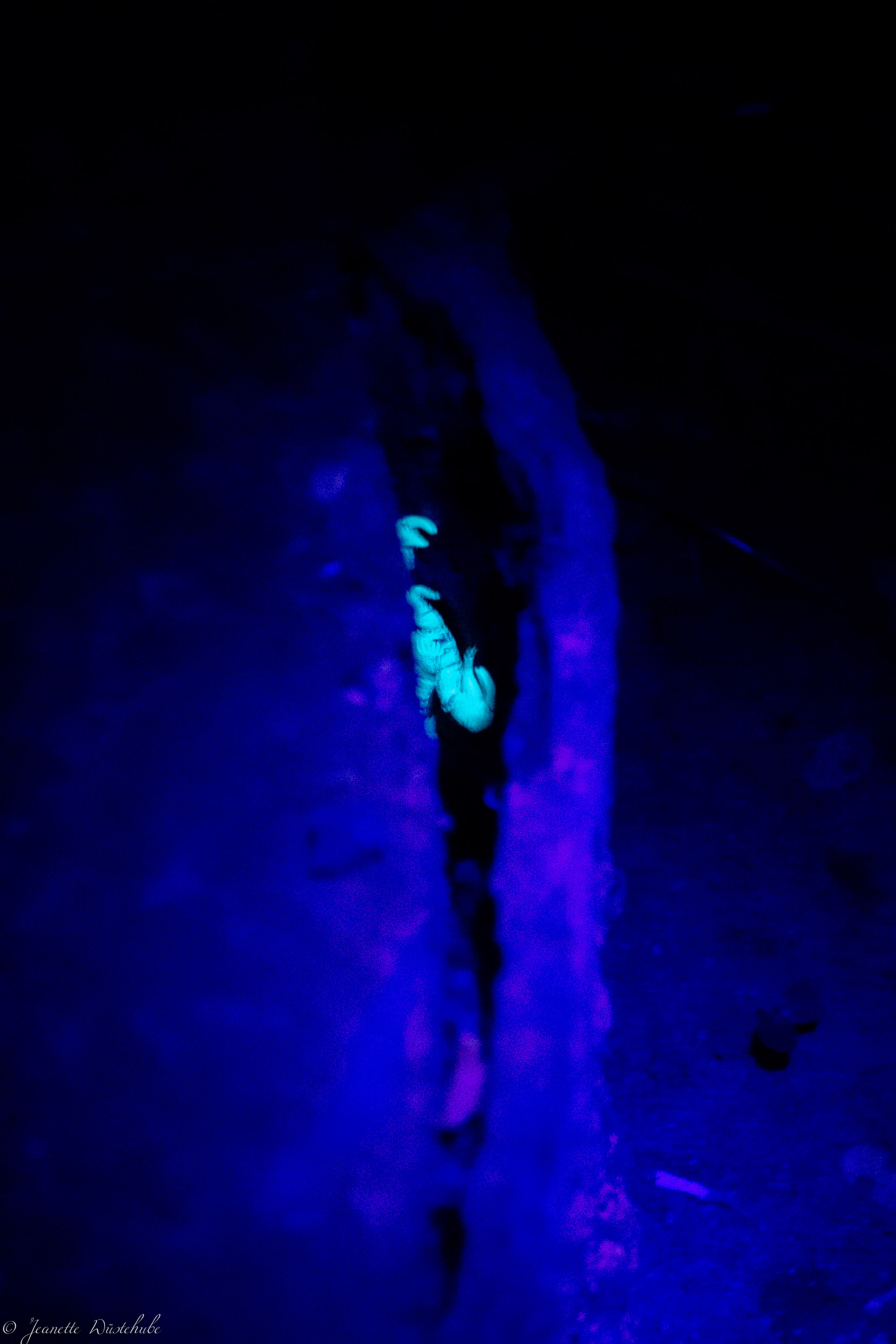 Ein Mann aus Jersey (England) erzählte uns, während wir nebeneinander in der Hide saßen, dass er gerade verrentet wurde und er mit seiner Frau vier Wochen hier verbringen wollte. Leider war ihre Mutter kurz vor der Reise verstorben, so dass er jetzt alleine hier war und seine Frau später in Kapstadt treffen würde. Die beiden hatten sich in einem der privaten Wildreservate in der Nähe von Hoedspruit ein Haus gekauft, das er vermietete. Wenn er in Afrika war, gab es auf dem Grundstück eine ehemalige Lapa, die er in ein kleines Häuschen umgebaut hatte und dort wohnte er dann. Durch die Vermietung finanzierte er sich den Kauf und das teuerste sei wohl die Versicherung des Reed-Daches, die mit 100 Pfund im Monat zu Buche schlug. Er zeigte uns Bilder seines Hauses und ich dachte, das wäre was! So ein Häuschen in der Nähe des Krüger Nationalparks. Man muss ja Ziele haben im Leben 🙂 Das Tsendze Rustic Camp liegt wenige Kilometer vom Mopani Restcamp entfernt und man muss dort auch einchecken, bekommt aber einen Platz zugewiesen. Das Camp hat 30 Plätze, keinen Stromanschluss, es gibt viele Bäume und neue Ablutions. Nachmittags blieben wir am Platz, auch als die meisten anderen Camper nochmal auf Tour gingen und genossen die Stille. Der Camp-Manager kam abends bei allen vorbei, stellte sich als Roger vor, unterhielt sich mit den Gästen und half den Vogel-Enthusiasten bei der Suche nach Eulen. Roger riet mir mit einer Blaulichtlampe auf die Suche nach einem Chamäleon zu gehen. Tom hat ja mal eine von einem sehr guten Freund geschenkt bekommen, also gingen wir abends auf Chamäleon-Jagd. Was wir fanden, war ein fluoriszierend leuchtender Skorpion, was auch interessant war, aber ein Chamäleon lässt weiter auf sich warten.