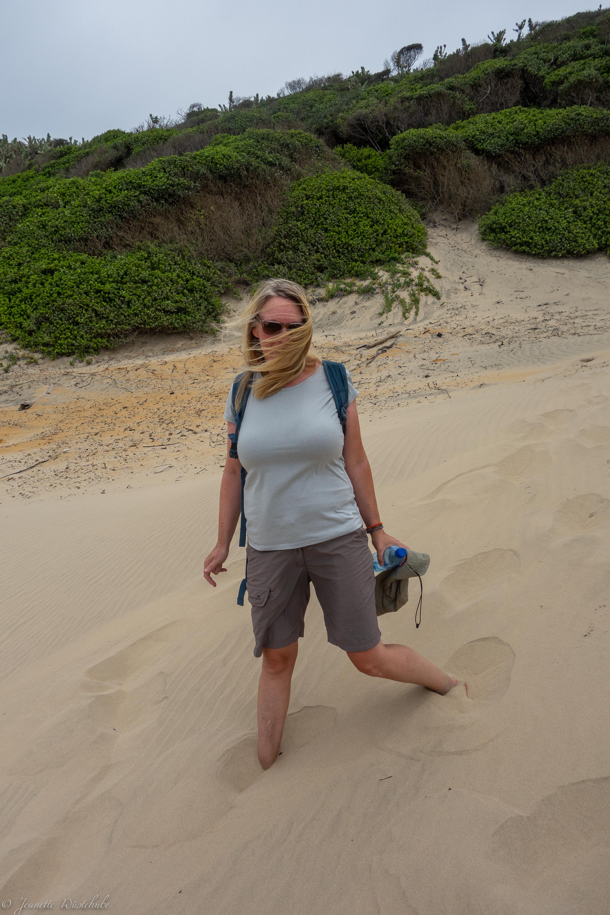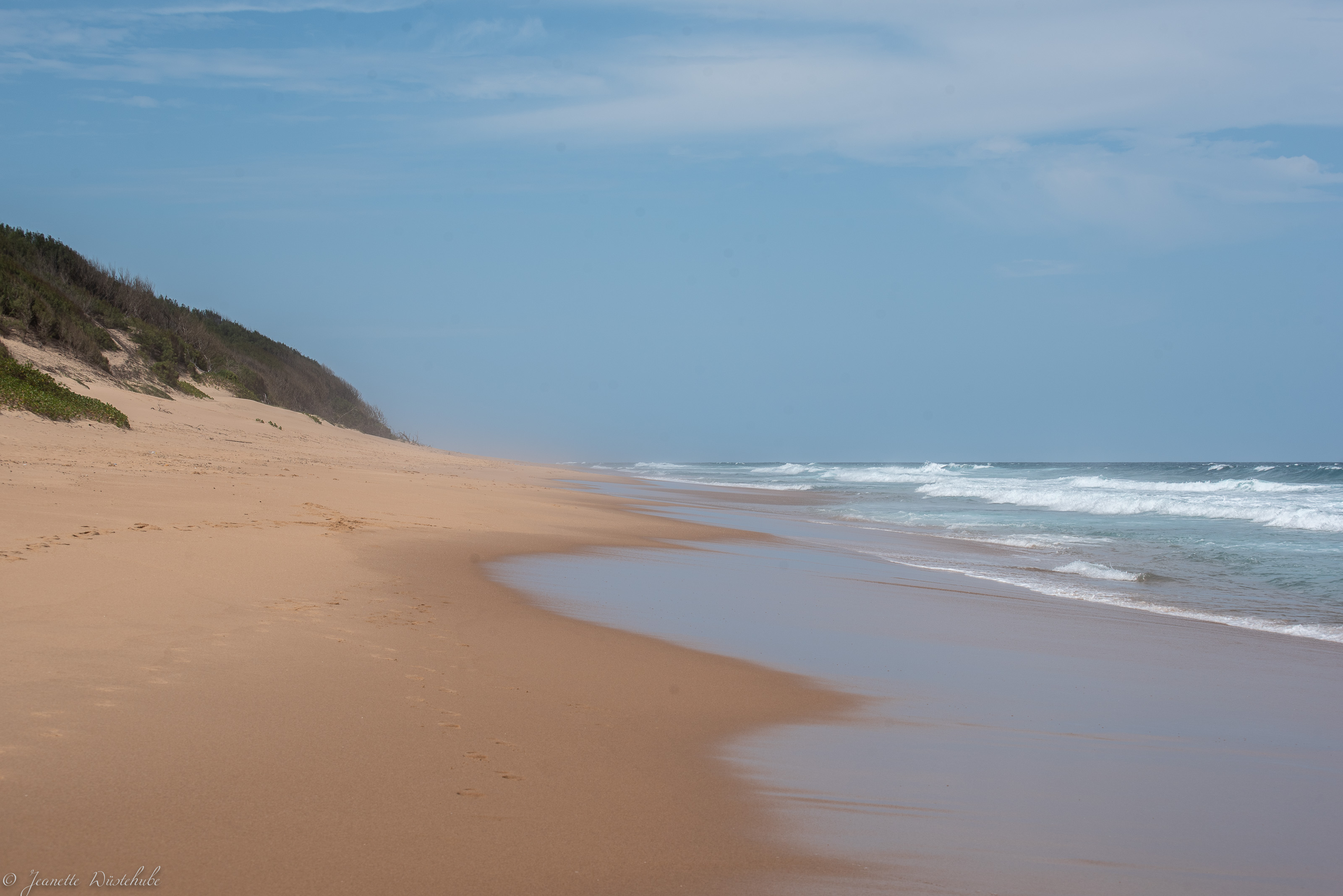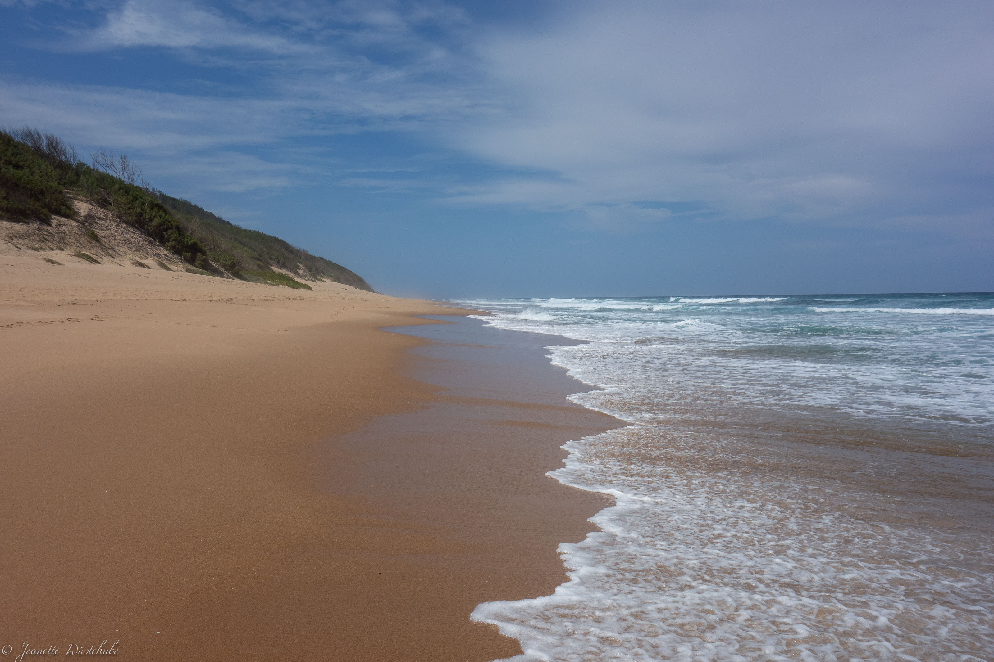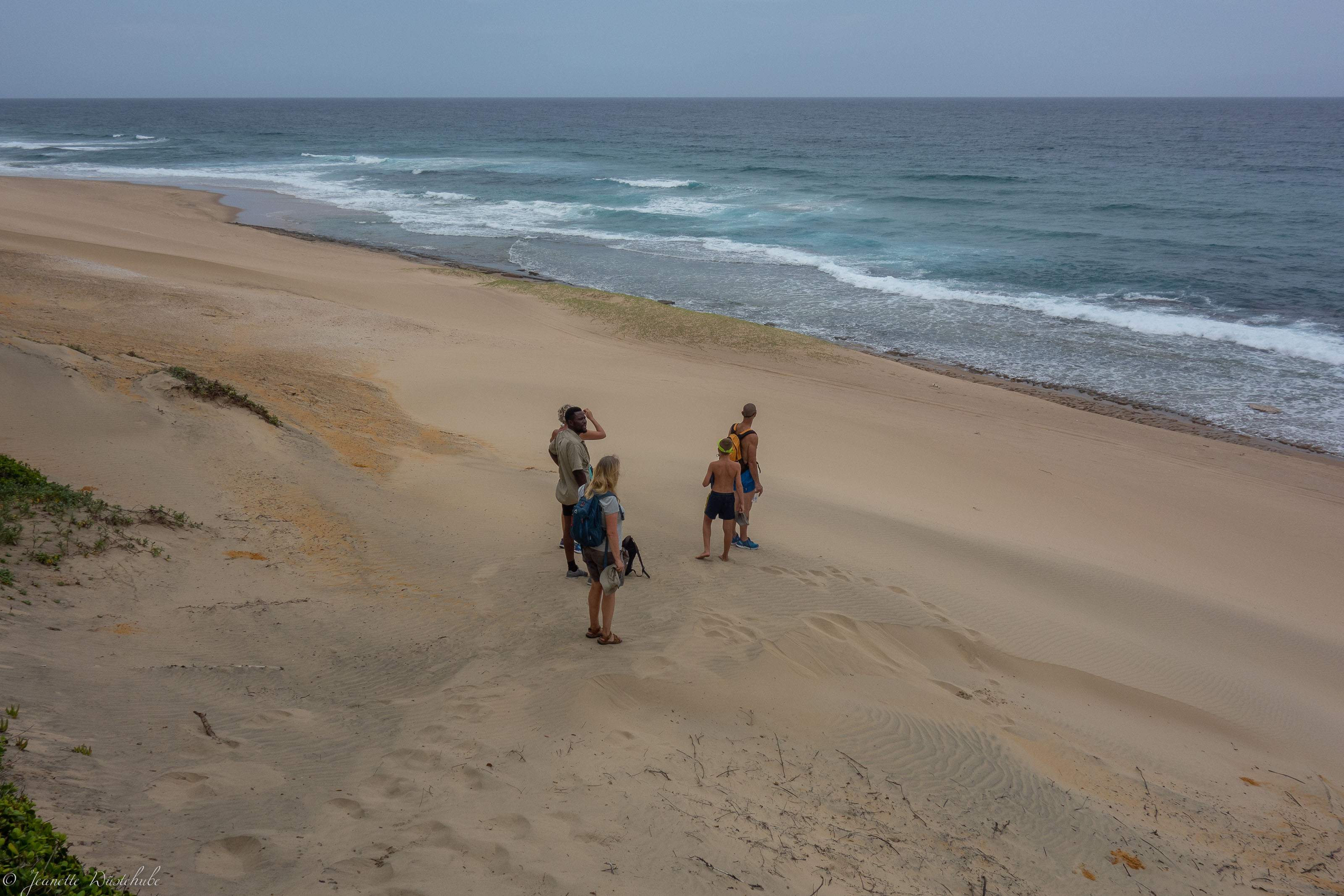 Wir gingen den gleichen Weg wie am Vortag und durchquerten zu Fuß den See mit den Fishing-Kraals. Dann bestiegen wir die Düne, die auch ins Dorf von Raymond und Patrick führte, bogen kurz davor aber links ab. Nach einer Weile ging es dann schließlich auf der anderen Seite durch die dicht bewachsenen Dünen wieder hinunter und wir erreichten schließlich den Indischen Ozean. Keine Menschenseele war weit und breit zu sehen! Trotz des bewölkten Himmels war es ein wunderschöner Anblick. Wir liefen und liefen den kilometerlangen, menschenleeren Strand entlang. Immer wieder sahen wir Spuren, die Schildkröten hinterlassen hatten, die in der Nacht an Land gekrochen und waren und ihre Eier weiter oben an den Dünen abgelegt hatten. Schildkörten sahen wir keine.