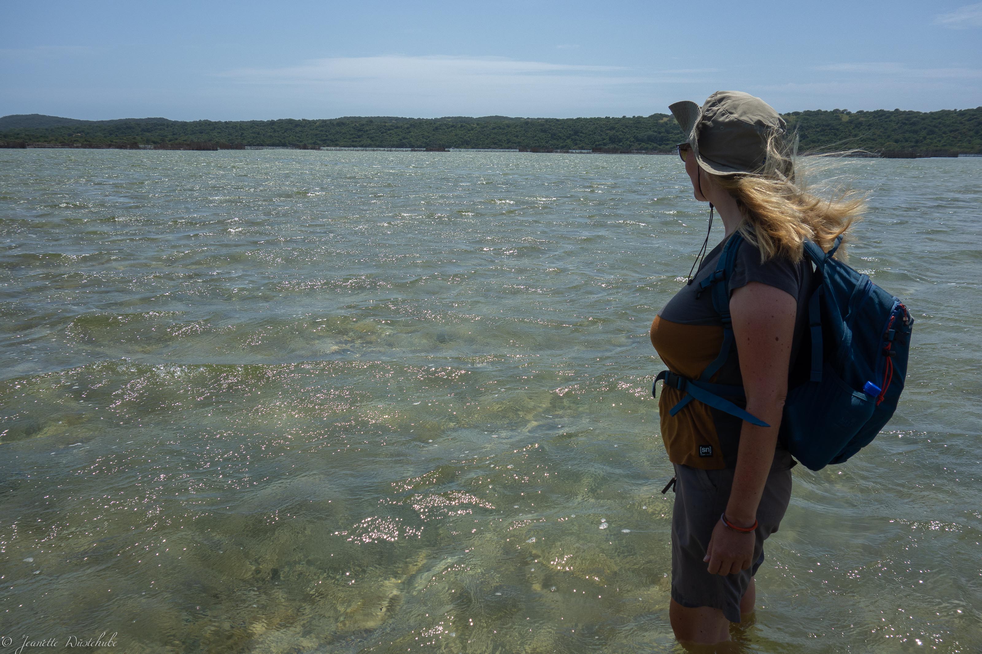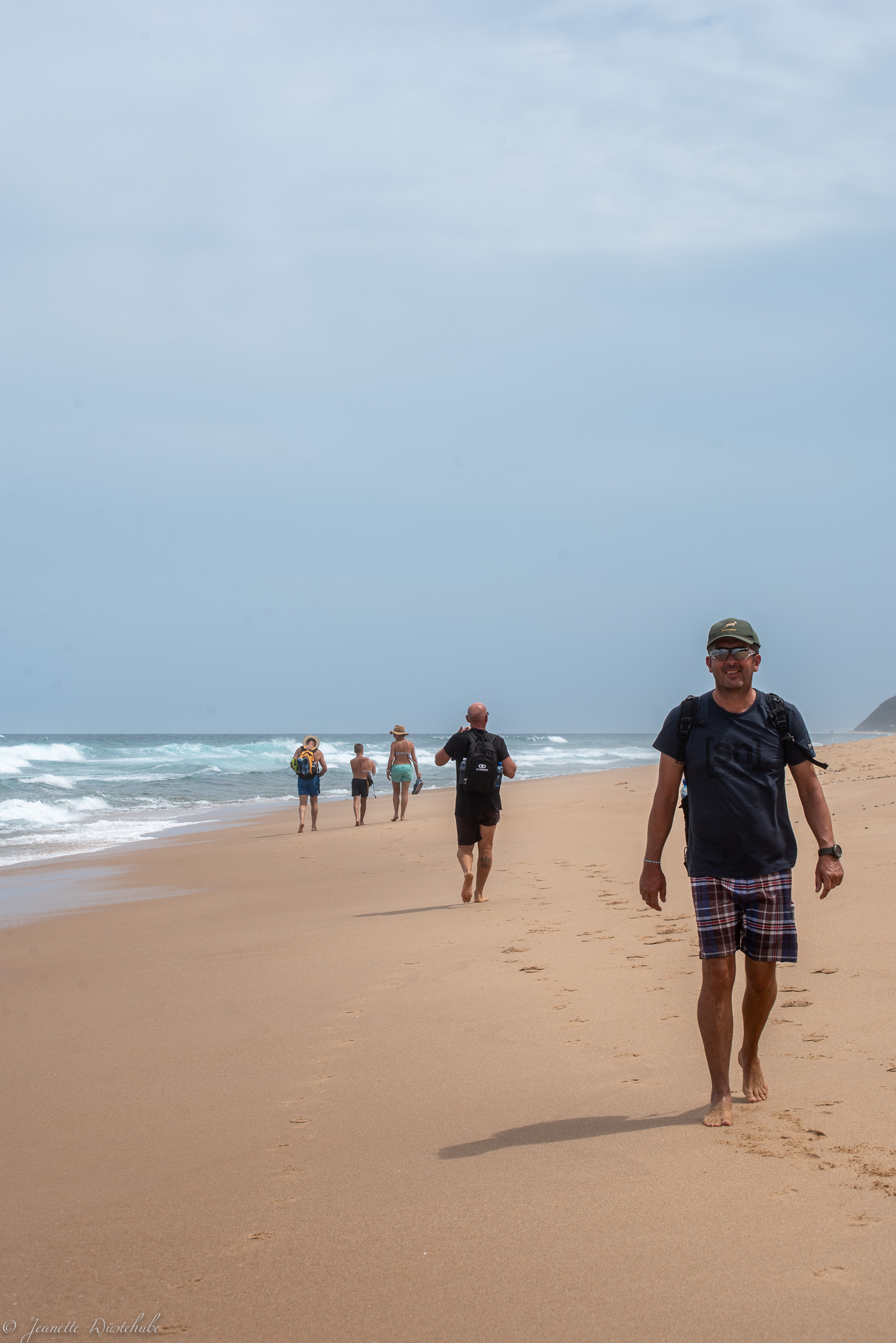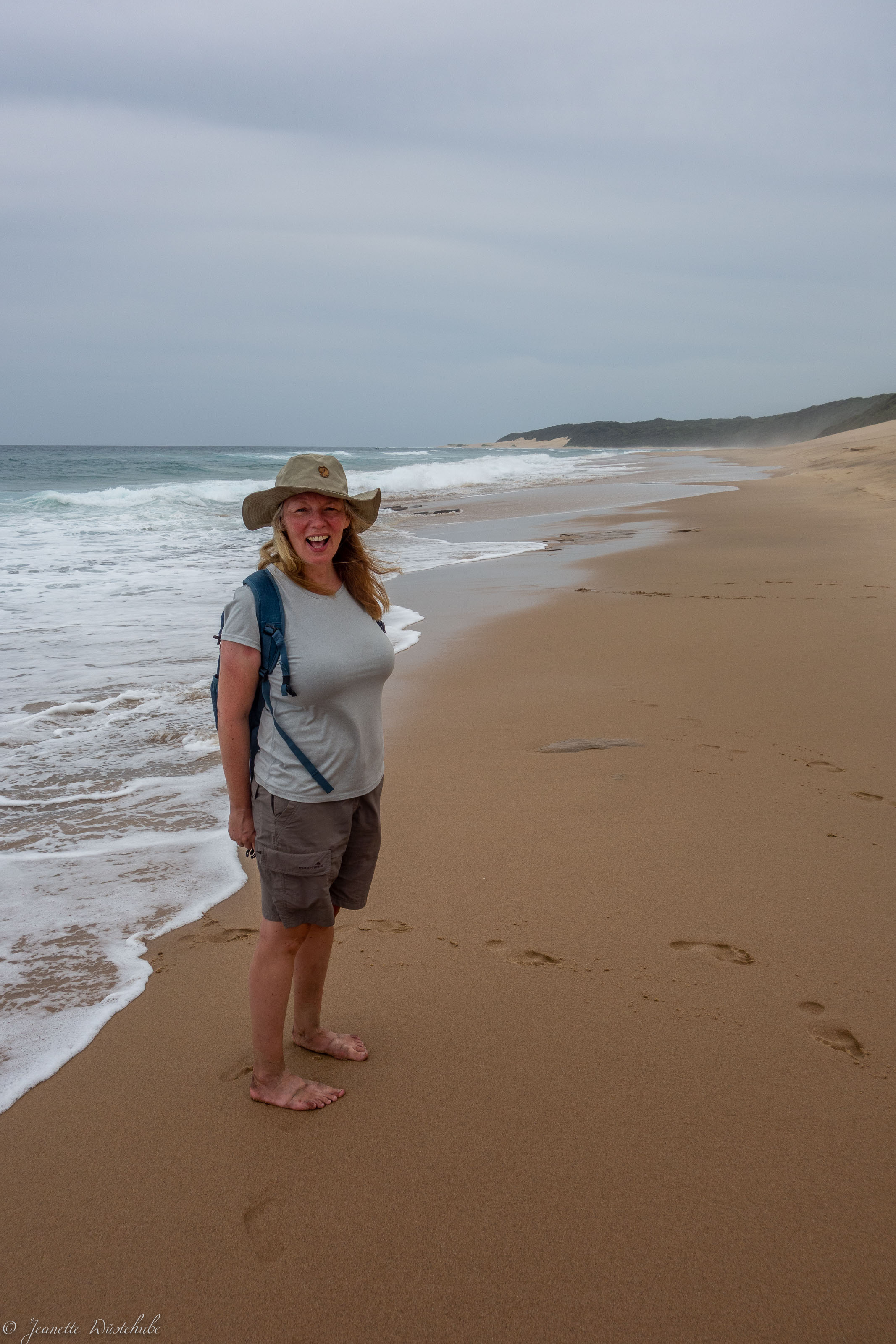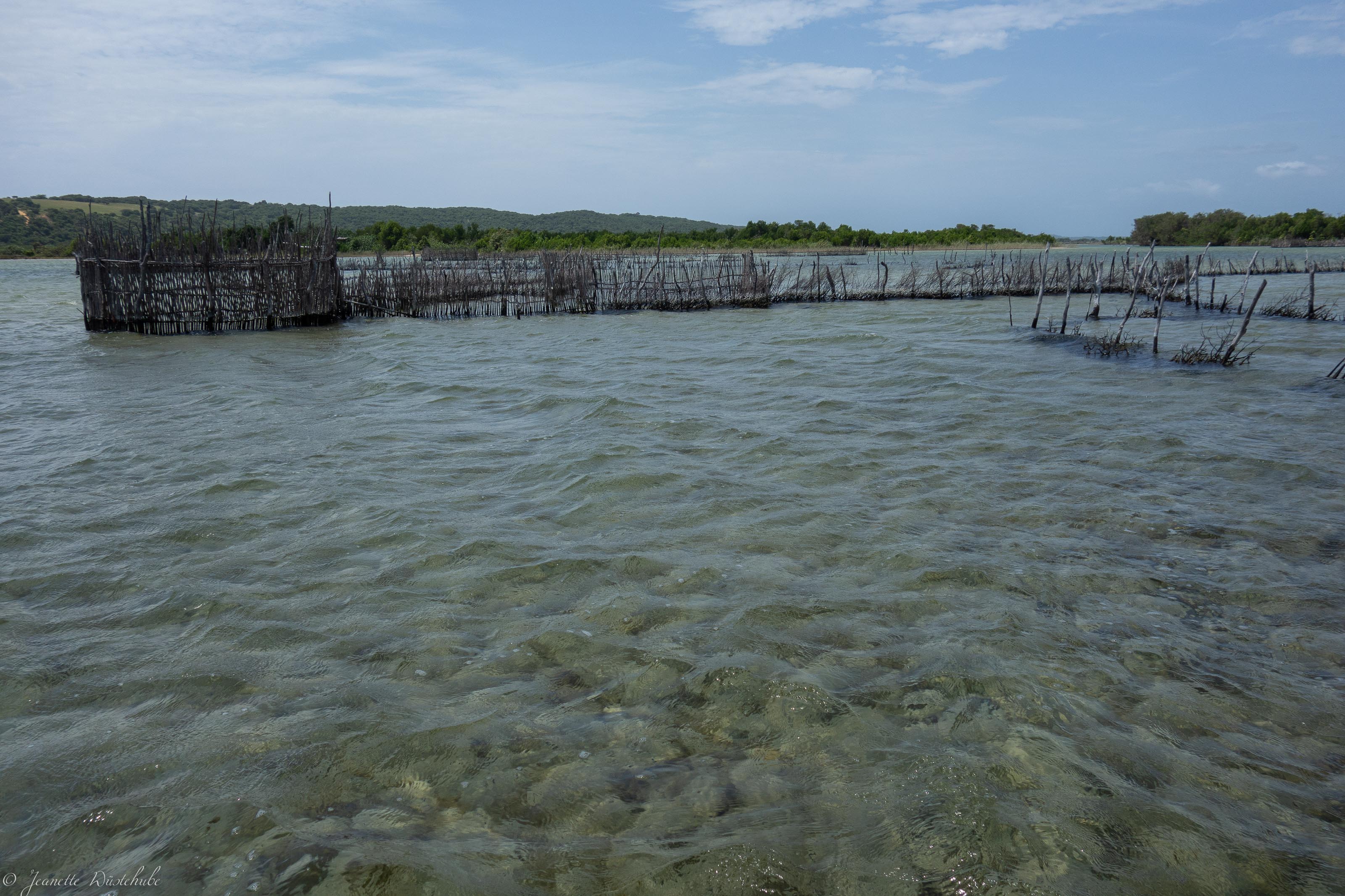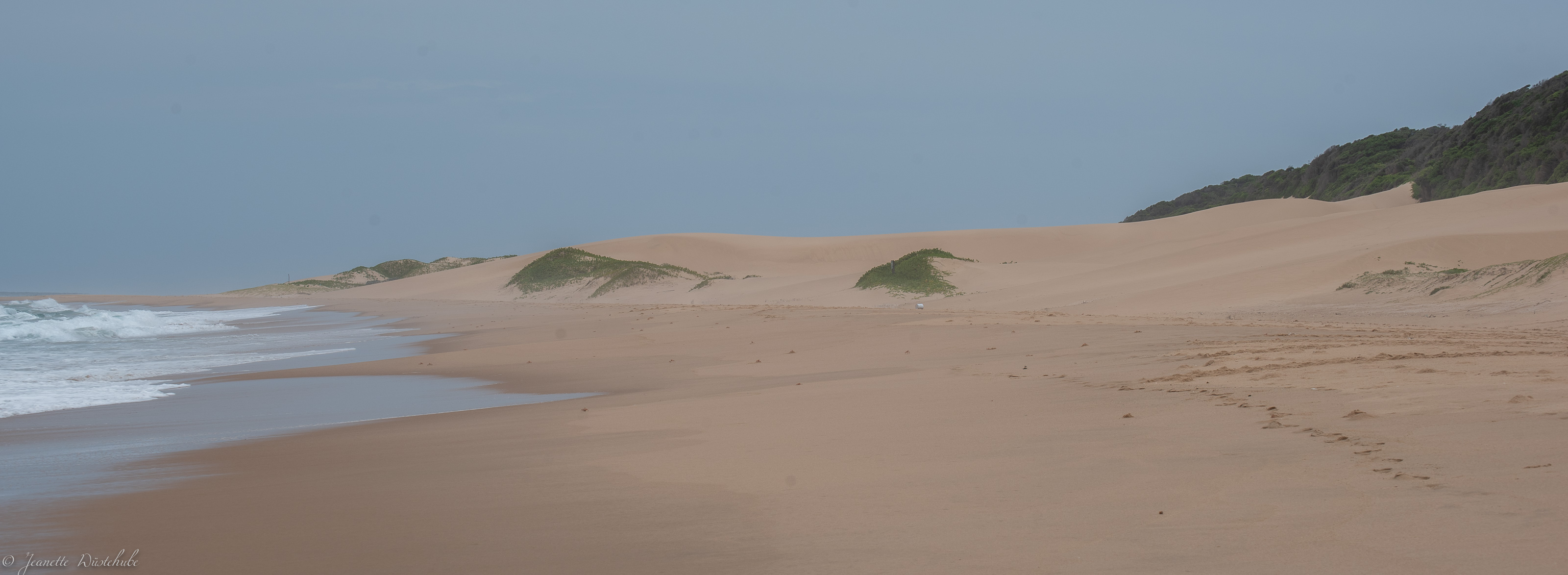 Wir gingen den gleichen Weg wie am Vortag und durchquerten zu Fuß den See mit den Fishing-Kraals. Dann bestiegen wir die Düne, die auch ins Dorf von Raymond und Patrick führte, bogen kurz davor aber links ab. Nach einer Weile ging es dann schließlich auf der anderen Seite durch die dicht bewachsenen Dünen wieder hinunter und wir erreichten schließlich den Indischen Ozean. Keine Menschenseele war weit und breit zu sehen! Trotz des bewölkten Himmels war es ein wunderschöner Anblick. Wir liefen und liefen den kilometerlangen, menschenleeren Strand entlang. Immer wieder sahen wir Spuren, die Schildkröten hinterlassen hatten, die in der Nacht an Land gekrochen und waren und ihre Eier weiter oben an den Dünen abgelegt hatten. Schildkörten sahen wir keine.