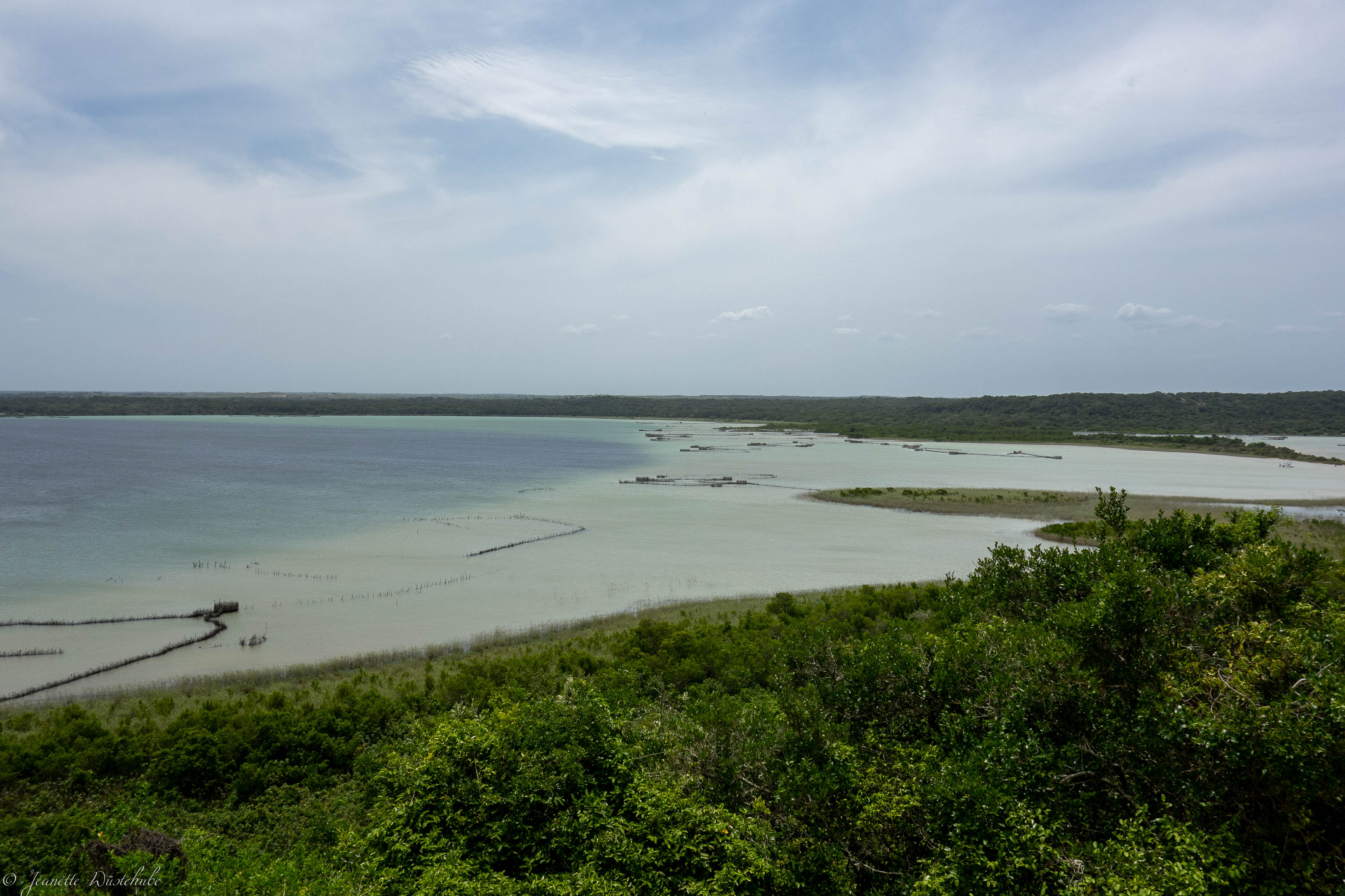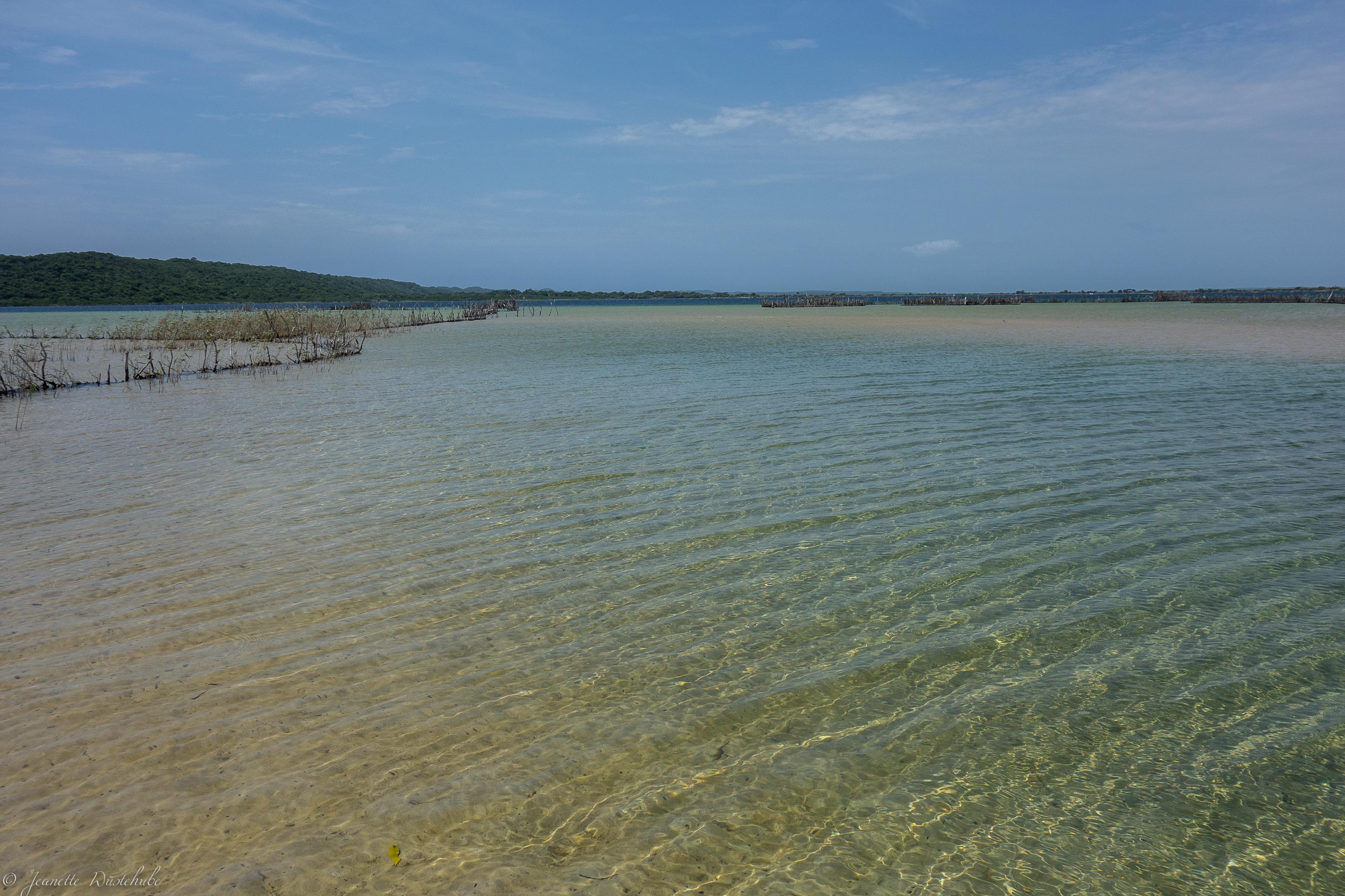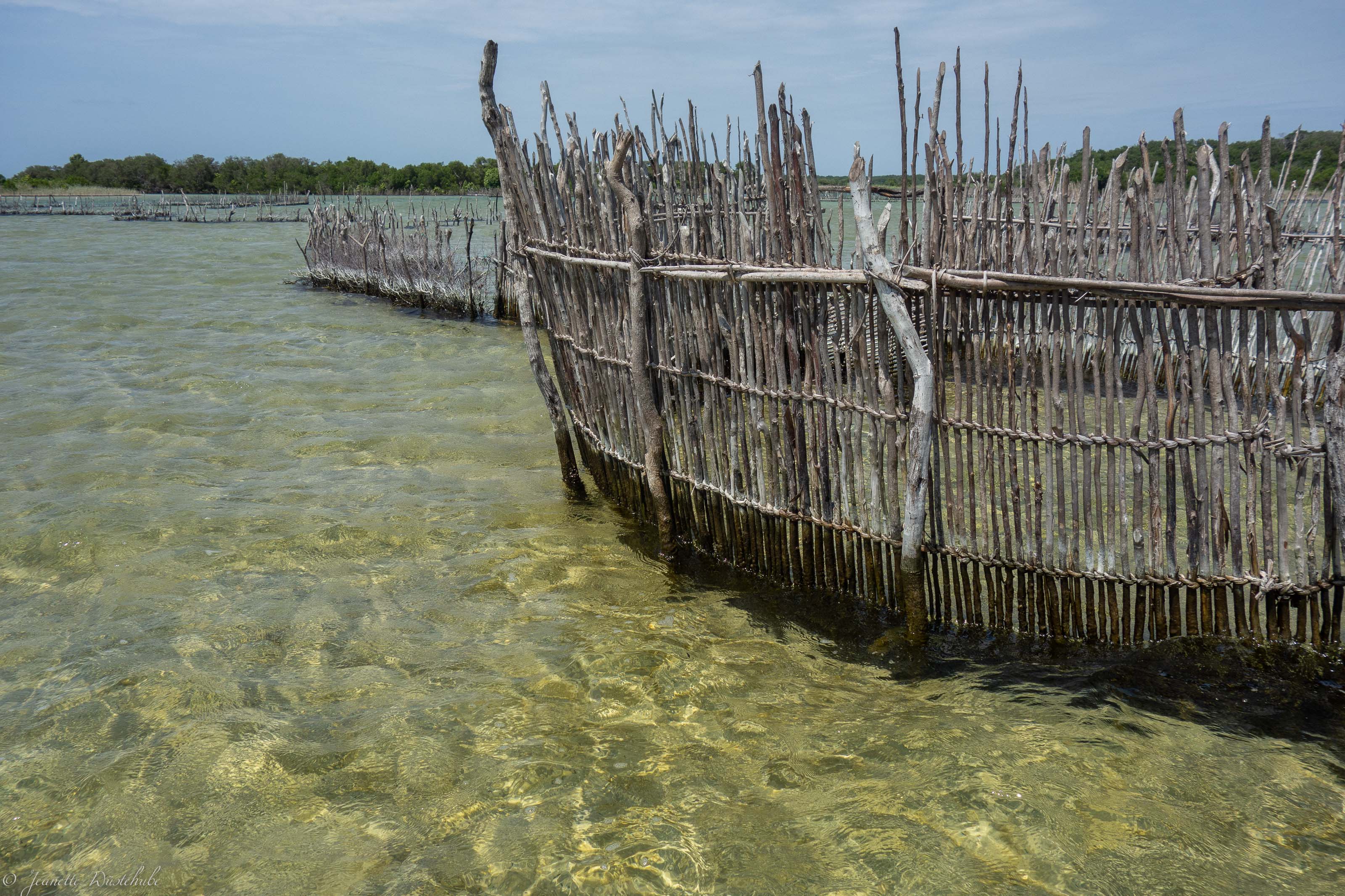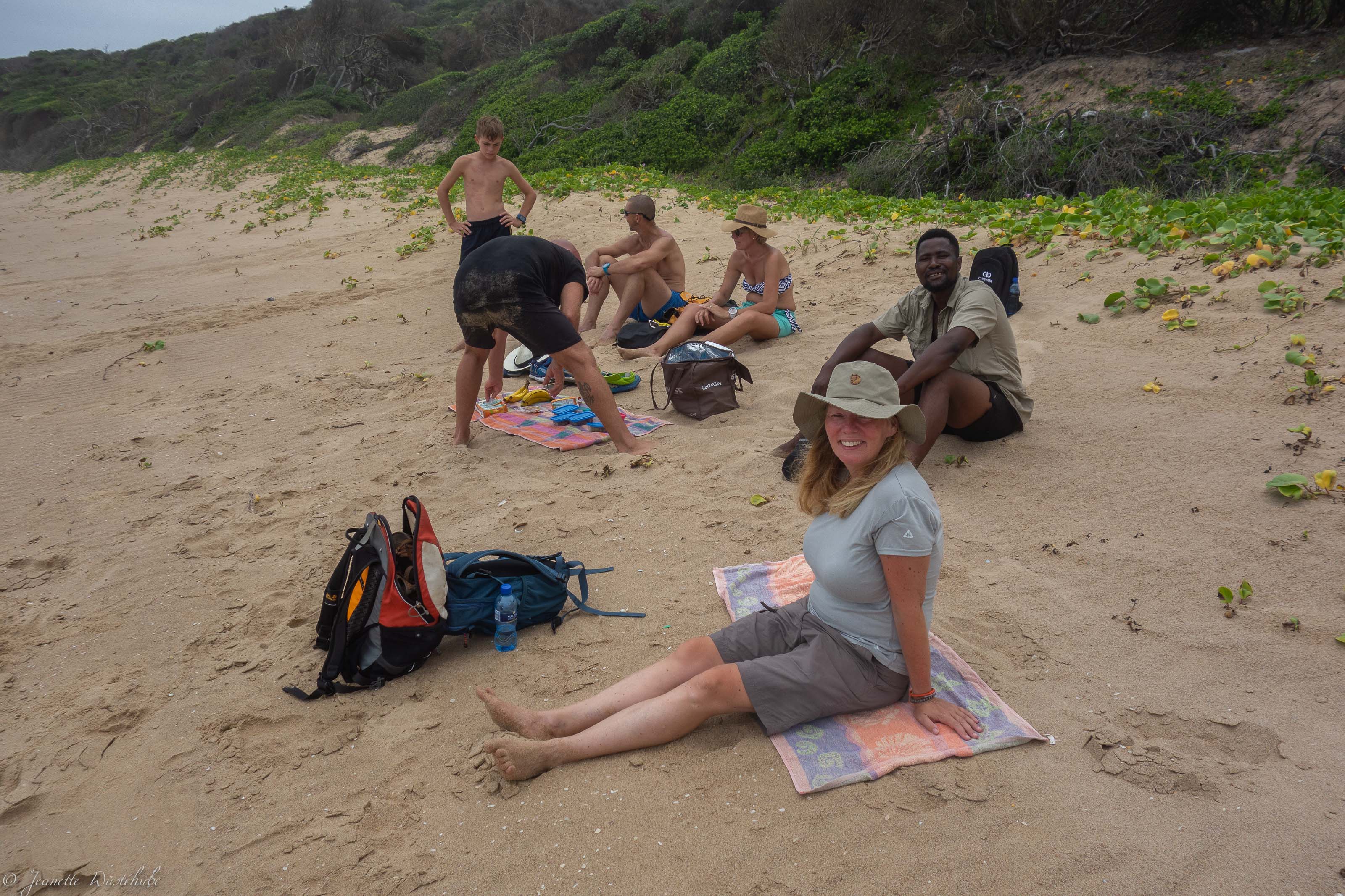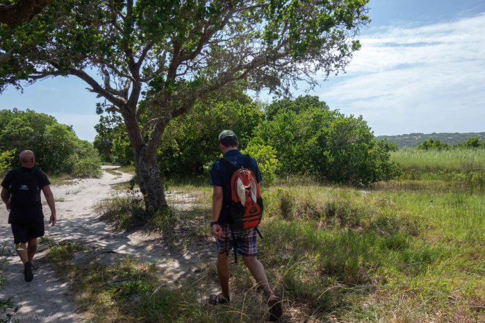 Wir gingen den gleichen Weg wie am Vortag und durchquerten zu Fuß den See mit den Fishing-Kraals. Dann bestiegen wir die Düne, die auch ins Dorf von Raymond und Patrick führte, bogen kurz davor aber links ab. Nach einer Weile ging es dann schließlich auf der anderen Seite durch die dicht bewachsenen Dünen wieder hinunter und wir erreichten schließlich den Indischen Ozean. Keine Menschenseele war weit und breit zu sehen! Trotz des bewölkten Himmels war es ein wunderschöner Anblick. Wir liefen und liefen den kilometerlangen, menschenleeren Strand entlang. Immer wieder sahen wir Spuren, die Schildkröten hinterlassen hatten, die in der Nacht an Land gekrochen und waren und ihre Eier weiter oben an den Dünen abgelegt hatten. Schildkörten sahen wir keine.