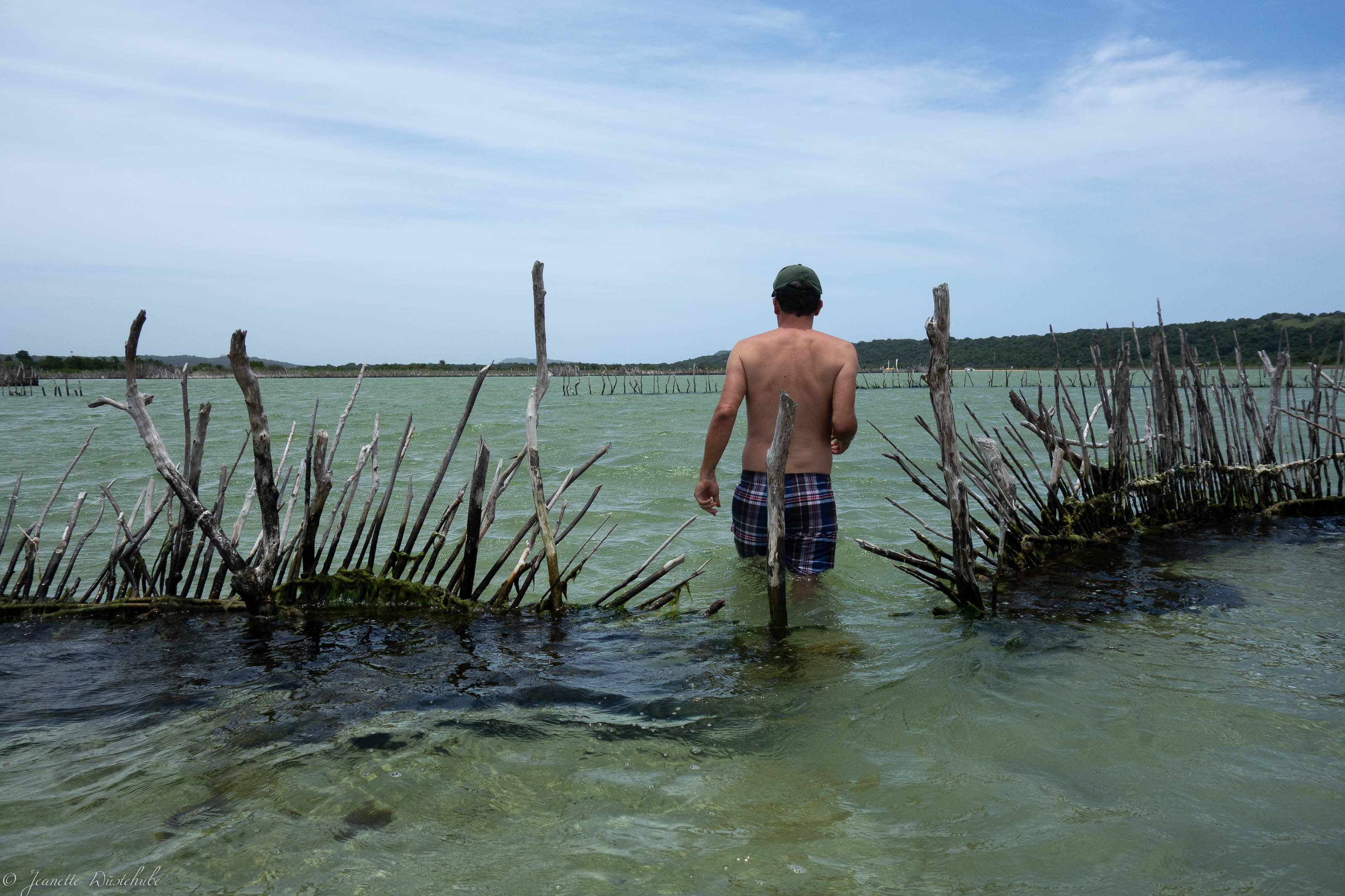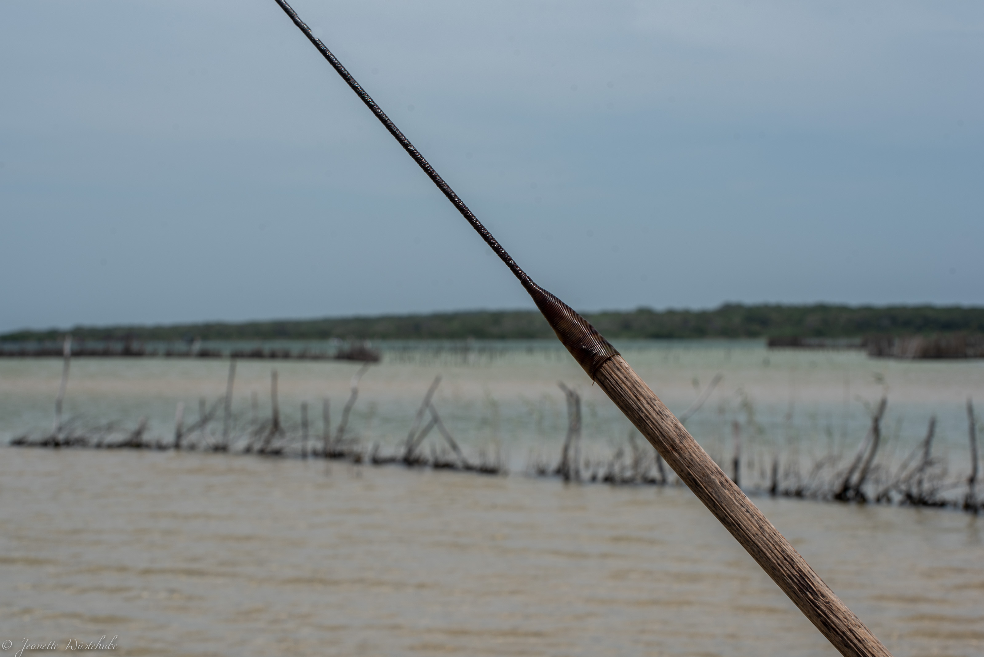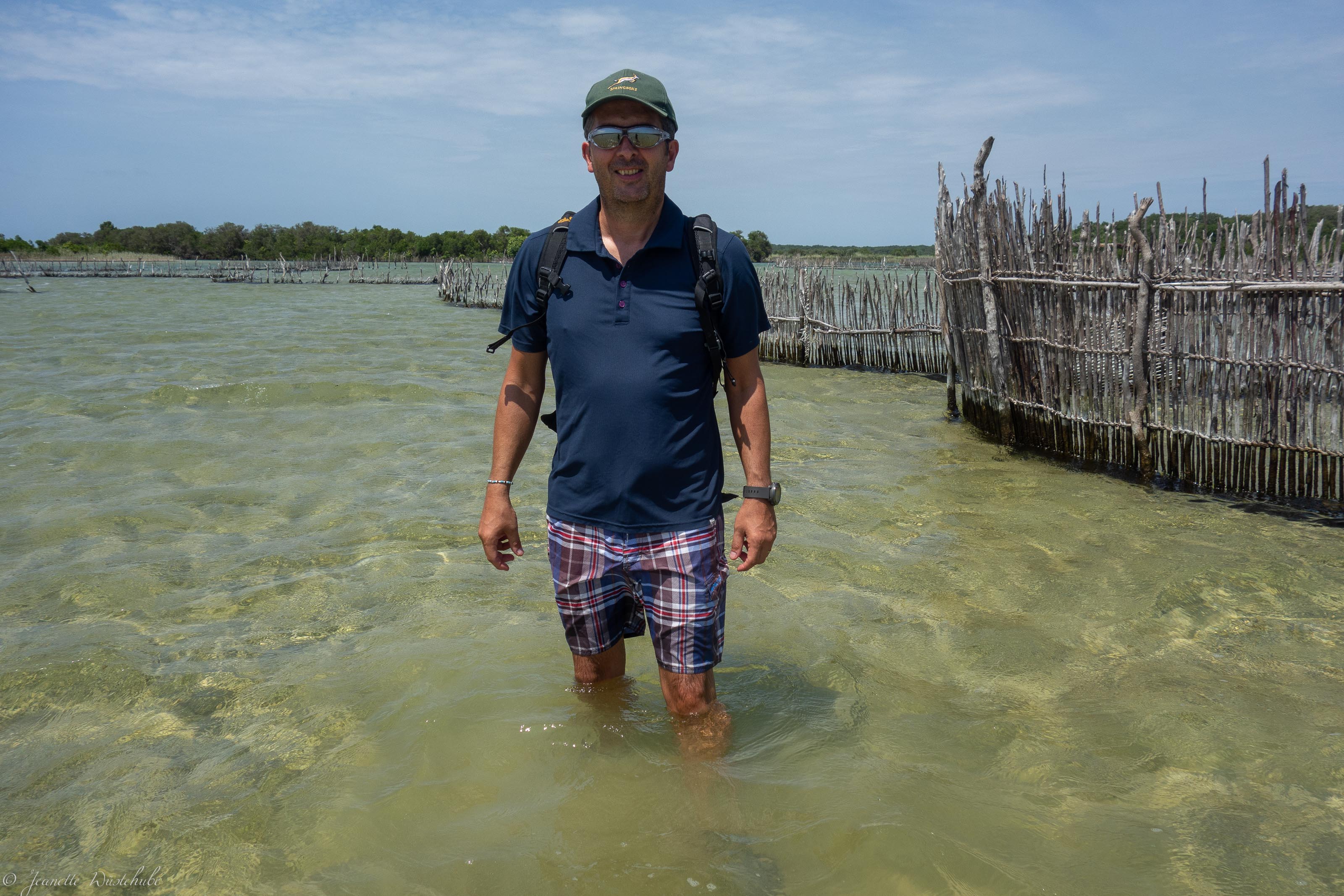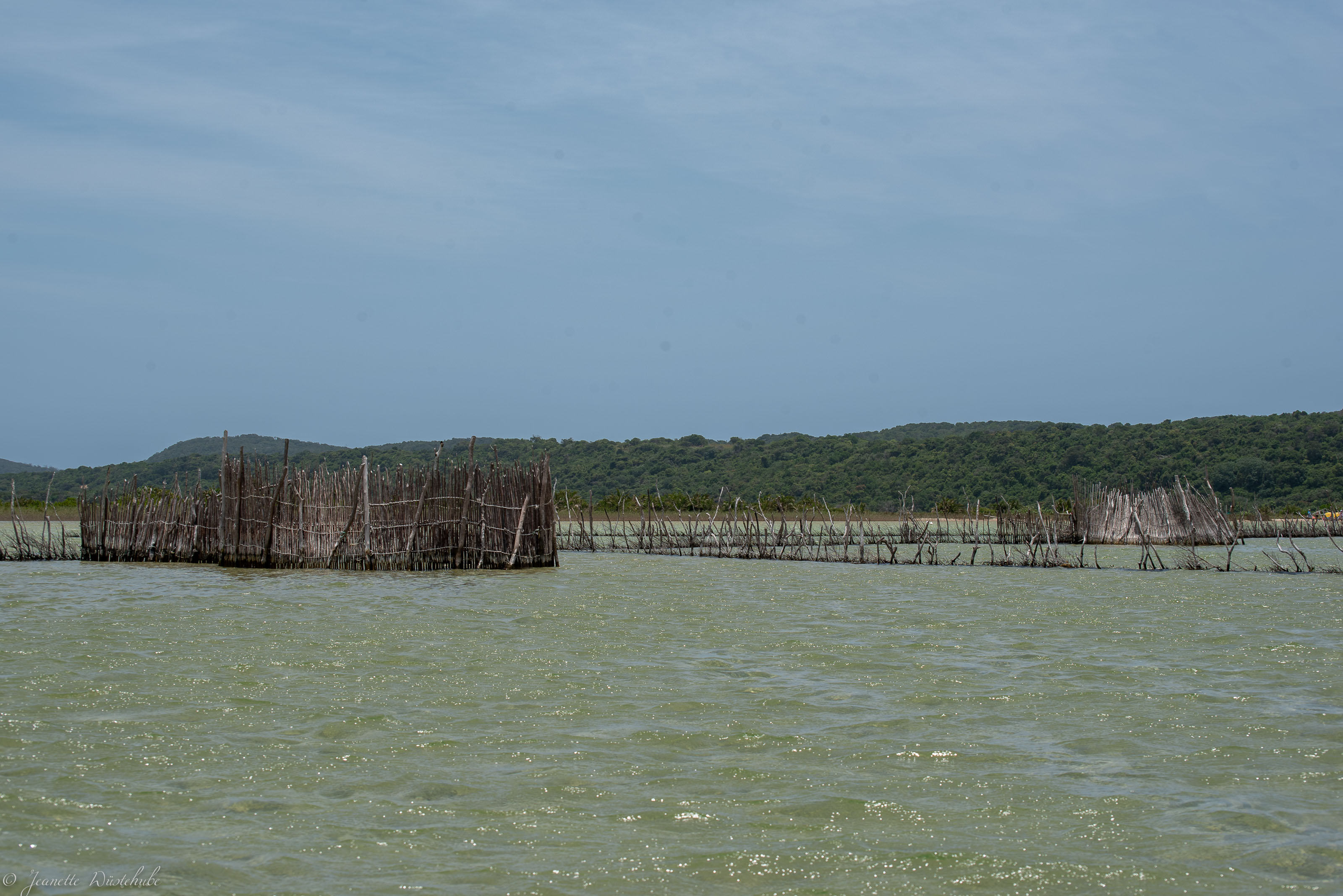 Alles in der Lodge hat der Eigentümer Bill selbst entworfen und gebaut oder bauen lassen. Es gibt hier keine Bauvorschriften oder -verordnungen. Die Lodge hat aktuell nur zwei Zimmer, von denen eines Platz hat für vier Personen. Das Häuschen hatte eine Außenbadewanne und Außendusche und Rundumblick in den Regenwald. Wir ruhten uns aus und setzten uns dann mit Trevor zusammen, der für die Chinderera Lodge die Ausflüge organisiert, die man dazu buchen kann. Wir buchten zwei Ausflüge, eine zu den Seen, um mehr über die traditionelle Fischfangmethode der Thonga zu erfahren und einen zu den Meeresschildkröten. Trevor entpuppte sich als enthusiastischer Naturschützer und erklärte uns, dass er die Ausflüge nachts zu den Schildkröten nicht mehr mache, weil dort so viele Menschen wären und das zu stressig sei für die Tiere. Ich konnte das nachvollziehen, auch wenn das bedeutete, dass die Chance bei unserem Ganztagesausflug auf die Tiere zu treffen, deutlich geringer wäre als nachts. Eigentlich kommen die Schildkröten fast nur nachts zur Eiablage an Land, Trevor meinte aber wir hätten trotzdem eine gute Chance sie zu sehen. In der ersten Nacht waren wir die einzigen Gäste. Das Menü, das abends serviert wurde, war afrikanisch angehaucht und schmeckte toll. Wir erfuhren später von Bill, dass er und seine Frau Pam früher ein Restaurant in der Nähe von Durban geführt hatten. Das merkte man. Bill war ein interessanter Gesprächspartner. Ein Mann, der lange in Simbabwe gelebt hatte zu einer Zeit, als die Vic Falls noch frei zugänglich waren und es kaum Touristen in Simbabwe gab. Wir unterhielten uns über das Gesundheitssystem, die Arbeitslosigkeit, die er höher einschätzt als die offiziellen 30 %, über seine Pläne, die Lodge um zwei Campingplätze zu erweitern und noch allerlei andere Dinge. Auch Trevor, der Guide, der wohl niemals Schuhe trägt, hatte einige Geschichten auf Lager. Trevor hat auch ein umfangreiches Wissen zu Kosi Bay und der dortigen Flora und Fauna, wie wir bei unserem ersten Ausflug erfahren durften. Seine Touren werden in Zusammenarbeit mit der Lodge und der Gemeinde angeboten. So profitieren alle Parteien davon. Trevor hat einige lokale Guides aus der Gemeinde rekrutiert, die er als Guides ausbildet und die er versucht in Sachen Umweltschutz weiterzubringen und ihnen bewusst zu machen, dass sie das in Jahrhunderten angeeignete Wissen nicht verlieren dürfen. Auch wenn die Thonga vielleicht heute meist nicht mehr so fischen wie noch vor 300 Jahren, ist es doch etwas, was zu deren Kultur gehört und das erhalten werden sollte. Zudem kann es als Einnahmequelle dienen, wenn man Touristen zeigen kann, wie früher der Fischfang funktionierte. Er hat uns viel zu den Heilkräften der Pflanzen erzählt. Z. B. gibt es den Sickle Bush, der auch „Bushdoctor“genannt wird. Er kann bei bronchialen Infekten helfen, bei Zahn- oder Kopfschmerzen und auch bei Spinnen- oder Schlangenbissen. Wird man gebissen, soll man die Blätter andrücken und auf die Bissstelle drücken. Dann wird das Gift herausgesaugt (so zumindest die Theorie :-)). Trevor meinte, dass der Chief der Region sehr krank gewesen sein muss und fast gestorben wäre. Mit Hilfe des Sickle Bushs wäre er wieder gesund geworden und hatte nicht mal gewusst, dass der Busch diese Wirkung hat. Wie bei uns geraten diese Dinge in Vergessenheit, wenn sie nicht von einer Generation an die nächste weitergegeben werden. Ich habe auch wenig Ahnung davon, was unsere Pflanzen alles so können. Wir sprachen Trevor darauf an, warum die Einheimischen hier häufig ihren Müll einfach in die Natur werfen und er hatte mit seinem Guide Patrick und dessen Bruder auch öfter darüber gesprochen. Diese haben wohl das Verständnis, dass der Müll sich einfach „auflöst“und damit keine Gefahr ist für die Natur. Dass teilweise Jahrtausende vergehen, bis bestimmte Dinge zersetzt sind, ist den Menschen nicht bewusst. Das Bewusstsein muss erst geschaffen werden.