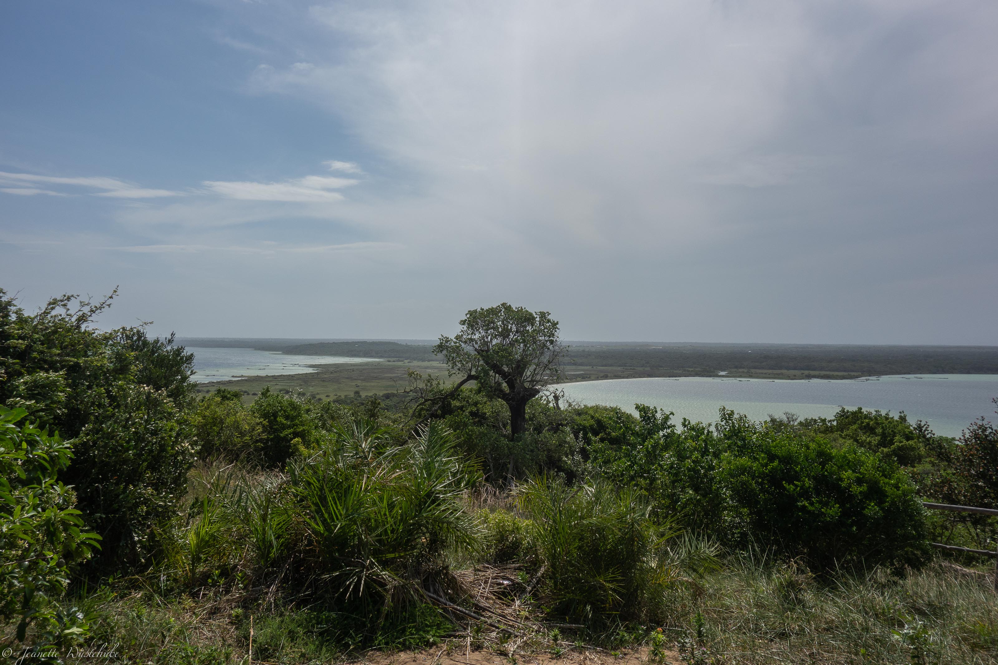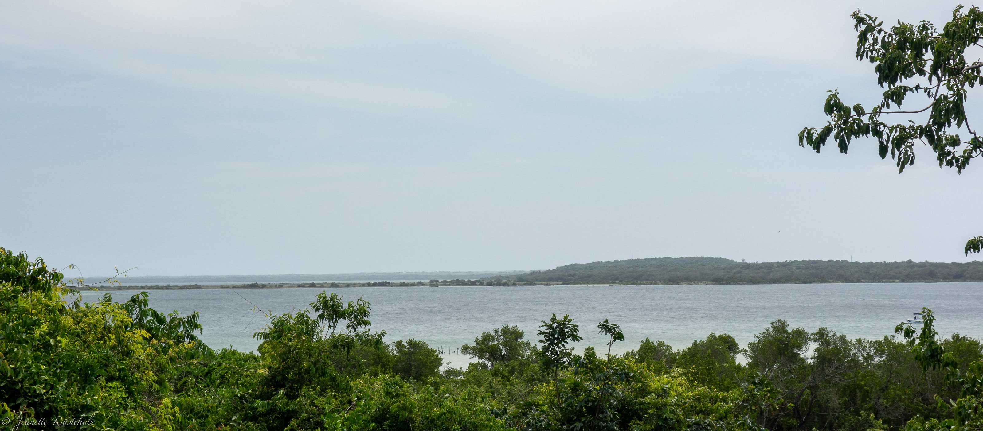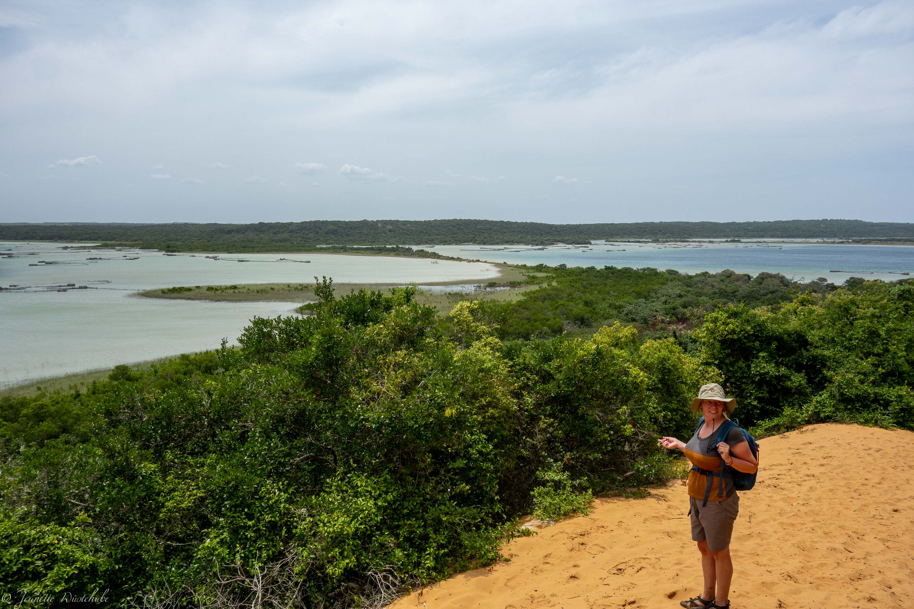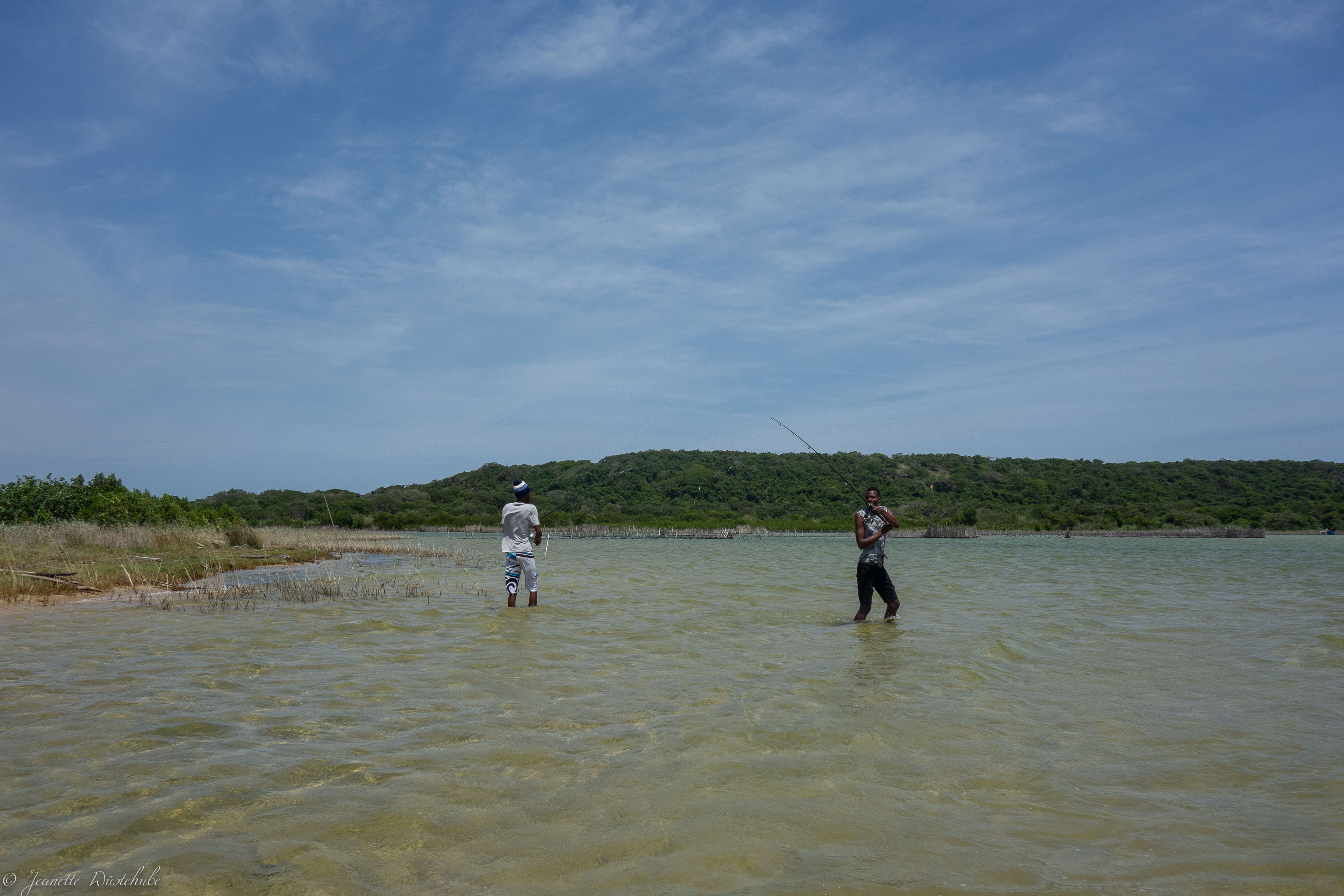 Die Zäune halten auch nur ungefähr ein Jahr und sind den Witterungen und Stürmen ausgeliefert, so dass immer etwas ausgebessert werden muss. Raymond lief mit den Kingfishs für unser Lunch in sein Dorf. Seine Frau und seine Tochter würden diesen für uns zubereiten. Wir gingen mit seinem Bruder Patrick langsam hinterher. Es ging die bewachsenen Dünen hinauf, was sehr anstrengend war, von wo man aber einen schönen Blick auf das Seen-System hatte und wir waren ausgehungert, als wir endlich in Patricks Dorf ankamen. Wir durften kurz in die Töpfe spitzen, in denen auf offenem Feuer der Fisch und der Maisbrei und Weißkohl köchelten. Ein paar Minuten später war es dann soweit und Patrick entgrätete den Fisch für uns. Besonders der mit Curry angemachte Kohl war köstlich und ich fragte mich, warum bei uns nicht auch manchmal Maisbrei auf den Tisch kommt. Auch der Fisch schmeckte klasse und frischeren Fisch konnten wir nirgends bekommen 🙂 Nach dem Essen rief Patrick seine Nichte, damit diese den Tisch abräumen konnte. Er packte nicht mit an. Das ist Aufgabe der Frauen.