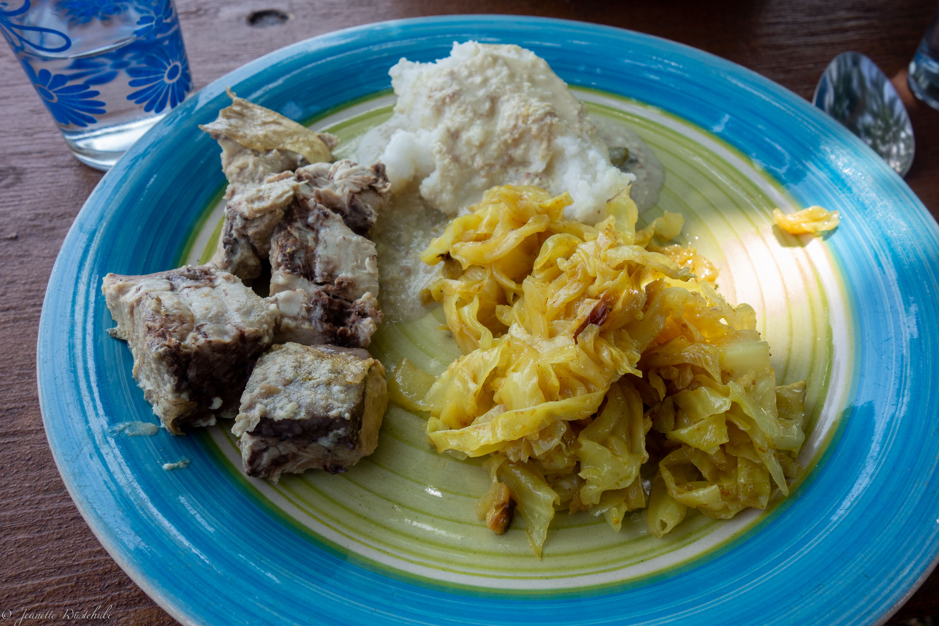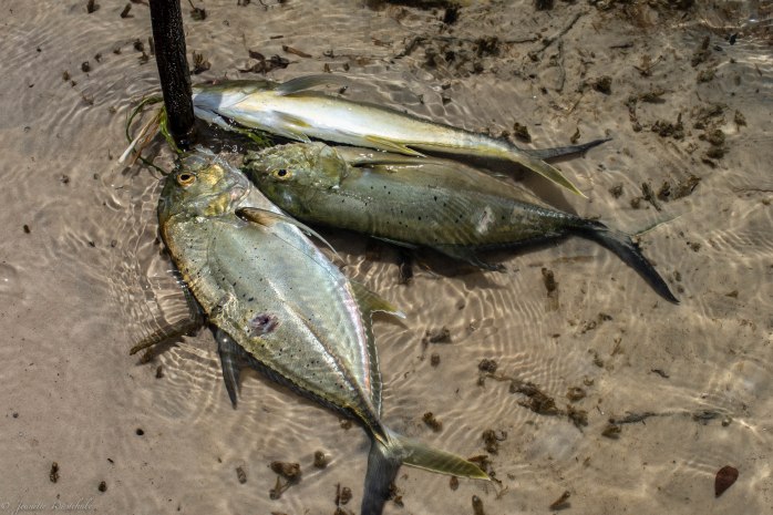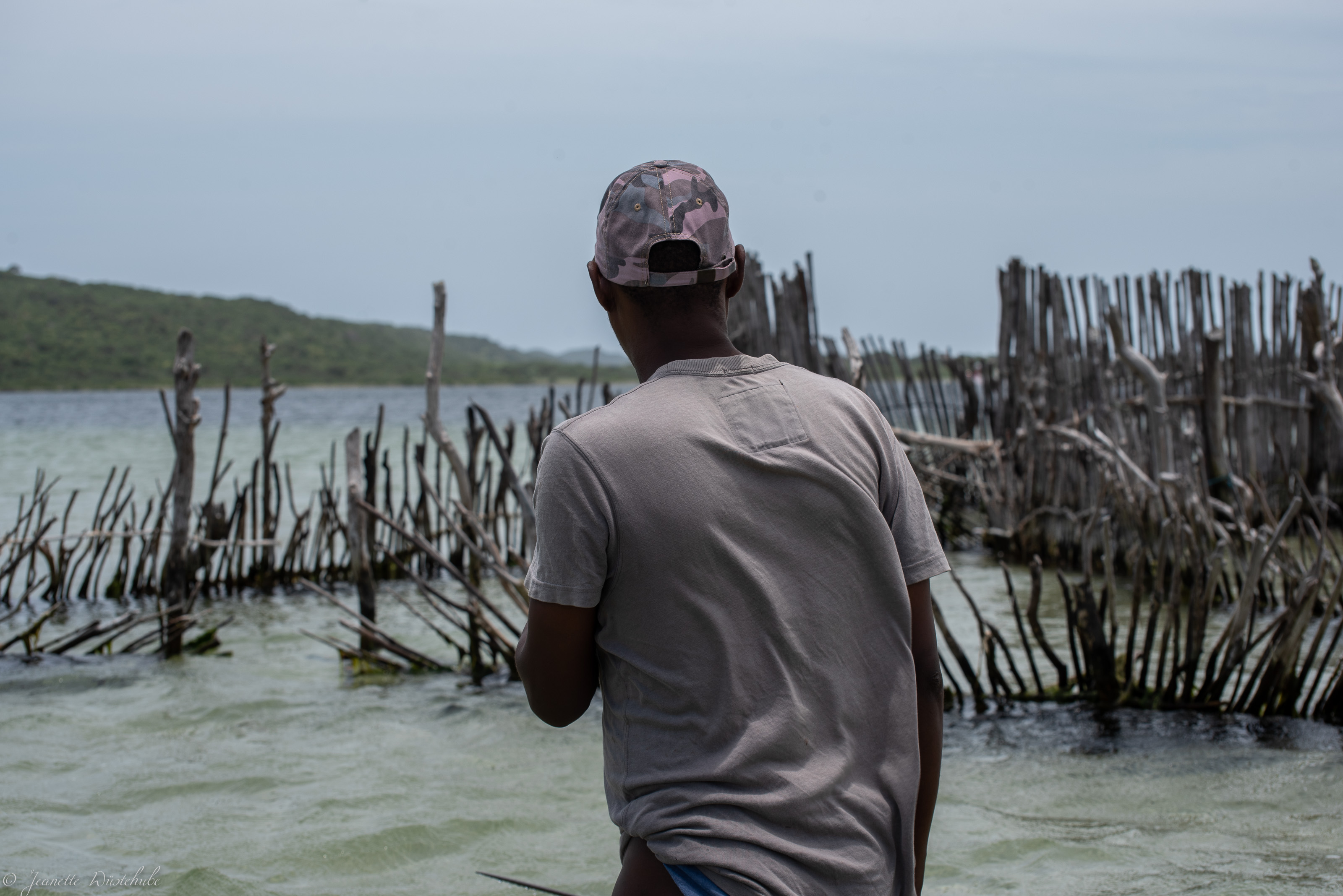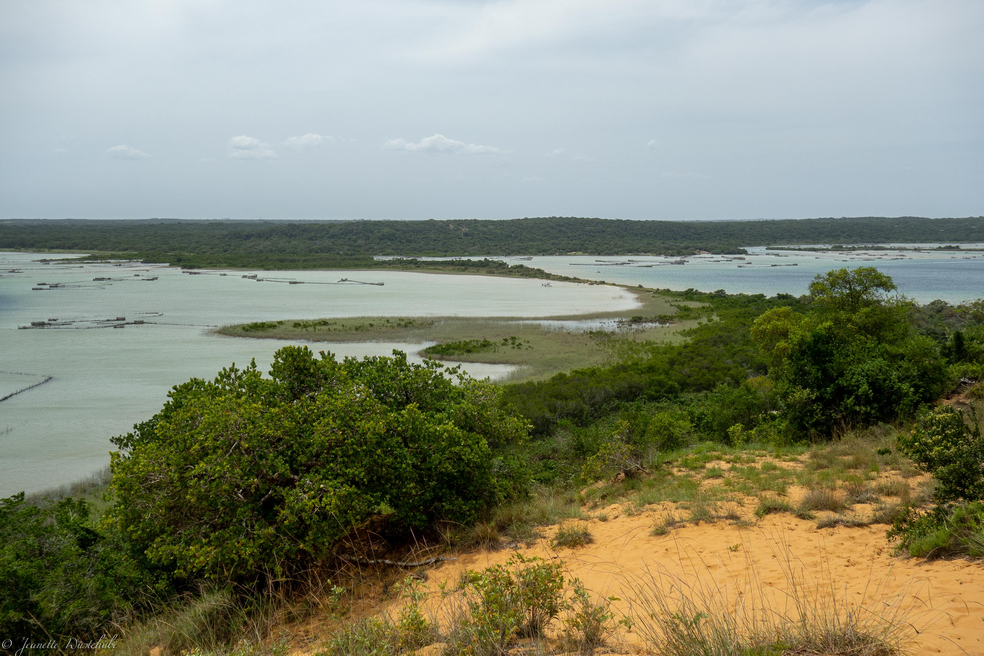 Die Zäune halten auch nur ungefähr ein Jahr und sind den Witterungen und Stürmen ausgeliefert, so dass immer etwas ausgebessert werden muss. Raymond lief mit den Kingfishs für unser Lunch in sein Dorf. Seine Frau und seine Tochter würden diesen für uns zubereiten. Wir gingen mit seinem Bruder Patrick langsam hinterher. Es ging die bewachsenen Dünen hinauf, was sehr anstrengend war, von wo man aber einen schönen Blick auf das Seen-System hatte und wir waren ausgehungert, als wir endlich in Patricks Dorf ankamen. Wir durften kurz in die Töpfe spitzen, in denen auf offenem Feuer der Fisch und der Maisbrei und Weißkohl köchelten. Ein paar Minuten später war es dann soweit und Patrick entgrätete den Fisch für uns. Besonders der mit Curry angemachte Kohl war köstlich und ich fragte mich, warum bei uns nicht auch manchmal Maisbrei auf den Tisch kommt. Auch der Fisch schmeckte klasse und frischeren Fisch konnten wir nirgends bekommen 🙂 Nach dem Essen rief Patrick seine Nichte, damit diese den Tisch abräumen konnte. Er packte nicht mit an. Das ist Aufgabe der Frauen.