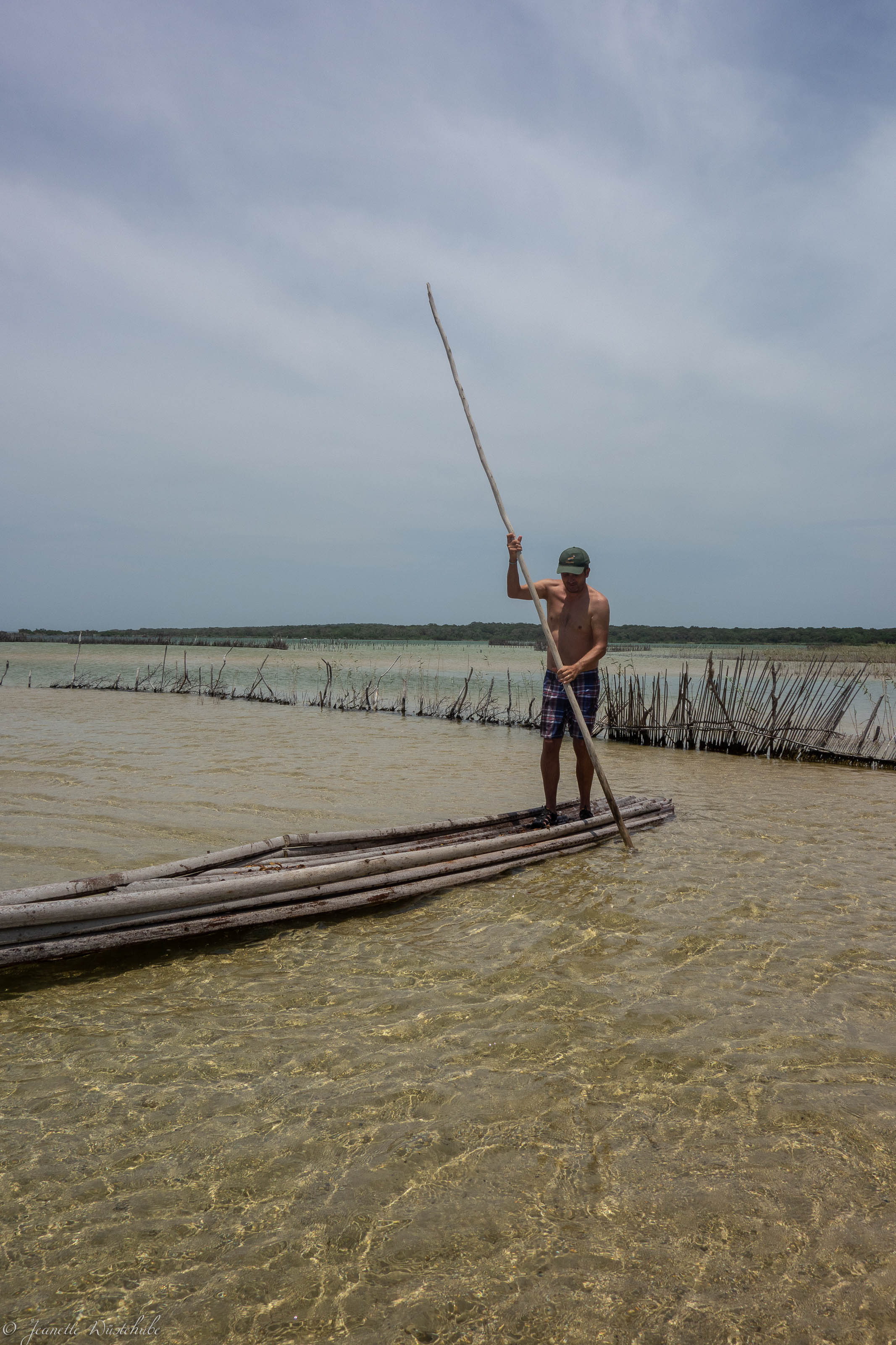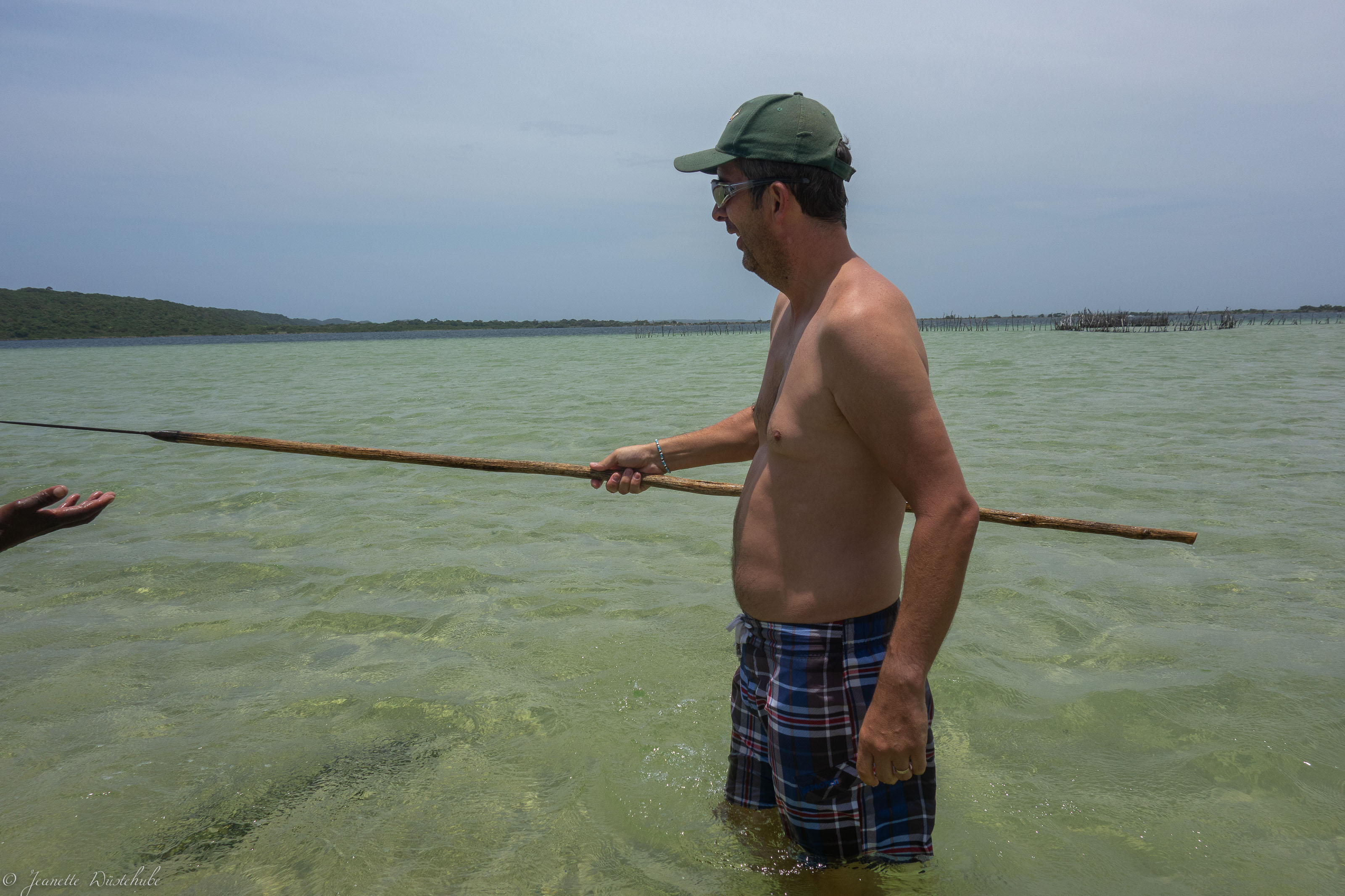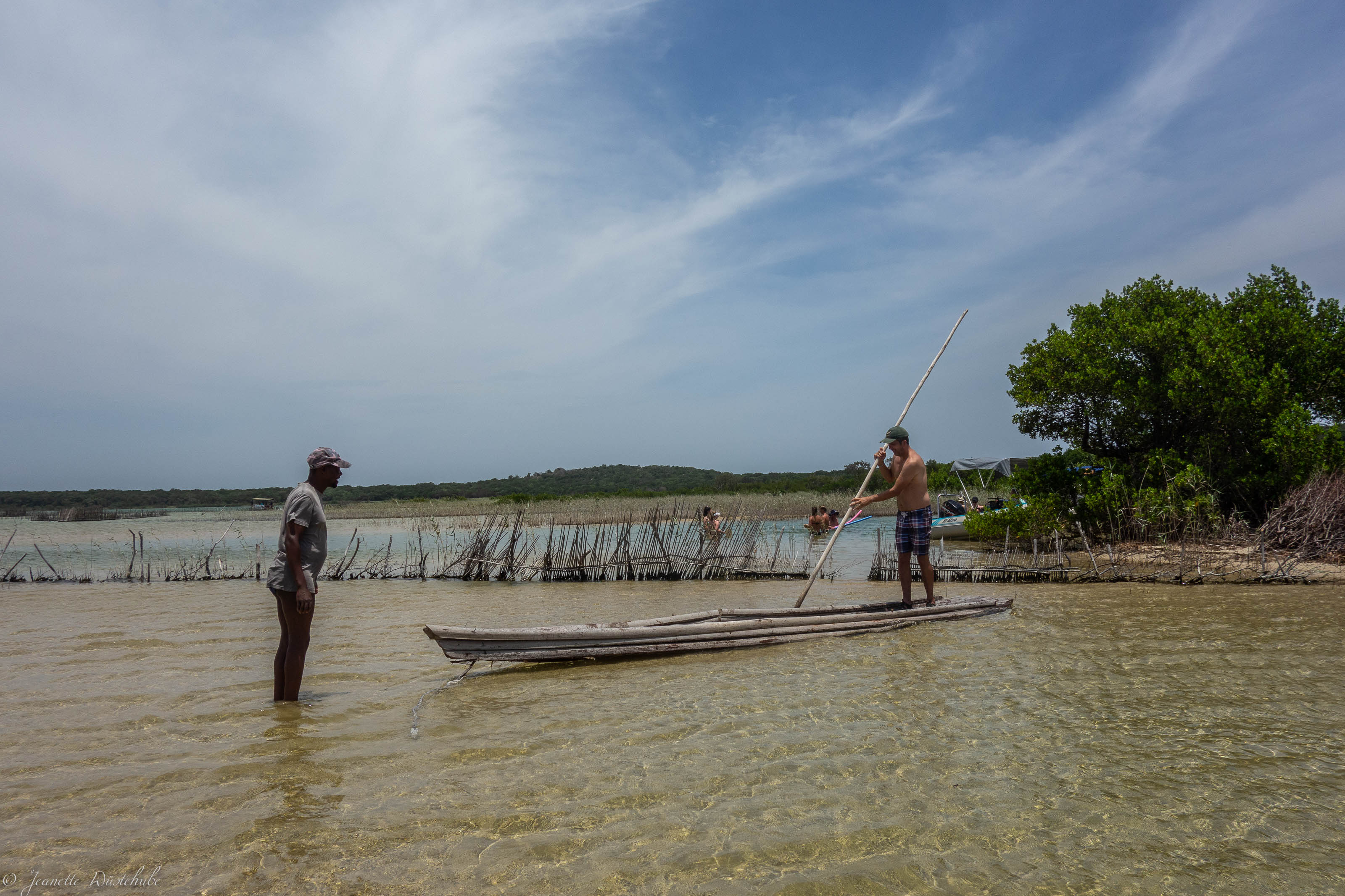 Dann zeigte er uns noch einen Busch, dessen Namen ich leider vergessen habe. Aus den Früchten der Pflanze wird Alkohol gebraut, der bei einer Polizei-Kontrolle im Atem nicht nachgewiesen werden kann. Wir aßen wilde Beeren und legten ein paar Kilometer zurück, bis wir am See ankamen. Dann wateten wir eine Weile durchs (bei mir) oberschenkeltiefe Wasser und kamen auf einer Insel an, wo wir auf Patrick und sein Bruder Raymond trafen. In herrlich klarem und super temperiertem Wasser durften wir dann erst mal eine Runde schnorcheln. Das Wasser in den Seen ist ein Süß-Salzwasser-Gemisch und wir sahen eine Reihe hübscher kleiner Fische. Tom bekam eine kurze Fahrt im traditionellen Palmboot und dann auch noch eine Einweisung in „SUP“.