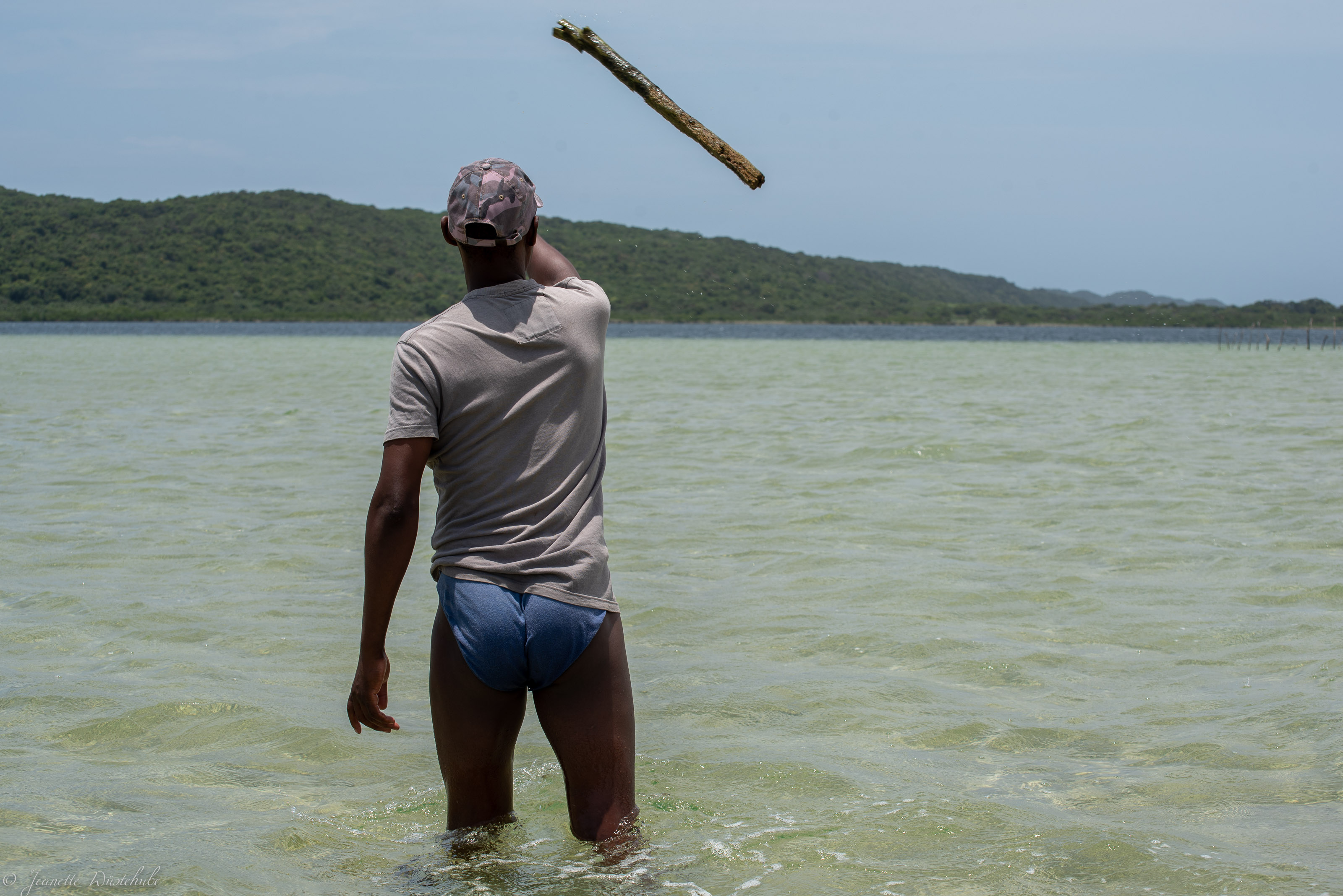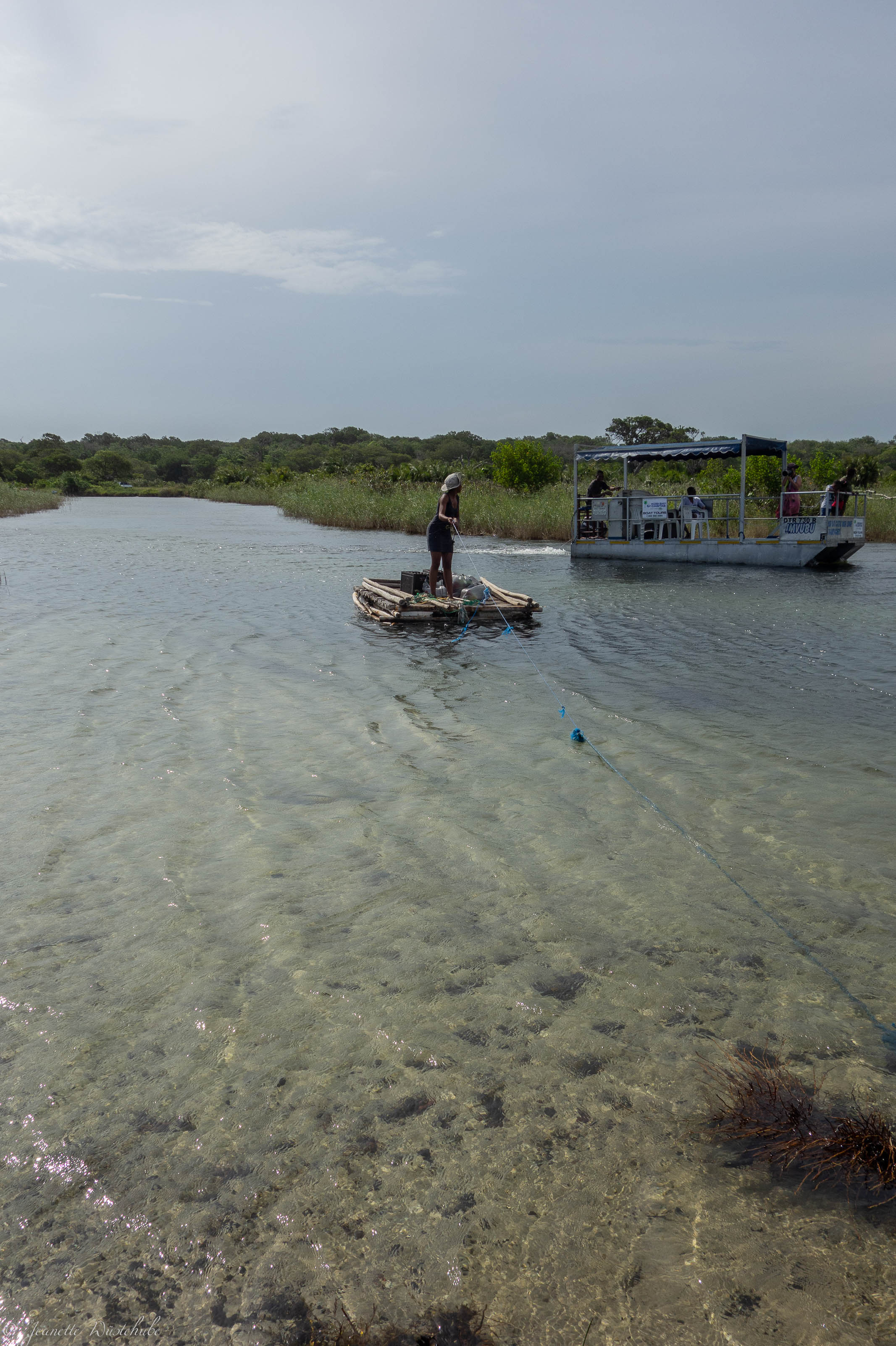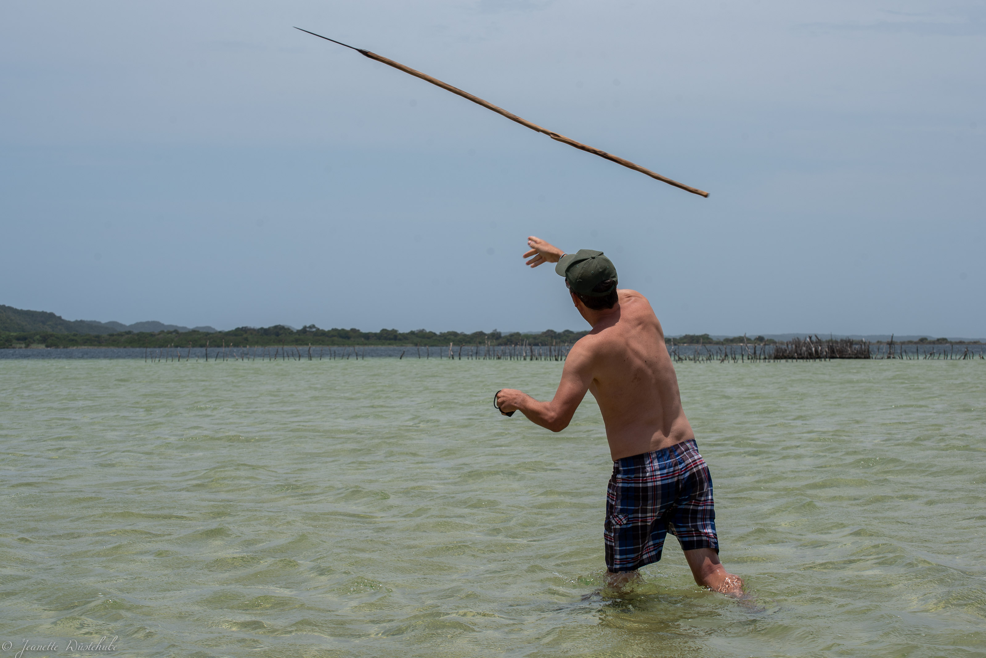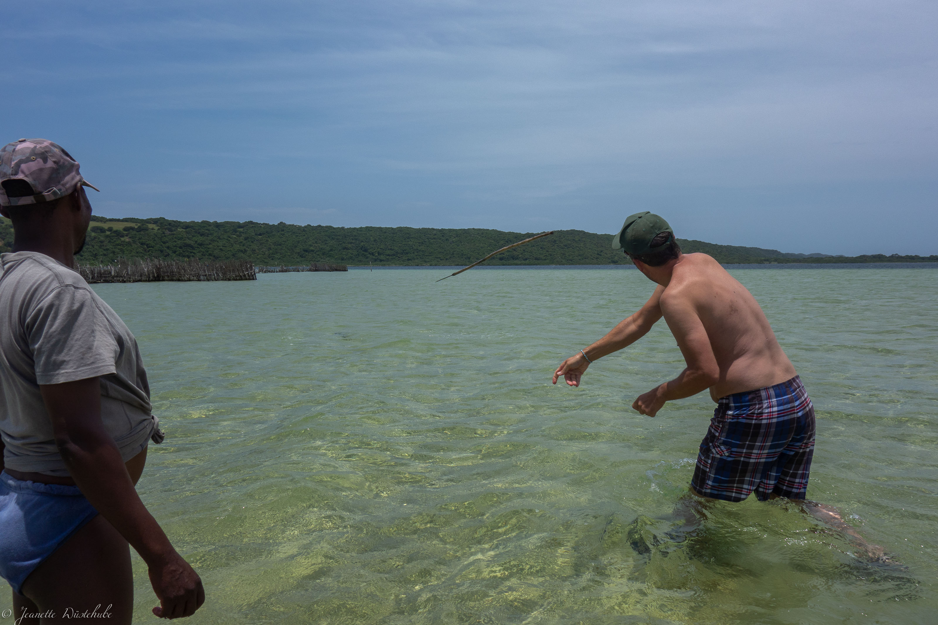Dann zeigte er uns noch einen Busch, dessen Namen ich leider vergessen habe. Aus den Früchten der Pflanze wird Alkohol gebraut, der bei einer Polizei-Kontrolle im Atem nicht nachgewiesen werden kann. Wir aßen wilde Beeren und legten ein paar Kilometer zurück, bis wir am See ankamen. Dann wateten wir eine Weile durchs (bei mir) oberschenkeltiefe Wasser und kamen auf einer Insel an, wo wir auf Patrick und sein Bruder Raymond trafen. In herrlich klarem und super temperiertem Wasser durften wir dann erst mal eine Runde schnorcheln. Das Wasser in den Seen ist ein Süß-Salzwasser-Gemisch und wir sahen eine Reihe hübscher kleiner Fische. Tom bekam eine kurze Fahrt im traditionellen Palmboot und dann auch noch eine Einweisung in „SUP“.