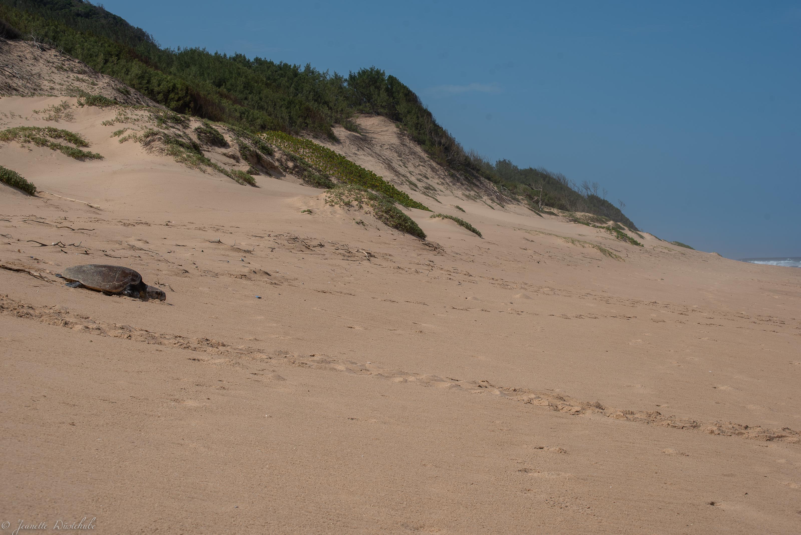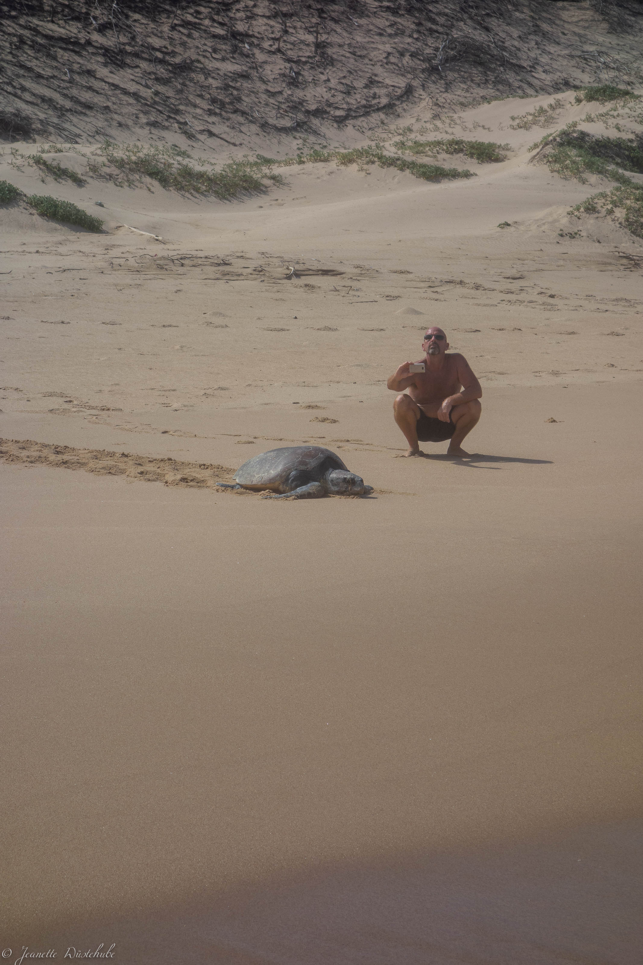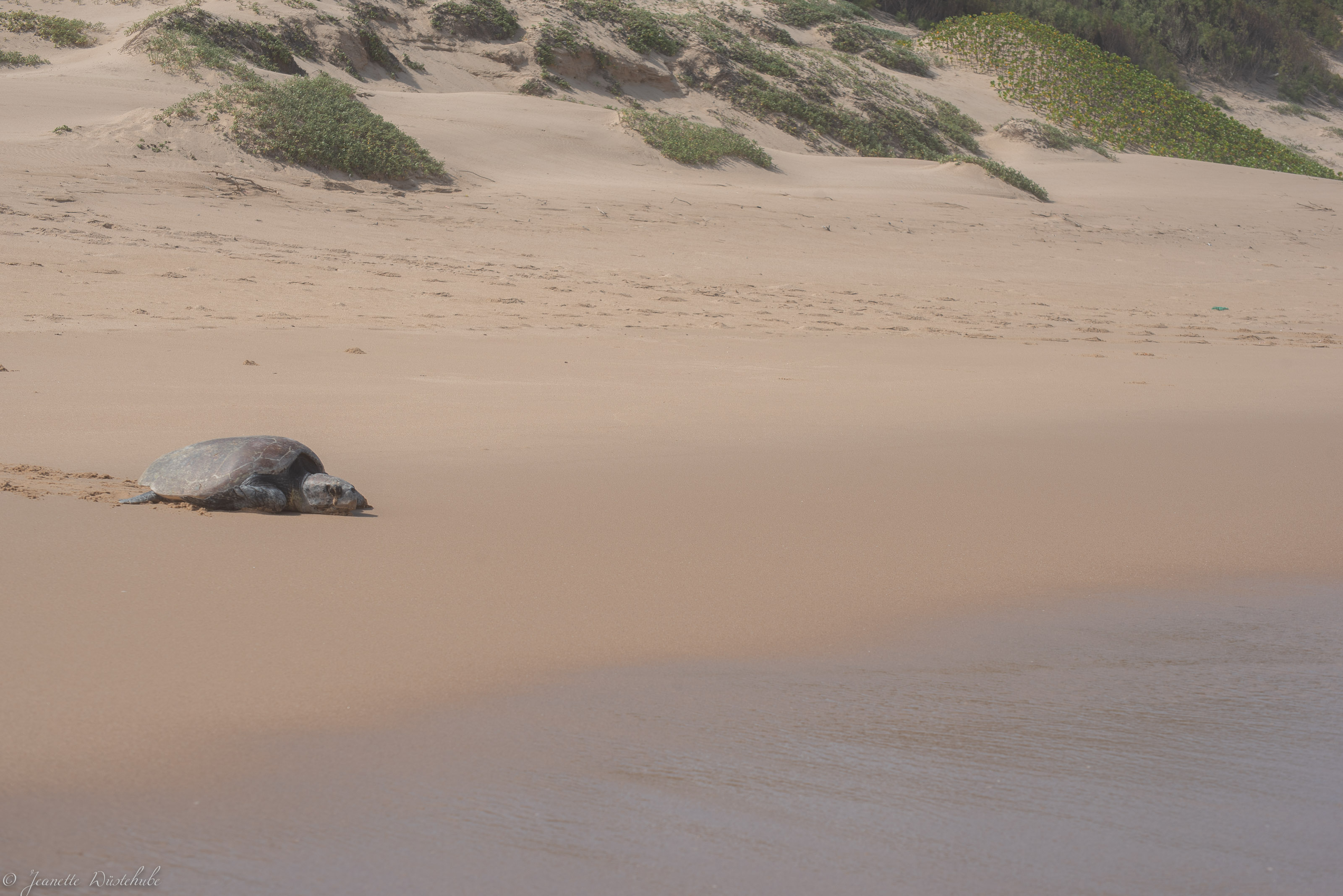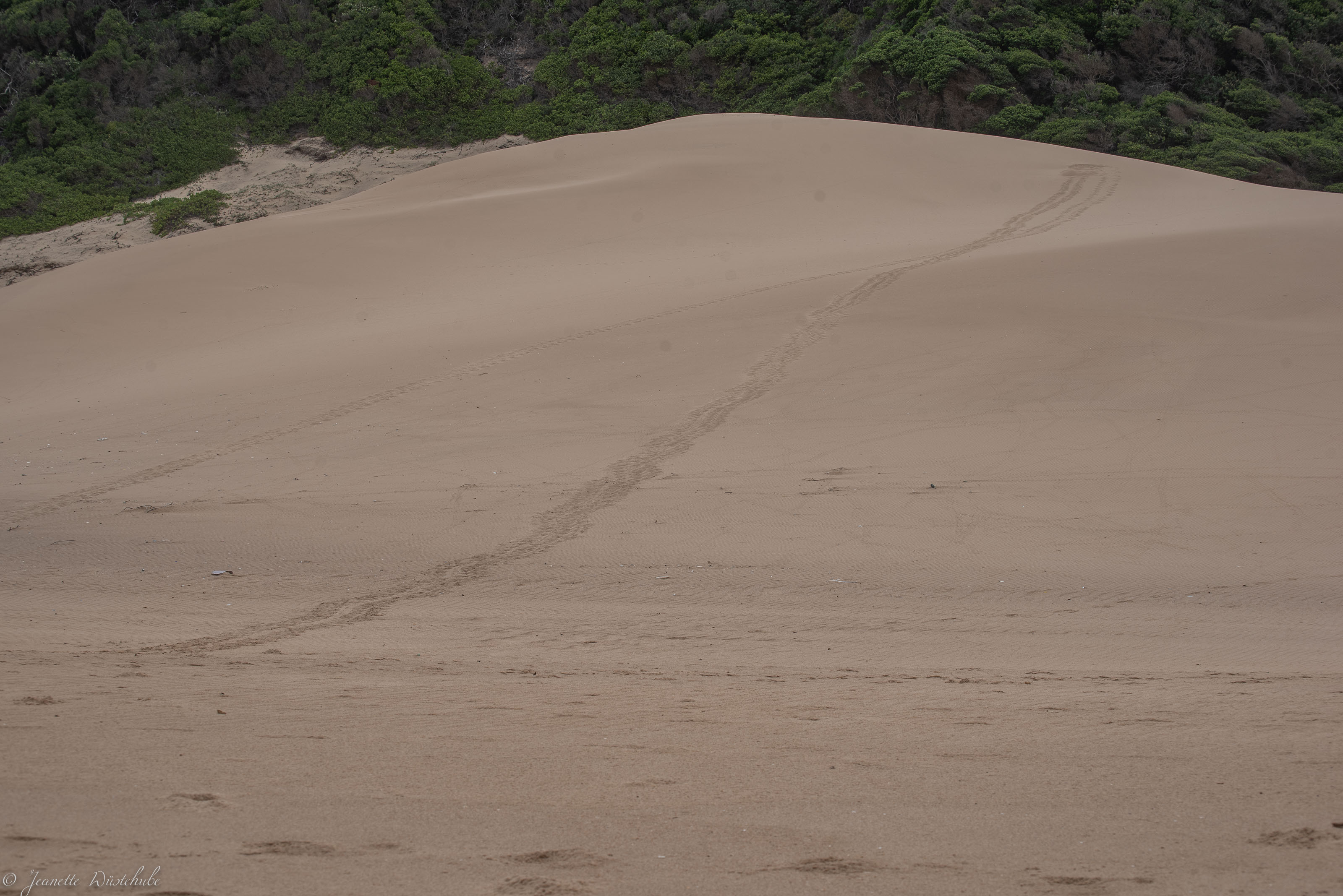 Er erklärte, dass er noch nie so viele Schildkrötenspuren gesehen hätte und war ganz begeistert. Wenn man bedenkt, dass vor einigen Jahren die Schildkrötenpopulation an den Stränden bei Kosi Bay fast ausgestorben war, ist das auch eine bemerkenswerte und positive Entwicklung. Nur eine von 1.000 geschlüpften Schildkröten überlebt so lange, um selbst an den Strand, an dem sie geschlüpft ist, zurückzukehren und eigene Eier zu legen. Die Tiere sind von der ersten Sekunde an auf sich gestellt. Kein Elternteil ist da, um sich zu Kümmern. Am Strand warteten bereits hunderte Krabben auf den frisch geschlüpften Nachwuchs. Während einige der Meeresschildkröten noch zur Eiablage kamen, waren einige Nester schon vor Wochen gelegt worden und die Babys waren kurz vor dem Schlüpfen. Also warteten Krabben, Vögel und Echsen schon gierig darauf.