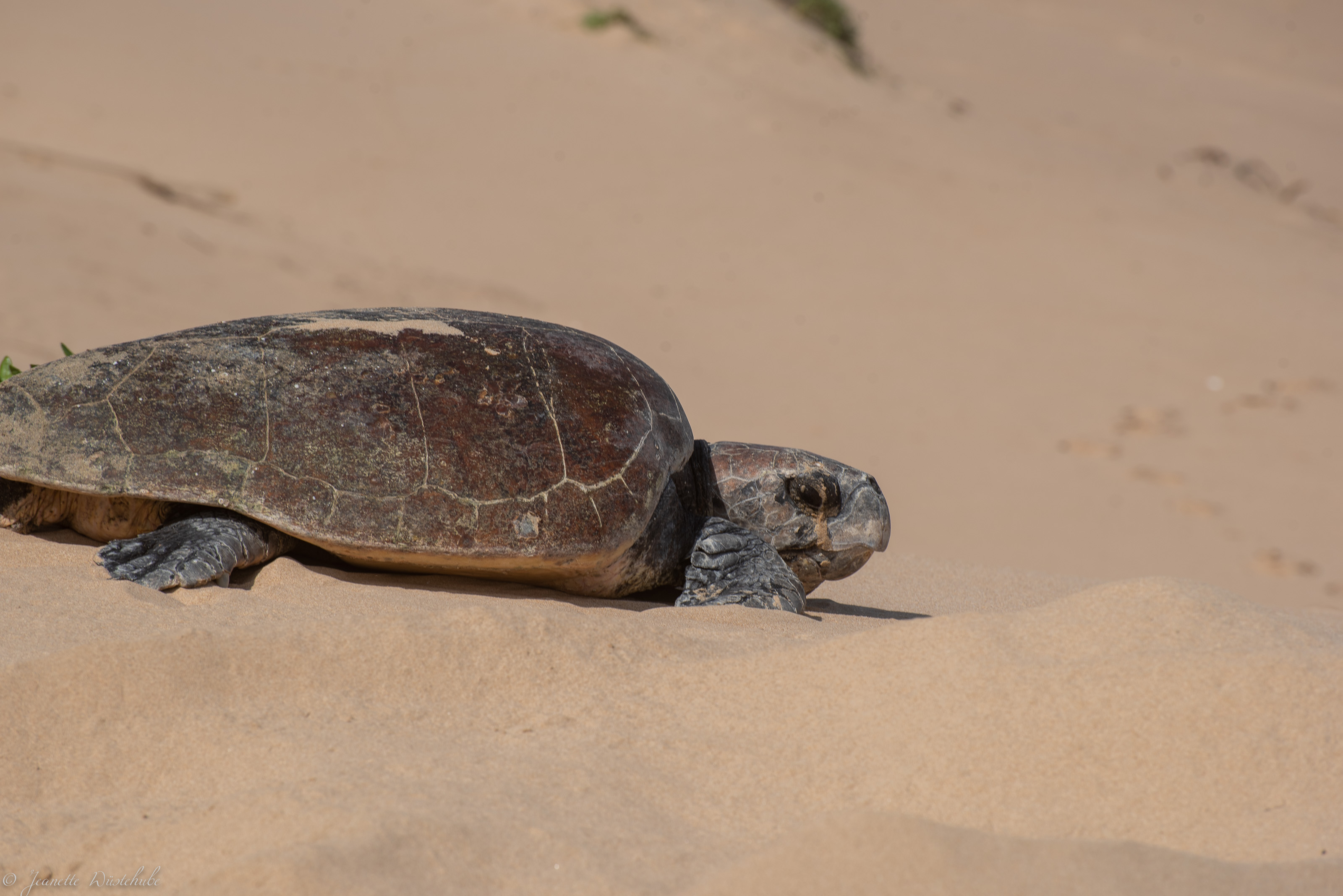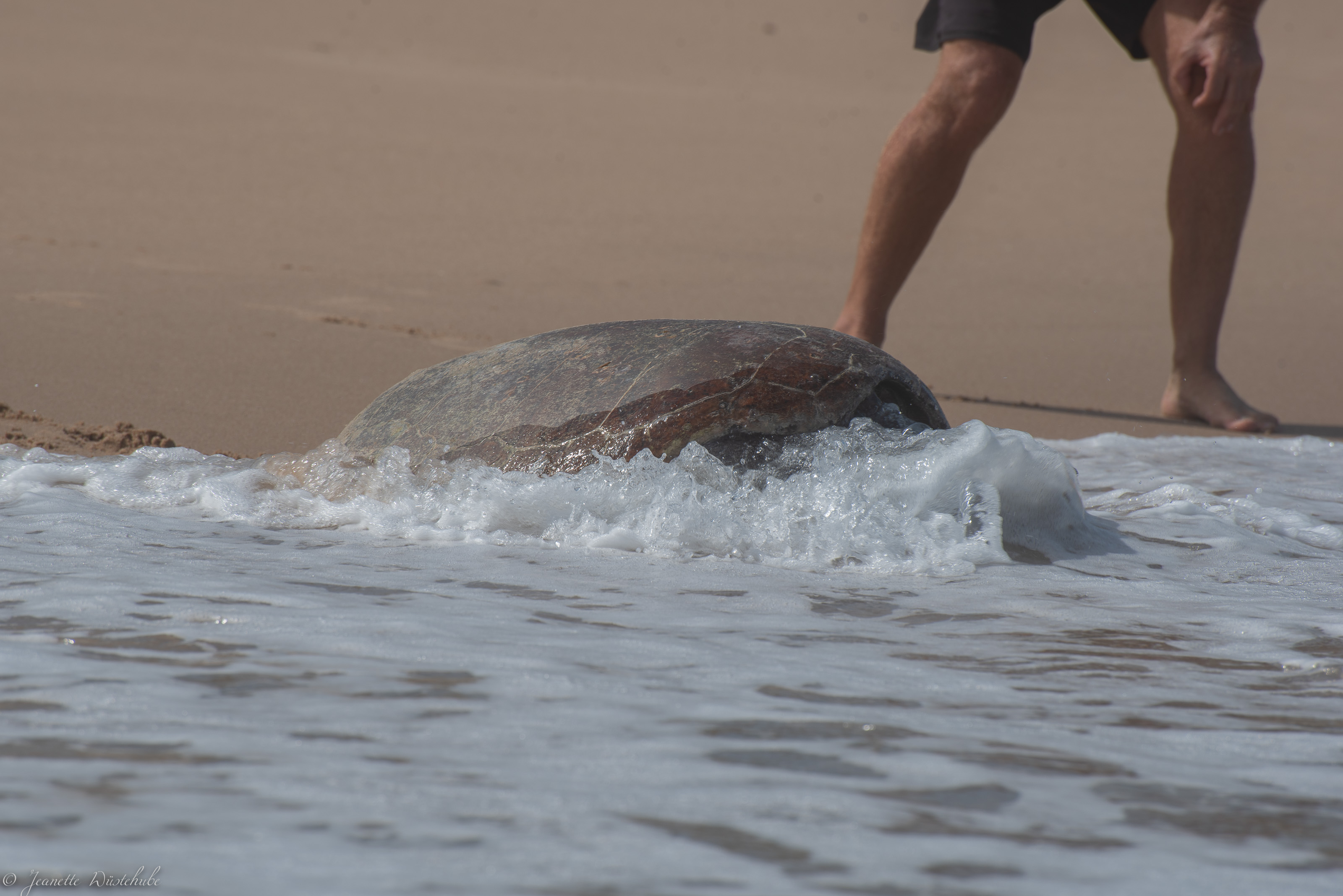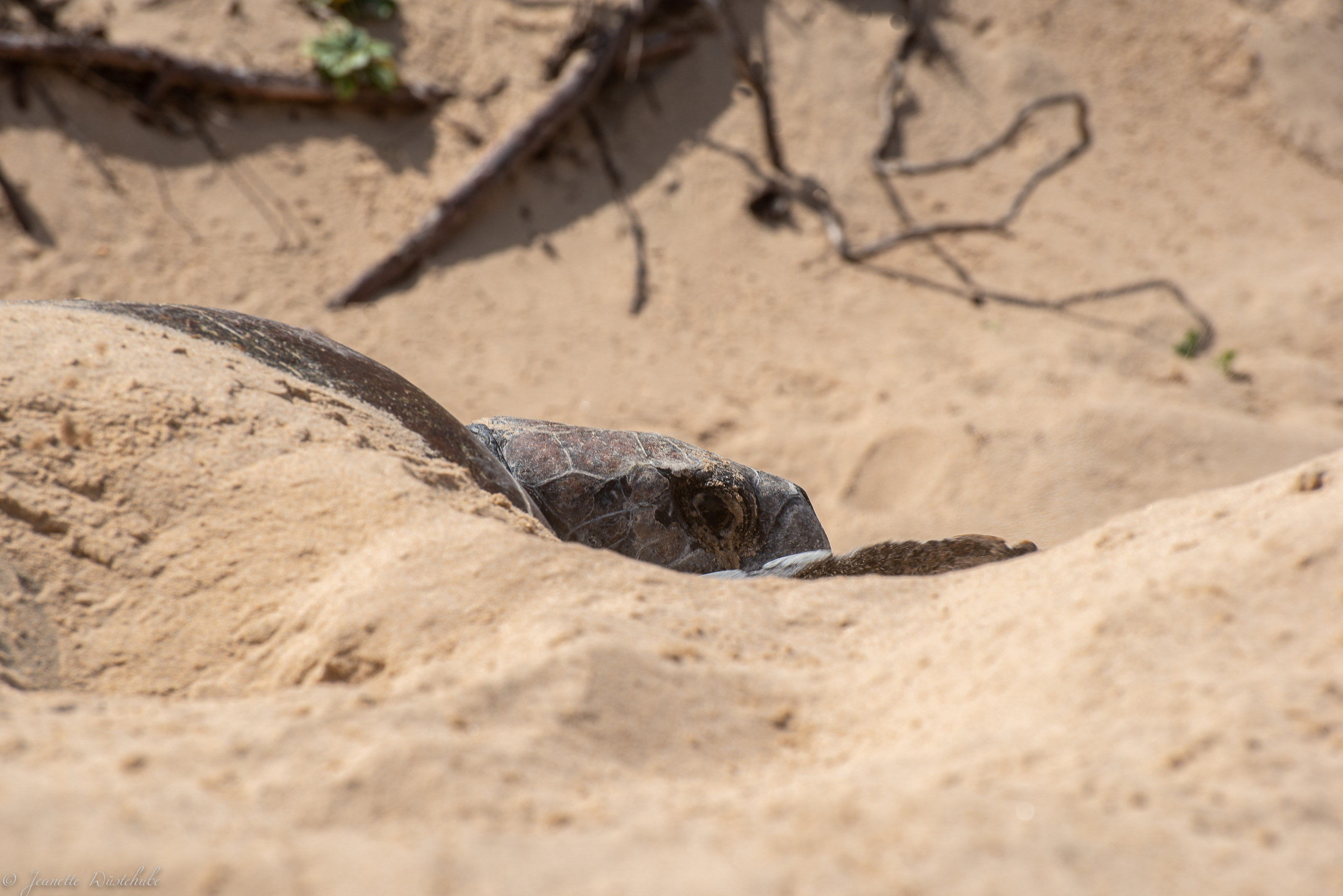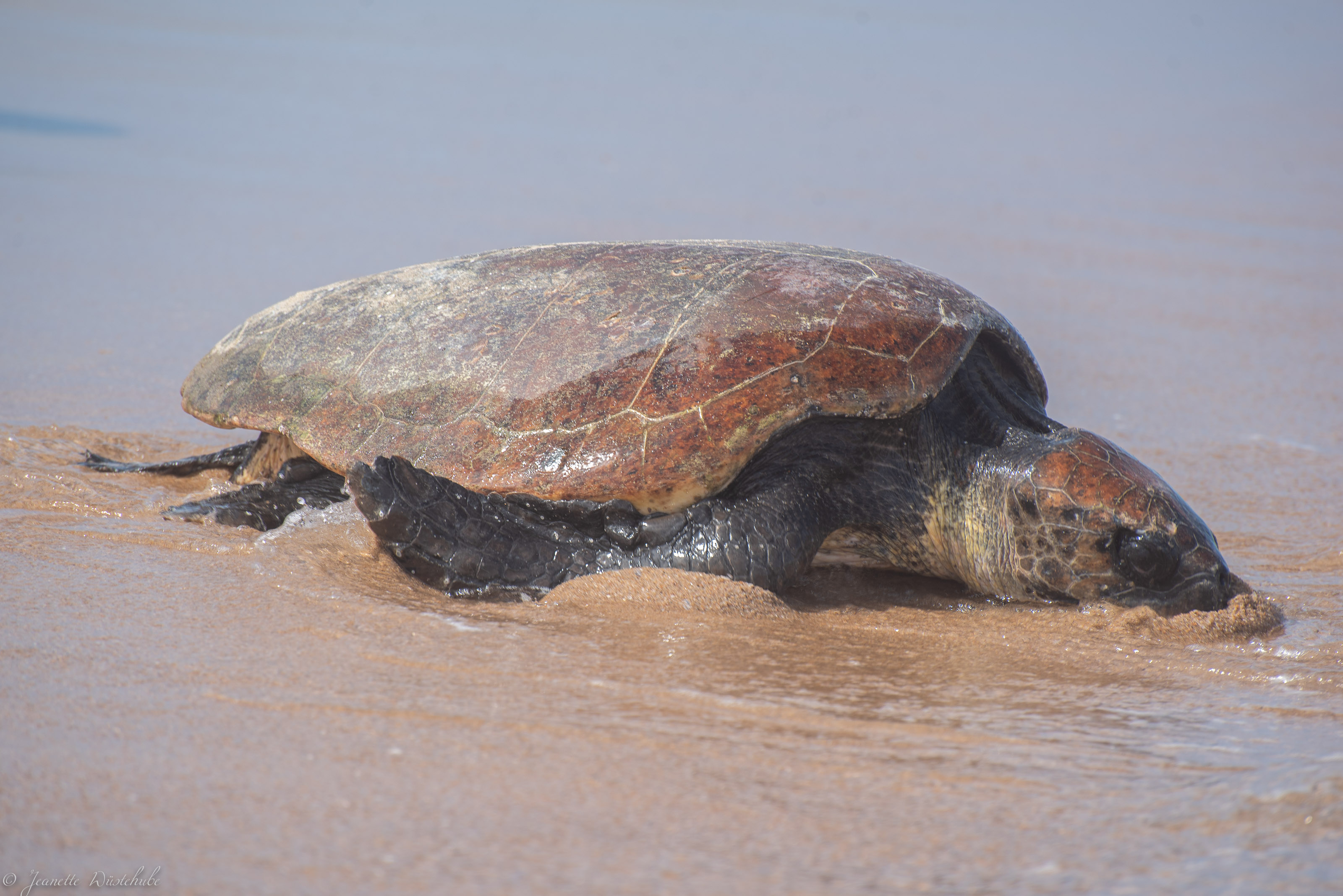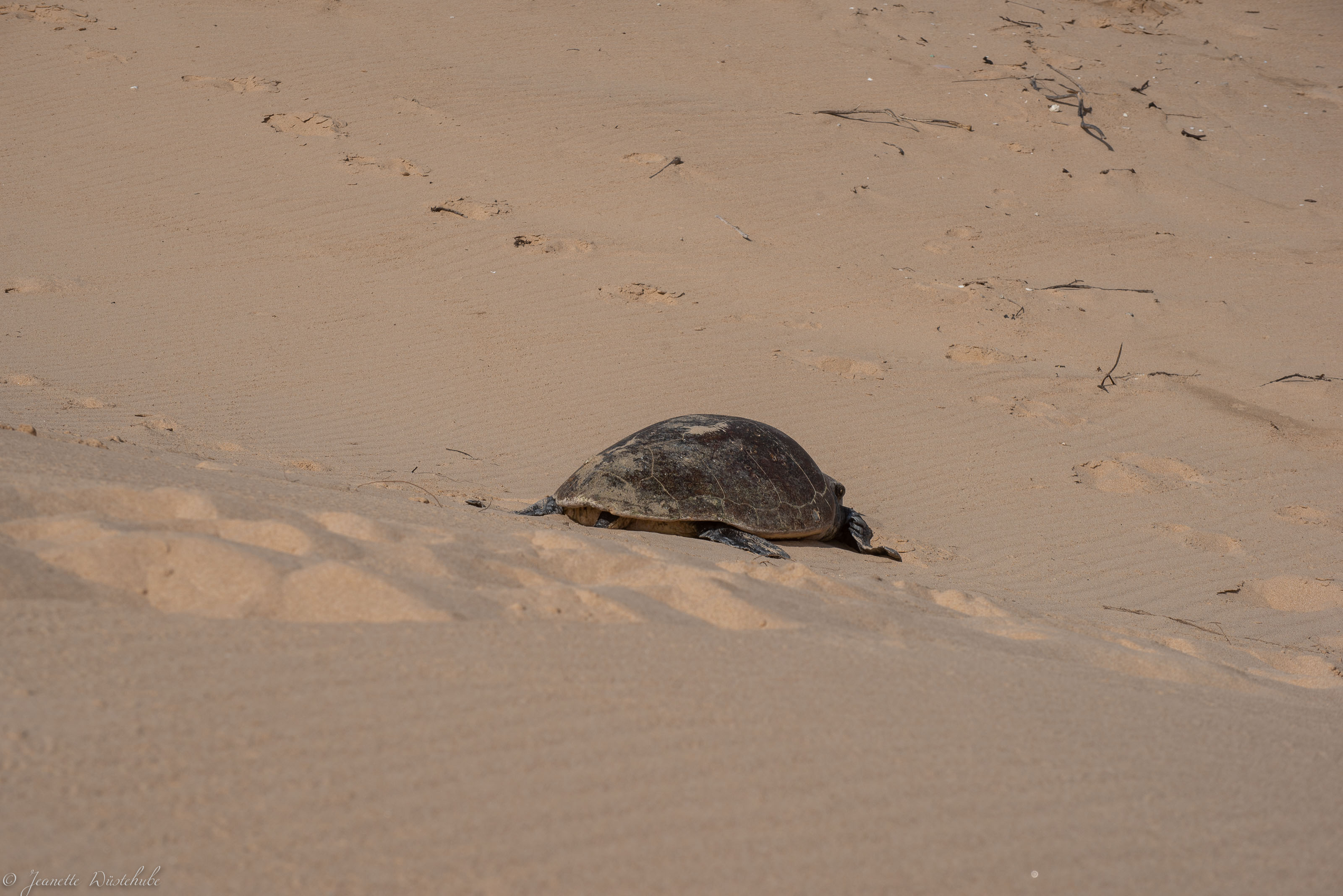 Das Abkühlen hatte aber sehr gut getan. Das Laufen am schrägen Strand im Sand war anstrengend und uns taten die Füße weh. Egal, wir mussten noch ein ganzen Stück weiter. Dann sah ich eine Bewegung im Augenwinkel. Sand flog durch die Luft. Ich blieb stehen. Nichts mehr zu sehen. Dann wieder! Sand flog, so als ob jemand diesen mit einer kleinen Schaufel in die Luft werfen würde. Ich informierte Trevor: „I think there is a turtle“ und tatsächlich! Eine unechte Karettschildkröte lag auf der Düne und war dabei mit ihren Flossen ihr Nest zuzudecken. Das war so ein toller Anblick! Von unten hatte man sich nicht sehen können, weil sie hinter einer kleinen Sandanhäufung versteckt war. Ich war hin und weg. Wir alle waren hin und weg. Die Schildkröte war fast fertig und kroch nach getaner Arbeit sehr langsam zum Meer zurück, wo sie sich erschöpft vom Meer wegtragen ließ. Einfach nur toll, das einmal gesehen zu haben! Was für ein Jahresabschluss!