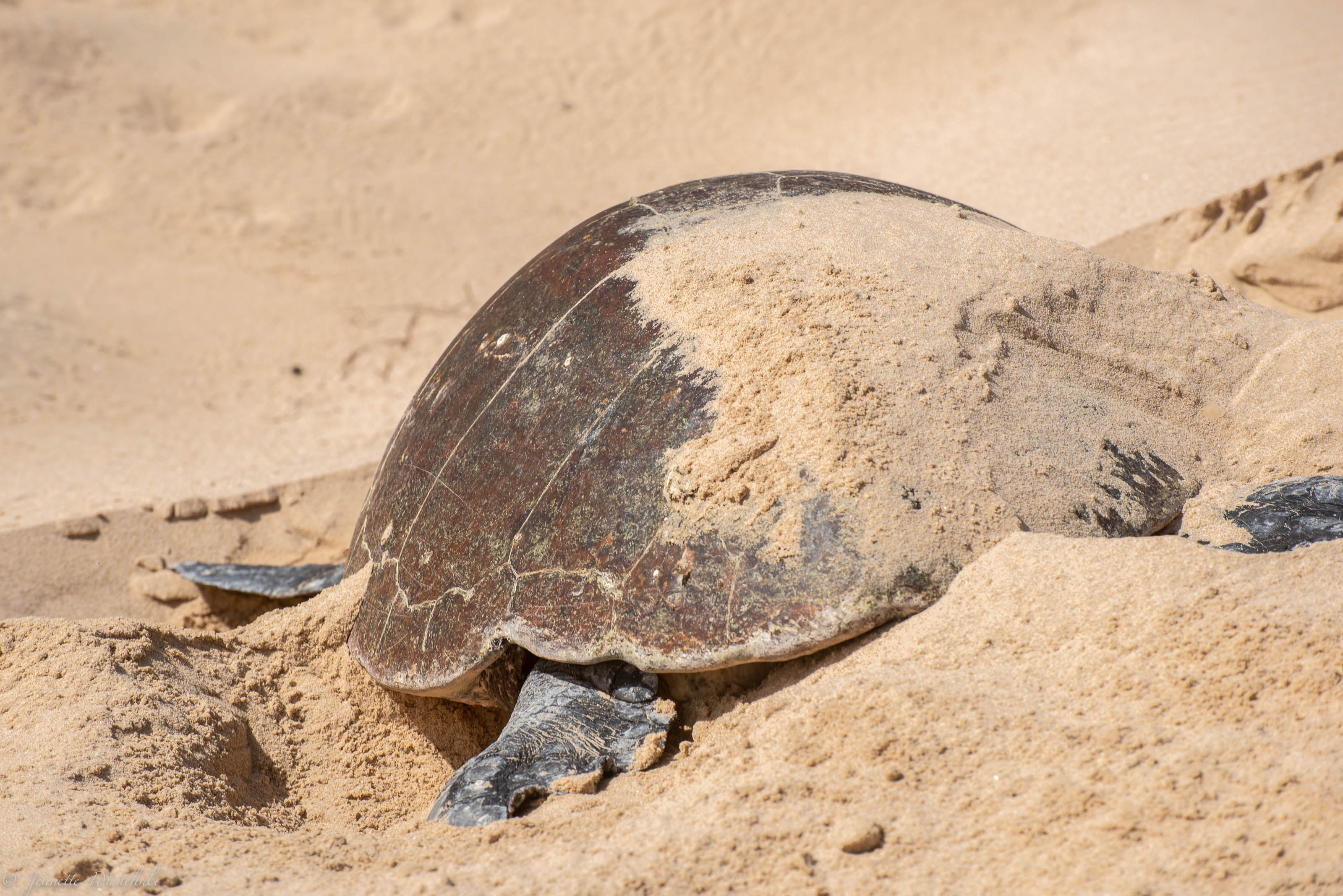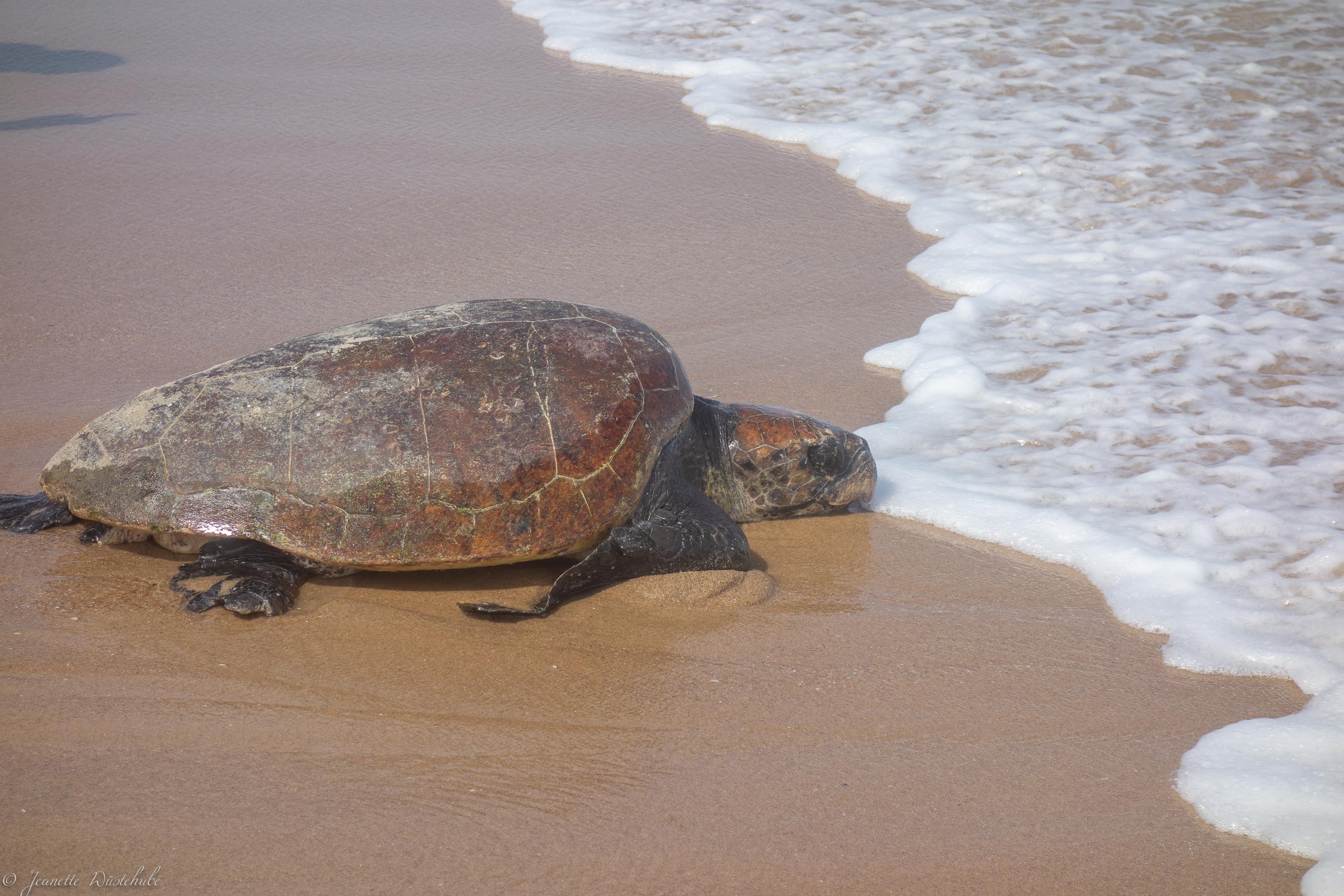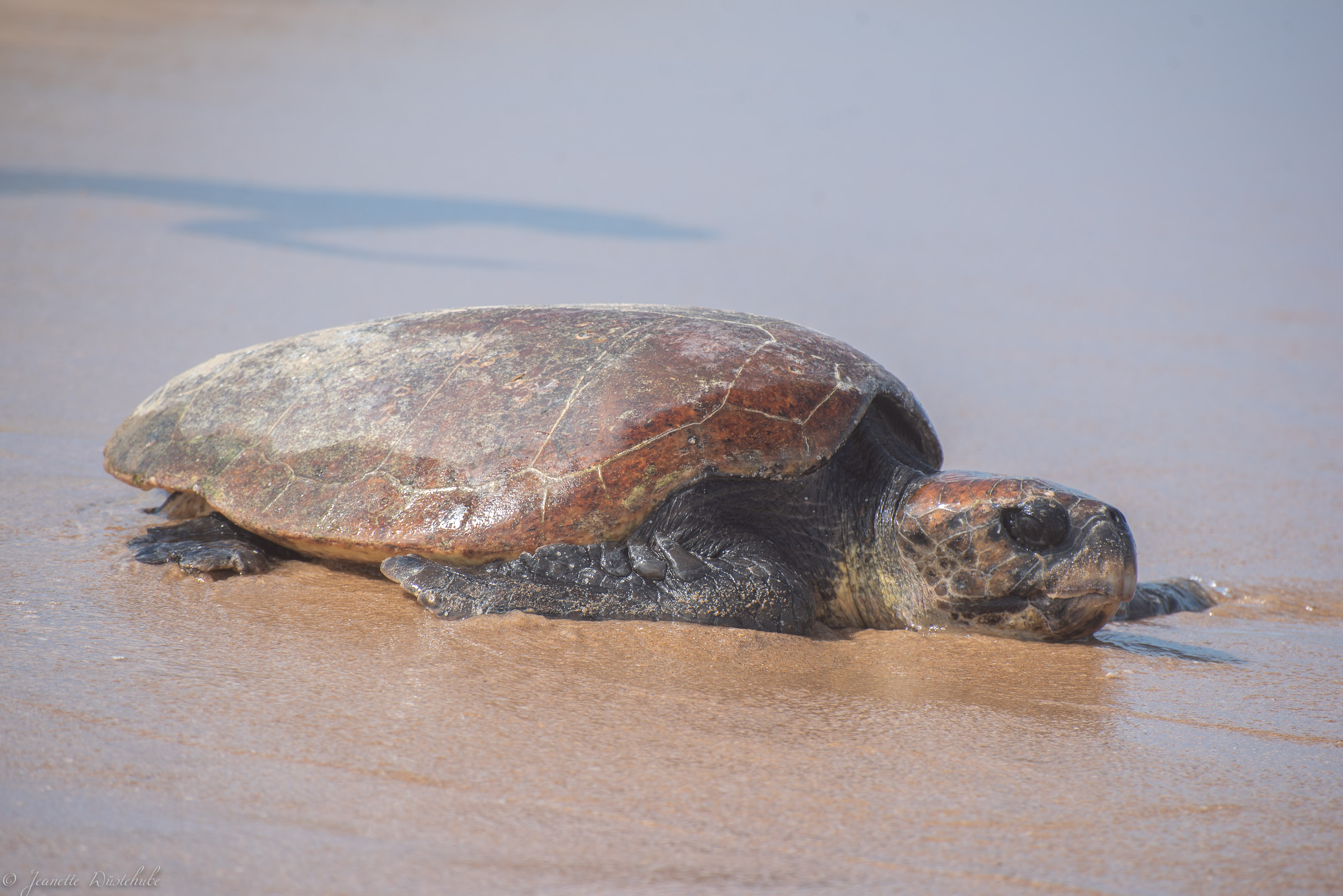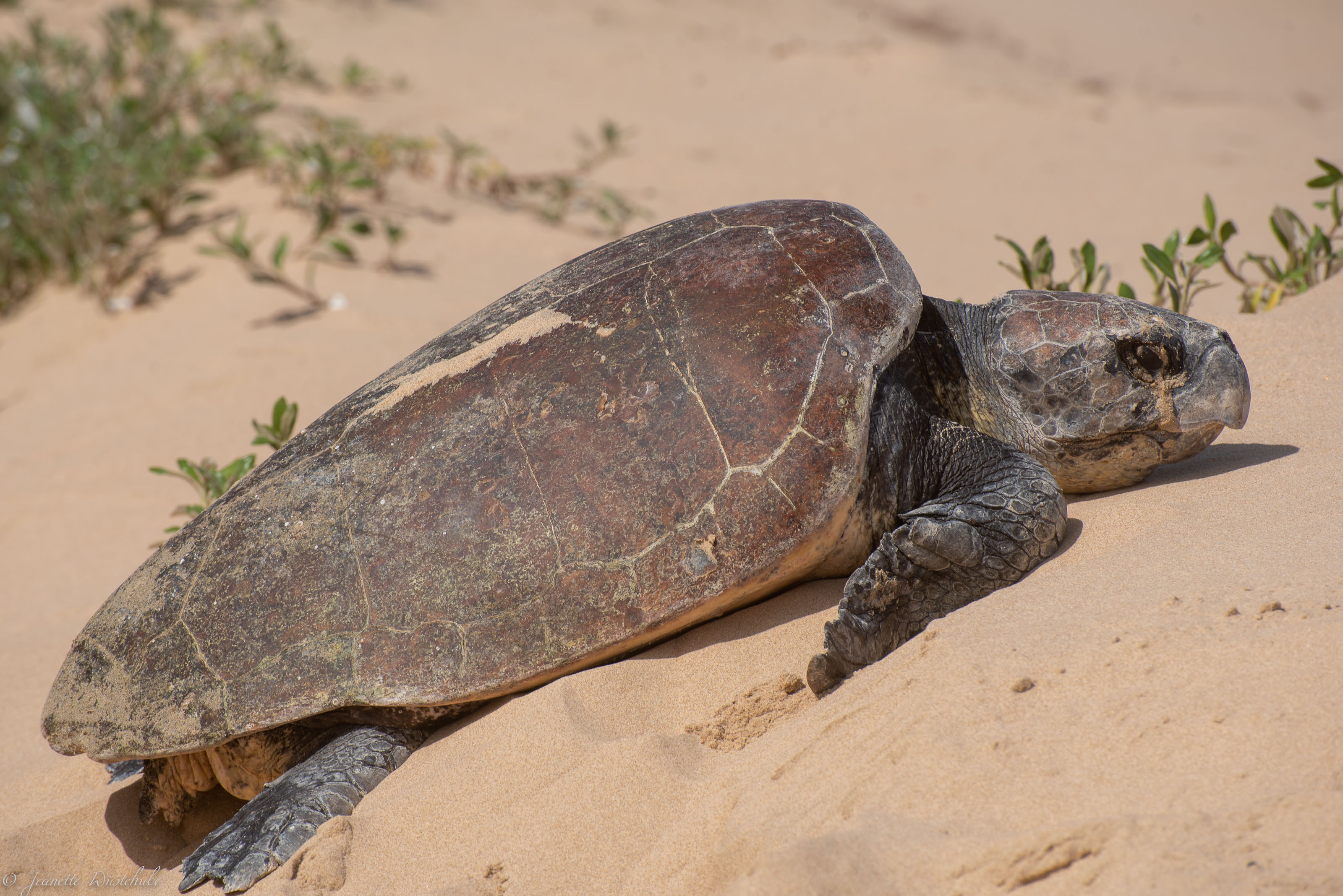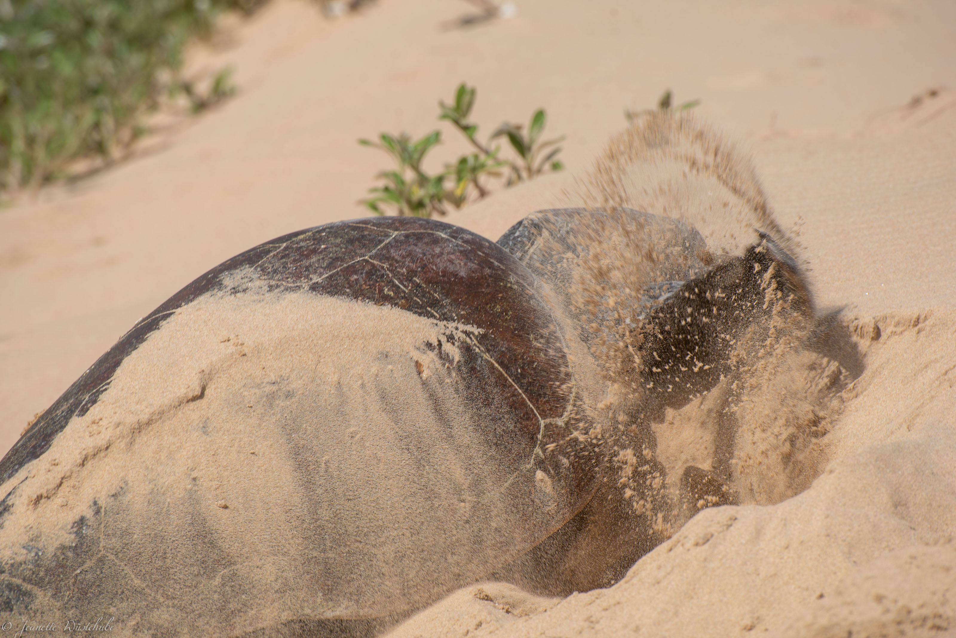 Das Abkühlen hatte aber sehr gut getan. Das Laufen am schrägen Strand im Sand war anstrengend und uns taten die Füße weh. Egal, wir mussten noch ein ganzen Stück weiter. Dann sah ich eine Bewegung im Augenwinkel. Sand flog durch die Luft. Ich blieb stehen. Nichts mehr zu sehen. Dann wieder! Sand flog, so als ob jemand diesen mit einer kleinen Schaufel in die Luft werfen würde. Ich informierte Trevor: „I think there is a turtle“ und tatsächlich! Eine unechte Karettschildkröte lag auf der Düne und war dabei mit ihren Flossen ihr Nest zuzudecken. Das war so ein toller Anblick! Von unten hatte man sich nicht sehen können, weil sie hinter einer kleinen Sandanhäufung versteckt war. Ich war hin und weg. Wir alle waren hin und weg. Die Schildkröte war fast fertig und kroch nach getaner Arbeit sehr langsam zum Meer zurück, wo sie sich erschöpft vom Meer wegtragen ließ. Einfach nur toll, das einmal gesehen zu haben! Was für ein Jahresabschluss!