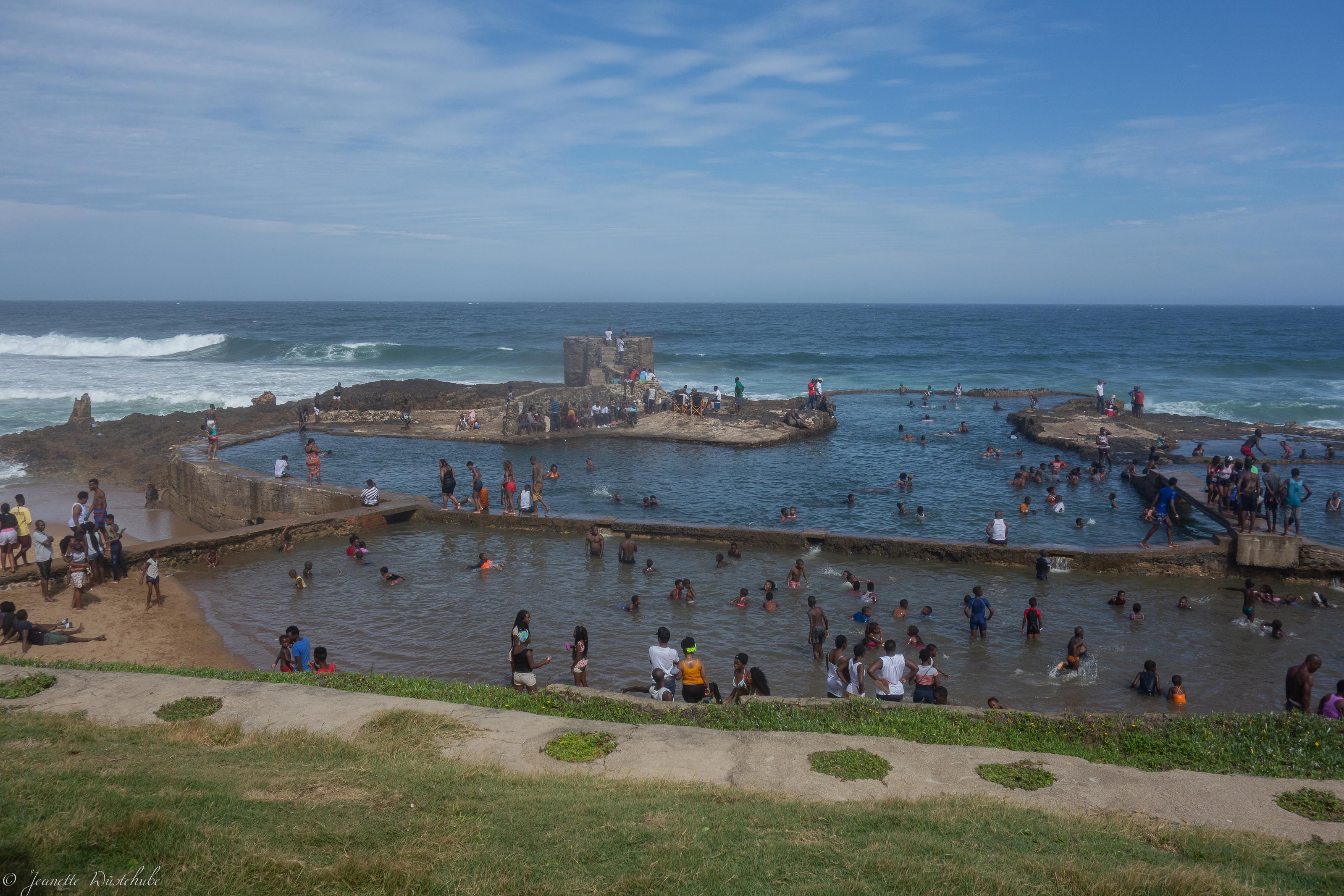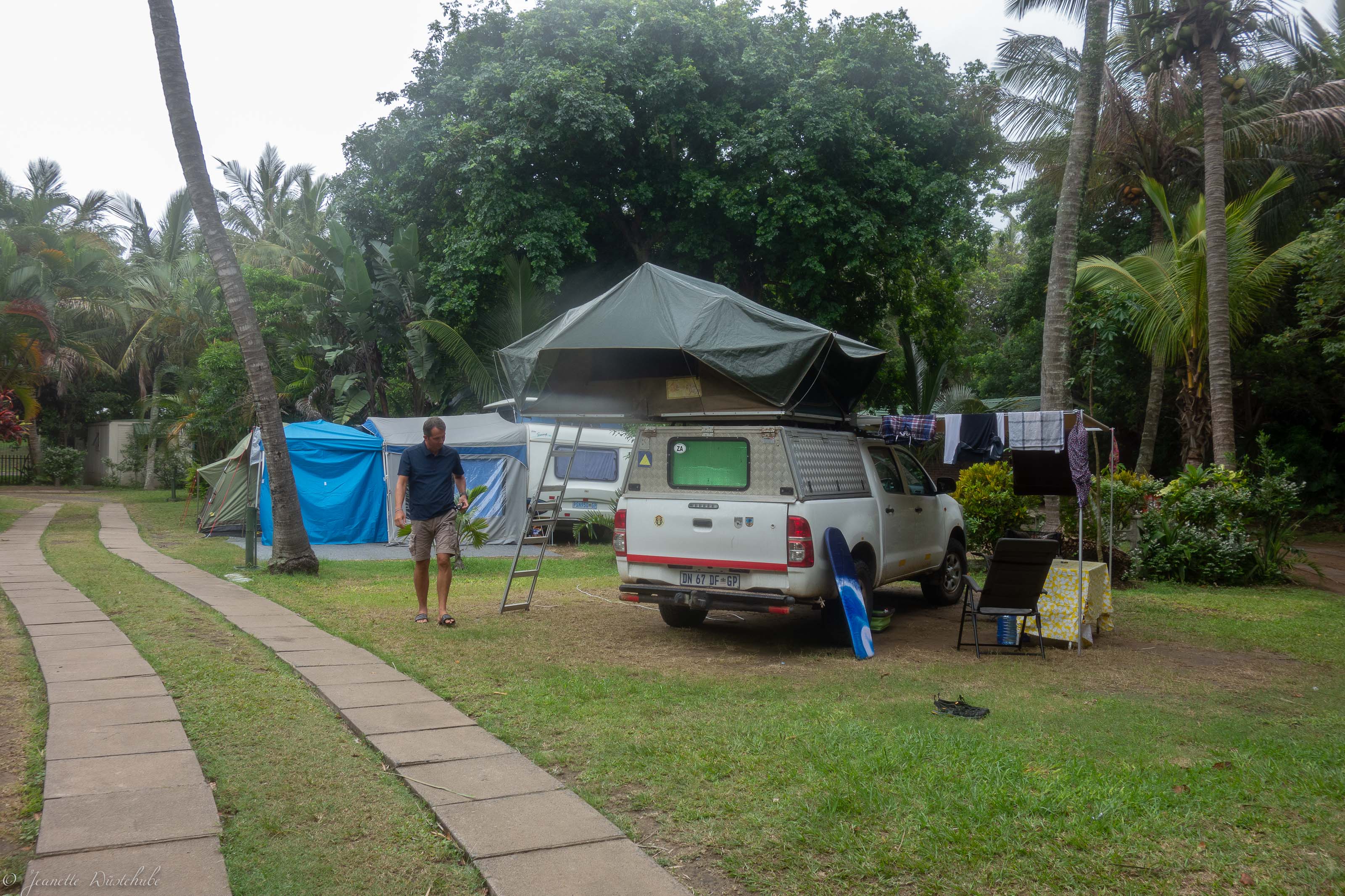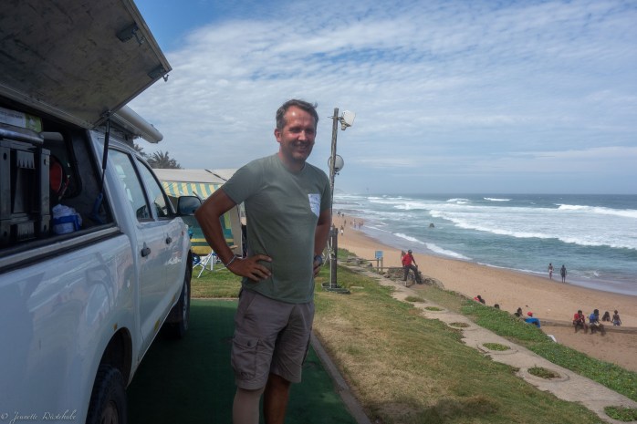 Am ersten Januar war es Zeit abzureisen aus Kosi Bay. Wir verabschiedeten uns von Bill und Pam und der südafrikanischen Familie und machten uns wieder auf die Reise. 3 Tage Strandurlaub in Ballito nördlich von Durban waren geplant. Hier waren wir bereits am Anfang der Tour für einige Tage, aber im August waren keine Ferien wie jetzt, so dass wir einen ziemlich vollen Campingplatz erwarteten. Bill hatte uns bereits gewarnt, dass der 1. Januar Ausnahmezustand sein würde. Hier fängt man am 31.12. an zu trinken und am 1.1. geht es feucht-fröhlich weiter. Wir sahen jede Menge leere Flaschen am Wegesrand, einige torkelnde Gestalten auf dem Weg nach Ballito und dort dann auch einige, die tranken und sich dann wieder ans Steuer setzten. Am Salt Rock Hotel & Camping angekommen, bezogen wir erst mal unseren Platz in der ersten Reihe: Seafront am Indischen Ozean mit Blick auf den davor liegenden Tidal Pool, einem natürlichen Schwimmbad. Sozusagen „Pool Position“! Klasse!