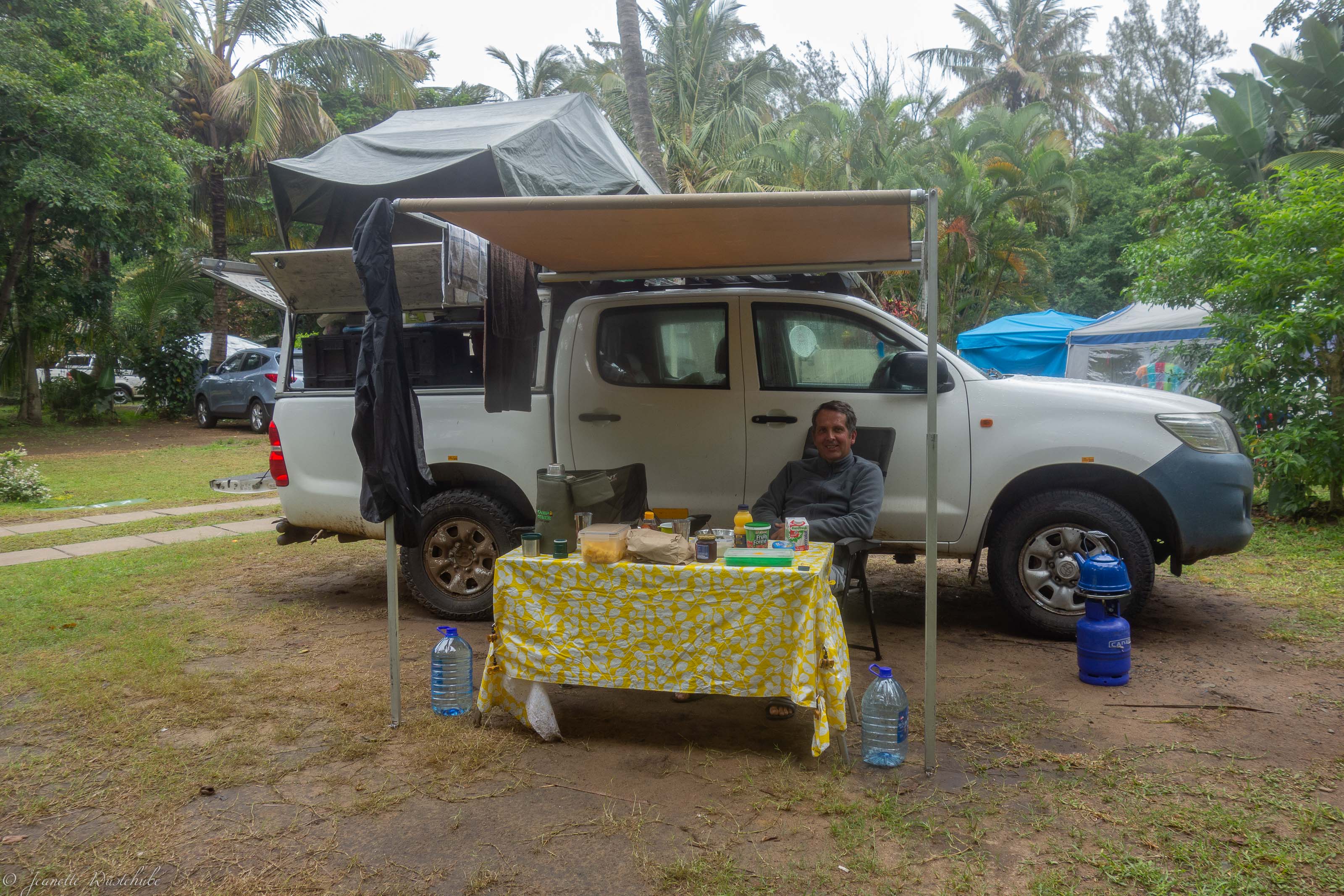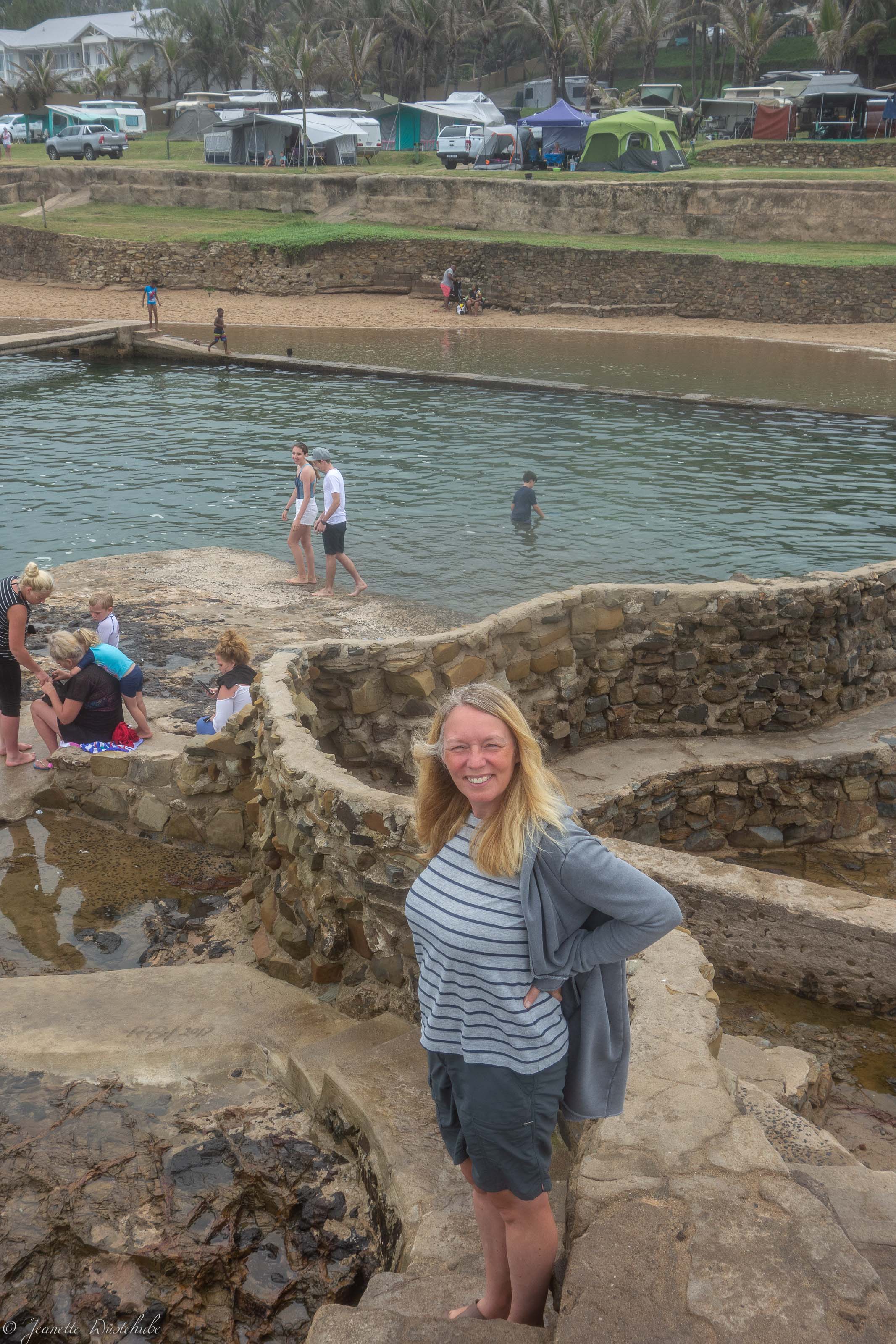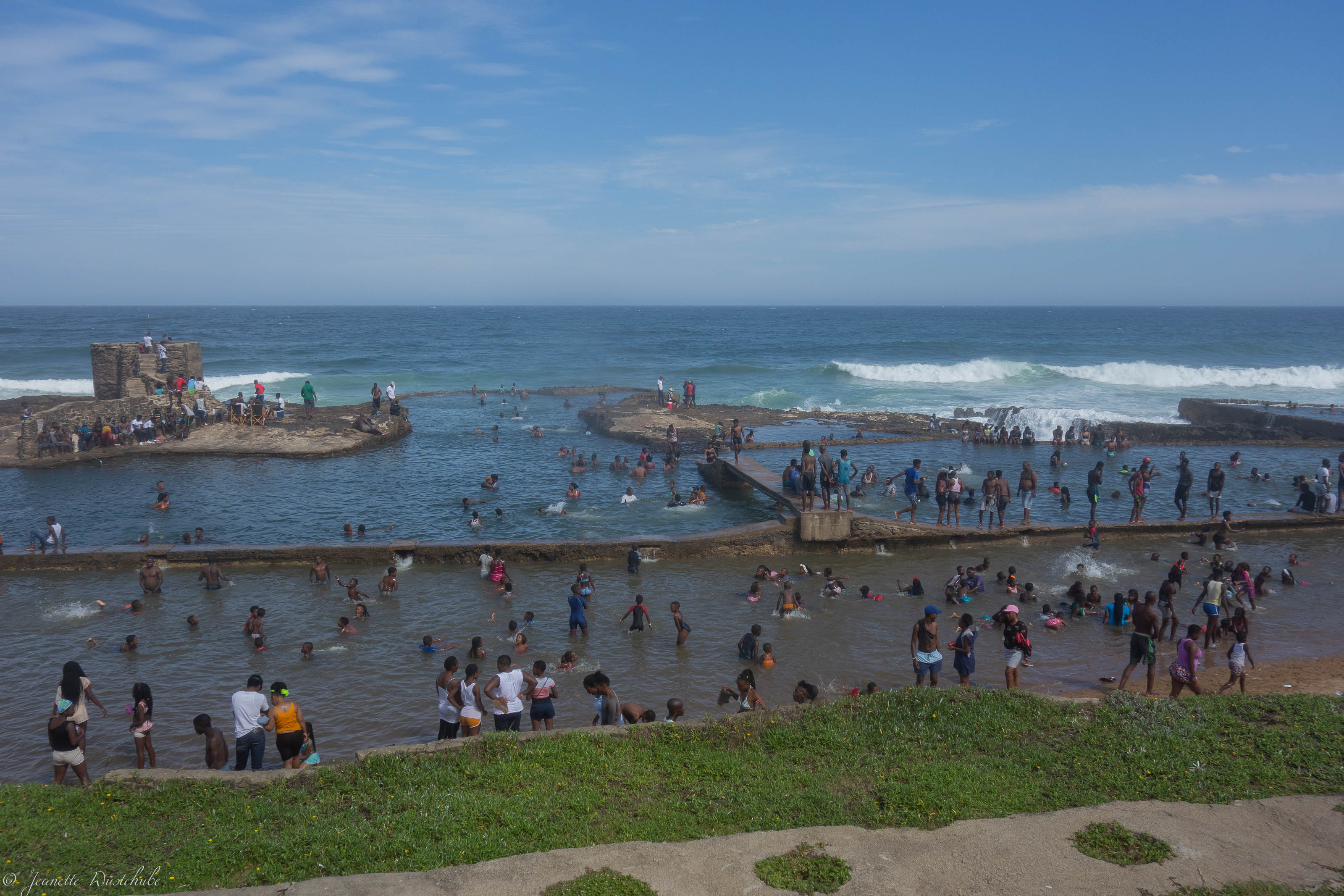 Am ersten Januar war es Zeit abzureisen aus Kosi Bay. Wir verabschiedeten uns von Bill und Pam und der südafrikanischen Familie und machten uns wieder auf die Reise. 3 Tage Strandurlaub in Ballito nördlich von Durban waren geplant. Hier waren wir bereits am Anfang der Tour für einige Tage, aber im August waren keine Ferien wie jetzt, so dass wir einen ziemlich vollen Campingplatz erwarteten. Bill hatte uns bereits gewarnt, dass der 1. Januar Ausnahmezustand sein würde. Hier fängt man am 31.12. an zu trinken und am 1.1. geht es feucht-fröhlich weiter. Wir sahen jede Menge leere Flaschen am Wegesrand, einige torkelnde Gestalten auf dem Weg nach Ballito und dort dann auch einige, die tranken und sich dann wieder ans Steuer setzten. Am Salt Rock Hotel & Camping angekommen, bezogen wir erst mal unseren Platz in der ersten Reihe: Seafront am Indischen Ozean mit Blick auf den davor liegenden Tidal Pool, einem natürlichen Schwimmbad. Sozusagen „Pool Position“! Klasse!