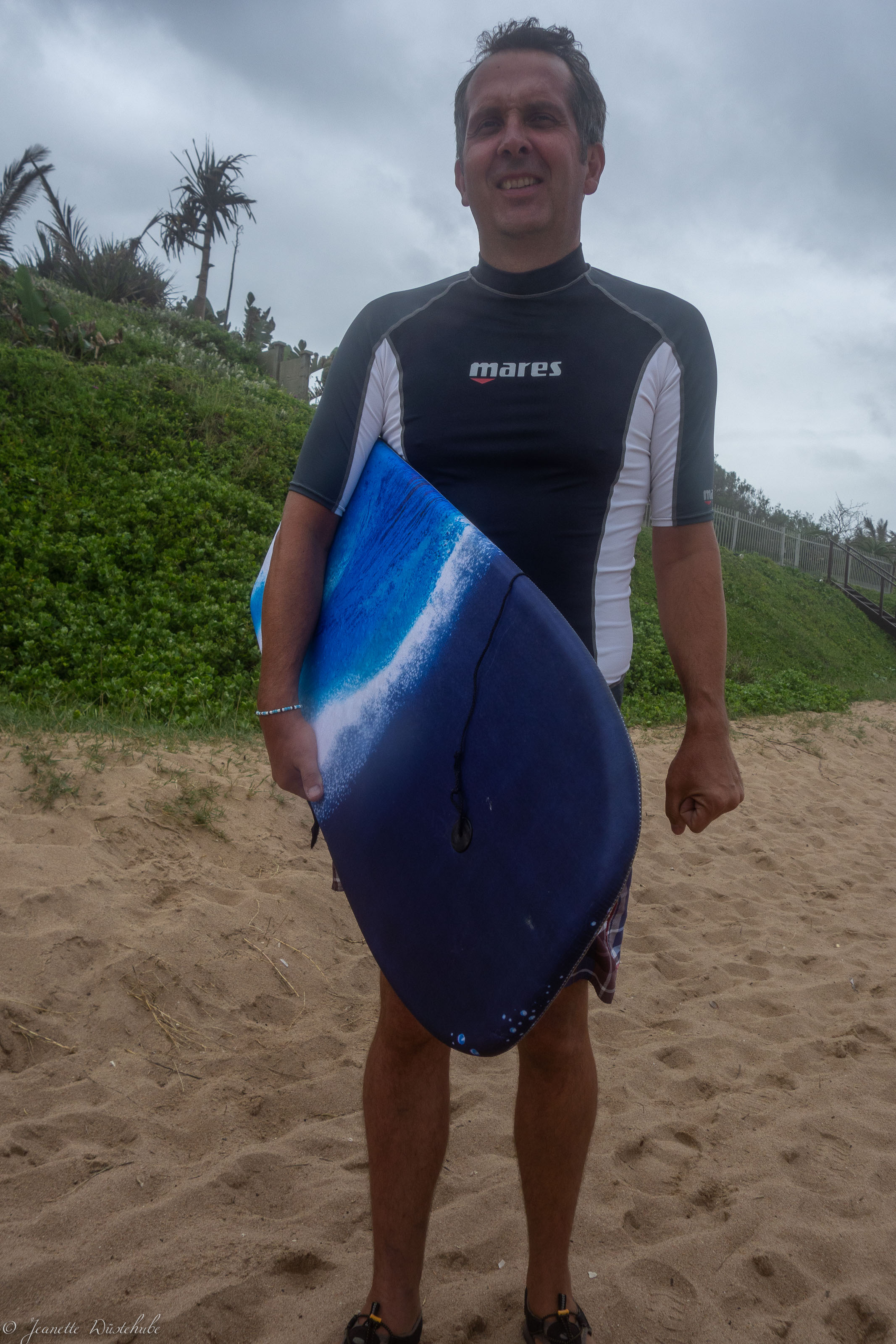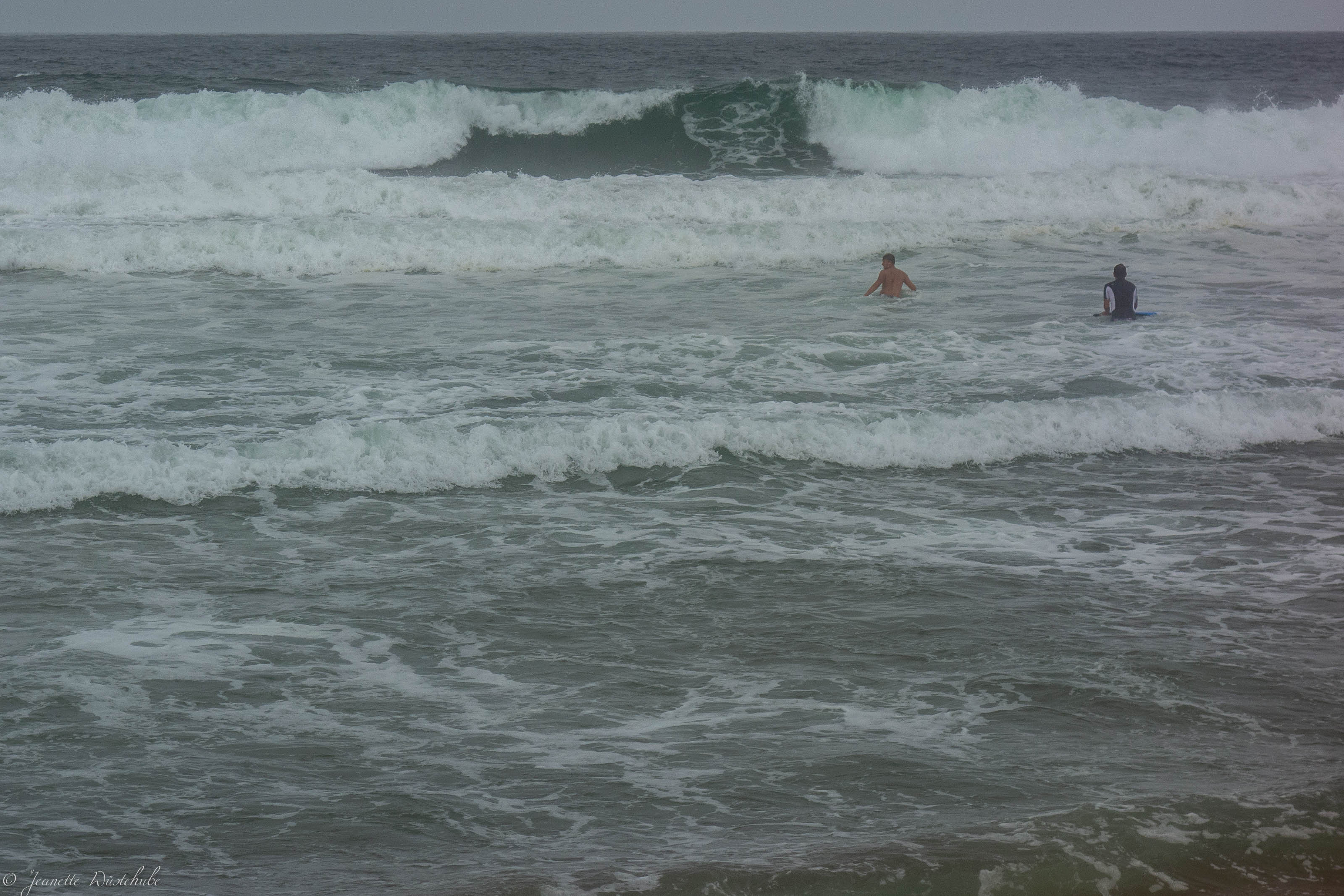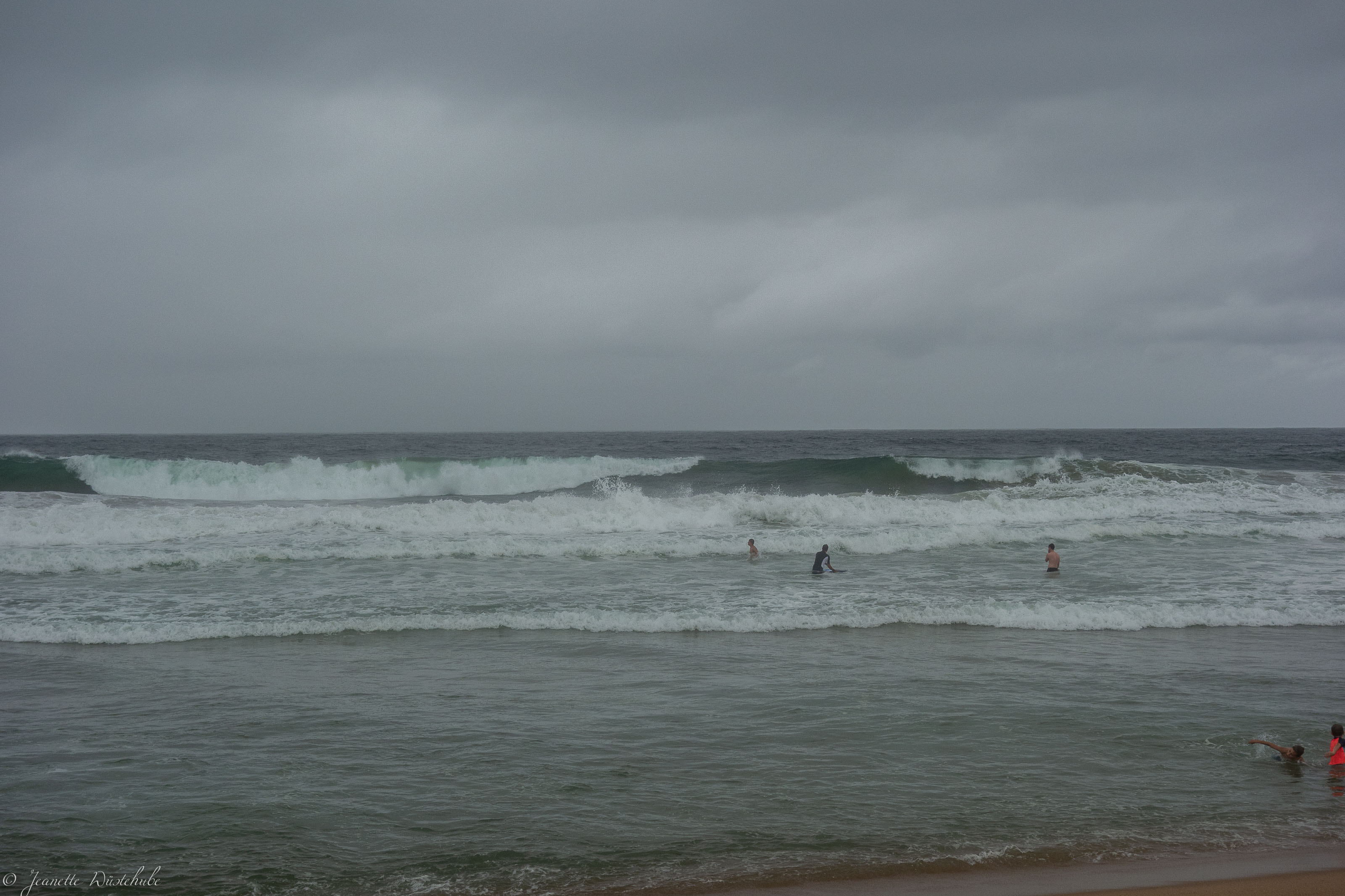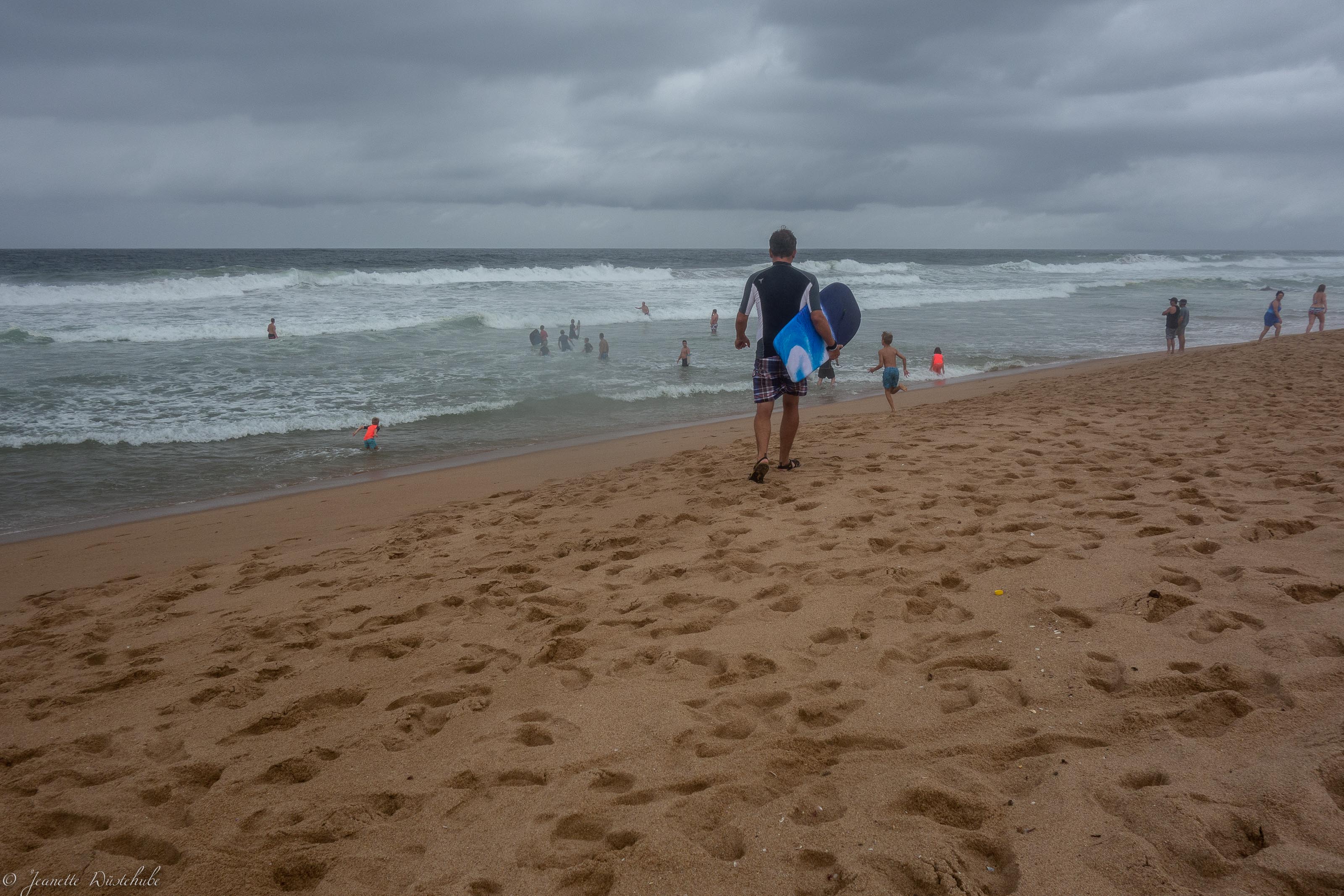 Wir gingen also zum Strand. Es gab einen definierten Strandbereich, von dem aus man ins Meer gehen konnte. Hier gab es Baywatcher. Schwamm man zu weit links, wurde man angepfiffen. In dem abgegrenzten Bereich tummelten sich so einige, die trotz des nicht so guten Wetters ins Wasser wollten. Vor allem viele Kinder und die meisten hatten auch ein Bodyboard. Tom fand er es sehr schwierig überhaupt weit genug vom Strand ins Meer zu kommen, um auf einer Welle bäuchlings auf dem Brett liegend zu surfen. Es gab eine ziemliche Strömung, aber er hielt eine Weile durch und hatte Spaß.