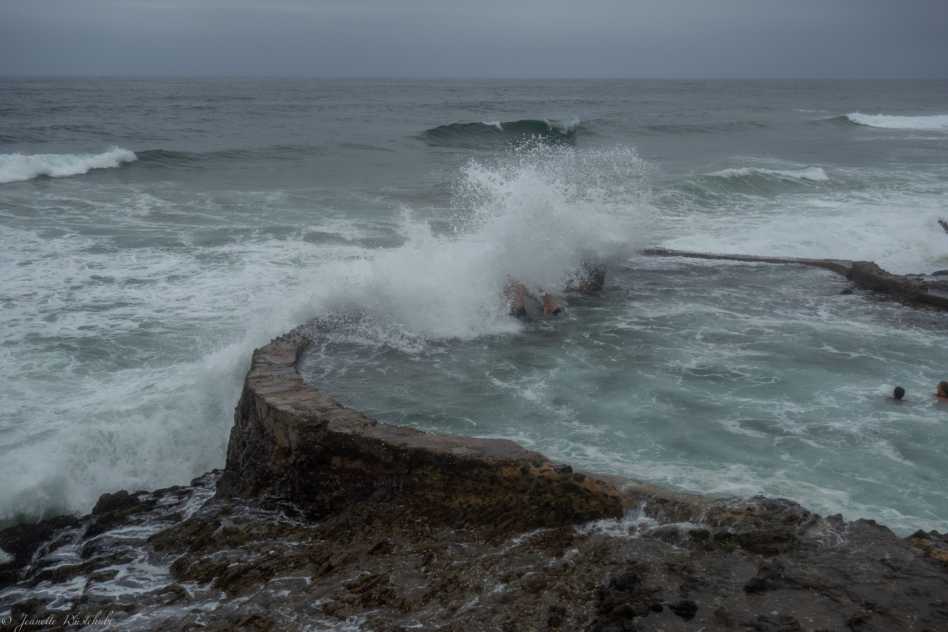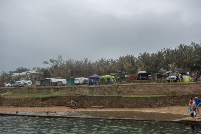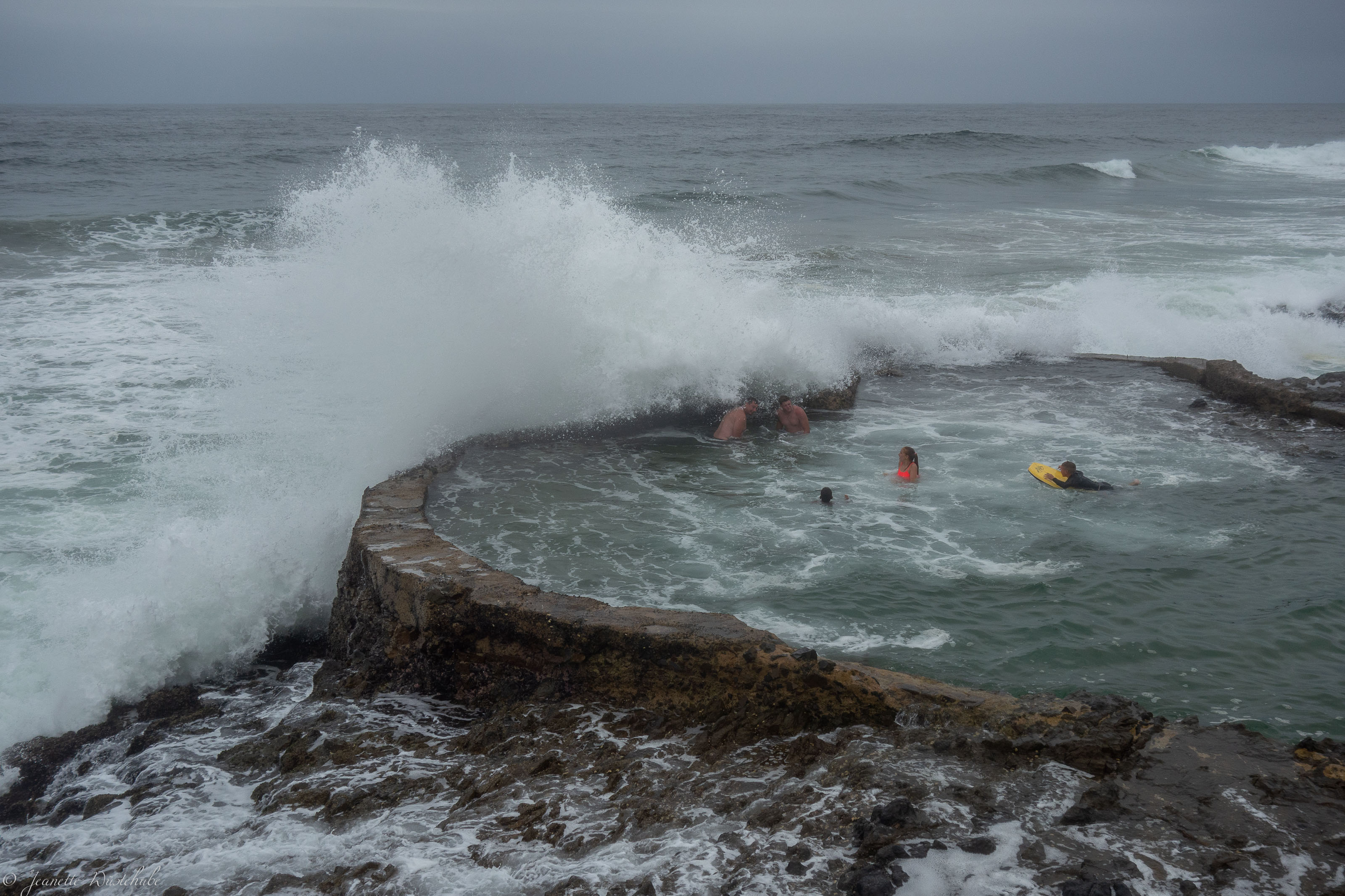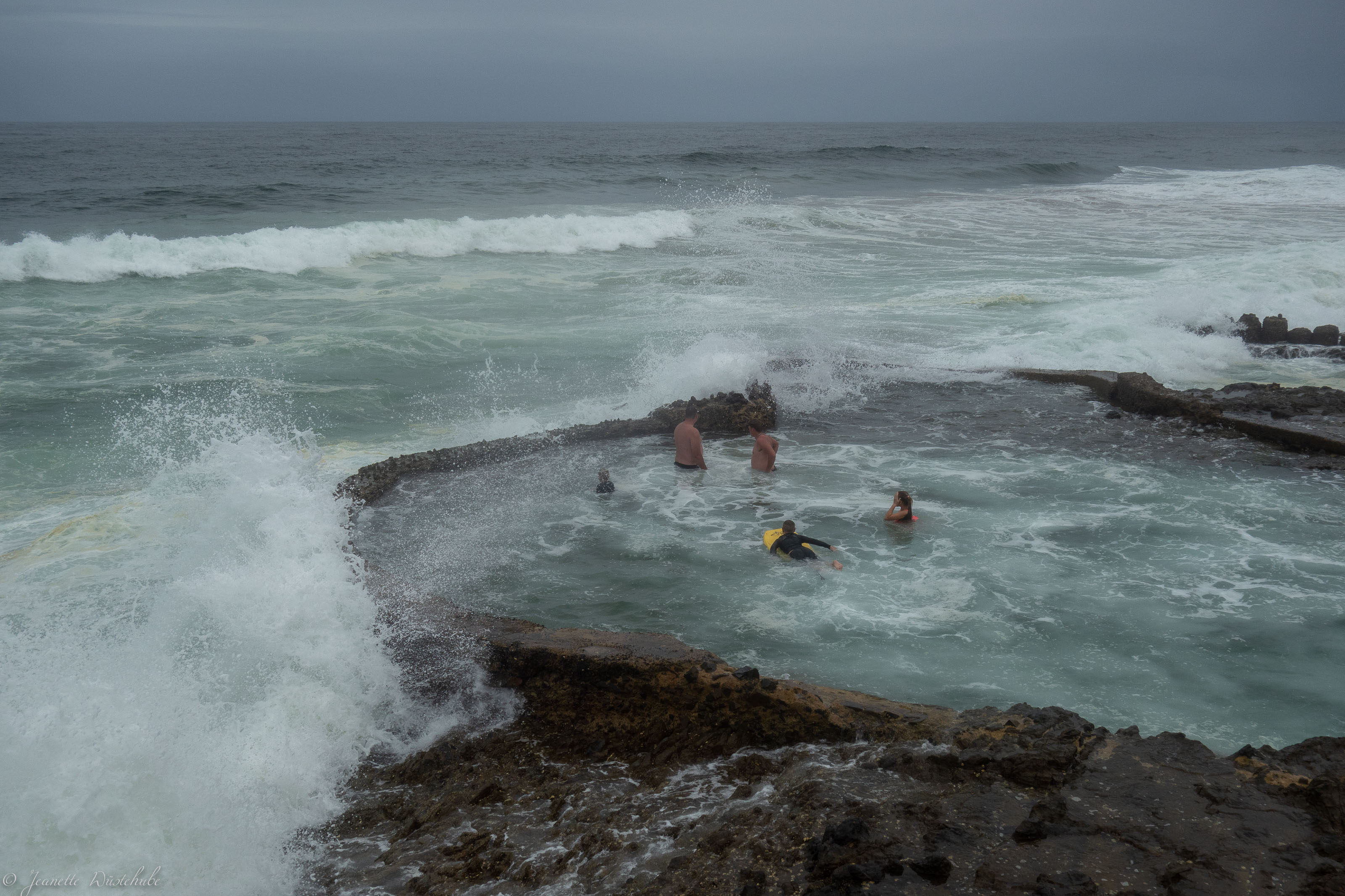 Bei der Auswahl des Platzes im Internet hatte ich allerdings nicht bedacht, dass die erste Reihe auf einem Campingplatz am Meer vielleicht nicht unbedingt die klügste Wahl sein könnte, wenn man nur über ein Auto mit Dachzelt verfügt. Es war ziemlich windig und die Wettervorhersage war auch nicht die beste. Wahrscheinlich dachten unsere campenden Nachbarn, die allesamt viel besser gerüstet waren für steife Brisen, sich auch, wie lange wir es wohl an der Front aushalten würden 🙂 Das Büro war allerdings zu und das Camp so gut wie ausgebucht, so dass wir den Platz am ersten Abend nicht tauschen konnten. Also vertrauten wir auf unser Zelt und beobachteten erst mal –wie alle anderen am Campingplatz- ganz entspannt das Treiben im Tidal Pool. Wahnsinn was da los war!