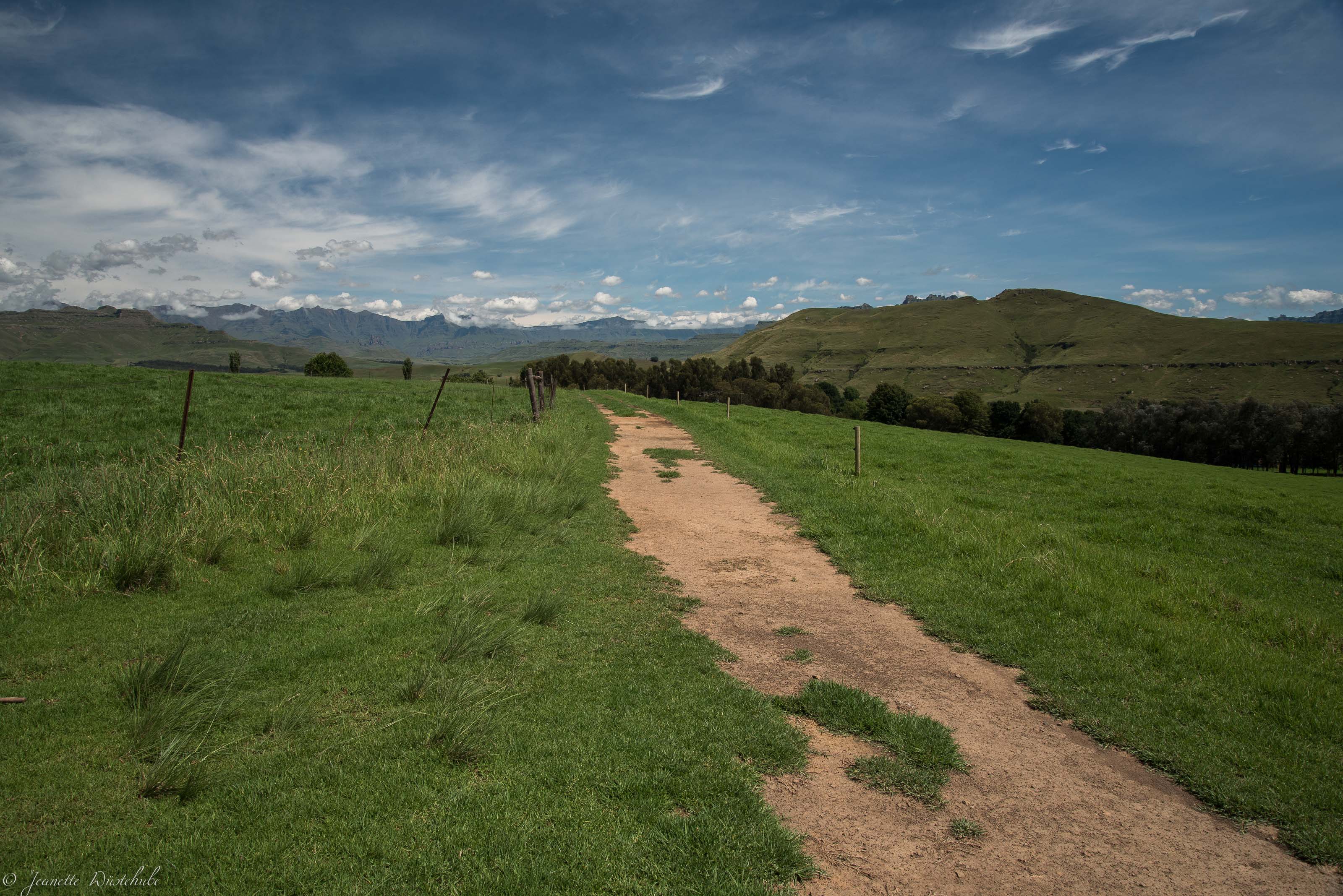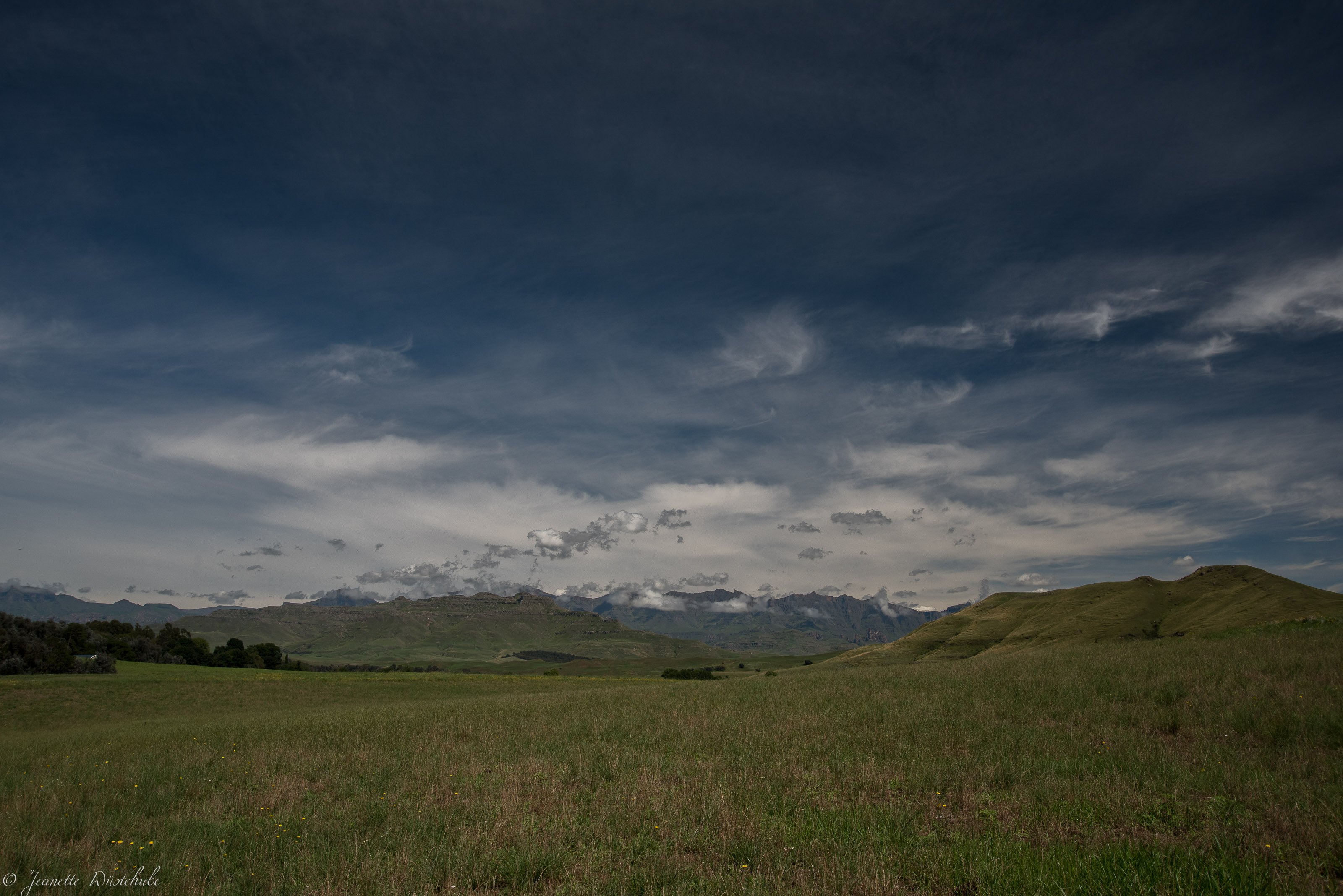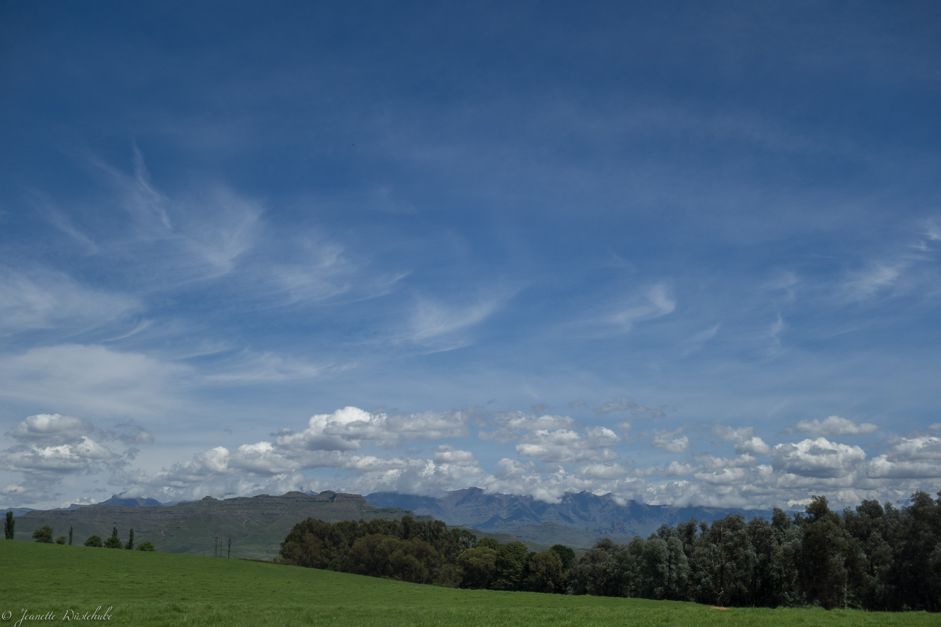 Underberg liegt in den südlichen Drakensbergen und der Unterschied zu Ballito und der Penwarn Farm, wo wir die nächsten vier Tage verbrachten, könnte kaum größer sein. Wir tauschten Meer gegen Berge, endlosen Strand gegen üppige Wiesen, Campingplatz gegen Häuschen, Menschenmengen gegen Einsamkeit, Autolärm gegen Vögelgezwitscher und Wolken gegen blauen Himmel. Zumindest zunächst… Die Anfahrt zur Farm bot bereits schöne Ausblicke und schon war der Abschied von Ballito nicht mehr ganz so schlimm.