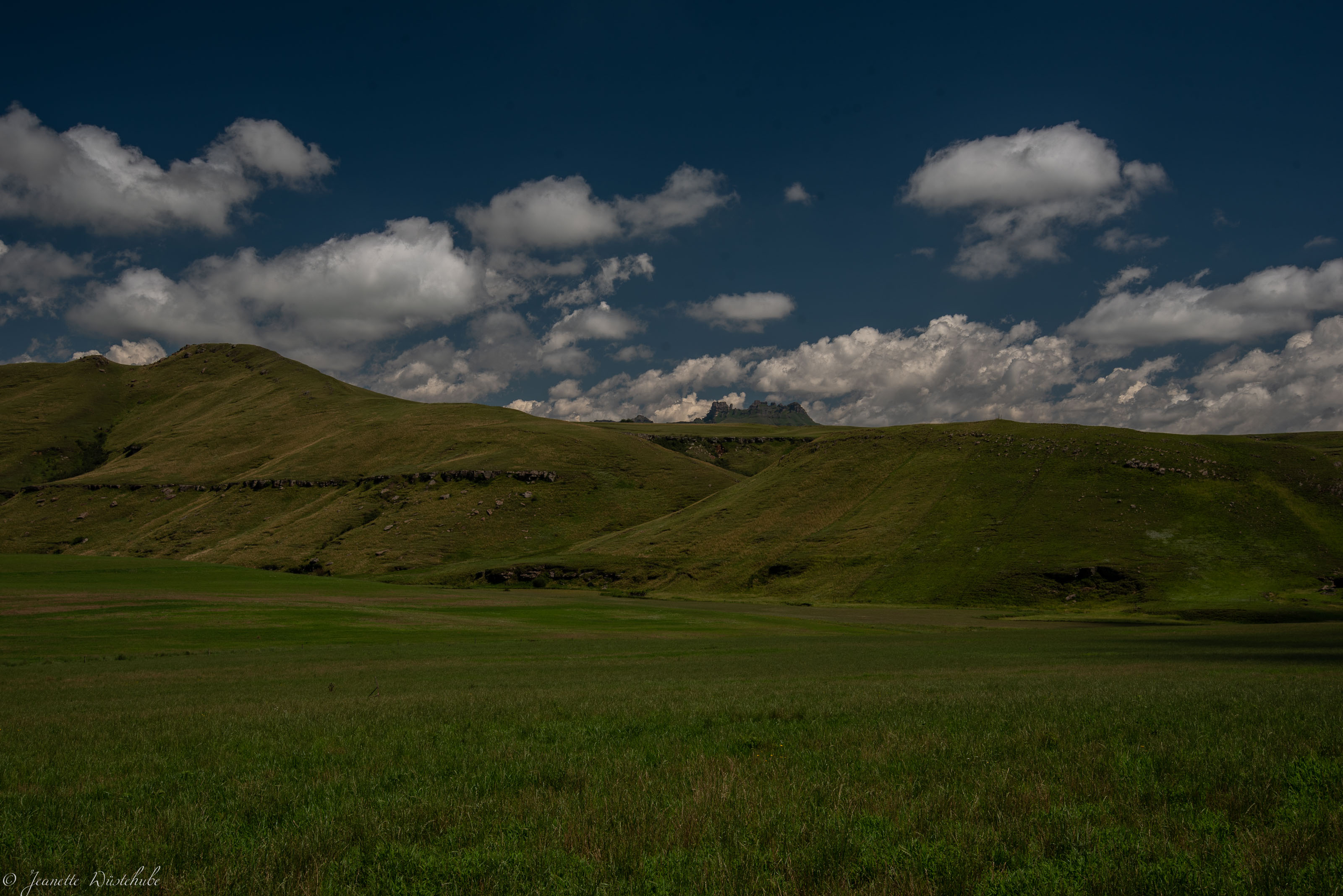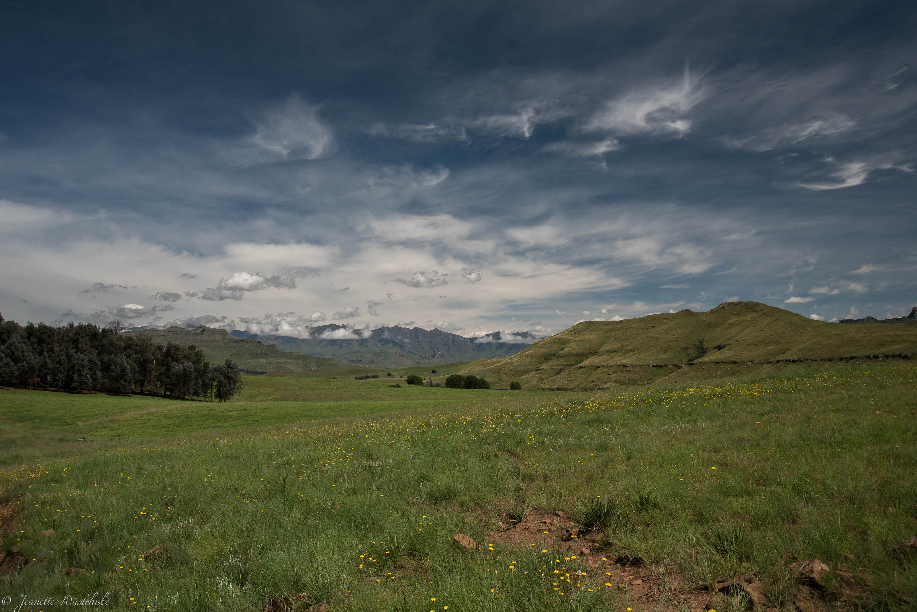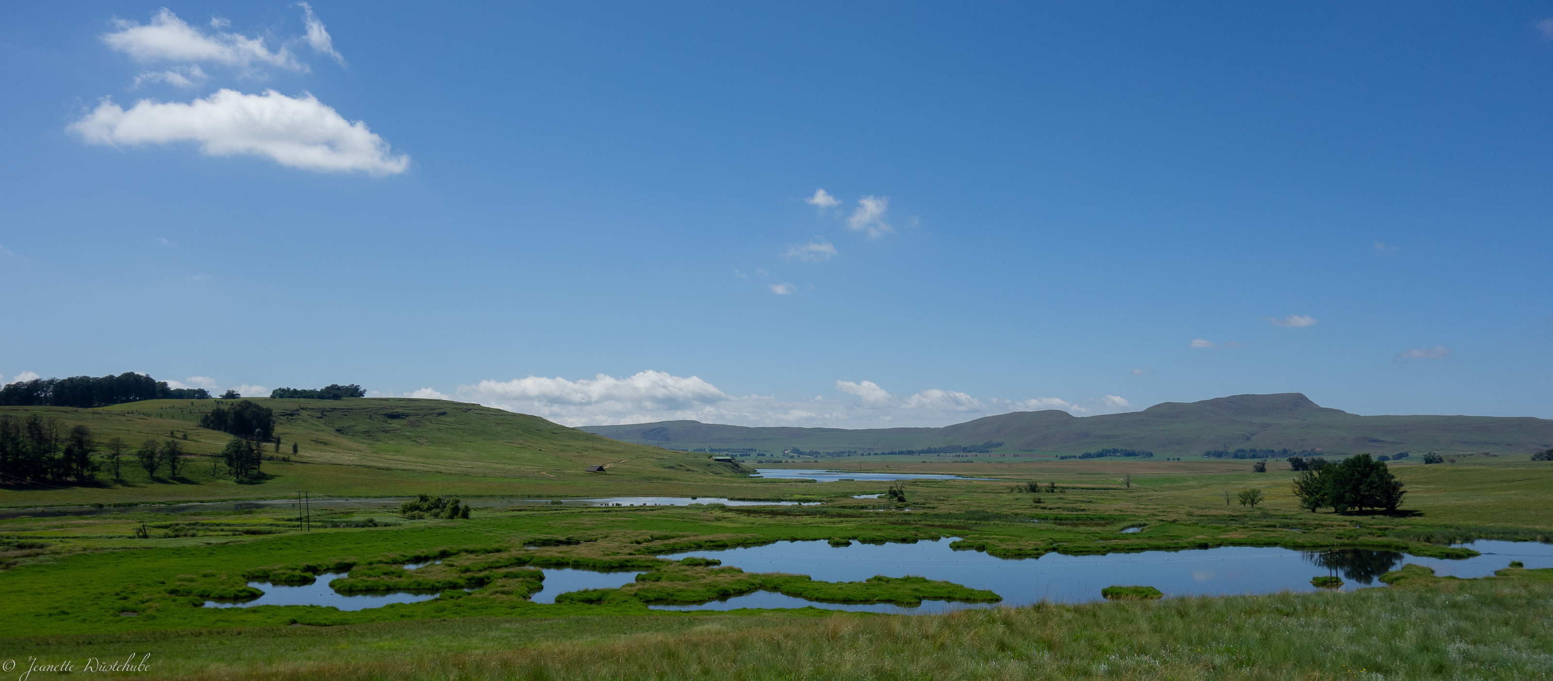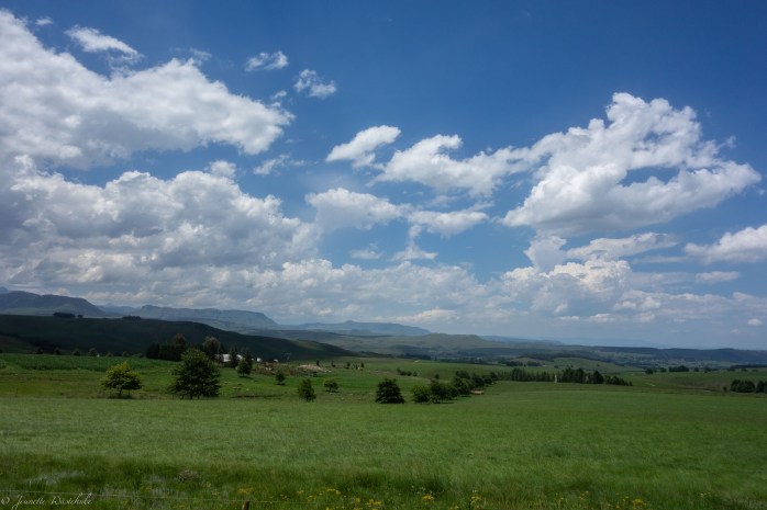 Underberg liegt in den südlichen Drakensbergen und der Unterschied zu Ballito und der Penwarn Farm, wo wir die nächsten vier Tage verbrachten, könnte kaum größer sein. Wir tauschten Meer gegen Berge, endlosen Strand gegen üppige Wiesen, Campingplatz gegen Häuschen, Menschenmengen gegen Einsamkeit, Autolärm gegen Vögelgezwitscher und Wolken gegen blauen Himmel. Zumindest zunächst… Die Anfahrt zur Farm bot bereits schöne Ausblicke und schon war der Abschied von Ballito nicht mehr ganz so schlimm.
