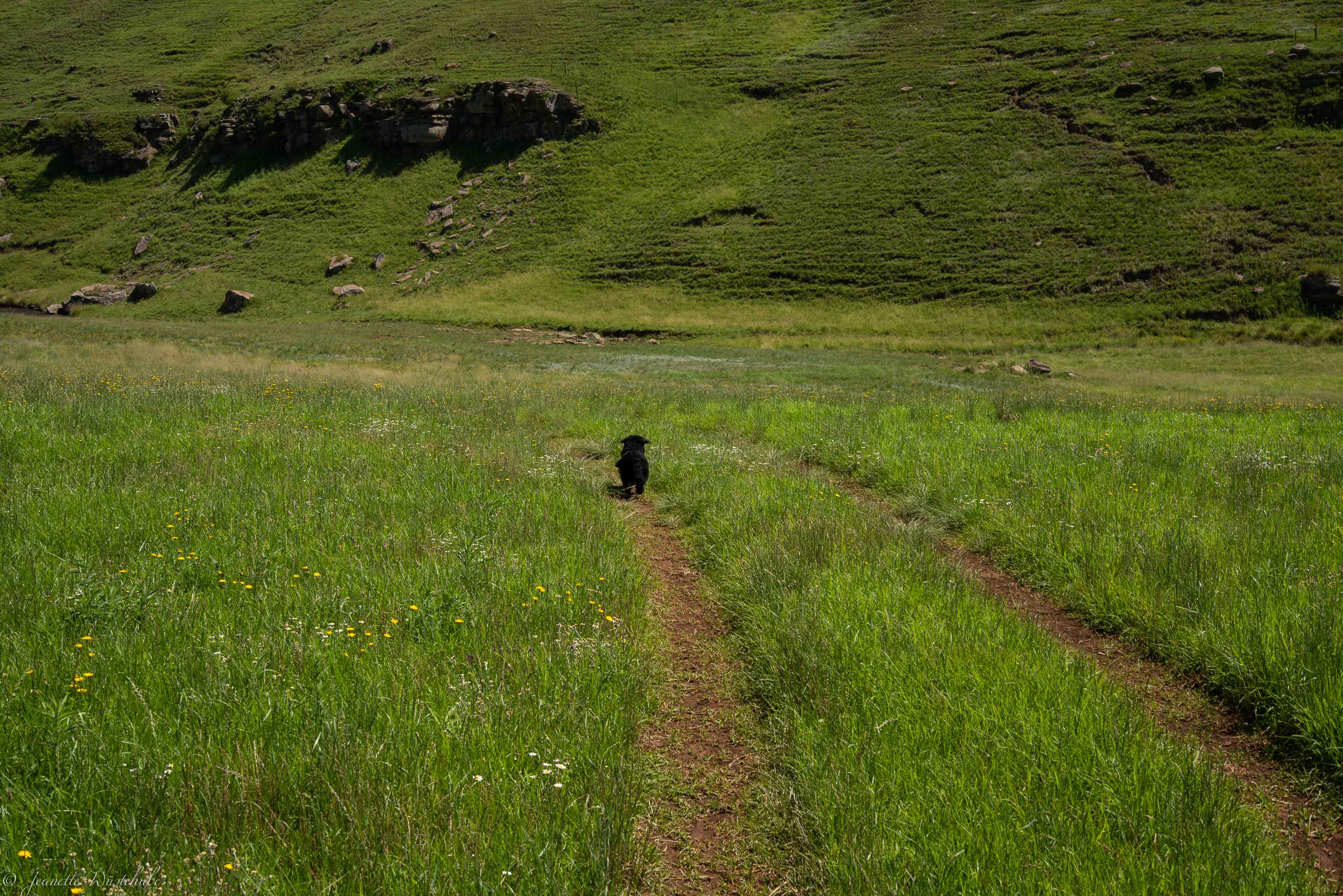 Am nächsten Morgen starteten wir bei strahlendem Sonnenschein zu unserer kleinen Wanderung. Nur wenige Wolken hatten es bisher über die Berge geschafft. Vor dem Rezeptions-Gebäude wartete schon der kleine schwarze Hund und als er merkte, dass wir offensichtlich „Gassi“gingen, schloss er sich einfach an.
