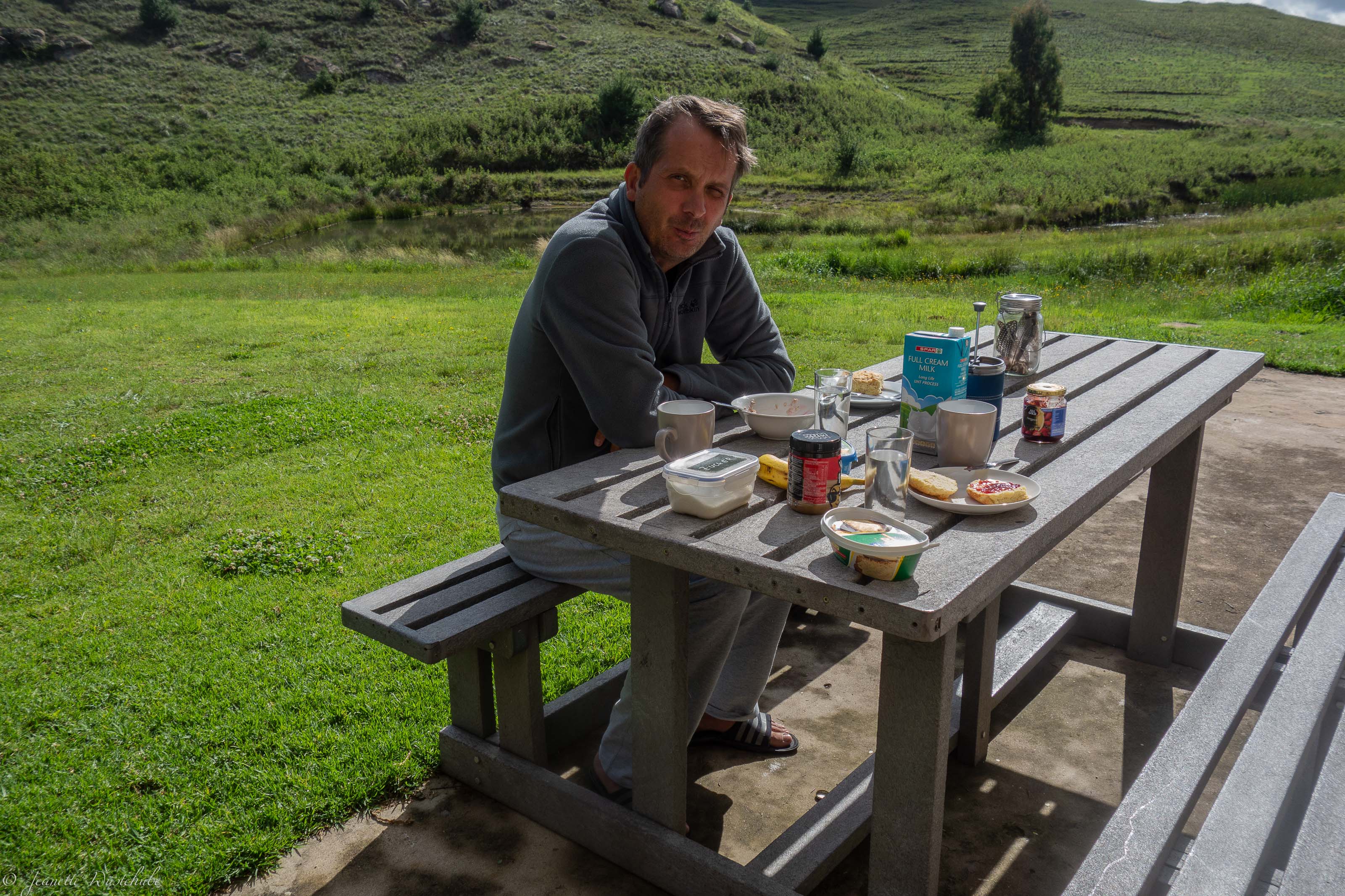 Wir wollten früh los am nächsten Tag und waren um 7 Uhr abfahrtbereit. Wir wollten zum Eingang des Royal Natal Nationalpark fahren und uns dort eine Wanderkarte holen, dann weiter zum Thendele Camp, von wo der Wanderweg zu den Thugela Falls starten sollte. Aber ein platter Reifen vorne links machte uns einen Strich durch die Rechnung. Dieser musste gewechselt werden. Das hieß: Auto entladen (wegen Gewicht), Wagenheber und das übrige Werkzeug auspacken und Tom, der sehr angespannt war, assistieren. Das Auto ließ sich nicht hoch genug aufbocken. Zwar konnte Tom mit viel Anstrengung, Umbani so hoch liften, dass man es auf dem Bock aufzusetzen konnte, der während des Radwechsels das Gewicht des Fahrzeugs halten musste. Das metallene Dreibein sackte aber zu tief im Untergrund ein und damit war der Reifen wieder zu weit unten, um ihn abschrauben und vor allem das -weil mit Luft gefüllte- noch höhere Ersatzrad anbringen zu können. Tom musste mehrfach das Auto mit dem Wagenheber nach oben und wieder nach unten bocken, bis es schließlich klappte. Dabei hatte er sich aber erst den Wagenheber an die Schläfe gehauen und schließlich den Rücken verrenkt, so dass er nicht mehr gerade laufen konnte.